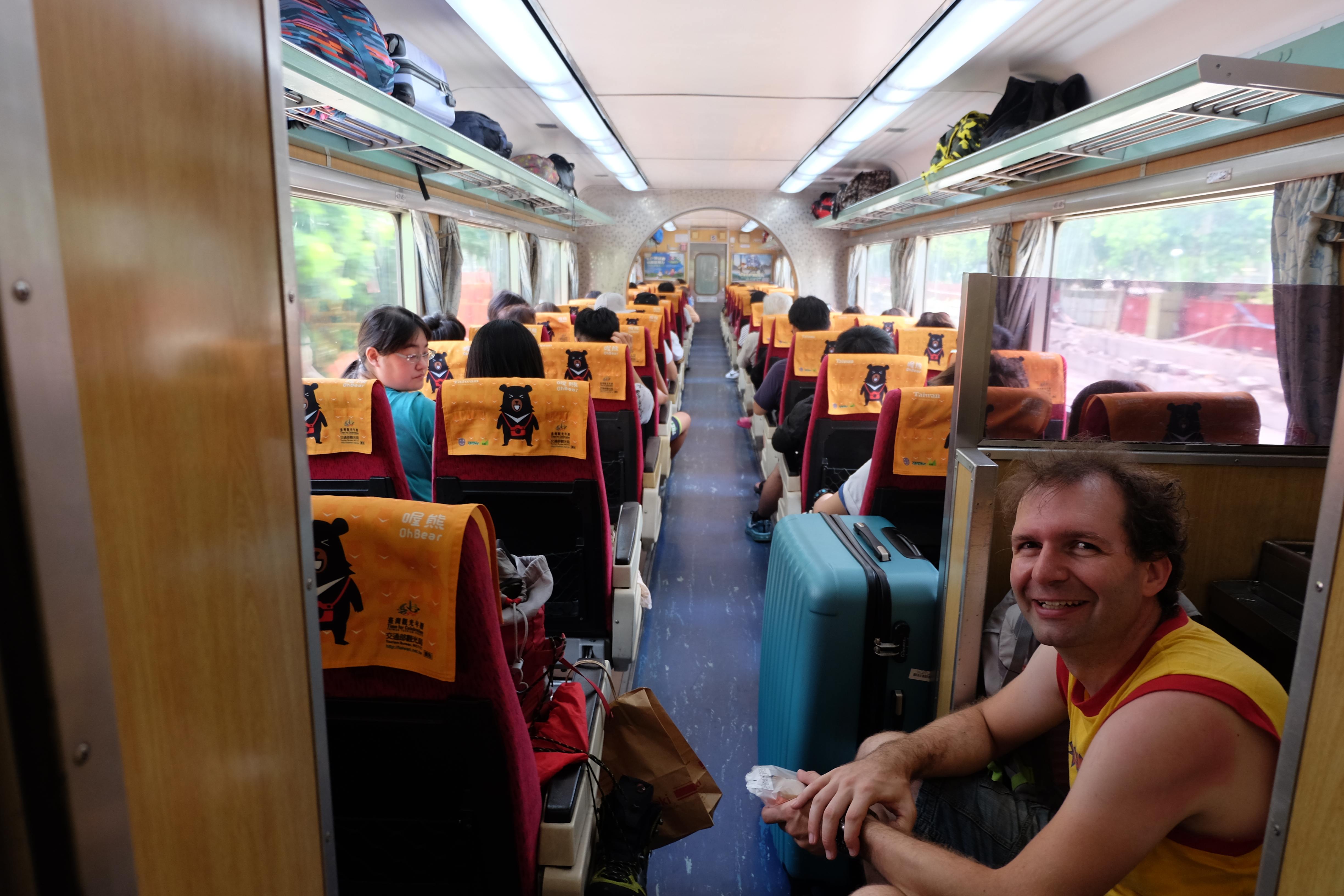 Taiwanesische Züge… ein weiterer Grund von diesem Land überrascht zu sein: die Dinger sehen eher aus wie 1. Klasse-Wagen in der Schweiz. Und wir, die einzigen zwei Exemplare eines homo touristicus darin hatten keinen Sitzplatz, weil wir nämlich nicht wussten, wie schnell sie ausgebucht sind. Aber Tickets ohne Sitzplätze werden –zum Glück! – auch verkauft… also hiess es für uns einfach mal auf unseren (genug) grossen Rucksäcken Platz zu nehmen. Abgesehen von der Tatsache, dass wir etwas Im-Weg-Steher für die Leute waren, die sich am Wasserspender bedienen wollten (Meta, wir haben deine Rolle für eine kurze Zeit übernommen! :-)), war es eine sehr ruhige, erlebnislose und kalte Fahrt. Ja, die Klimaanlage ist lebensnotwendig bei den taiwanesischen Temperaturen, den Zug aber in einen Vorort der Antarktis zu verwandeln muss man aber trotzdem nicht!
