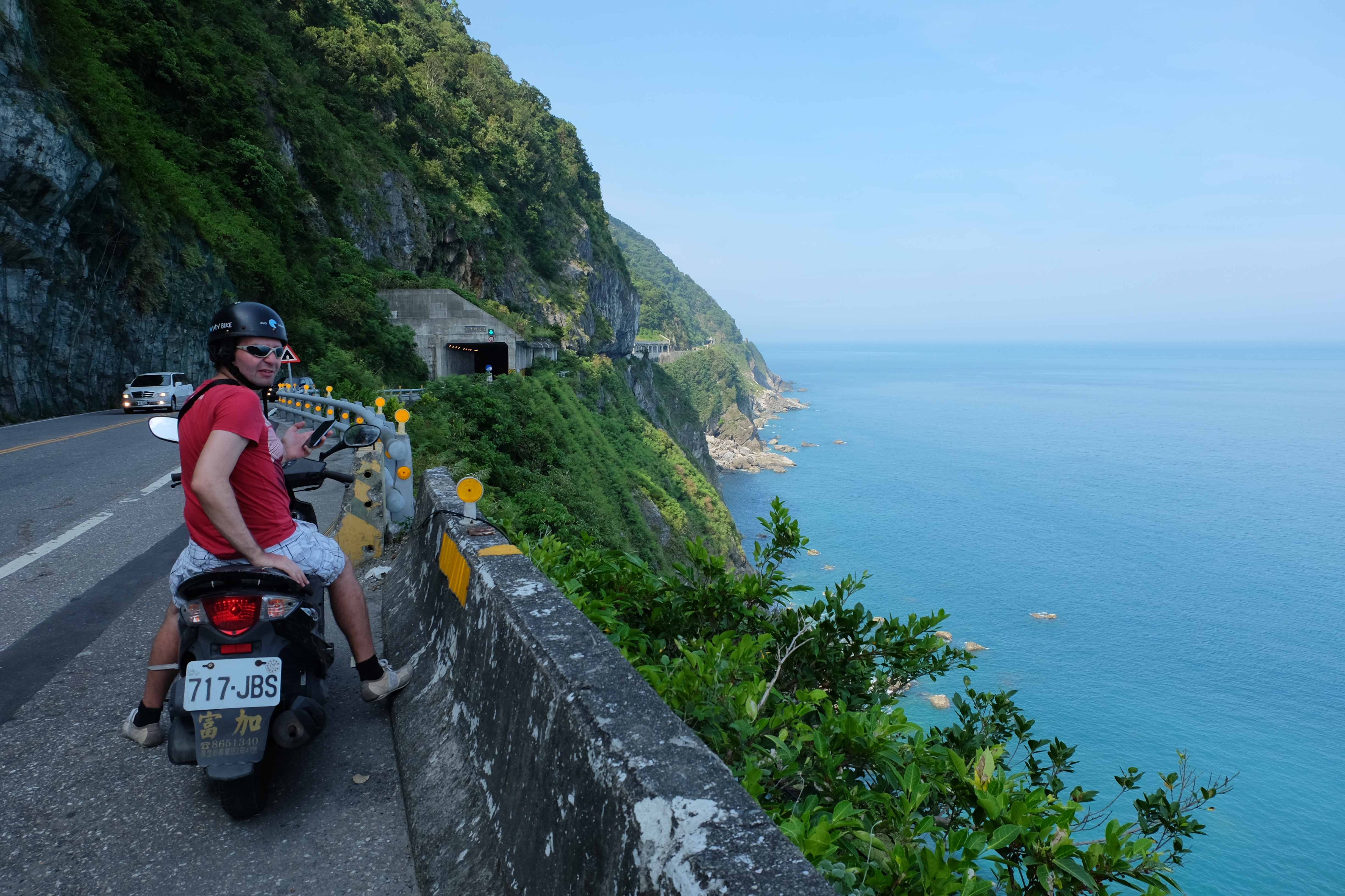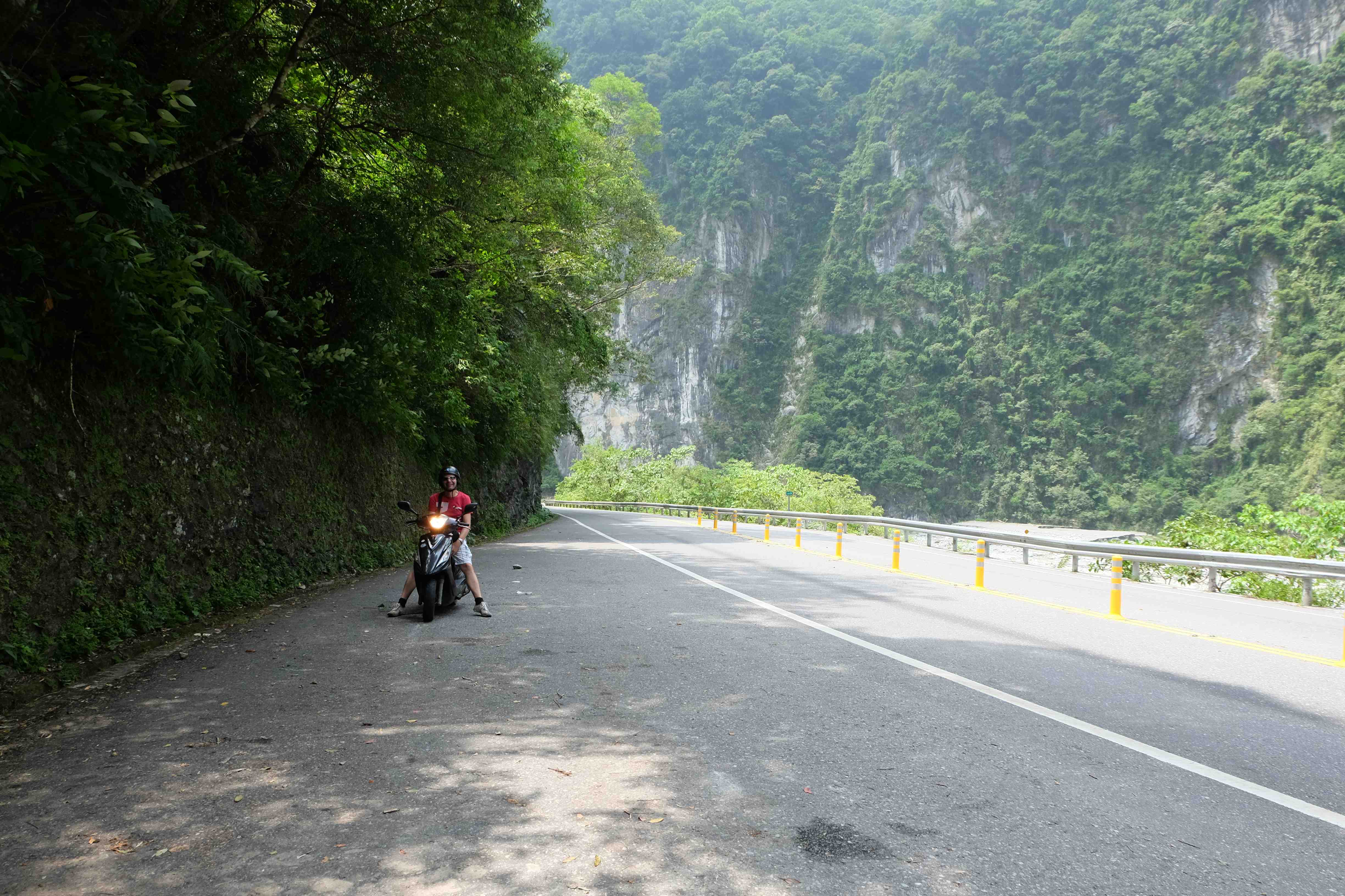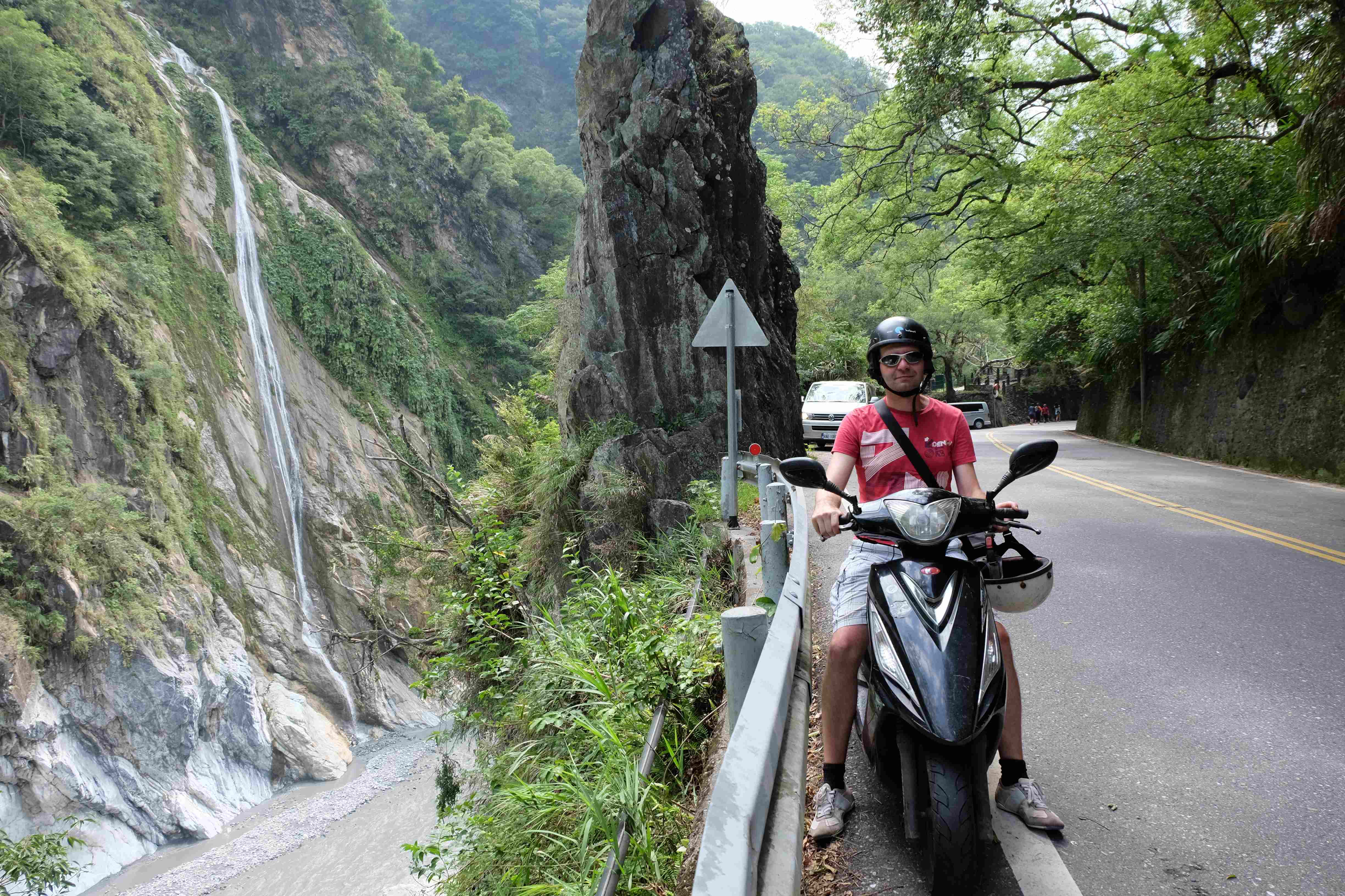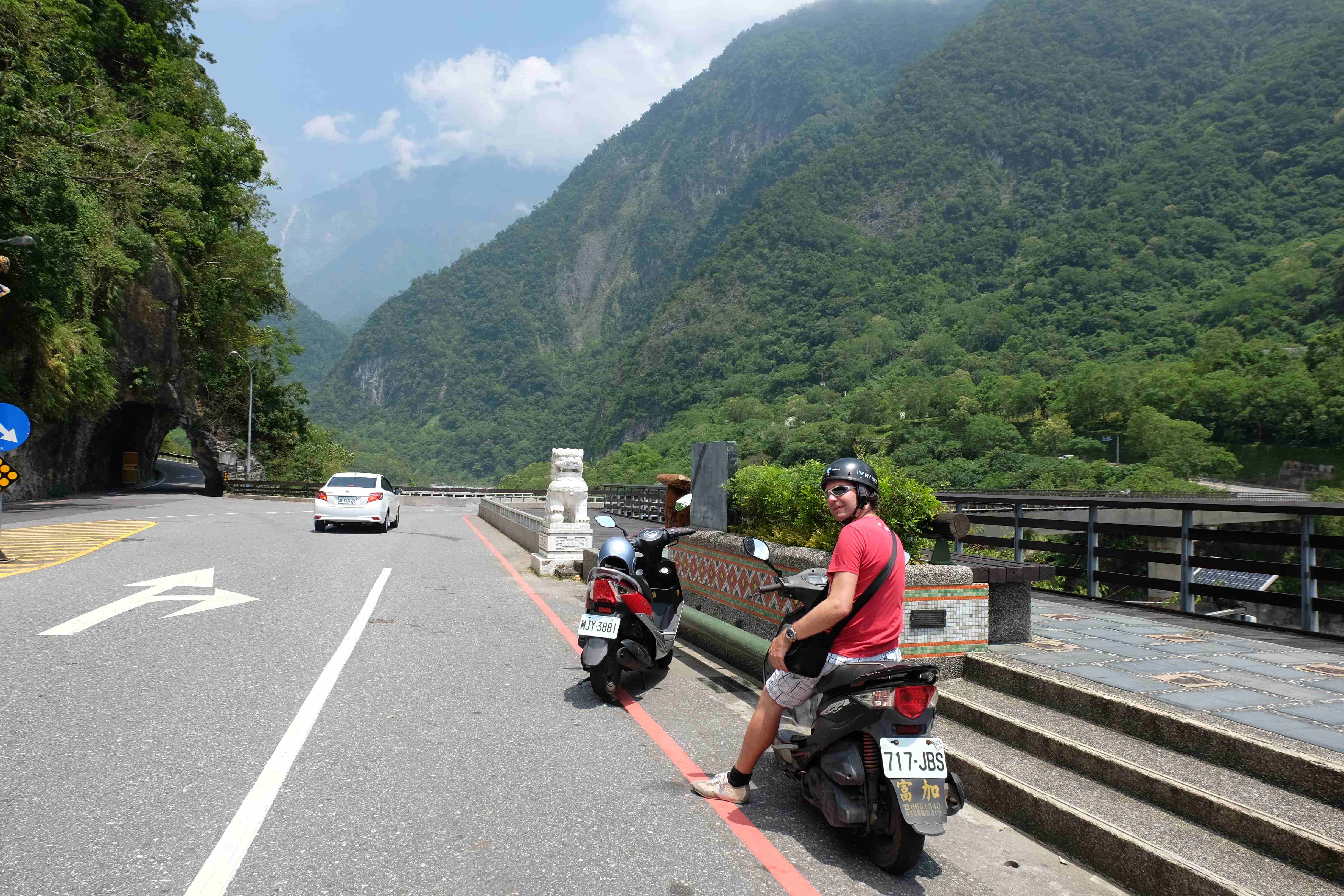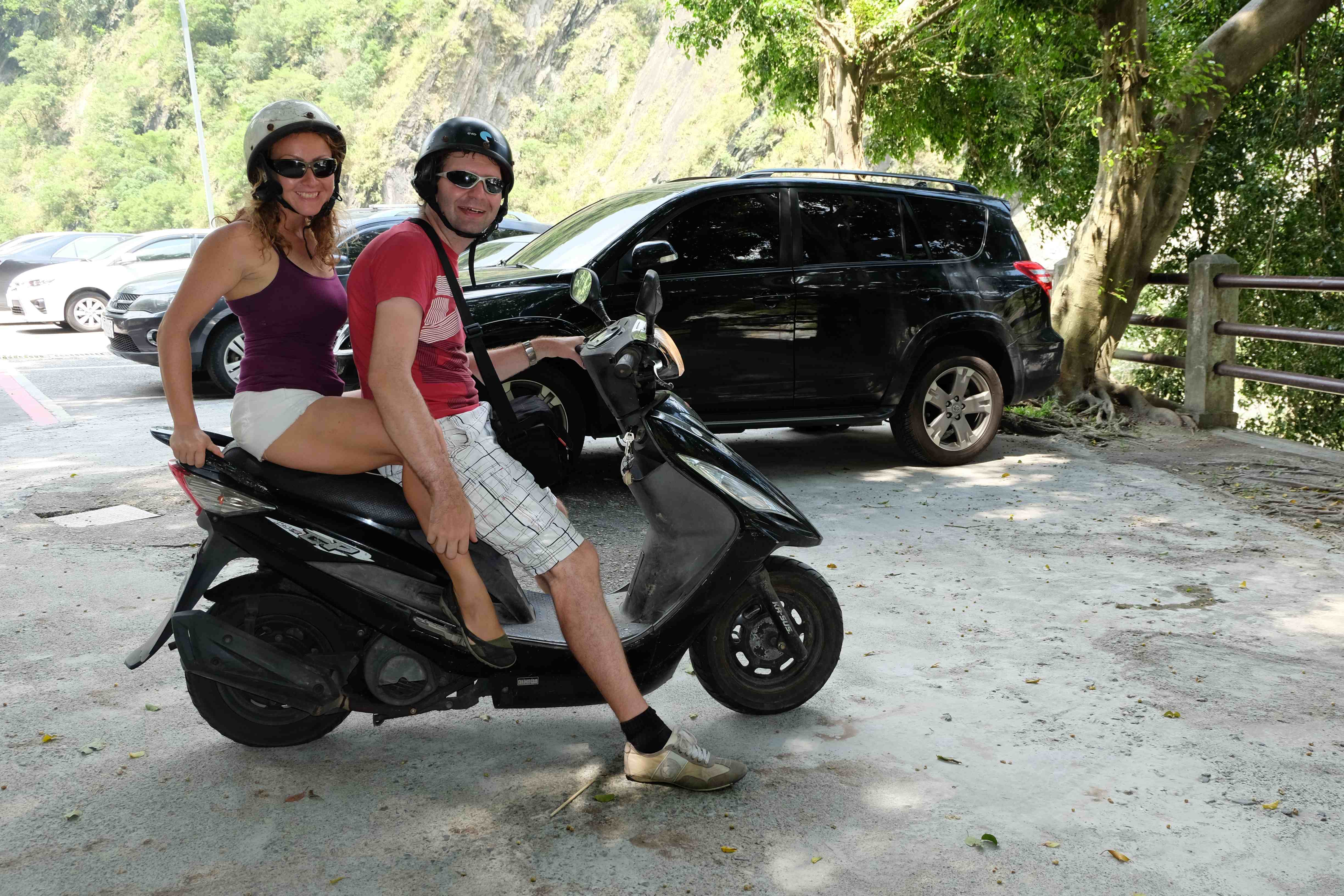 Ihre Offenheit und Gastfreundschaft ging so weit, dass sie uns am darauffolgenden Tag sogar ihr Motorrad zur Verfügung stellten, damit wir den nahgelegenen Nationalpark auf eigene Faust erkunden können. Unglaubliche Leute! So wie es aussieht war Taiwan für uns das Land des Motorradfahrens. Rafi durfte wieder mal seine Künste darin üben, diesmal sollte die Strecke allerdings viel länger sein als die kurze Inselerkundungstour in Kaohsiung. Ausgerüstet mit ein paar alten, (nicht wirklich) bruchsicheren einheimischen Helmen, mit (wie es sich später herausstellte nicht) genügend Sonnencreme und mit (k)einer Karte fuhren wir ein paar Mal im Kreis bis wir den richtigen Weg zum Nationalpark fanden. Die Tankstellenangestellten fanden es äusserst amüsant uns zwei mit einem einheimischen Scooter unterwegs zu sehen… die Polizei hätte es vermutlich weniger lustig gefunden, da wir keine Papiere für unser Fortbewegungsmittel dabei hatten. Zum Glück wurden wir nie angehalten … und sonst hätten wir definitiv in den echten homo touristicus idiotus Modus schalten müssen und so tun, als würden wir nichts verstehen! (was nicht einmal so gelogen gewesen wäre… abgesehen von ein Paar Halbtönen verstehen wir tatsächlich nur Bahnhof!)