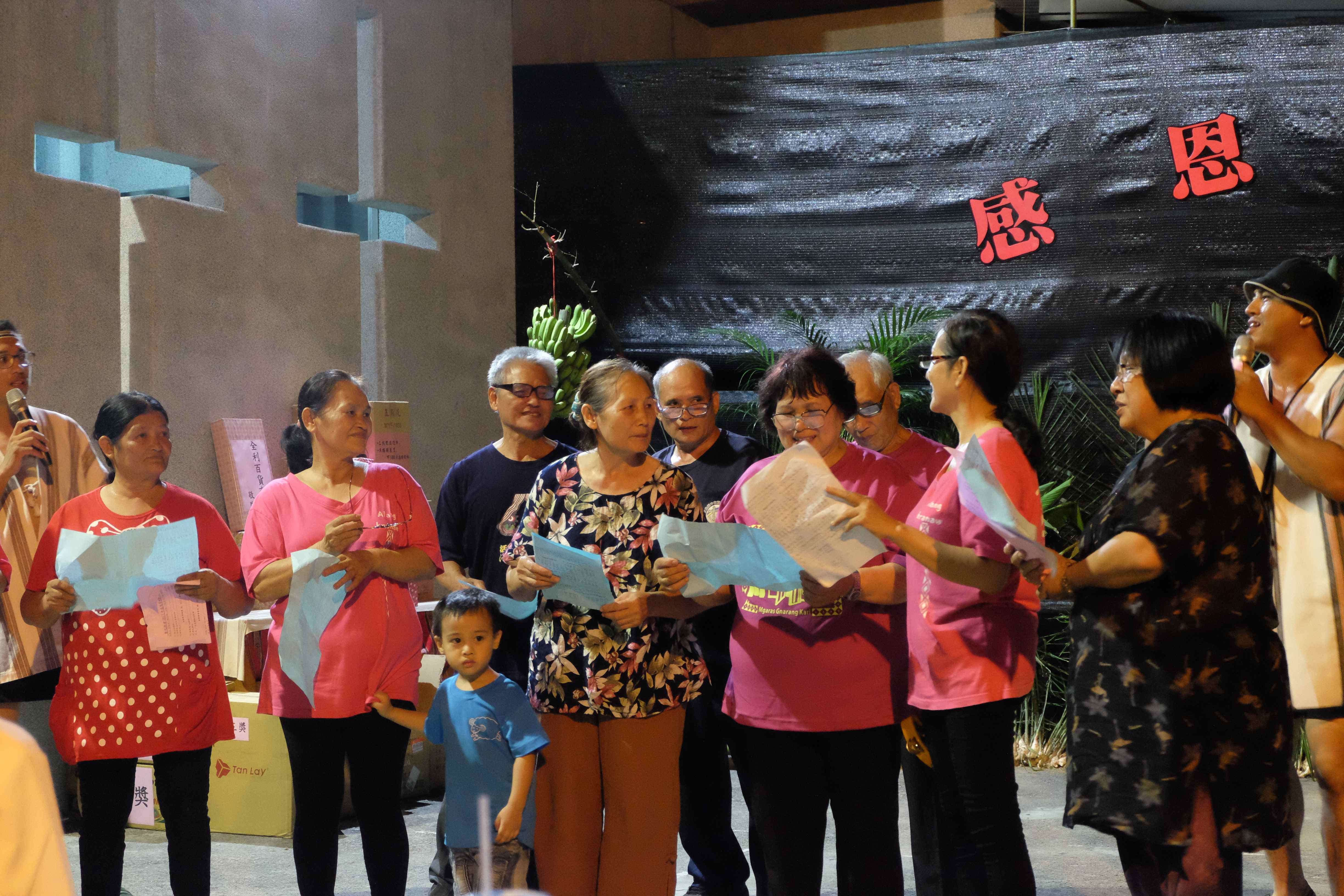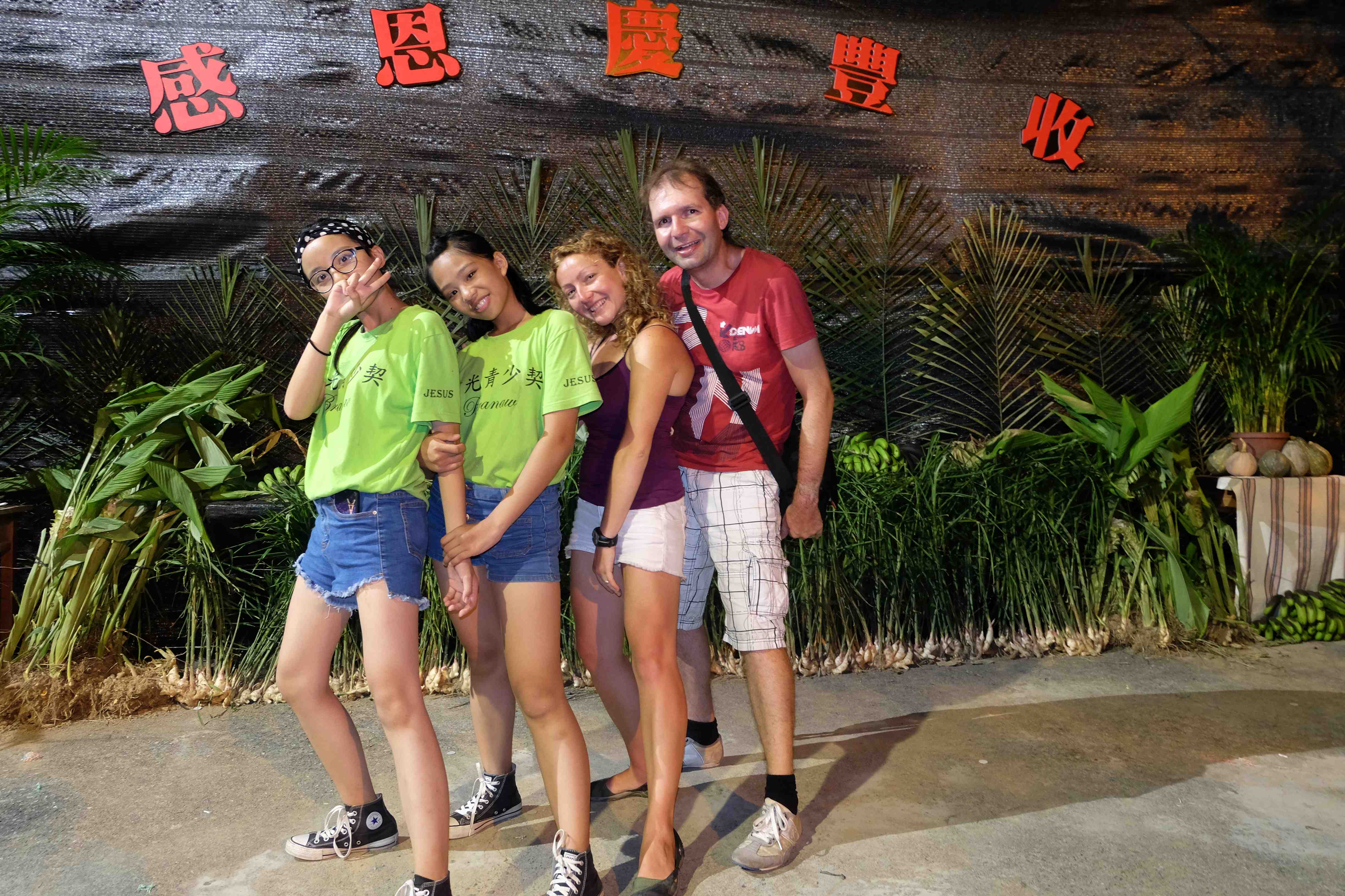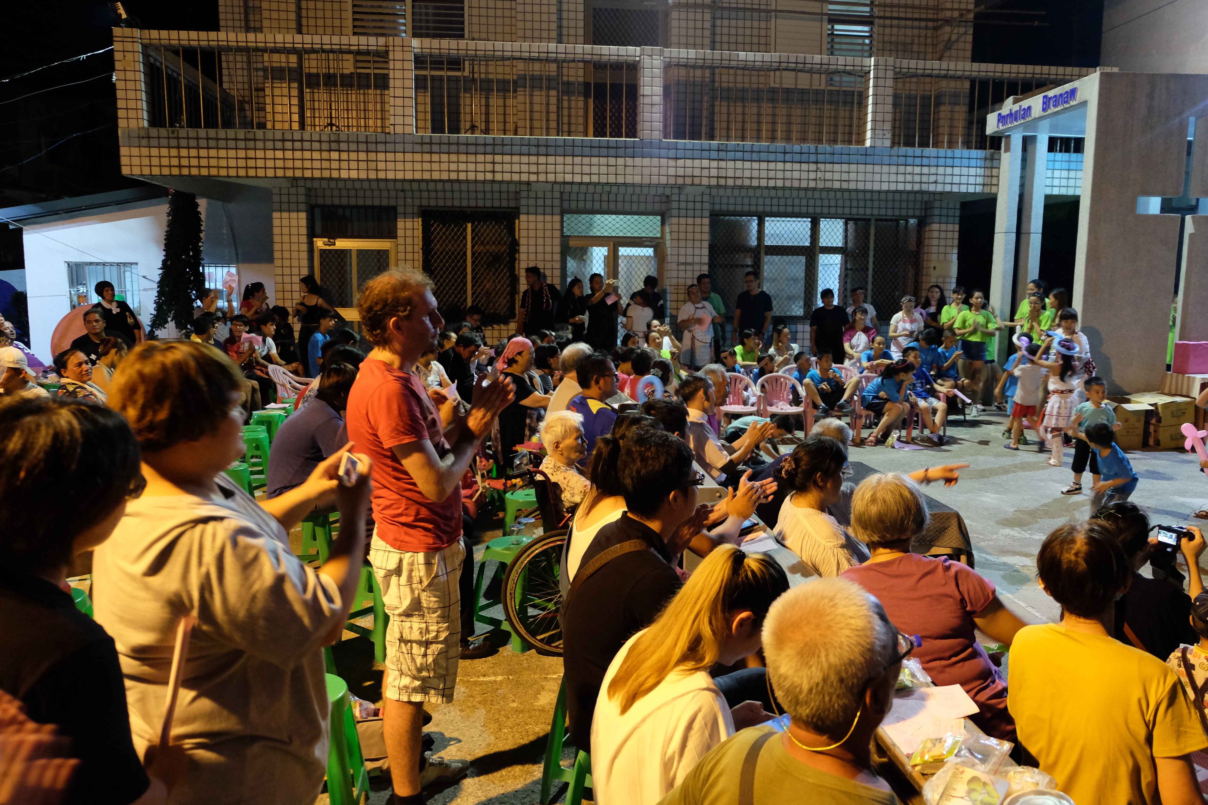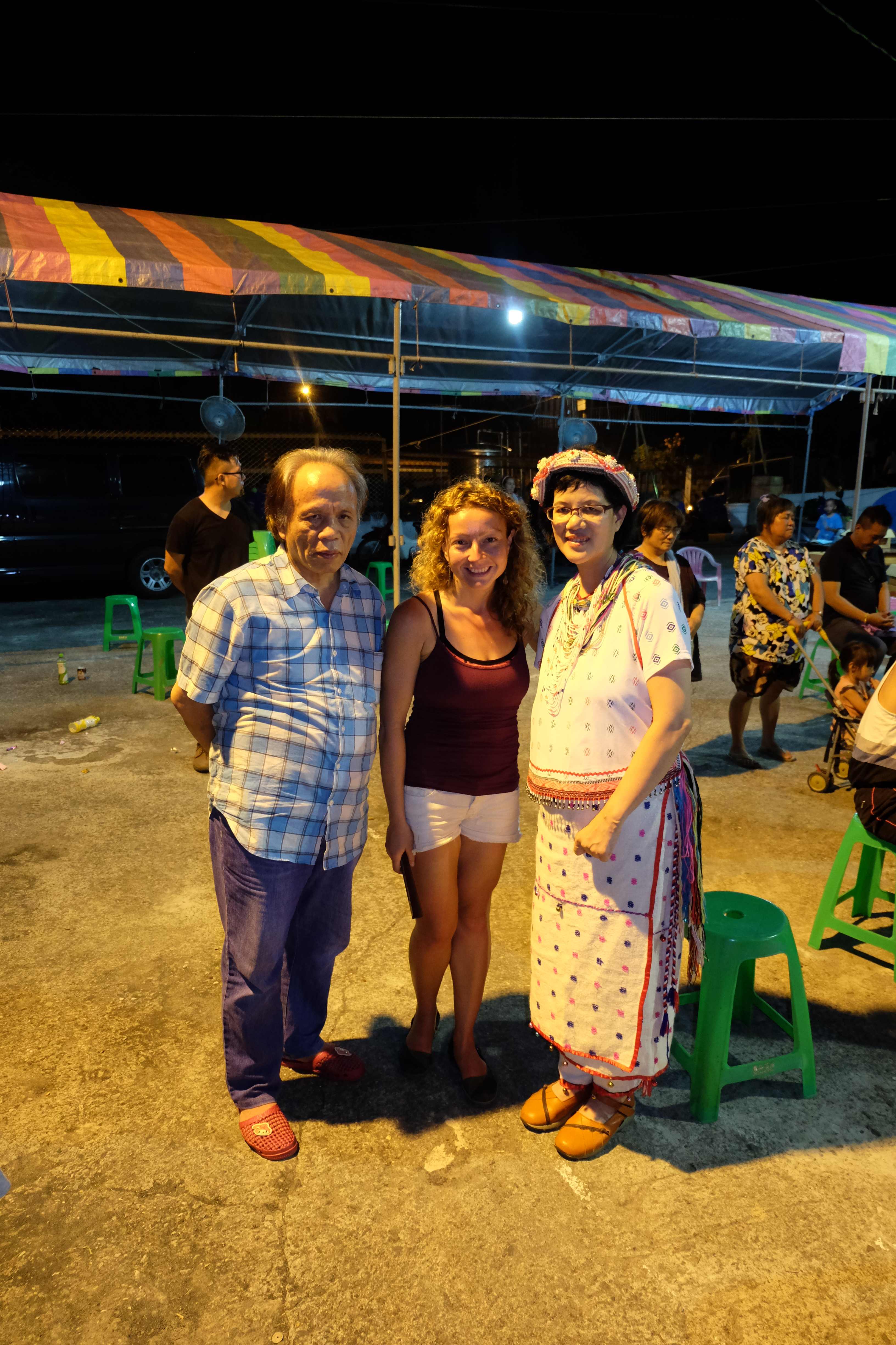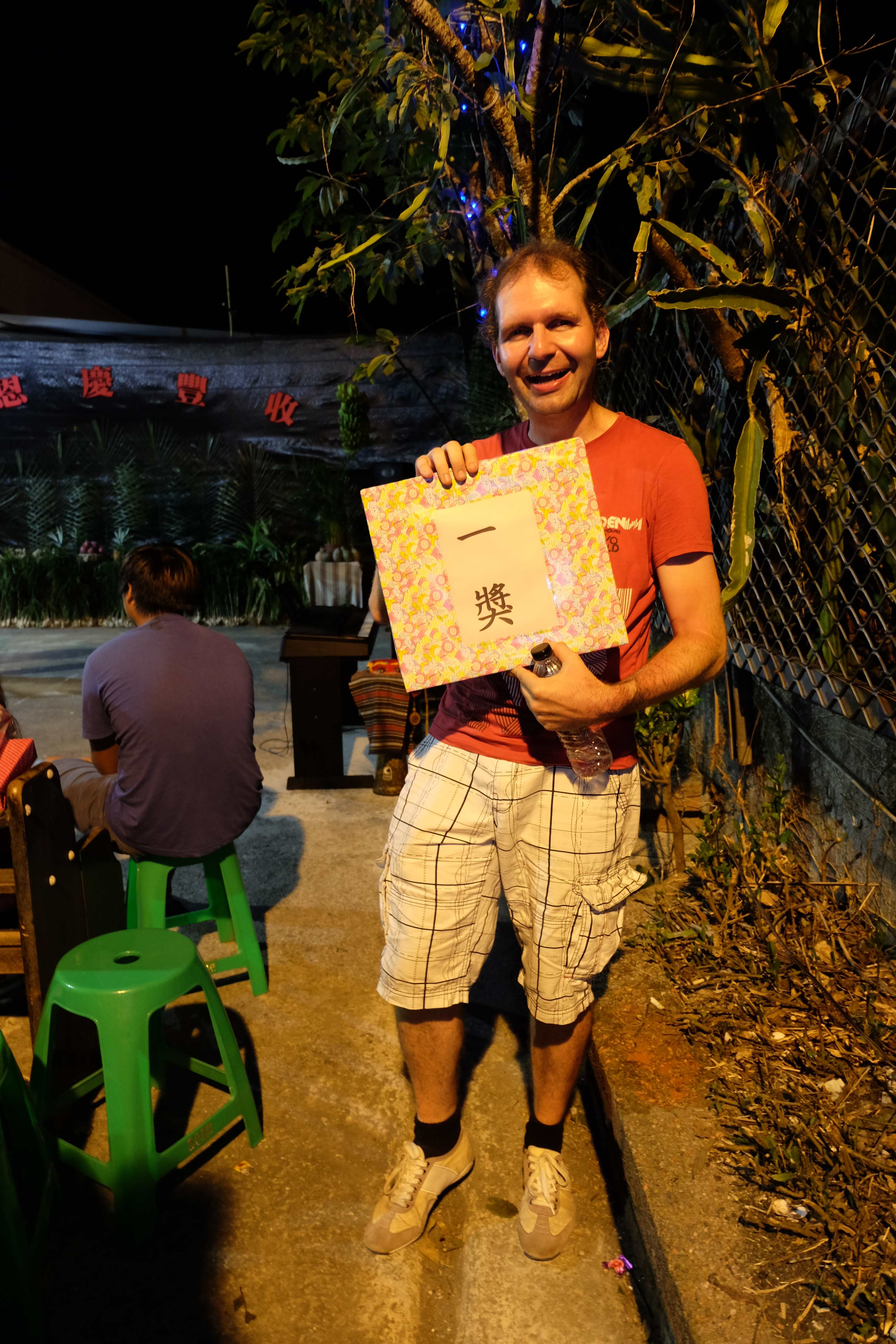 Am Abend wieder im Dorf angekommen durften wir unsere Gastgeberin samt Familie zu einem traditionellen Fest begleiten, das auf dem Kirchplatz stattfand. (die Mehrheit der indigenen Bevölkerungsgruppen in Taiwan sind Christen) Wir erwarteten ursprünglich nichts Grosses, wurden aber durch die aufwändige Dekoration und den herzhaften Einsatz der Bevölkerung überrascht. Tanzen und singen war angesagt: vom jüngsten bis zum ältesten Dorfbewohner wurden alle miteingespannt und beteiligten sich am Fest. Niemand wurde ausgelassen, alle wurden herzlich willkommen geheissen und applaudiert. Ein Tombolastand durfte natürlich auch nicht fehlen. Drei Mal dürft ihr raten, wer am Ende des Abends den zweitgrössten Preis einsackte: Herr Robleda, natürlich! Lustig war nur, dass die Zahlen auf Chinesisch ausgerufen wurden und wir nie eine Ahnung gehabt hätten, dass seine Nummer dran kam, hätte uns zufälligerweise unsere Gastgeberin nicht 30 Sekunden vorher gefragt, was für Nummern wir hätten. Na ja… Rafis Glück! Natürlich musste er auf die sogenannte Bühne, der homo touristicus wurde von der begeisterten indigenen Menschenmenge zelebriert während er seinen Preis entgegennahm und… er wurde natürlich gezwungen mitzutanzen. Aus irgendeinem komischen Grund hatten die Leute dort das Gefühl, ich würde nicht genug Spass haben wenn ich dem als Zuschauer beiwohne, so dass ich in Null Komma Nichts auch auf der Bühne landete und mir die einheimischen Tanzschritte aneignen musste. Dass wir von allen gefilmt wurden und dass diese Aufnahmen vermutlich schon längst auf ihren Facebook-Accounts kursieren, muss nicht mal erwähnt werden! 🙂 Wir hatten aber einen unvergesslichen Abend und äusserst viel Spass! Hier einige Bilder davon: