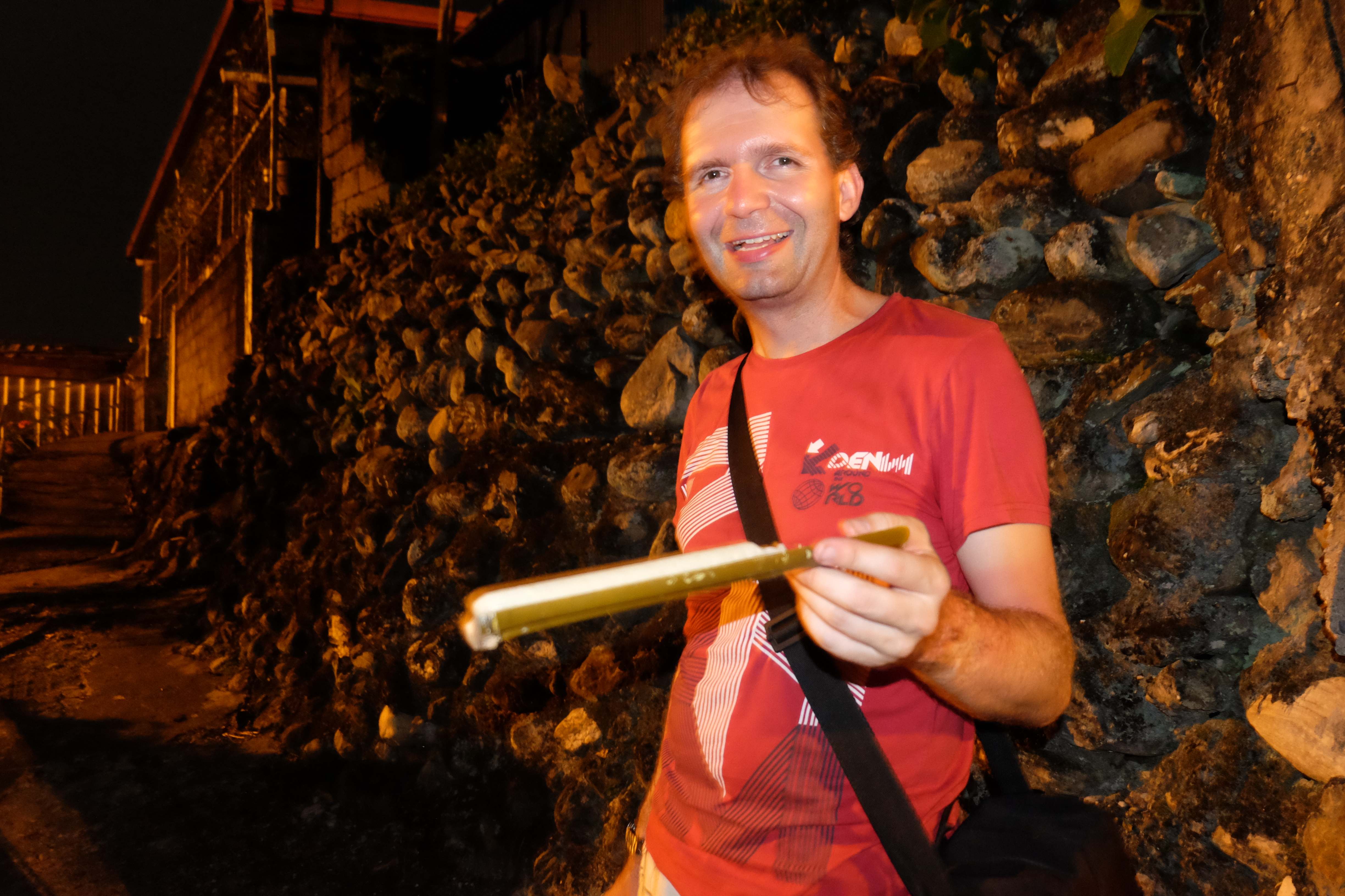 Ha ha, da ImWegSteherin… Ce avea Rafi in mana era un bambus in care localnicii indesasera orez. Plin cu orezul acesta a fost pus peste foc si gatit. Pentru a manca orezul dinauntru trebuie sa spargi bambusul. 🙂
