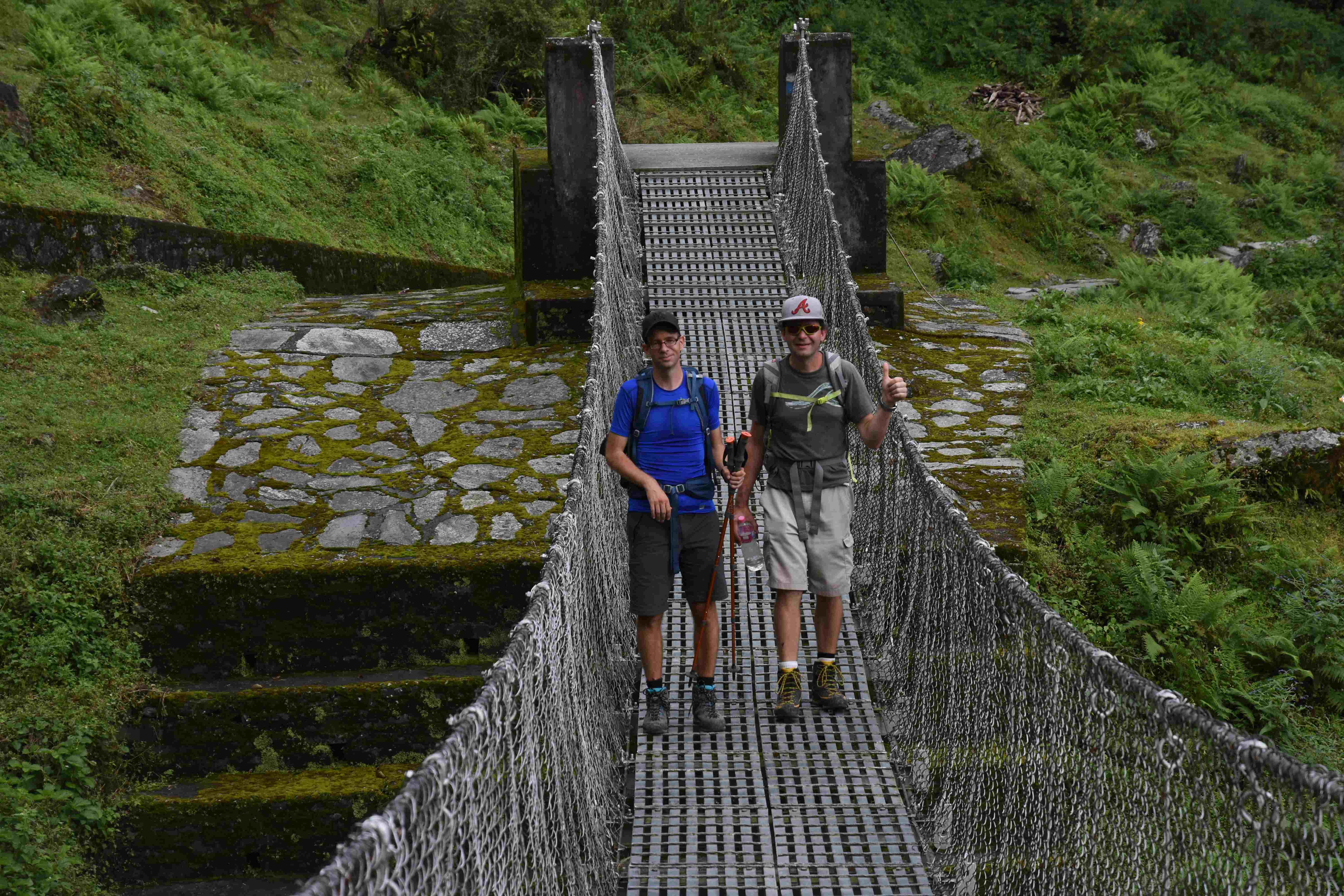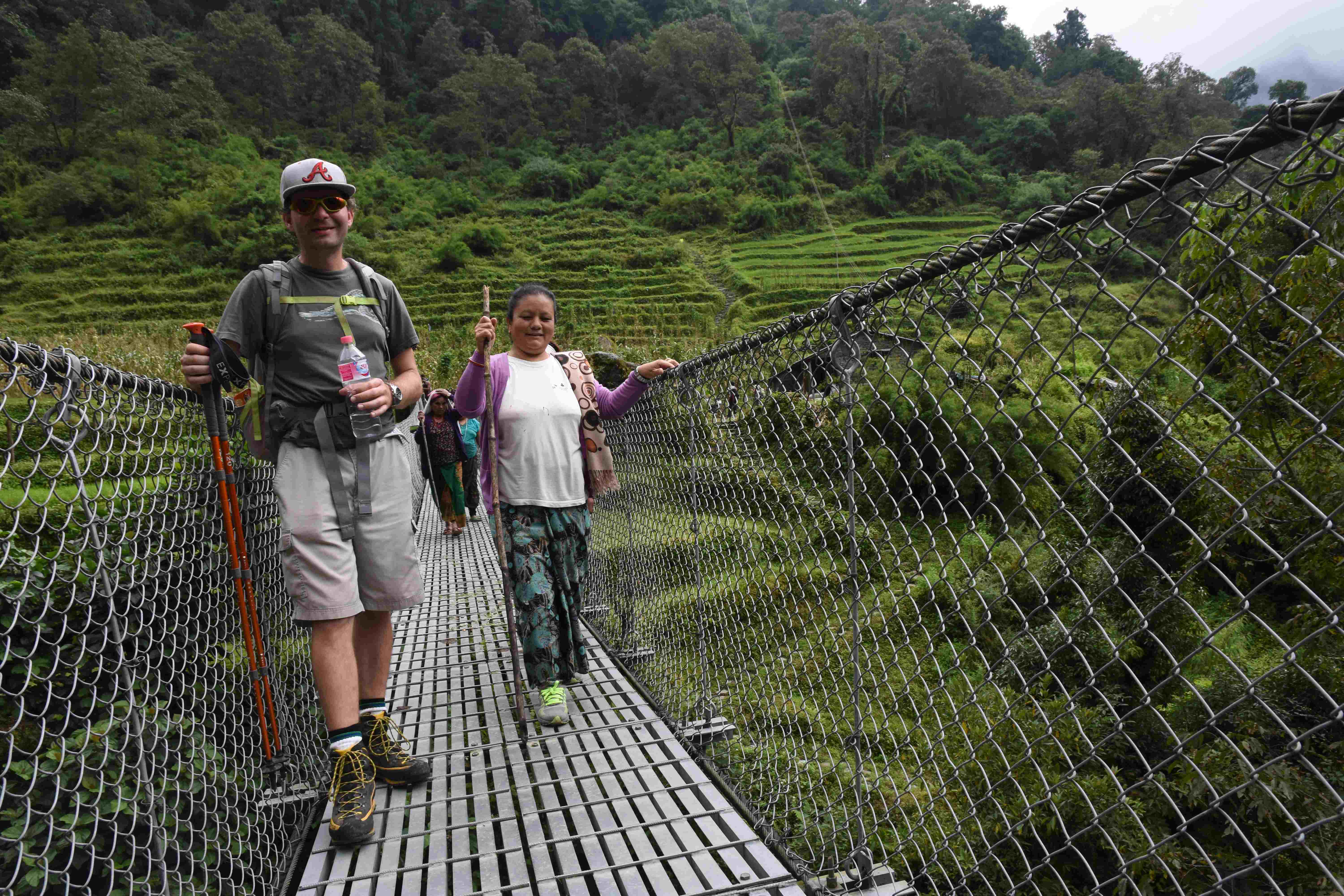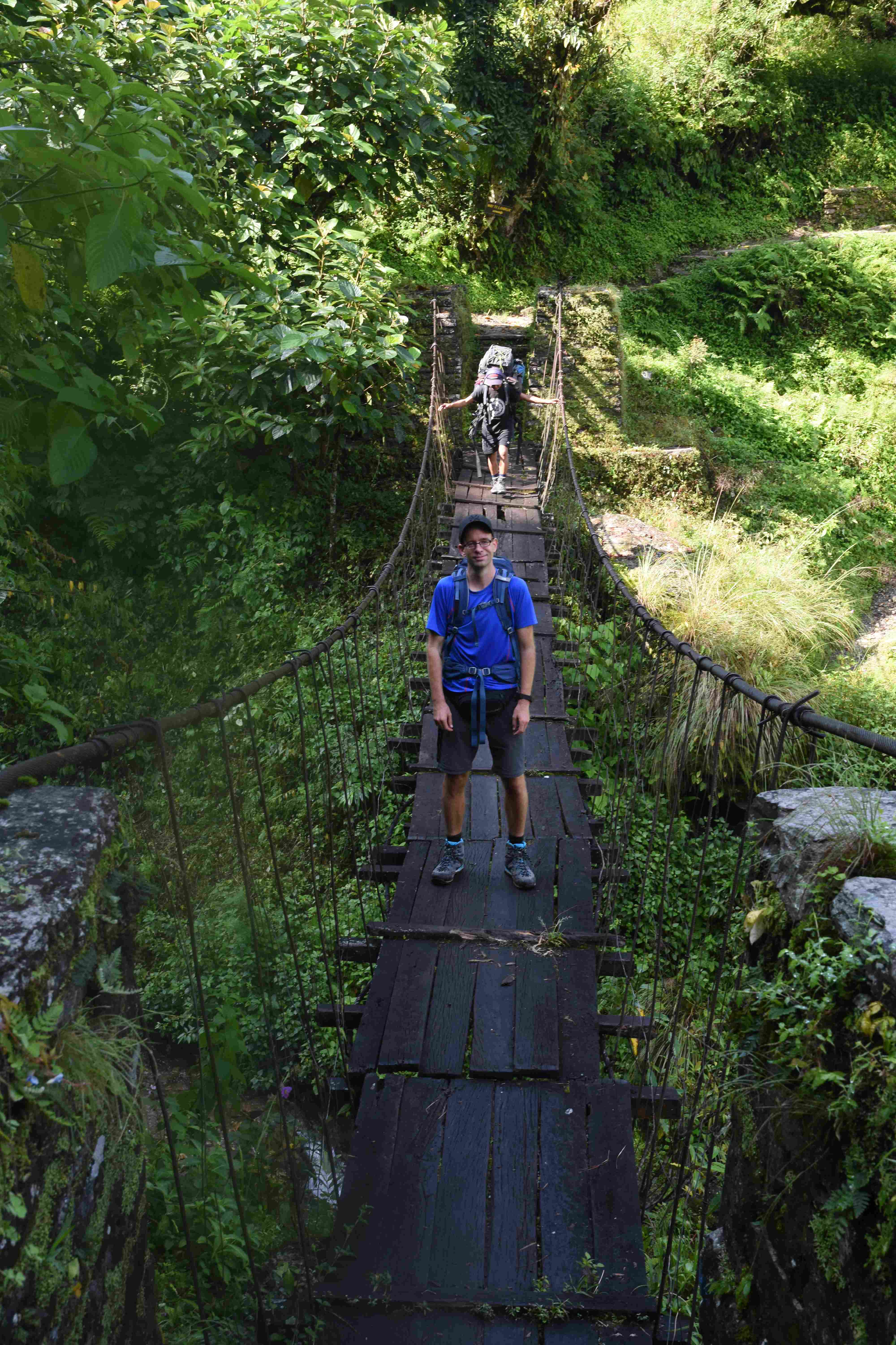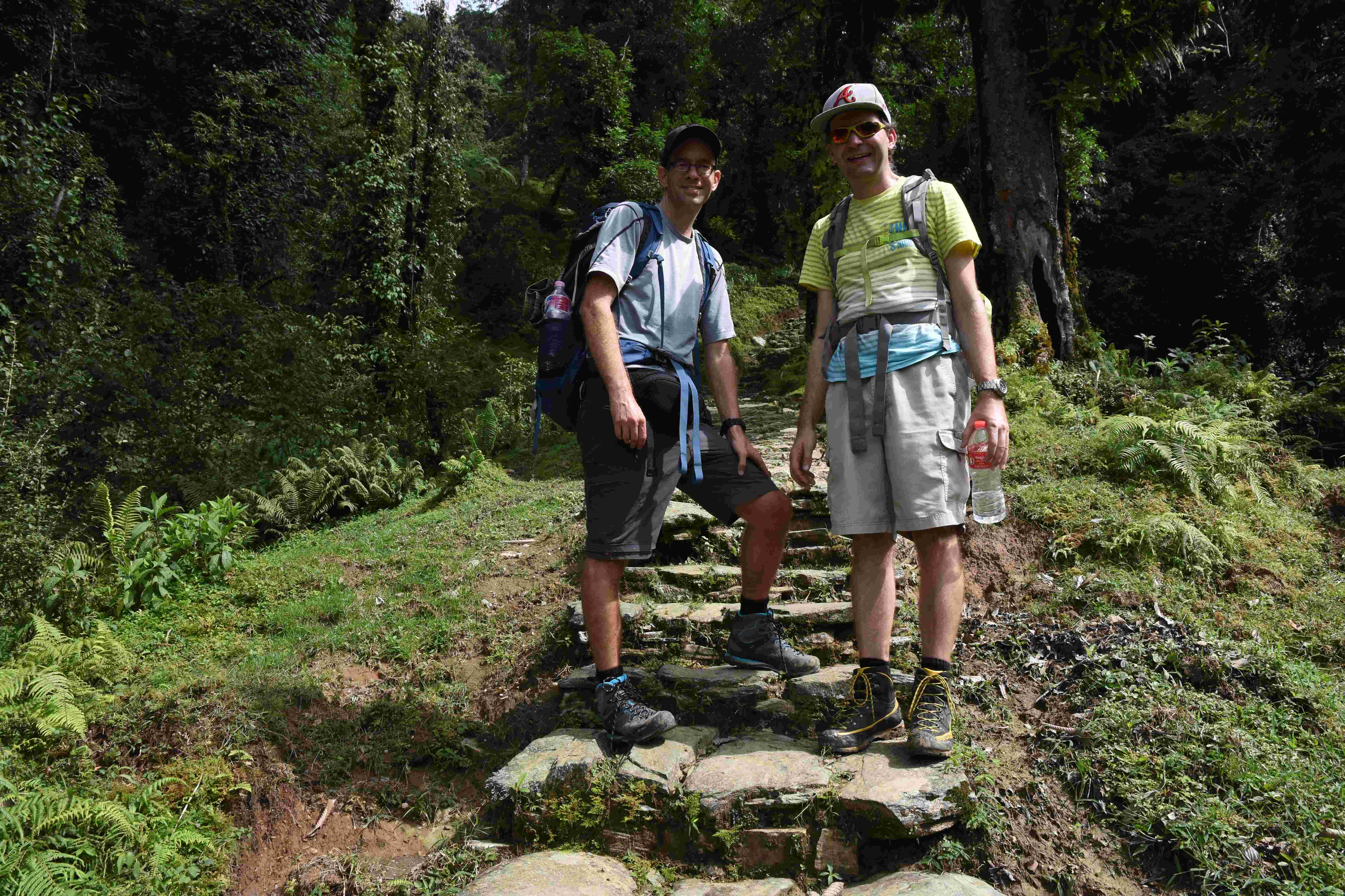 Wir haben also unsere Wanderung in Phedi gestartet. Es hat kein leichtes Angewöhnen gegeben: Uns hat eine steile Treppe, sehr hohe Luftfeuchtigkeit und hohe Temperaturen erwartet. Und die Treppen scheinen die Nepalis angetant zu haben: Sie werden uns die nächsten Tage begleiten. Und eine weitere Erkenntnis haben wir gemacht: Wenn gemäss dem Programm der Start bei 1000 m.ü.M. ist und die Übernachtung auf 1800 m.ü.M., heisst das nicht, dass man nur 800 Höhenmeter macht. Der Weg überquert verschiedene Täler und Hügel (sogar über das Ziel, zum oberen Beispiel über 2100 m.ü.M.) oder führt von der einen Flussseite zur anderen…und dazwischen gibts natürlich Treppen.