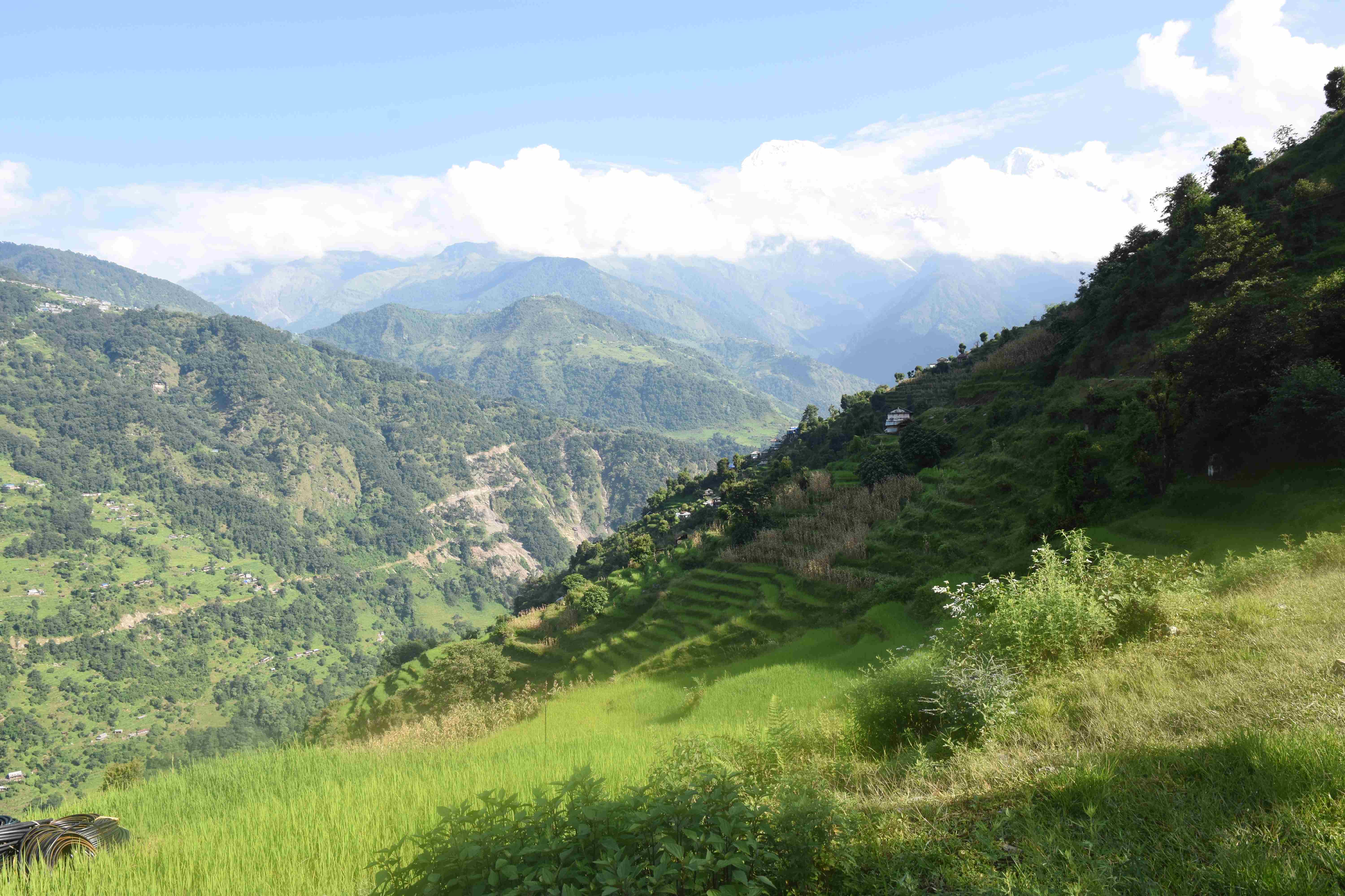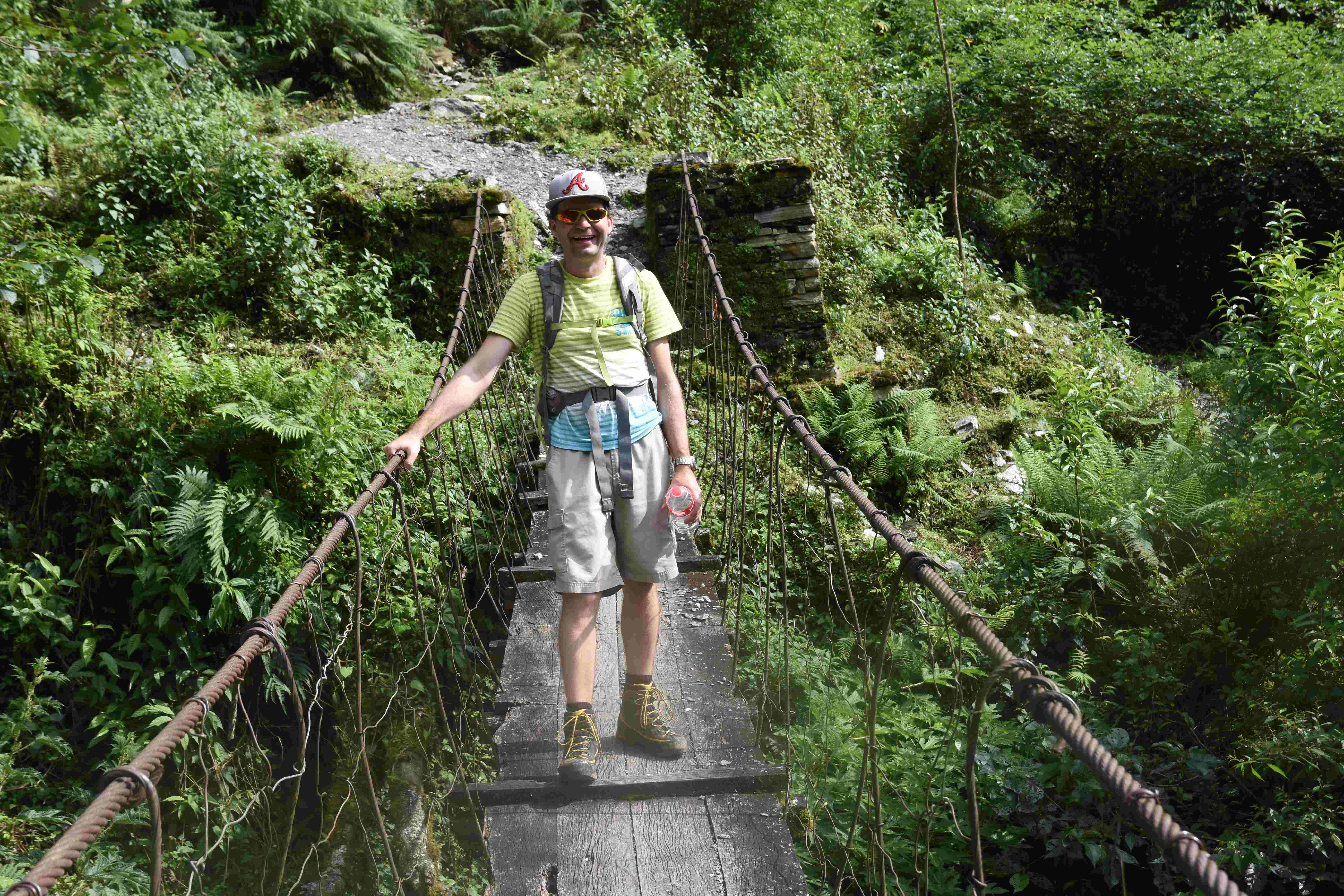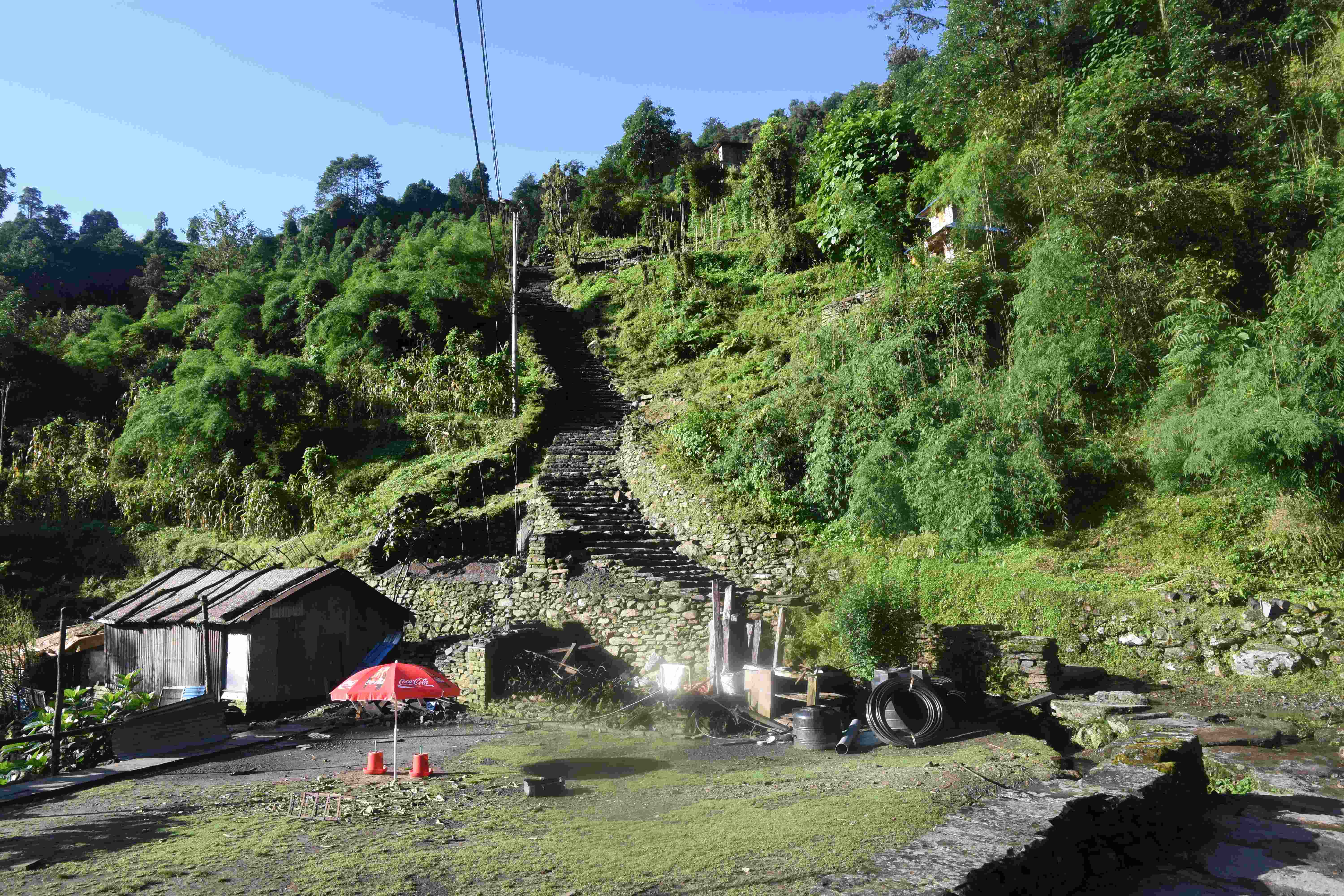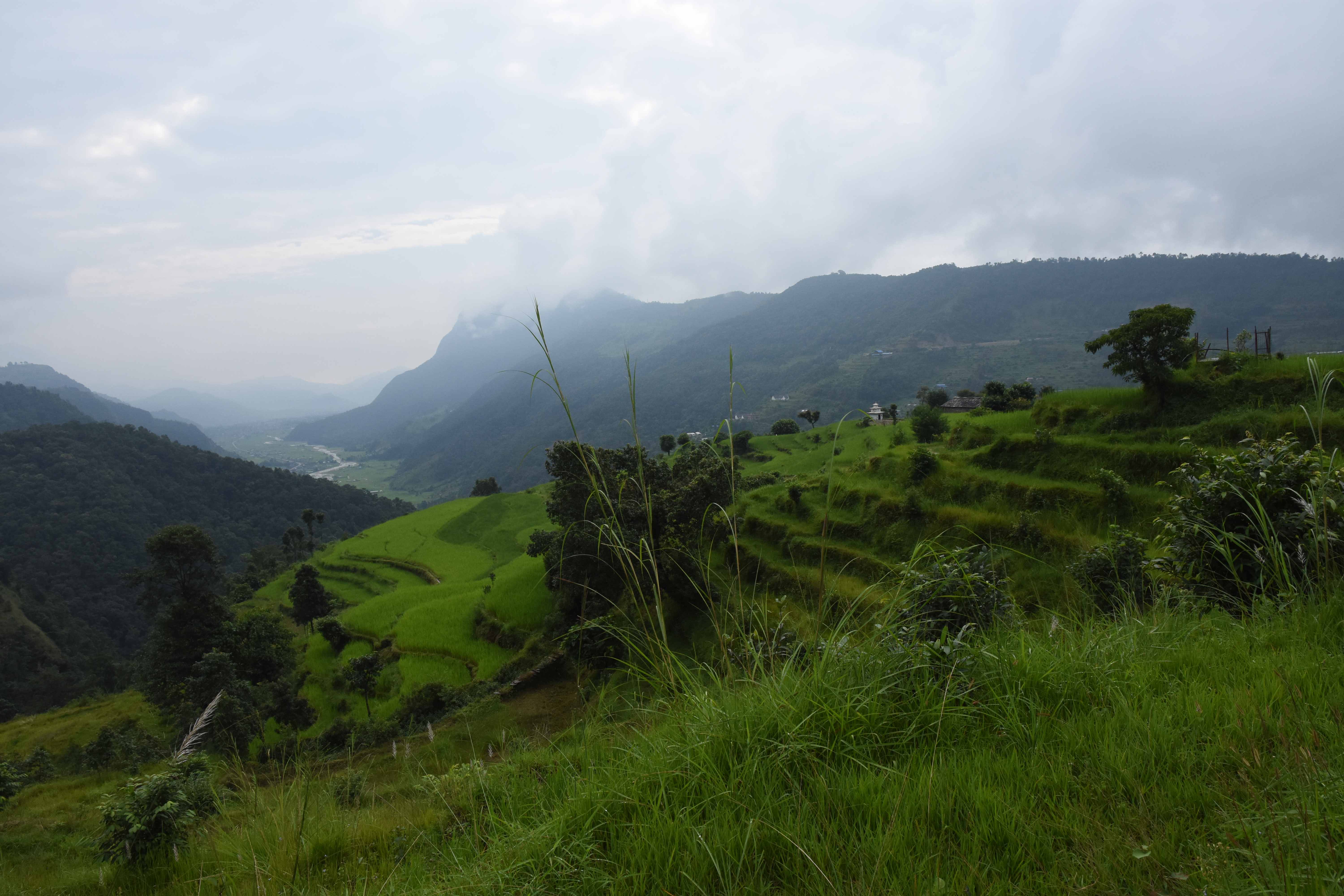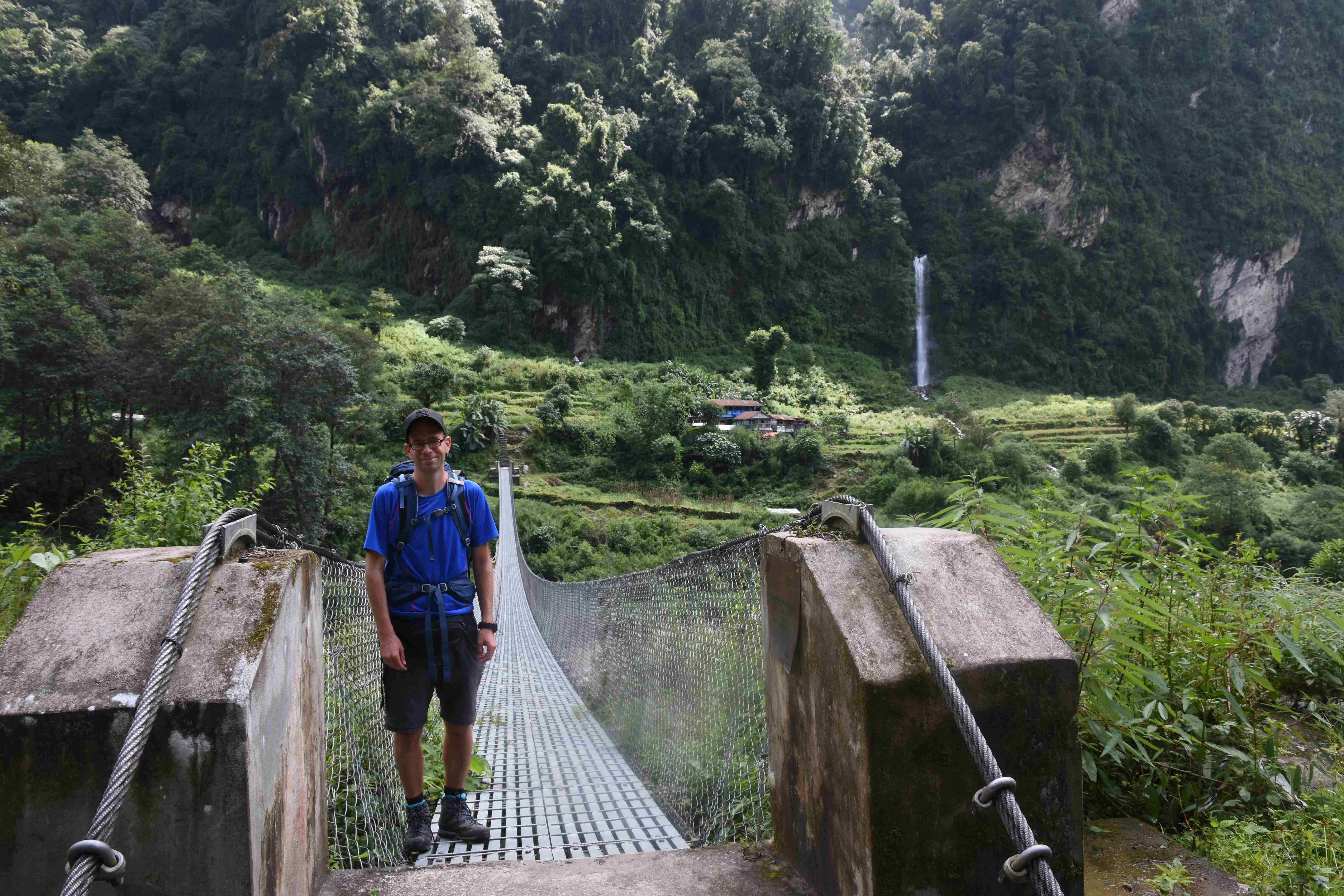 Wir haben also unsere Wanderung in Phedi gestartet. Es hat kein leichtes Angewöhnen gegeben: Uns hat eine steile Treppe, sehr hohe Luftfeuchtigkeit und hohe Temperaturen erwartet. Und die Treppen scheinen die Nepalis angetant zu haben: Sie werden uns die nächsten Tage begleiten. Und eine weitere Erkenntnis haben wir gemacht: Wenn gemäss dem Programm der Start bei 1000 m.ü.M. ist und die Übernachtung auf 1800 m.ü.M., heisst das nicht, dass man nur 800 Höhenmeter macht. Der Weg überquert verschiedene Täler und Hügel (sogar über das Ziel, zum oberen Beispiel über 2100 m.ü.M.) oder führt von der einen Flussseite zur anderen…und dazwischen gibts natürlich Treppen.