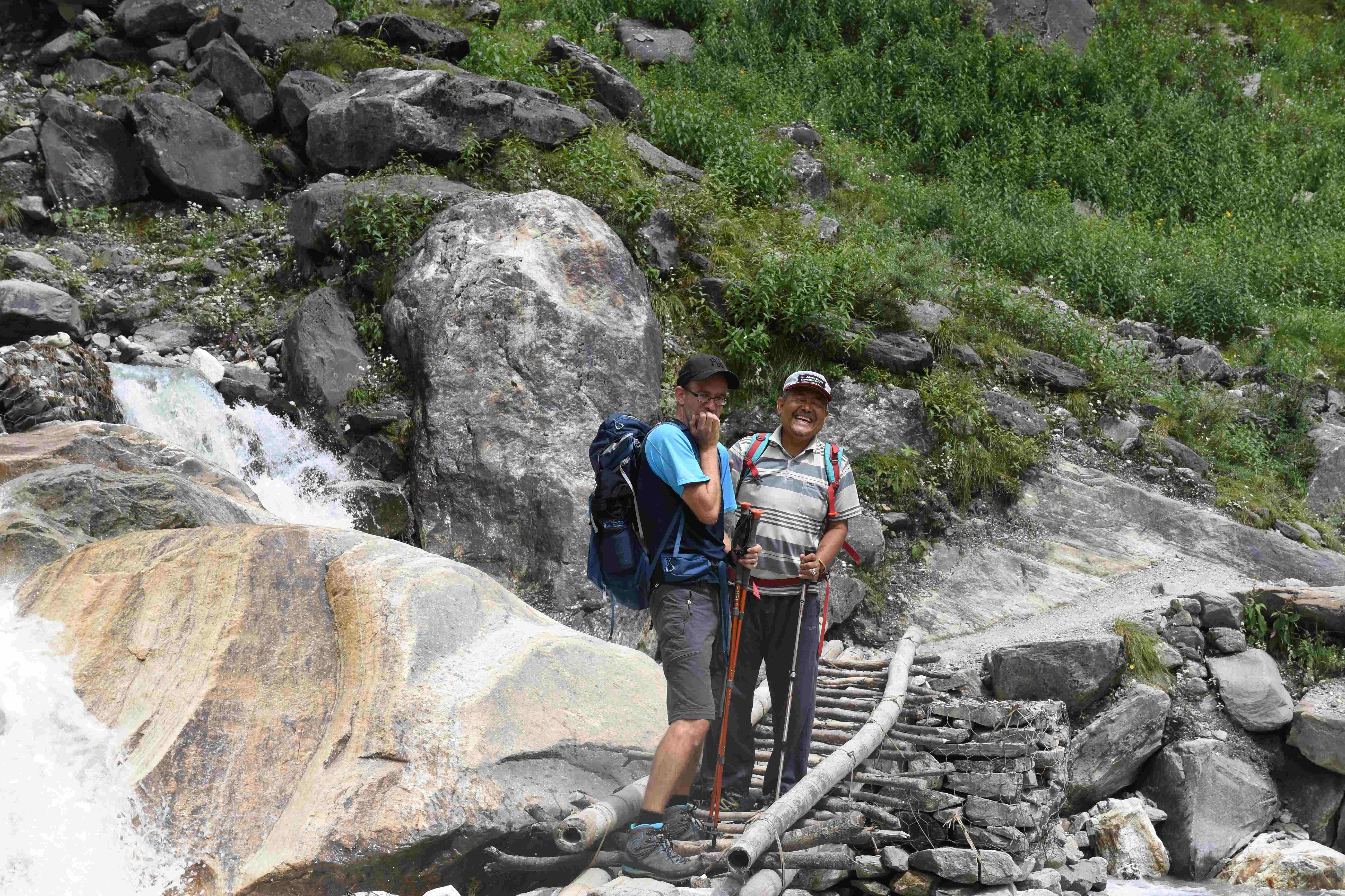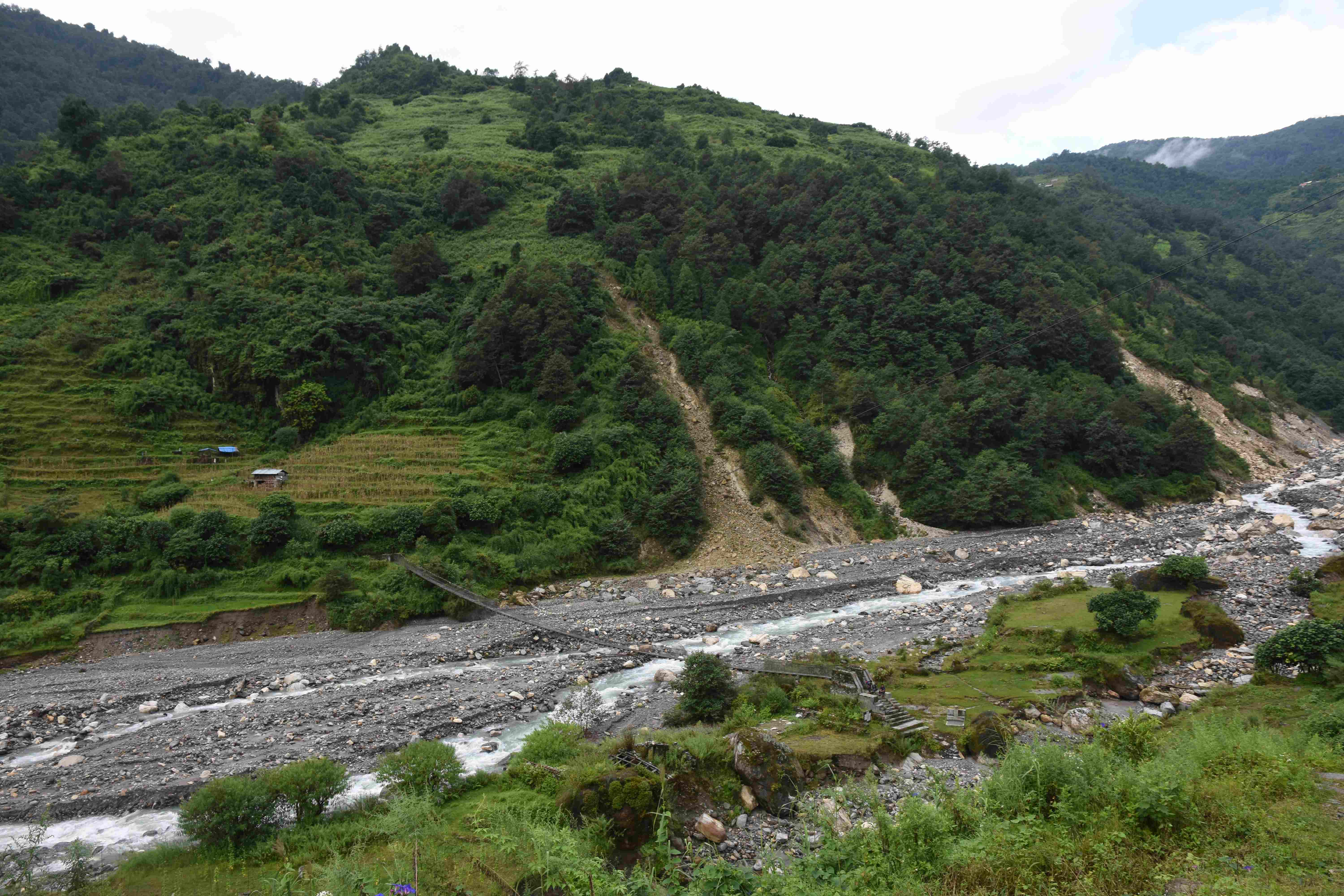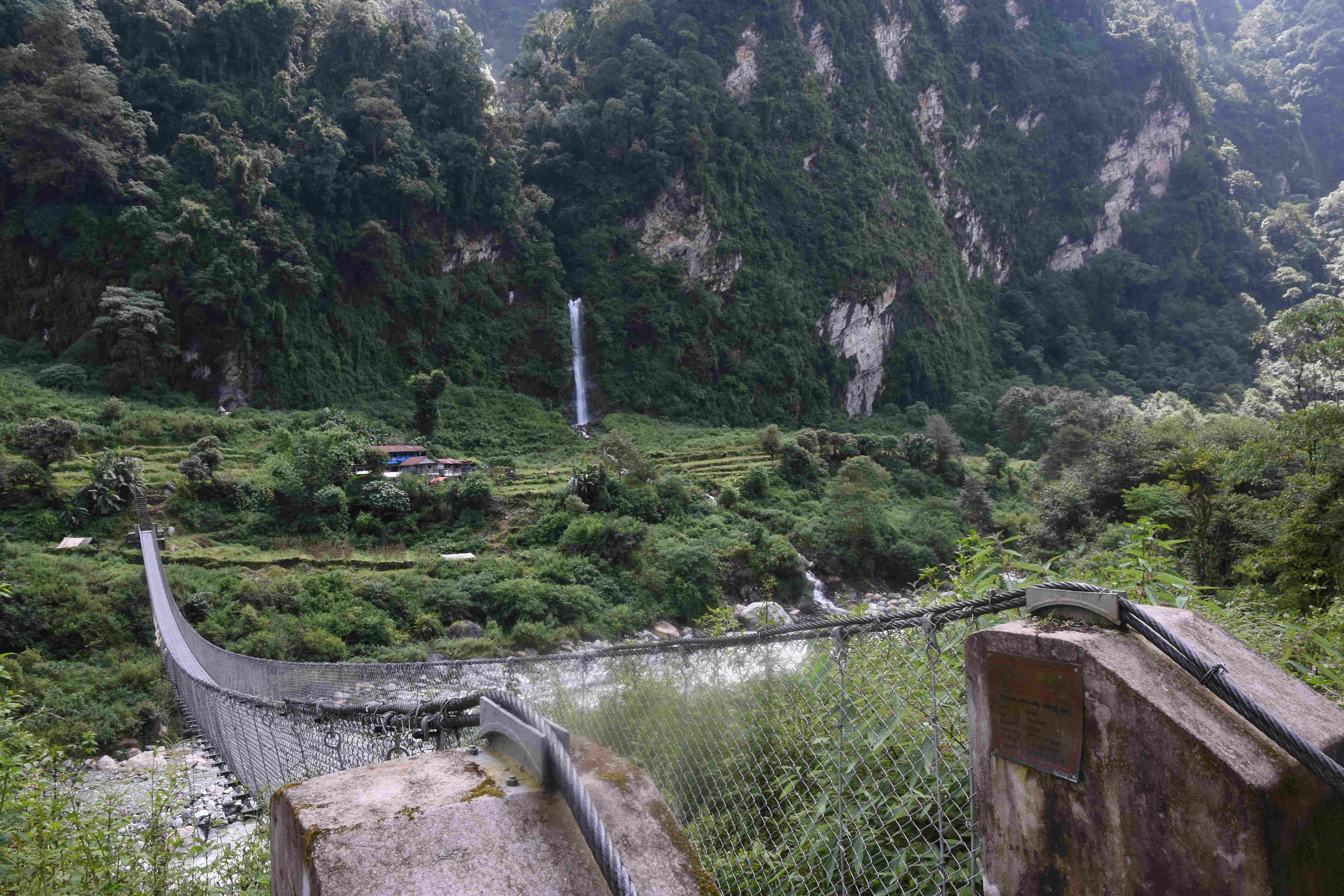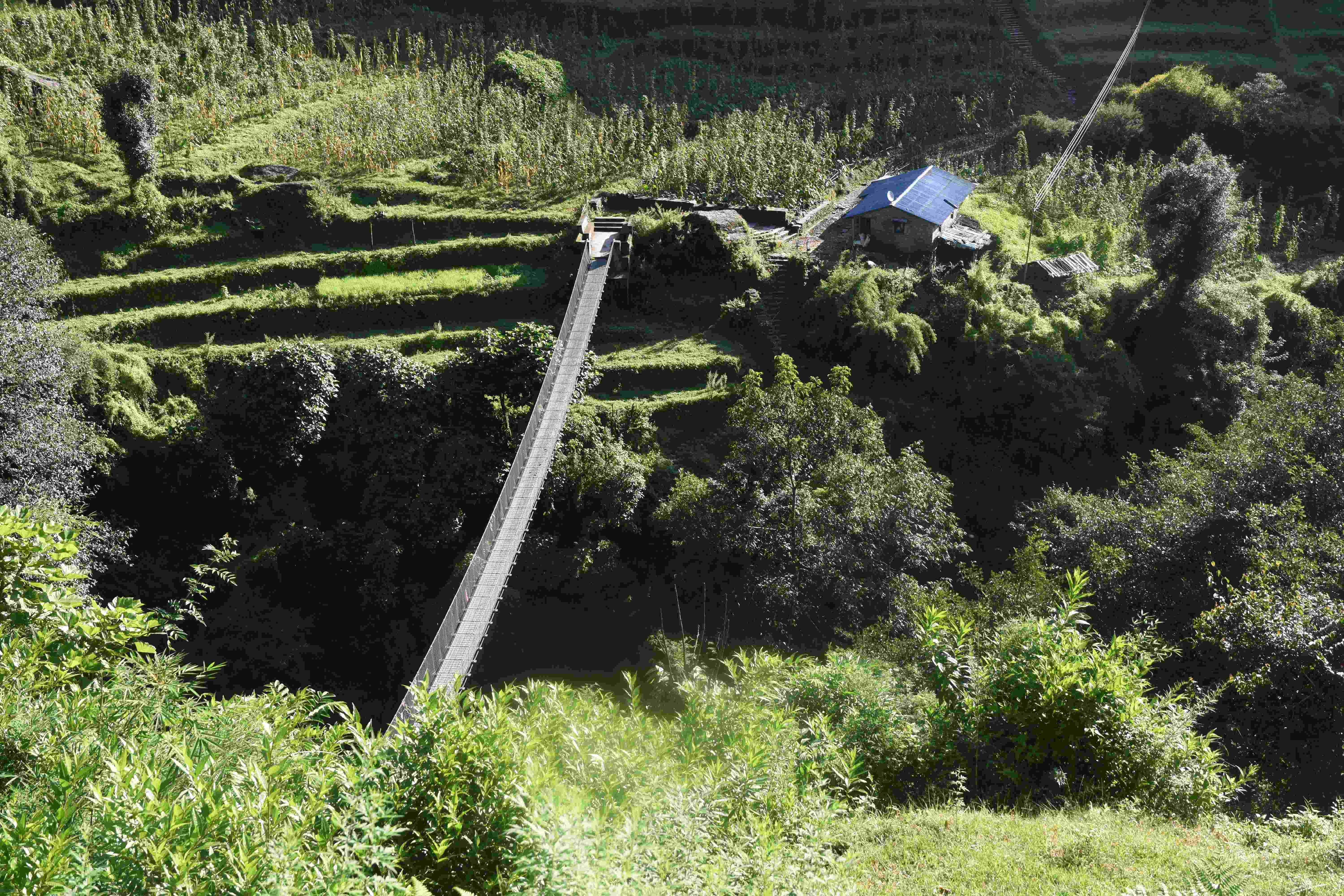 Wir haben also unsere Wanderung in Phedi gestartet. Es hat kein leichtes Angewöhnen gegeben: Uns hat eine steile Treppe, sehr hohe Luftfeuchtigkeit und hohe Temperaturen erwartet. Und die Treppen scheinen die Nepalis angetant zu haben: Sie werden uns die nächsten Tage begleiten. Und eine weitere Erkenntnis haben wir gemacht: Wenn gemäss dem Programm der Start bei 1000 m.ü.M. ist und die Übernachtung auf 1800 m.ü.M., heisst das nicht, dass man nur 800 Höhenmeter macht. Der Weg überquert verschiedene Täler und Hügel (sogar über das Ziel, zum oberen Beispiel über 2100 m.ü.M.) oder führt von der einen Flussseite zur anderen…und dazwischen gibts natürlich Treppen.