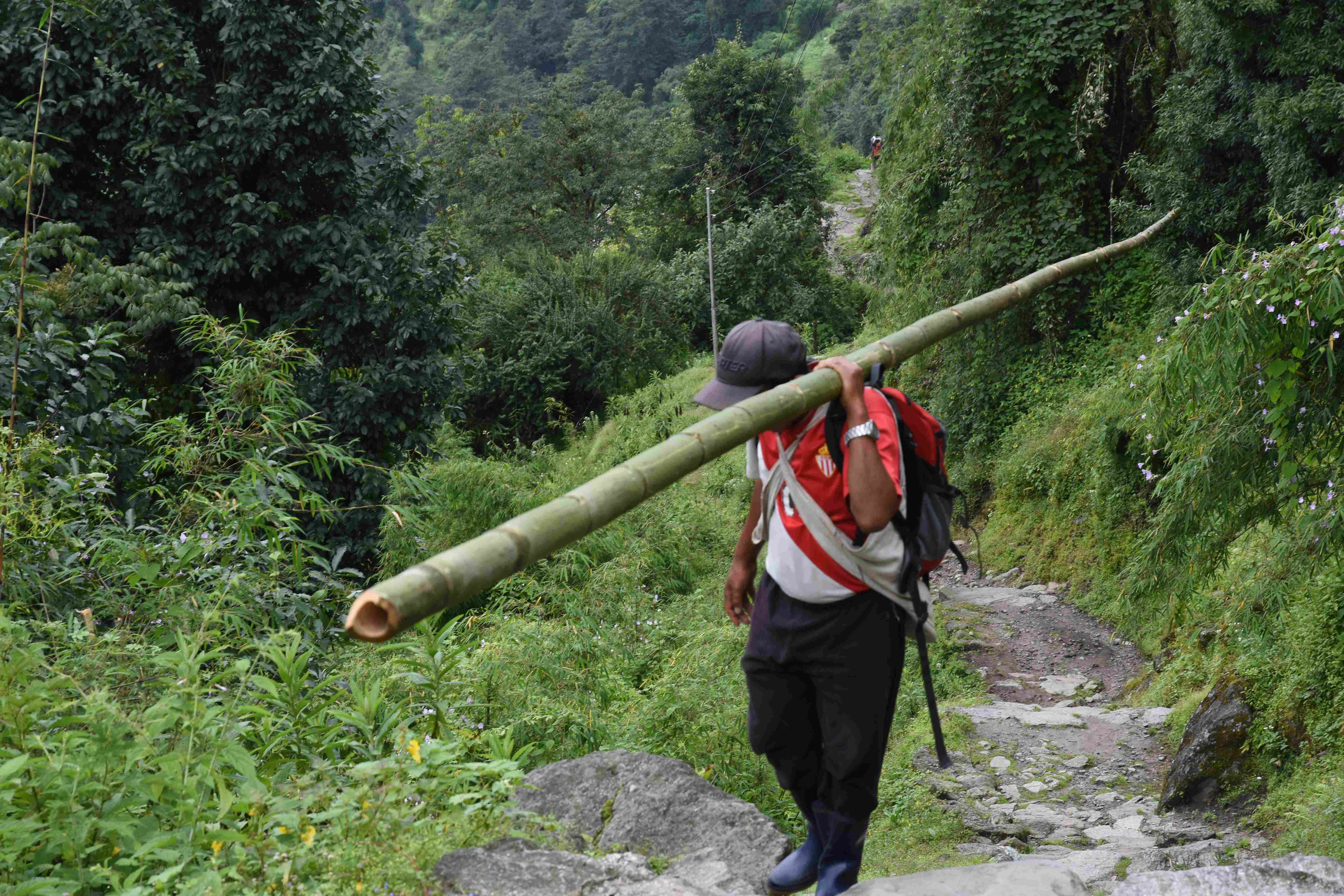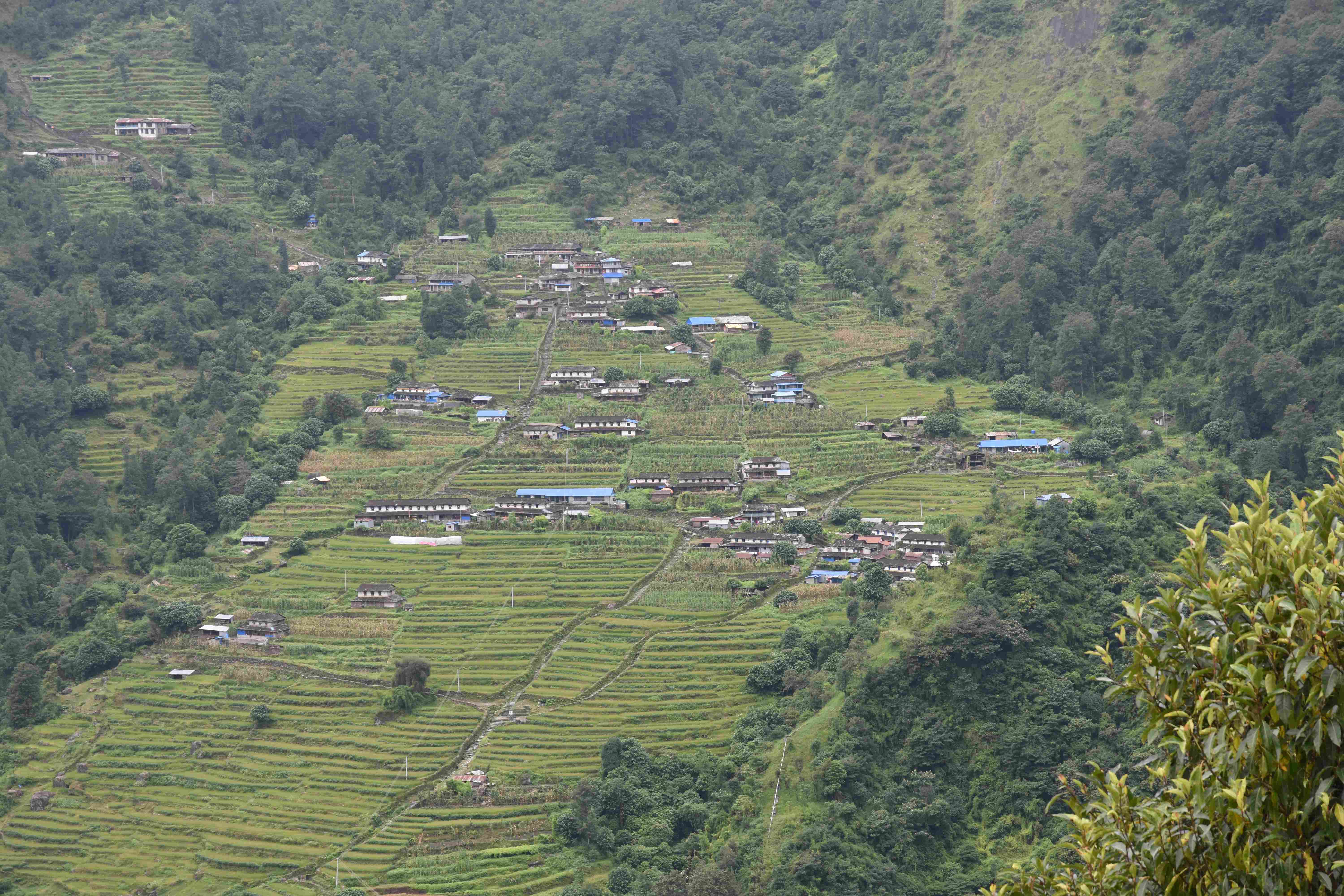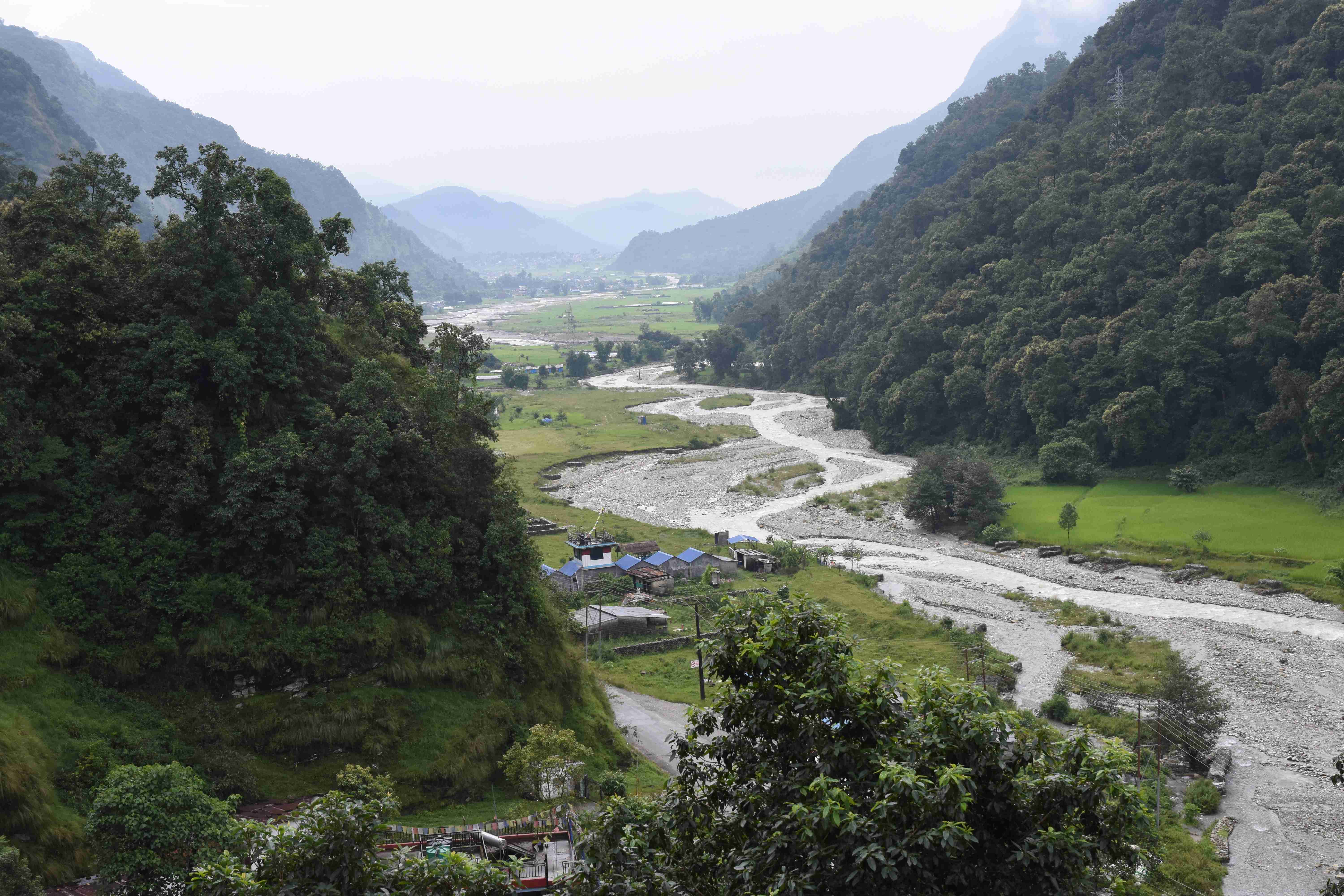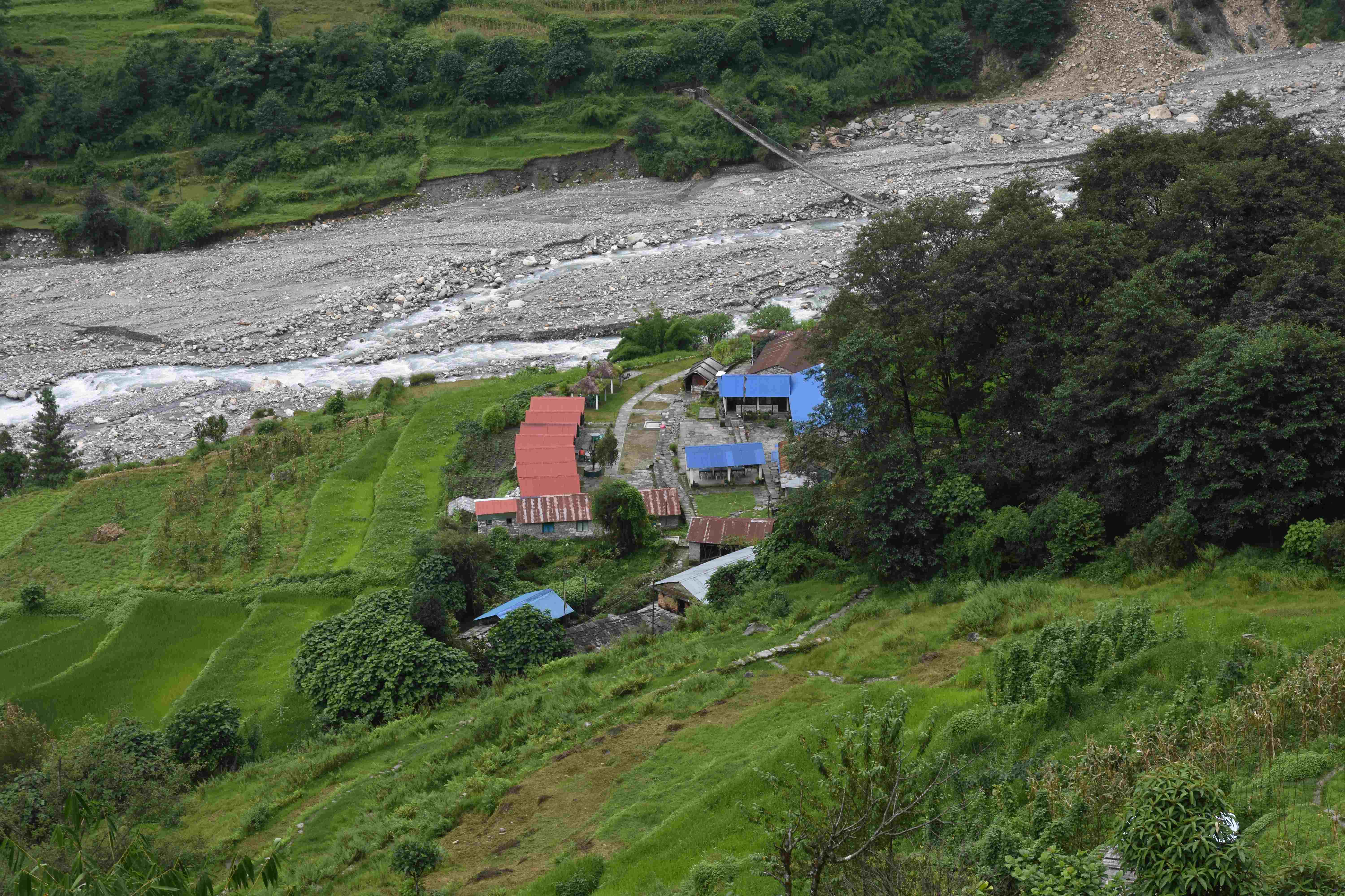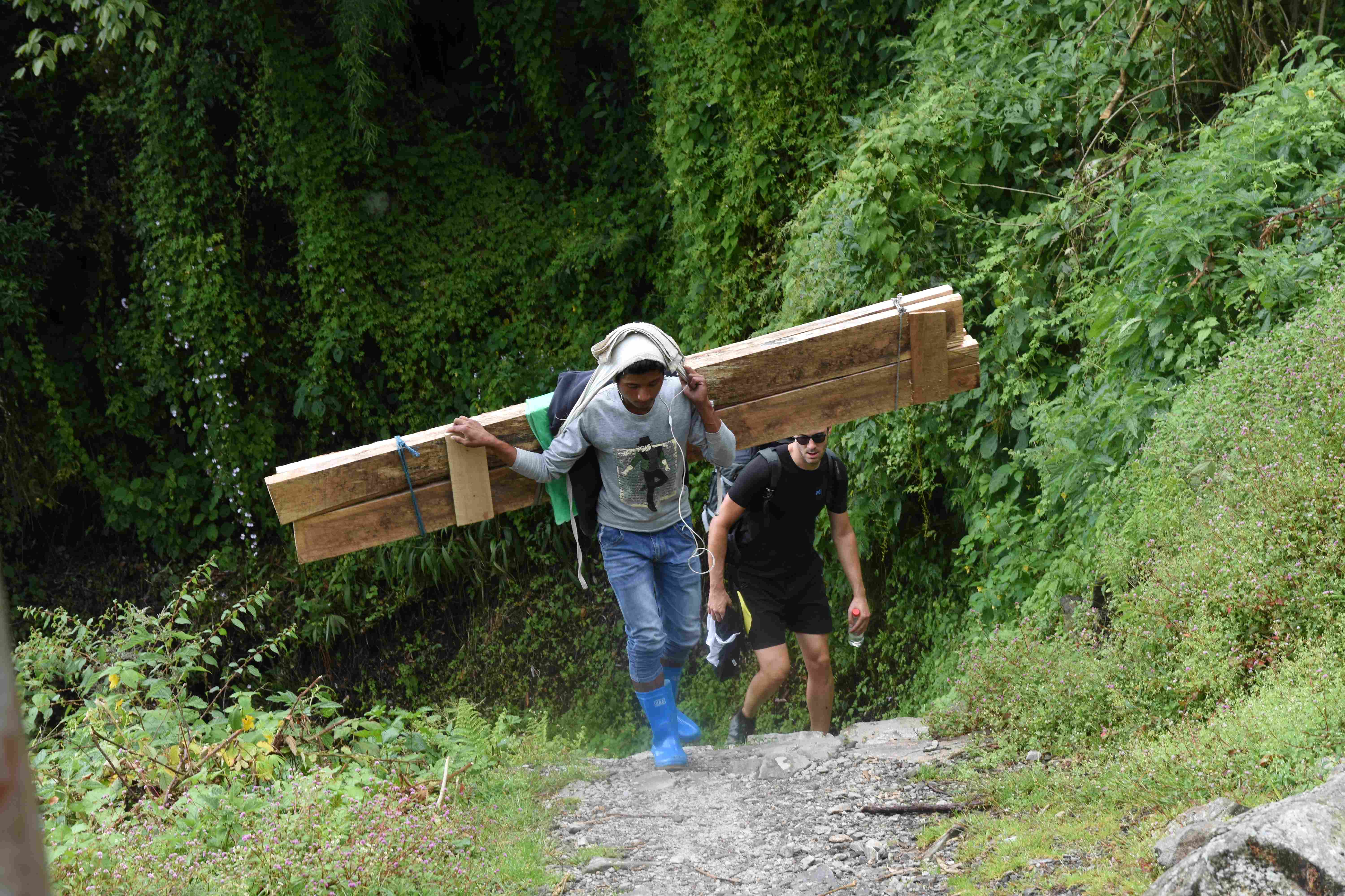 Wir haben also unsere Wanderung in Phedi gestartet. Es hat kein leichtes Angewöhnen gegeben: Uns hat eine steile Treppe, sehr hohe Luftfeuchtigkeit und hohe Temperaturen erwartet. Und die Treppen scheinen die Nepalis angetant zu haben: Sie werden uns die nächsten Tage begleiten. Und eine weitere Erkenntnis haben wir gemacht: Wenn gemäss dem Programm der Start bei 1000 m.ü.M. ist und die Übernachtung auf 1800 m.ü.M., heisst das nicht, dass man nur 800 Höhenmeter macht. Der Weg überquert verschiedene Täler und Hügel (sogar über das Ziel, zum oberen Beispiel über 2100 m.ü.M.) oder führt von der einen Flussseite zur anderen…und dazwischen gibts natürlich Treppen.