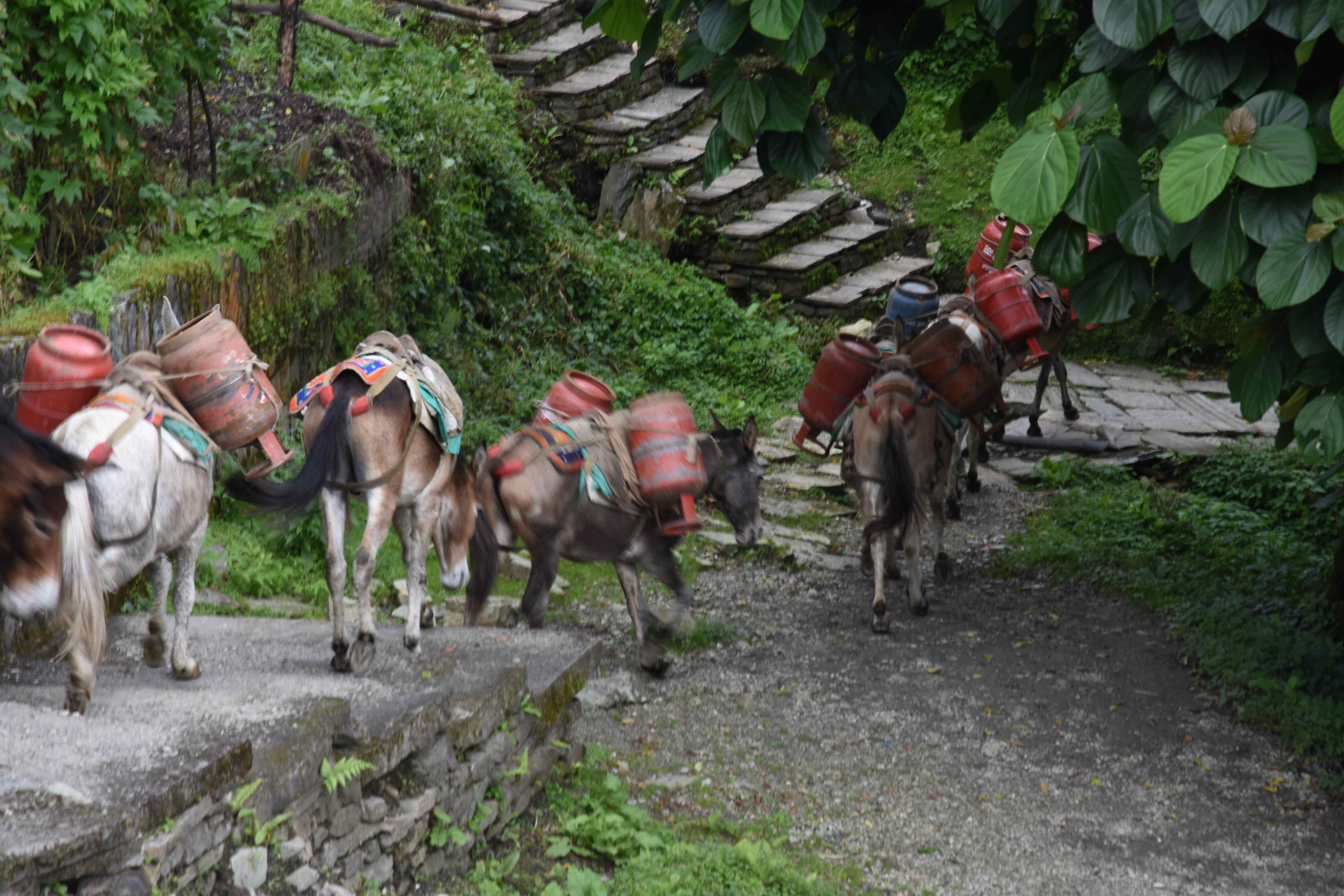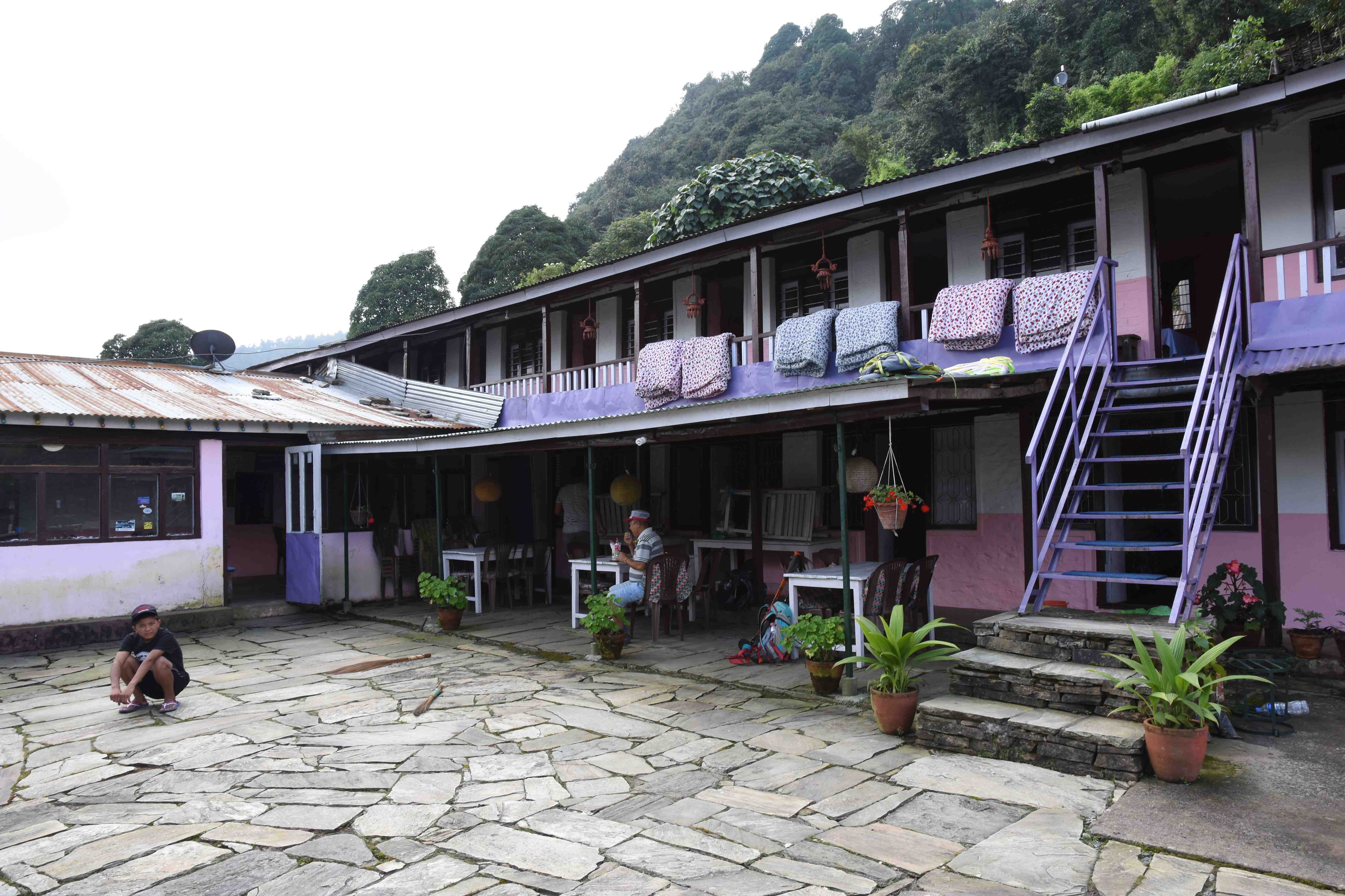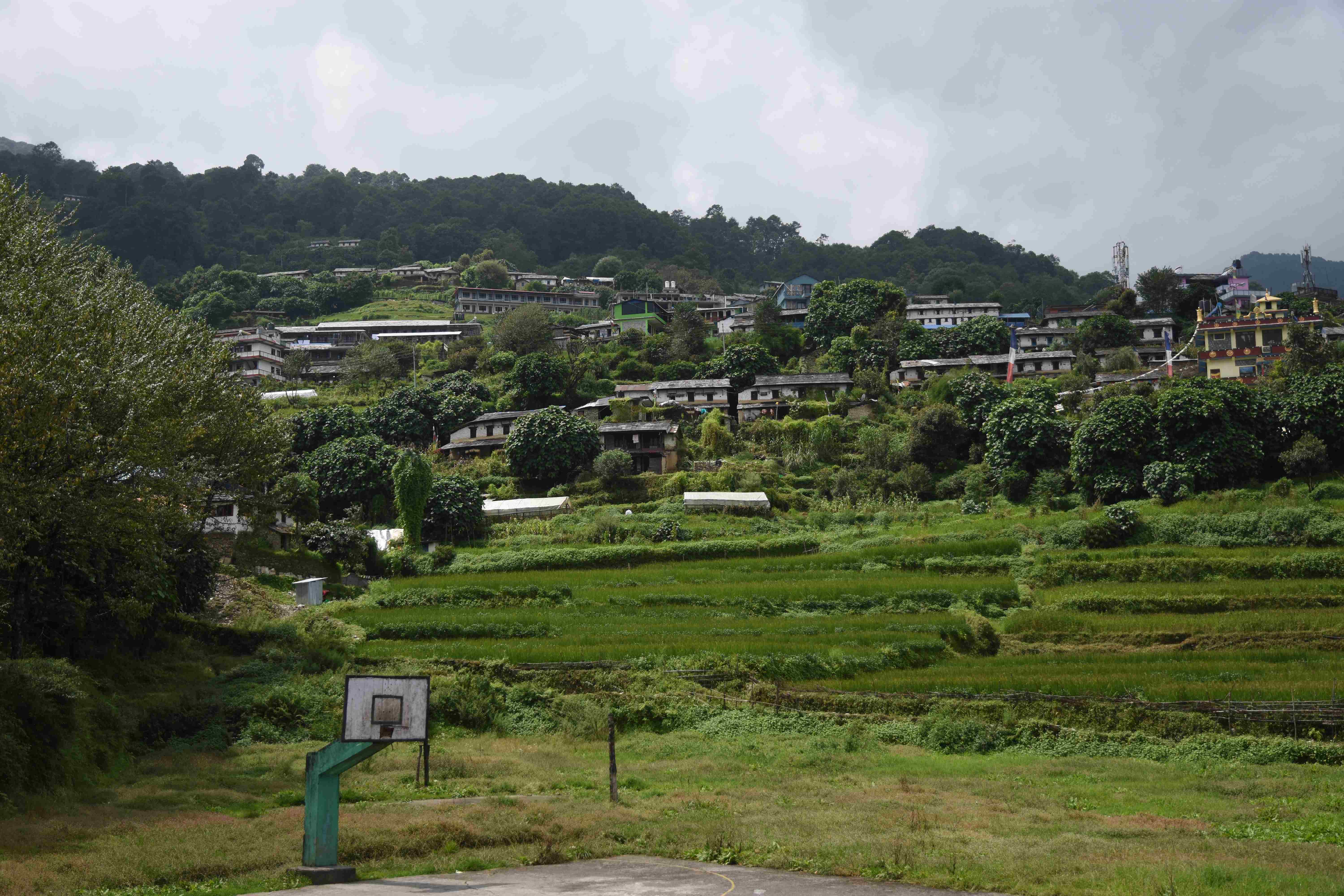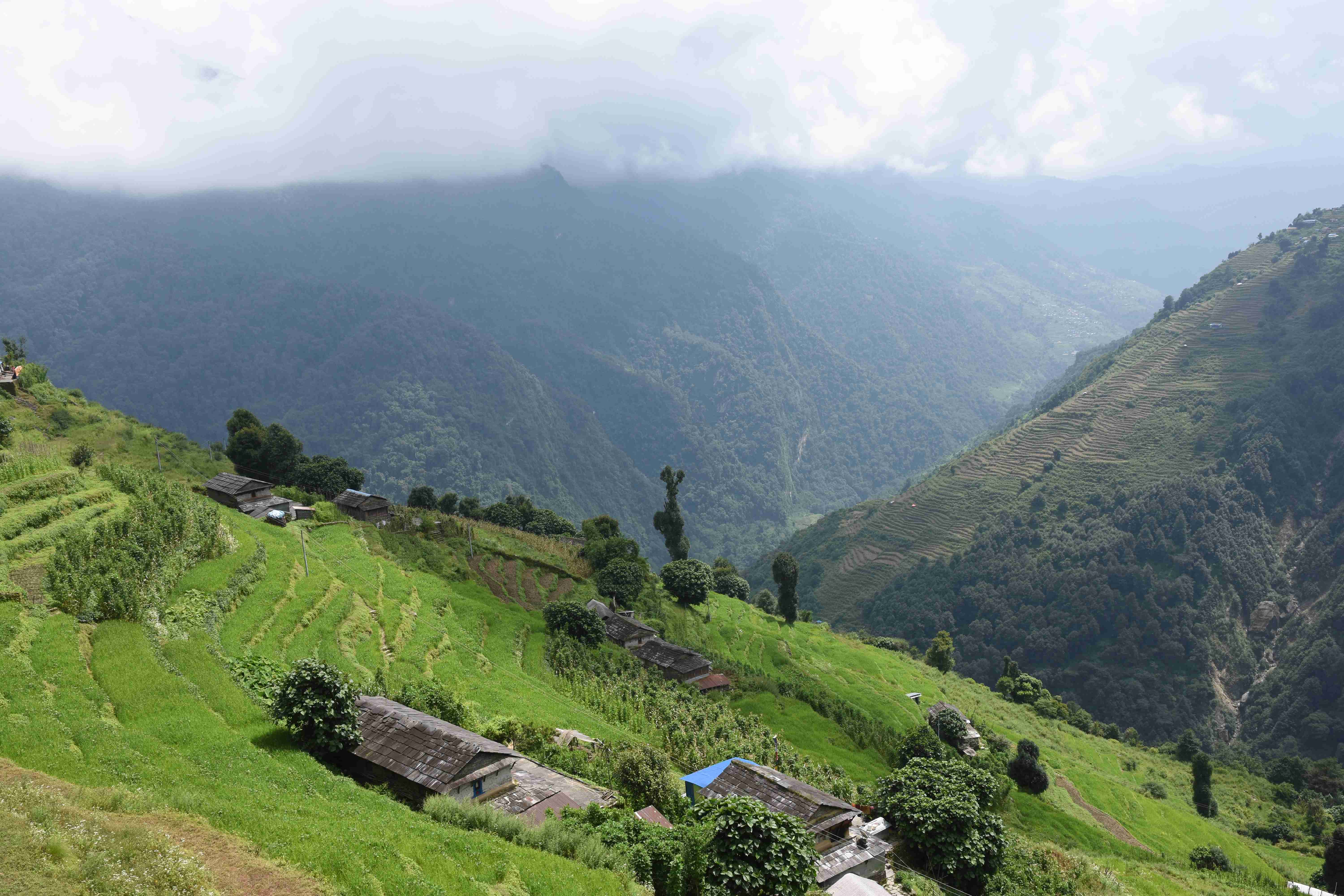 Wir haben also unsere Wanderung in Phedi gestartet. Es hat kein leichtes Angewöhnen gegeben: Uns hat eine steile Treppe, sehr hohe Luftfeuchtigkeit und hohe Temperaturen erwartet. Und die Treppen scheinen die Nepalis angetant zu haben: Sie werden uns die nächsten Tage begleiten. Und eine weitere Erkenntnis haben wir gemacht: Wenn gemäss dem Programm der Start bei 1000 m.ü.M. ist und die Übernachtung auf 1800 m.ü.M., heisst das nicht, dass man nur 800 Höhenmeter macht. Der Weg überquert verschiedene Täler und Hügel (sogar über das Ziel, zum oberen Beispiel über 2100 m.ü.M.) oder führt von der einen Flussseite zur anderen…und dazwischen gibts natürlich Treppen.