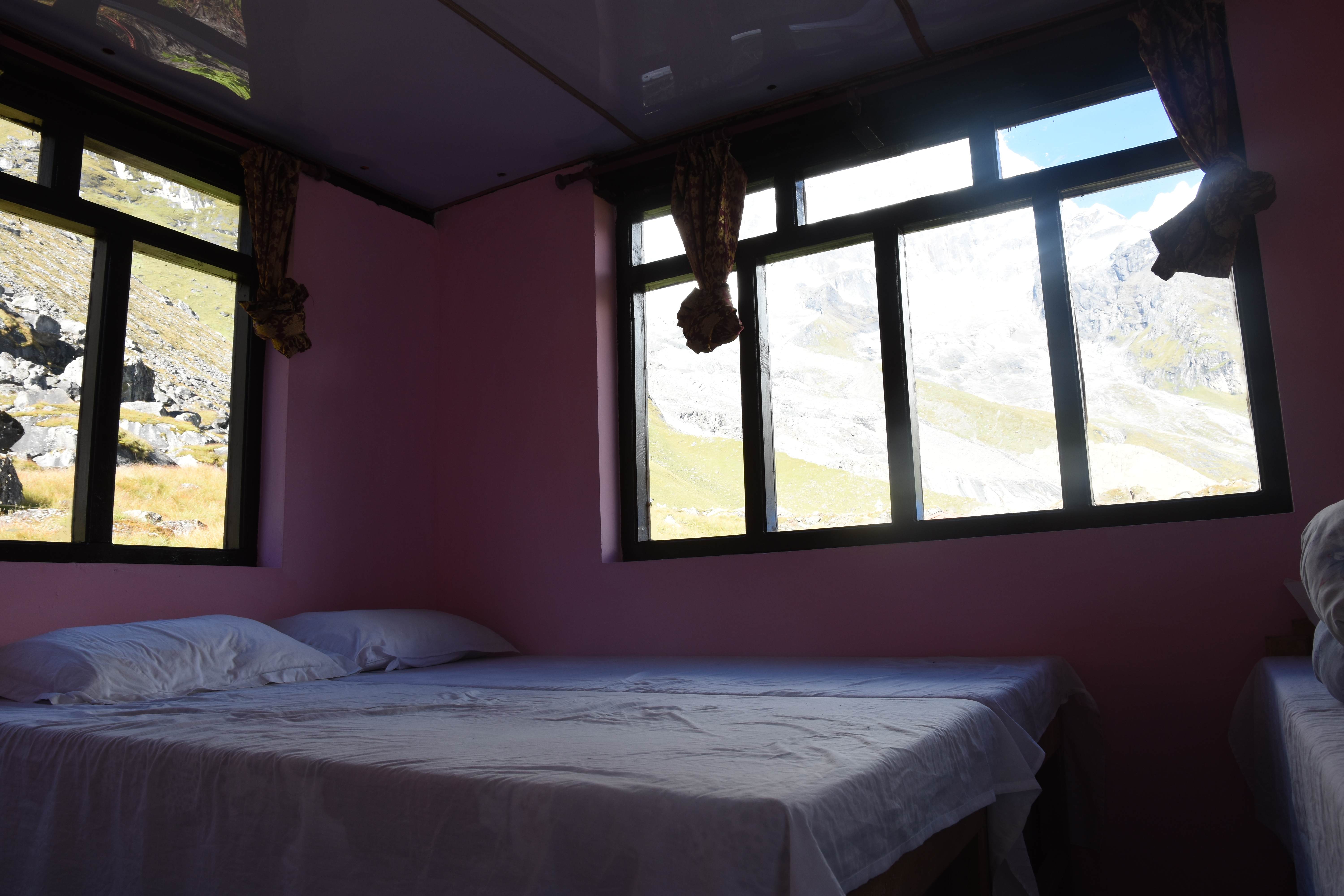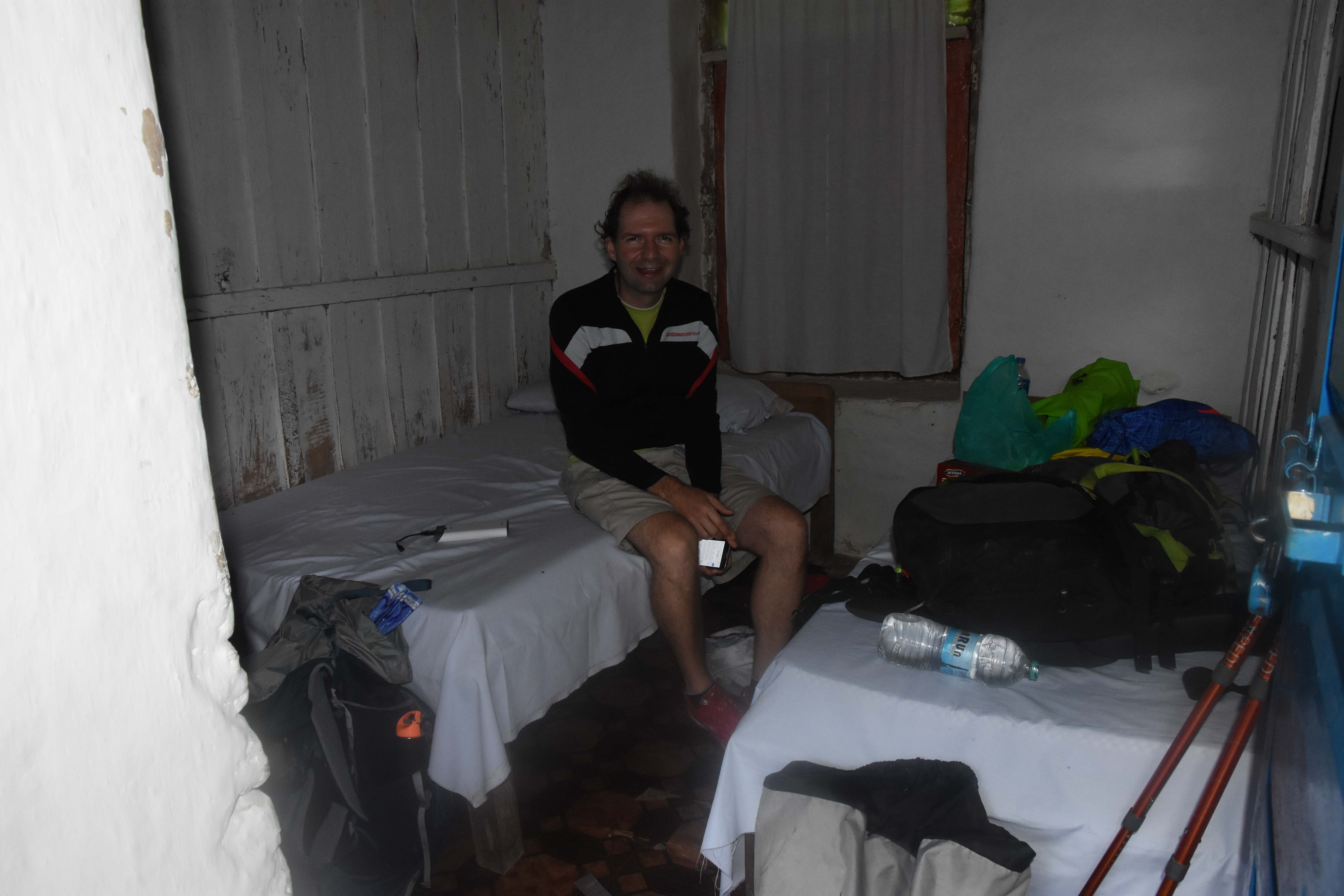 Von den Lodges waren wir überrascht: Sie haben eine recht grosse Karte im Restaurant: für mich gibts sogar Pasta! Und Coca-Cola gibts natürlich auch (siehe oben…), wobei der Preis je nach Höhe von 2.20 CHF für 5 dl bis 3.60 CHF für 1.8 dl reicht. Häufig kann man mit lauwarmem oder sogar heissem Wasser duschen und die Zimmer sind gar nicht so schlecht. Wir sind aber trotzdem froh, einen Schlafsack dabei zu haben (der Porter trägts ja), damit wir nicht direkten Kontakt zum Bettüberzug haben. Es ist etwas unklar, wie häufig der gewaschen wird…