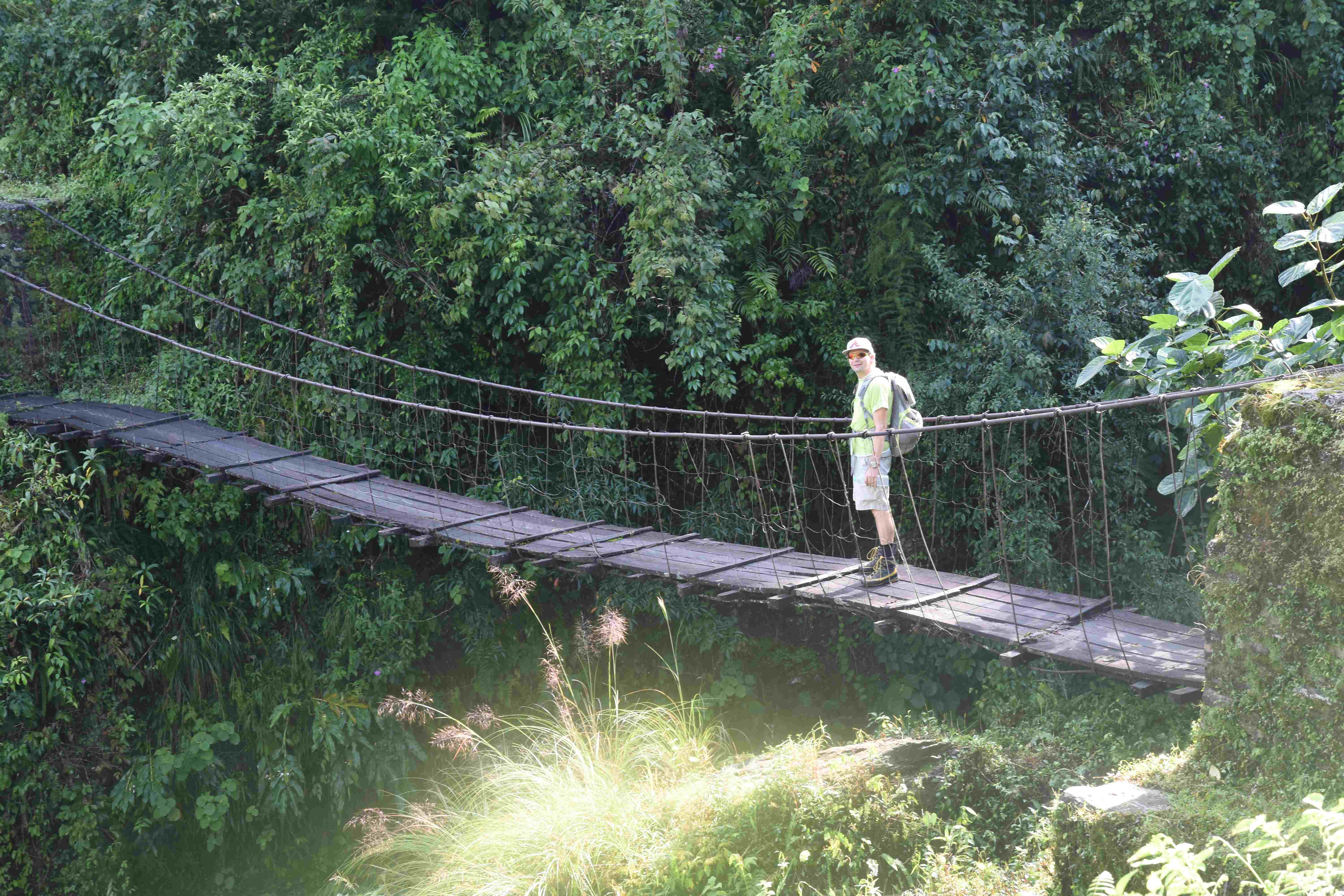 Unsere Wanderung führt uns in den “unteren” Höhenmetern bis 3200 m.ü.M. durch recht dichten Urwald und wir überqueren verschiedene Bäche über mehr oder weniger vertrauenswürdige Brücken. Ein Geländer hats normalerweise nicht und zwischendurch sind die Bretter, auf denen man über die Brücke geht, etwas löchrig…