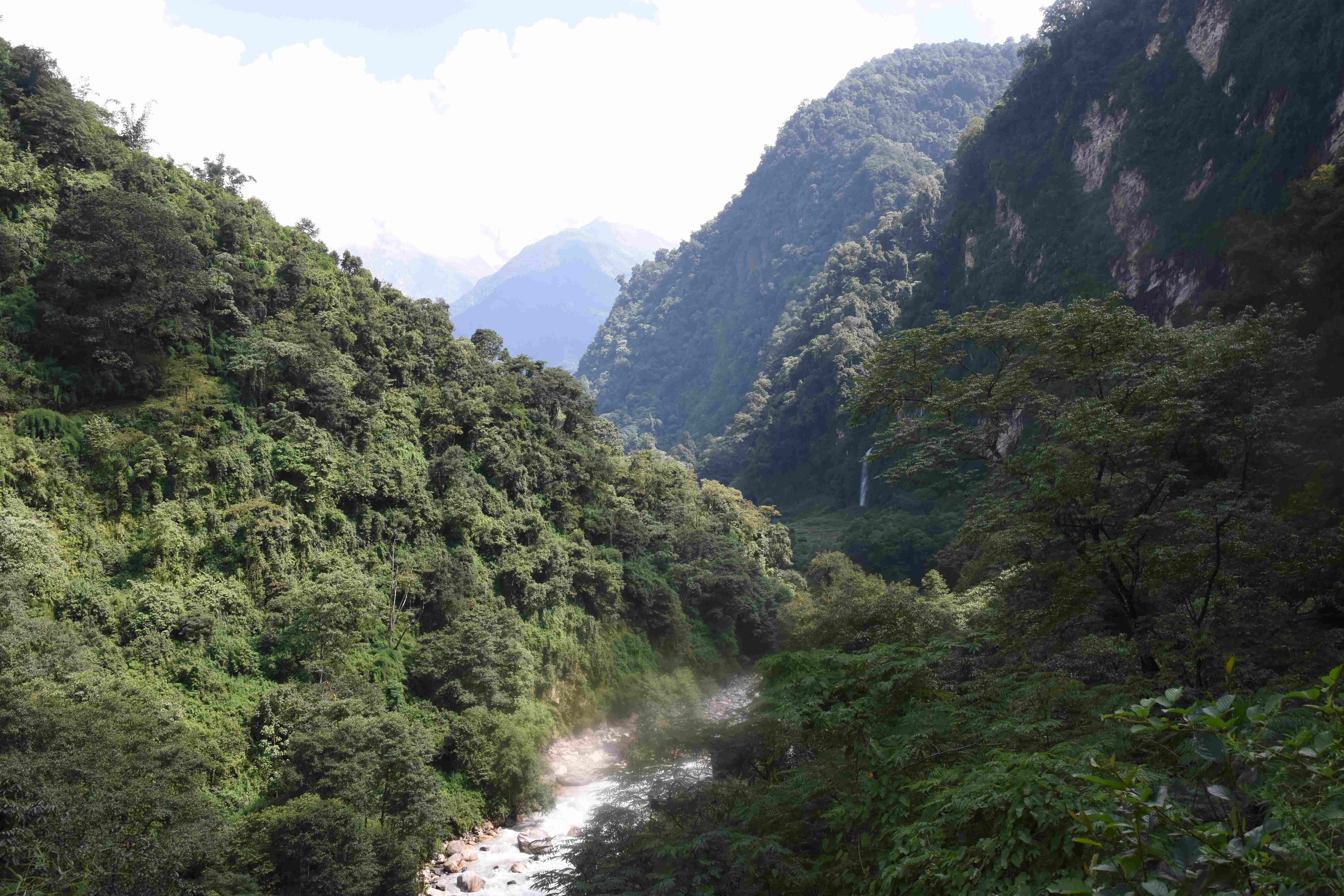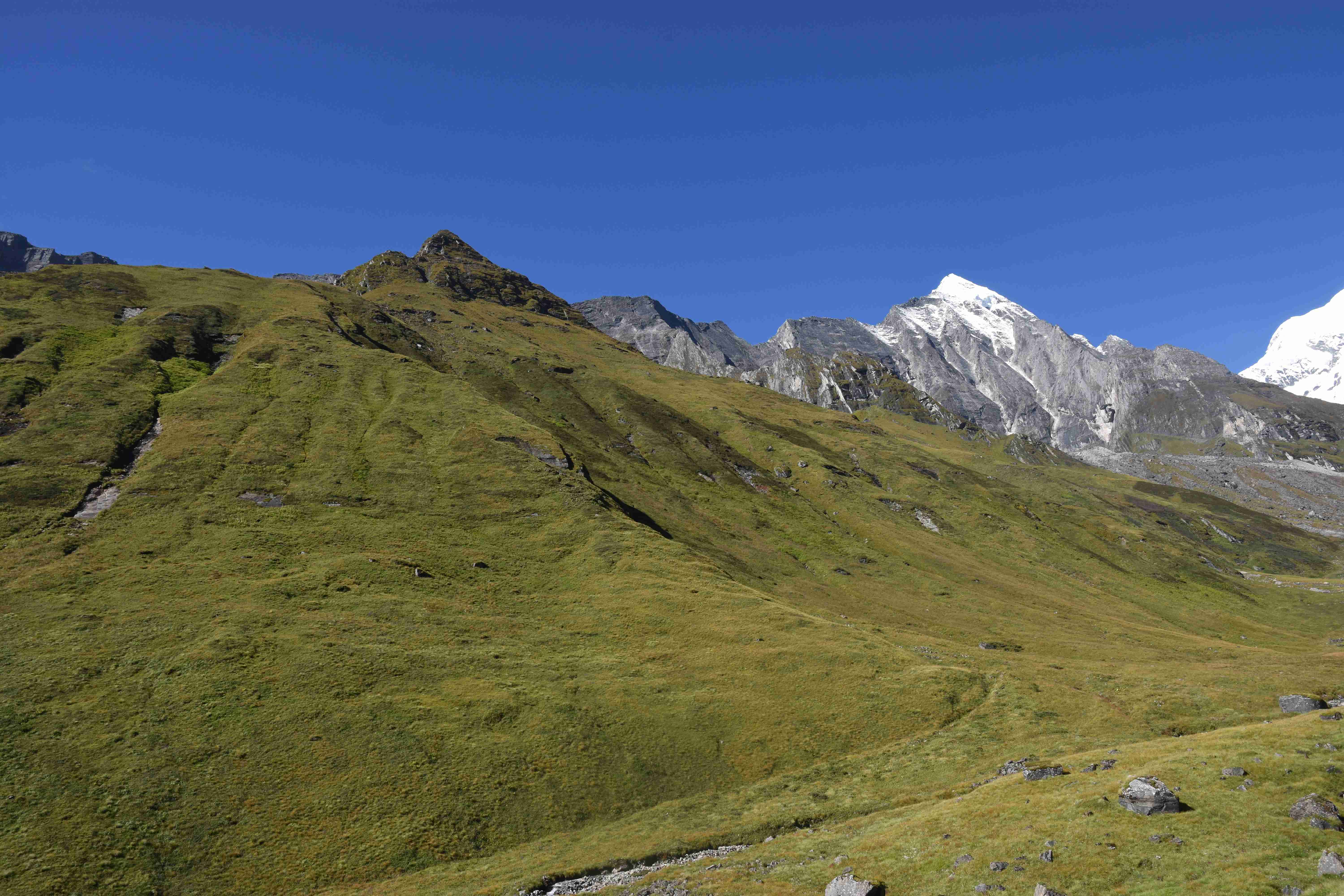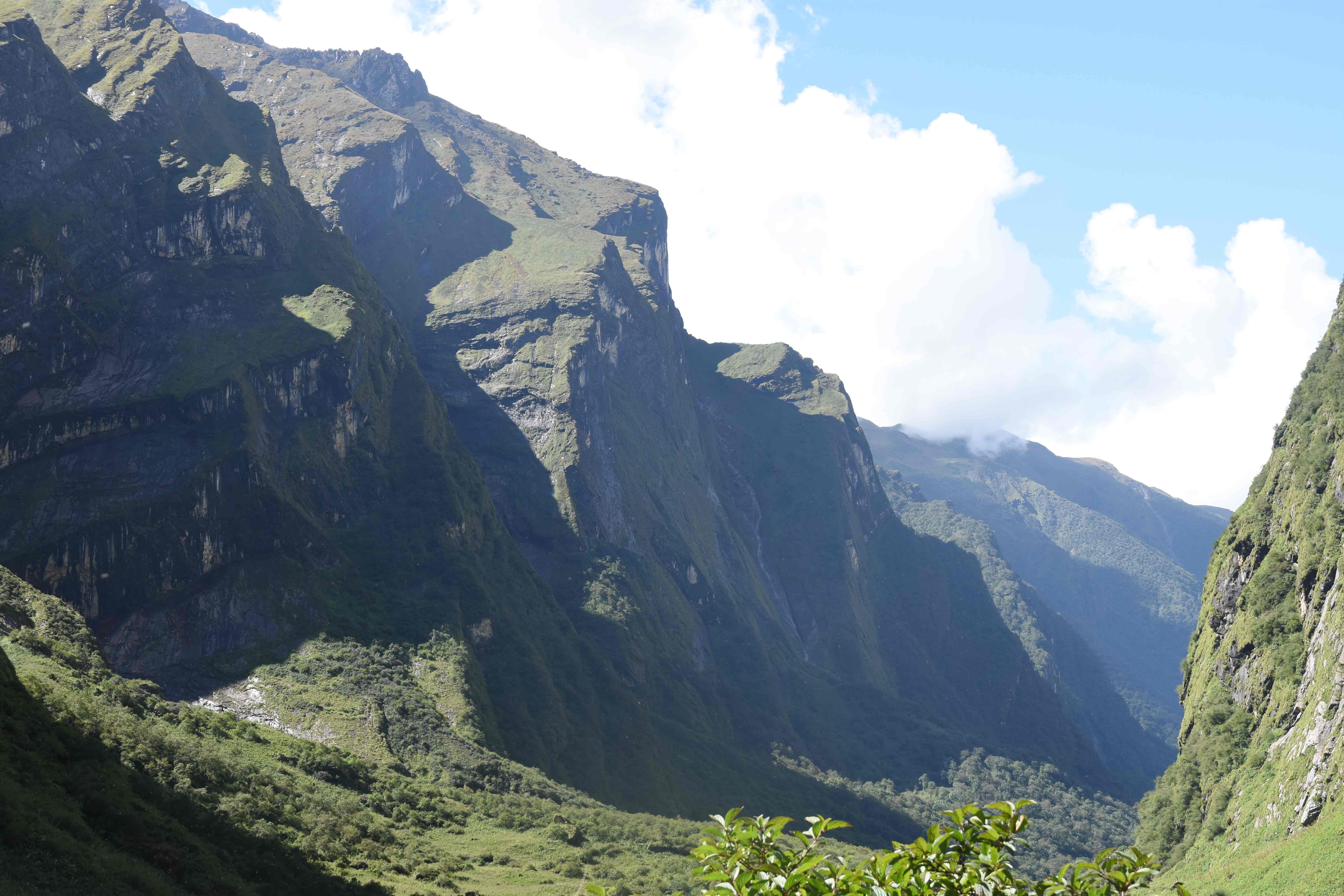 Und auch oberhalb der Waldgrenze ist es sehr grün, auch die Felswände sind mit Moos bewachsen. Von hier hat man auch eine grandiose Sicht auf zum Teil über 8000 m hohe Berge! Und da unser Guide nach seinen Aussagen das Wetter beeinflussen kann (I put the clouds in my pocket, siehe oben) hatten wir auch eine sehr schöne Sicht.