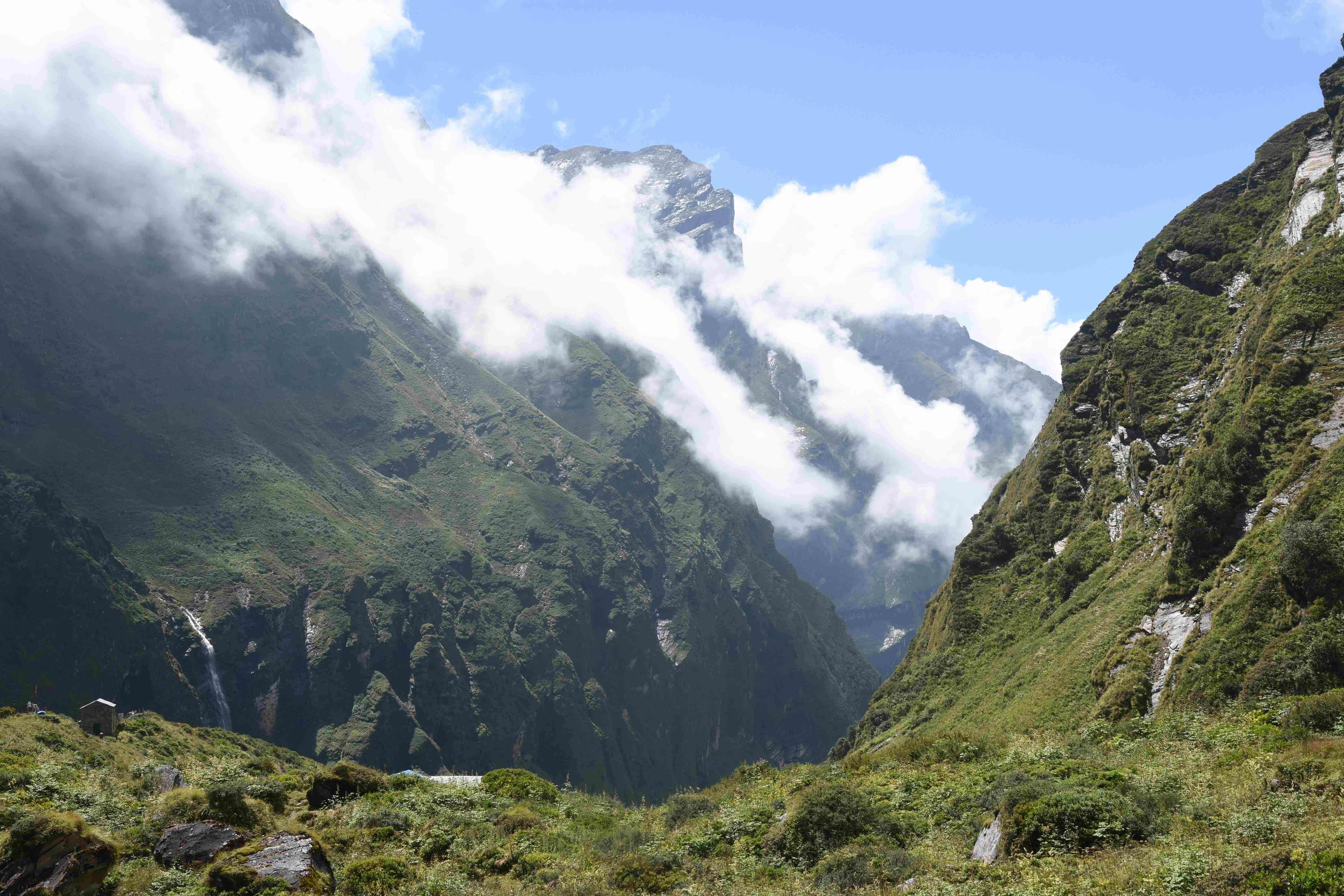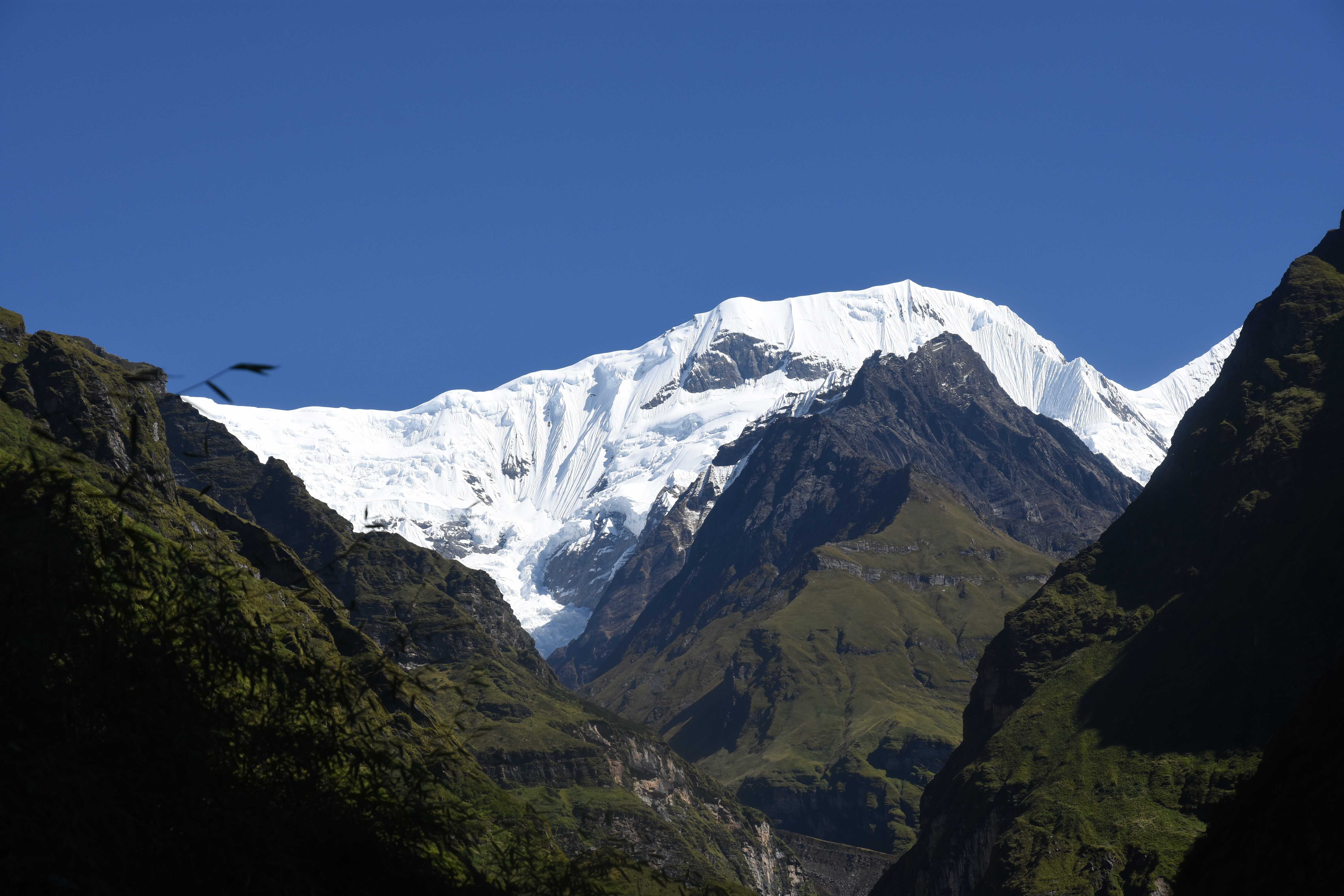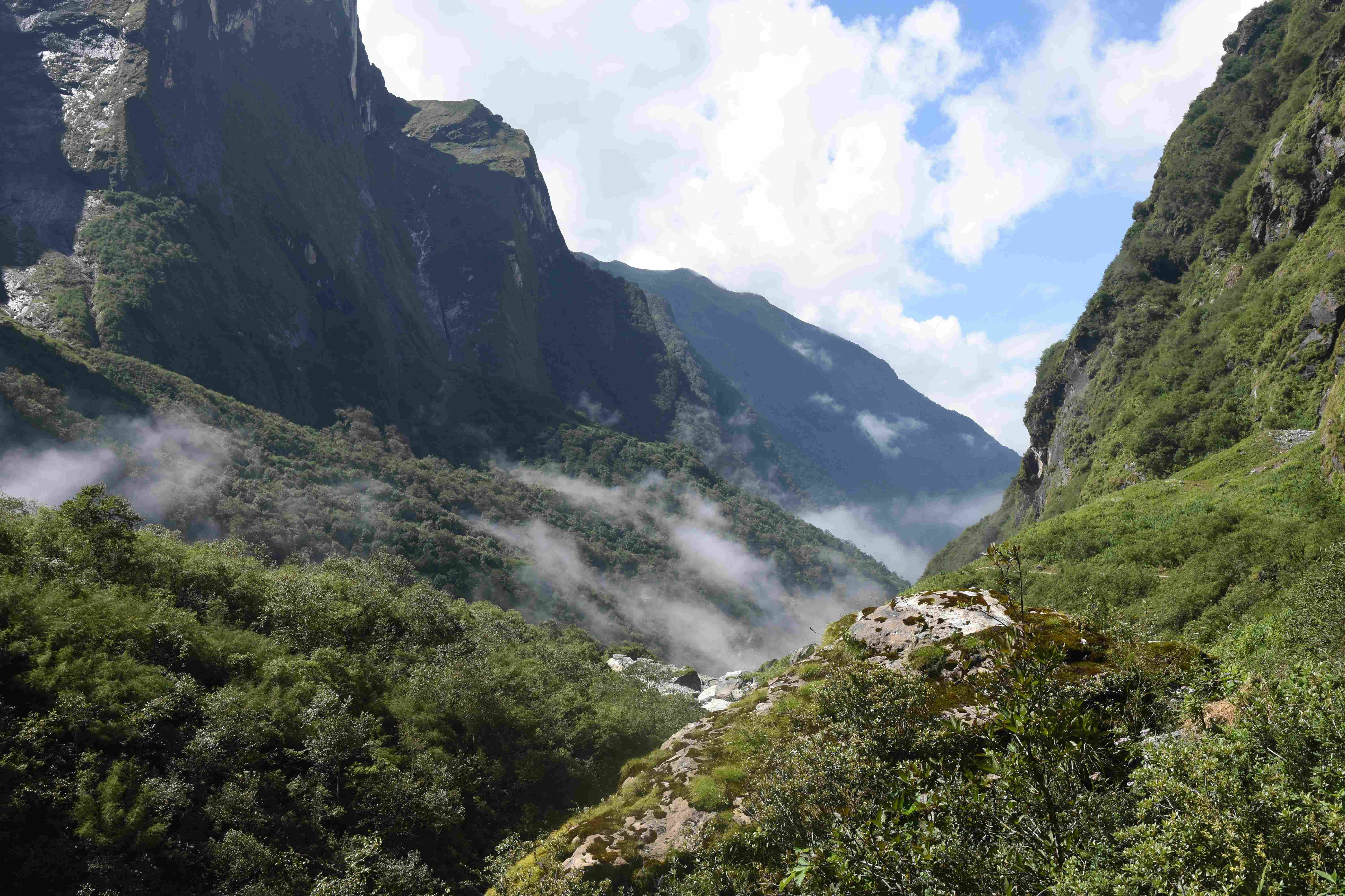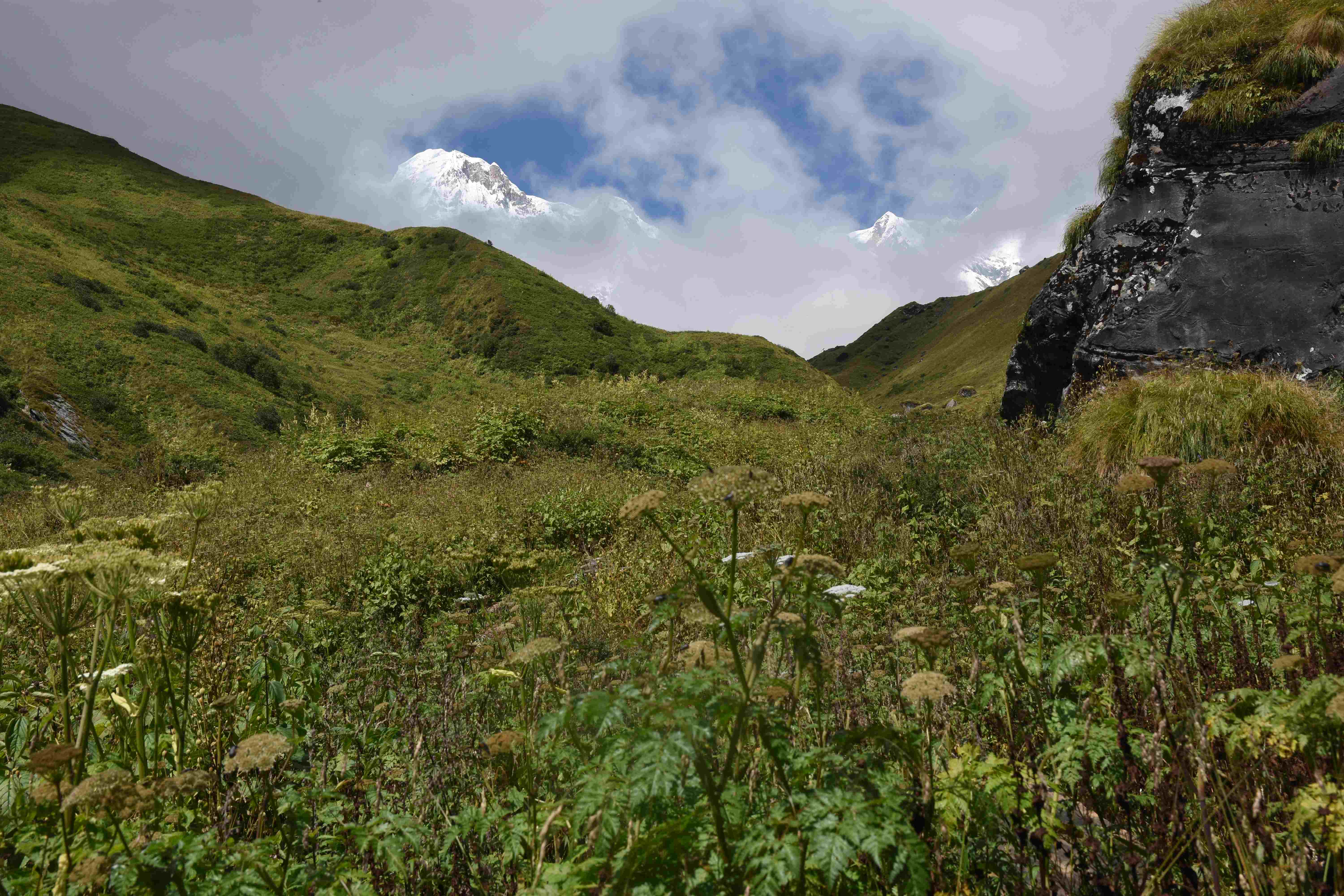 Und auch oberhalb der Waldgrenze ist es sehr grün, auch die Felswände sind mit Moos bewachsen. Von hier hat man auch eine grandiose Sicht auf zum Teil über 8000 m hohe Berge! Und da unser Guide nach seinen Aussagen das Wetter beeinflussen kann (I put the clouds in my pocket, siehe oben) hatten wir auch eine sehr schöne Sicht.