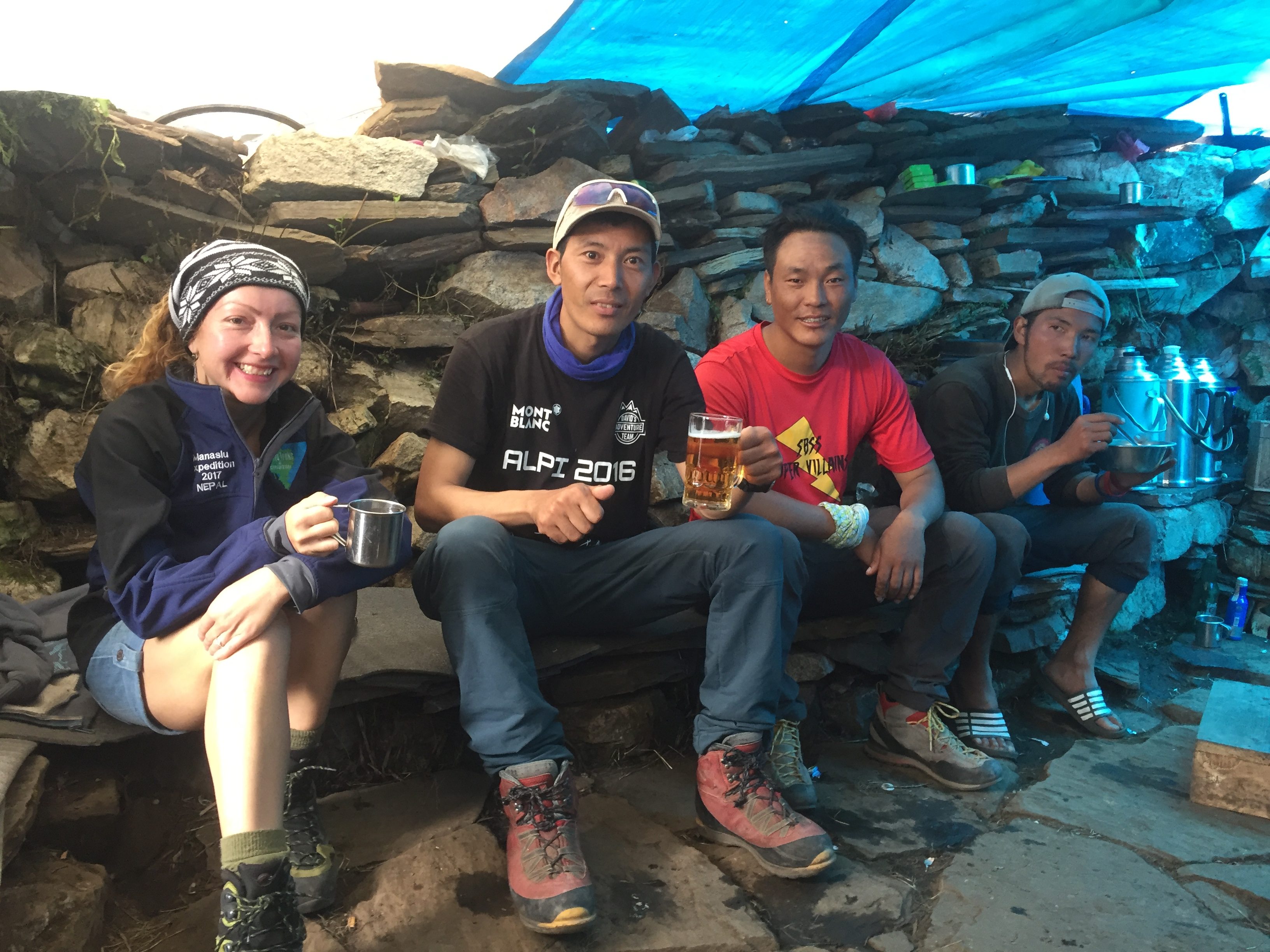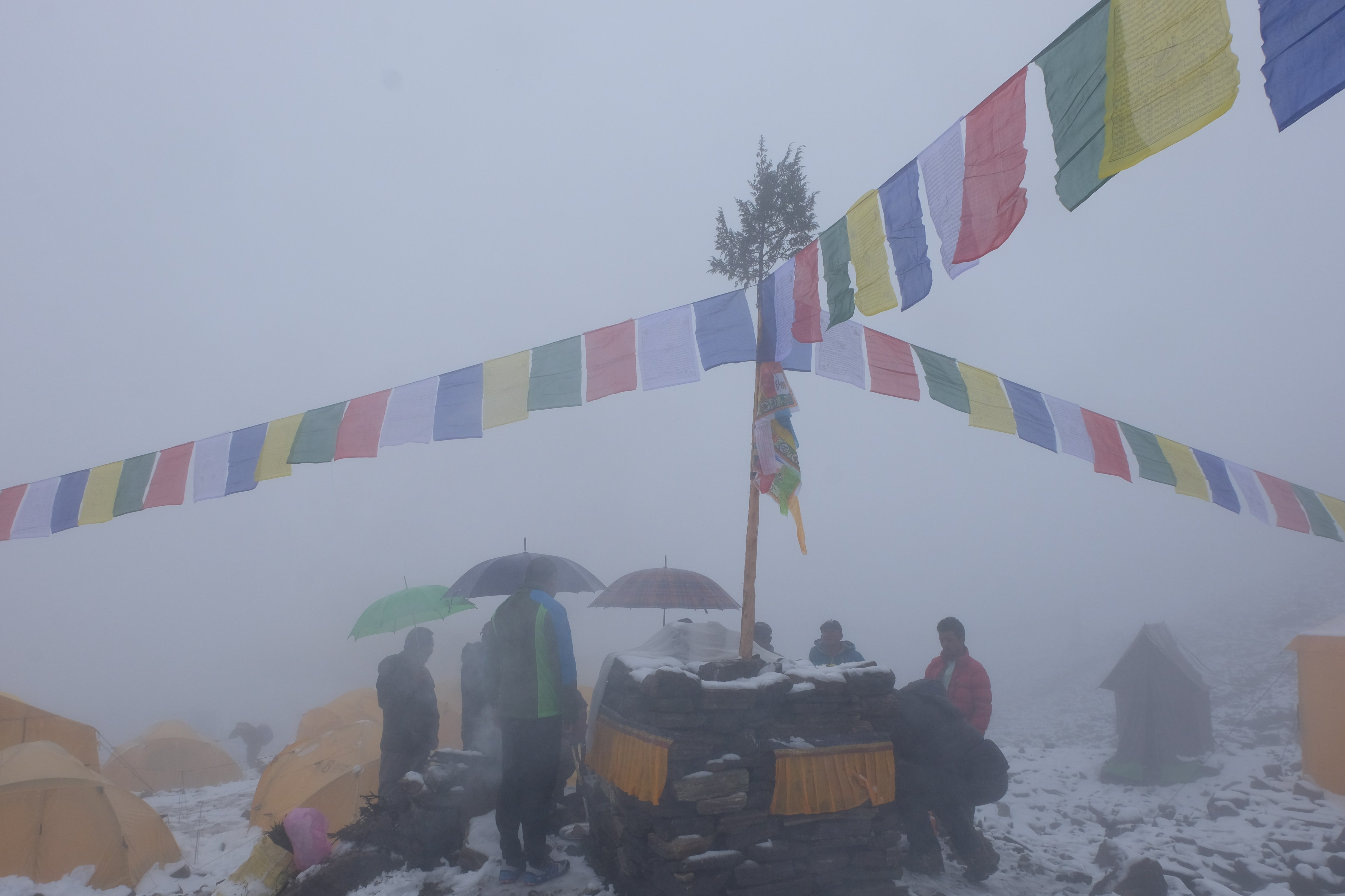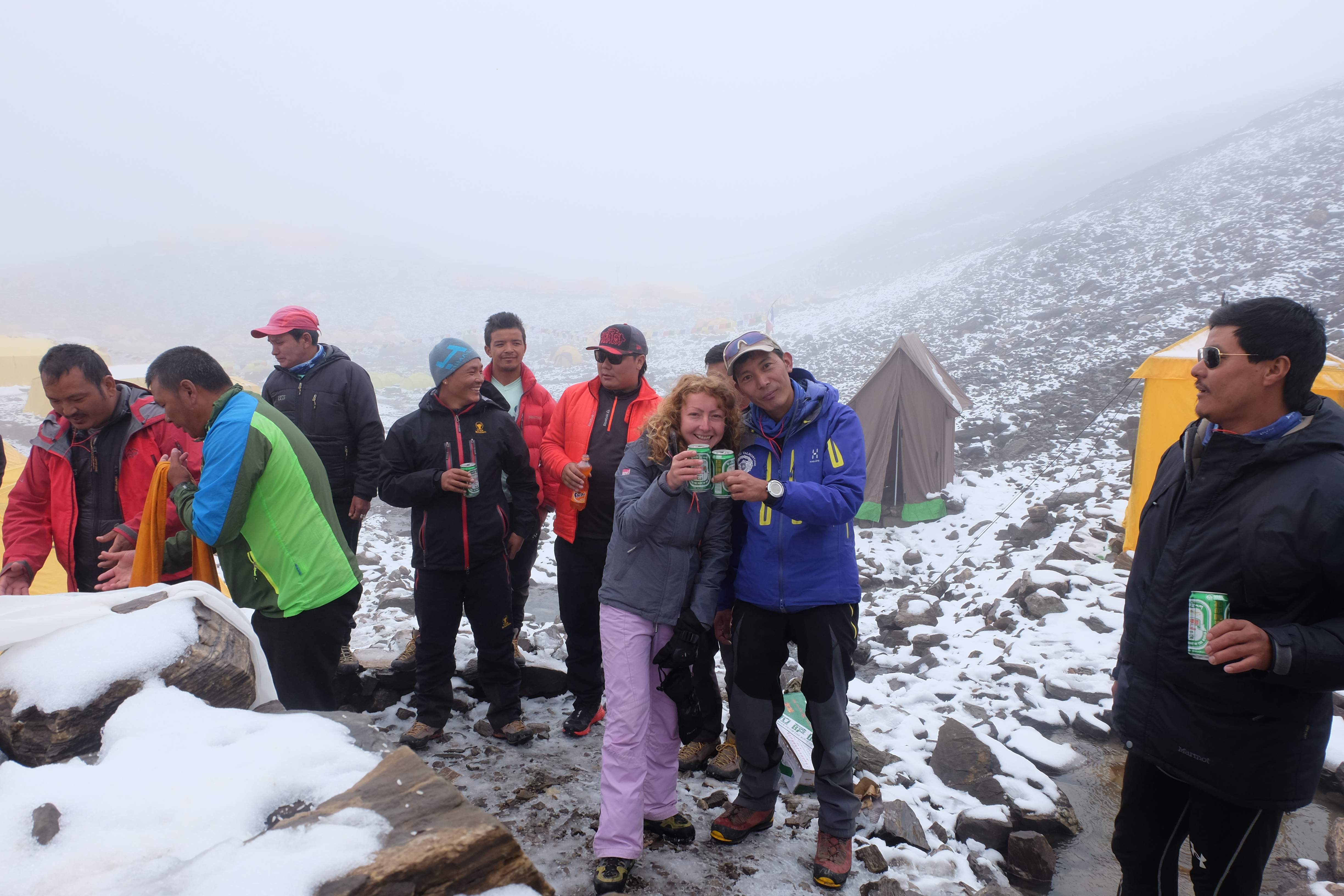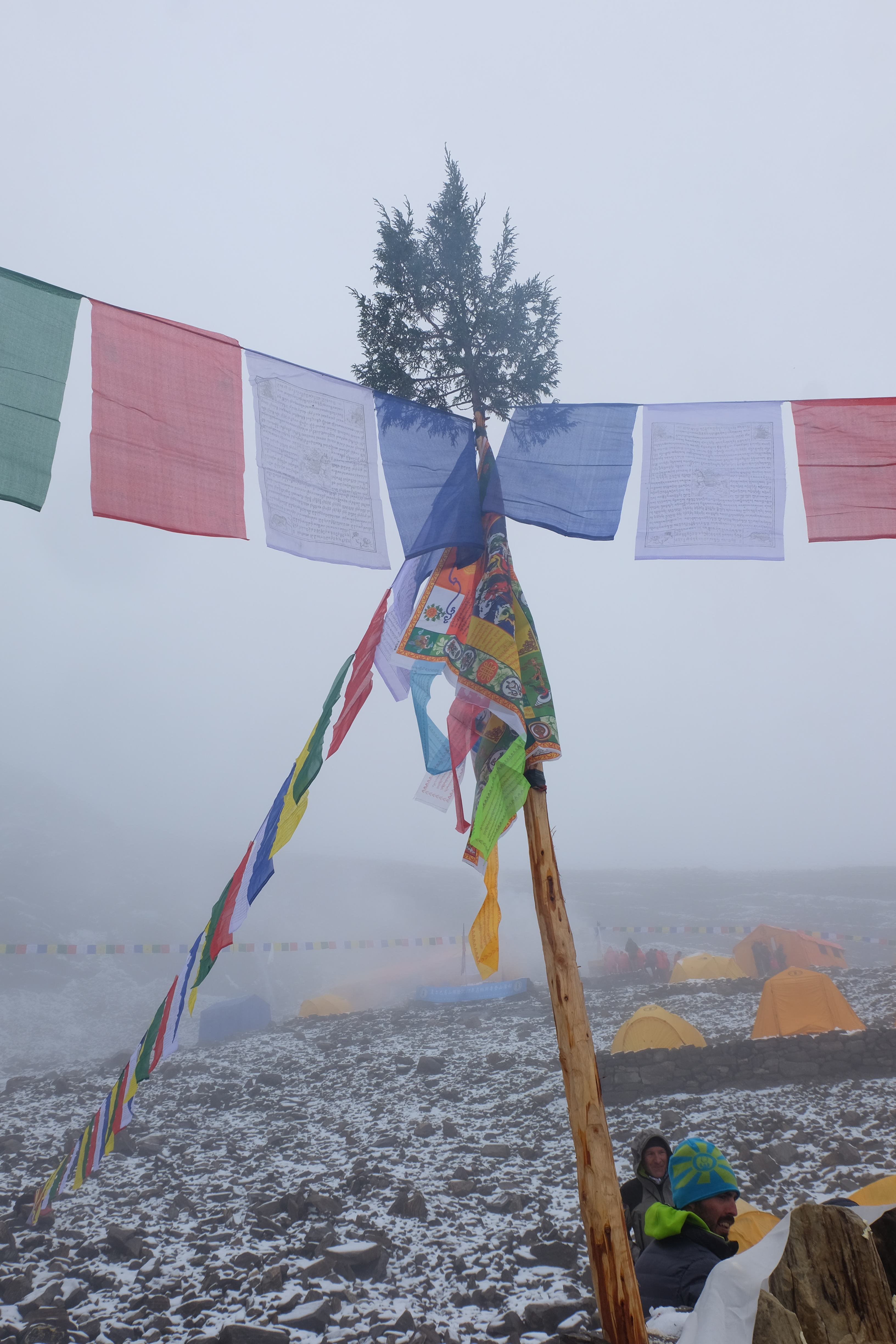 Eines von vielen westlichen Bergsteigern etwas oberflächlich, von den Sherpa allerdings als sine qua non wahrgenommenes Erlebnis ist die Pujah-Zeremonie. Dabei handelt es sich um ein für uns fremdes, allerdings ziemlich rührendes buddhistisches Ritual vor der Besteigung eines dermassen hohen Berges, während welches man dessen Geist um Gnade bittet und man sich von dessen Gott (jeder Berg hat seinen eigenen Gott) die Erlaubnis erhofft, ihn zu besteigen. An dem jeweiligen Tag wird nichts bestiegen, sondern gefeiert und getrunken. Das Alkohol-Trinken gehört an dem Tag dazu, wird aber von den westlichen Bergsteigern mit grossem Bedenken angeschaut, da dies nicht unbedingt dem durchgeplanten Trainingsprogramm eines Athleten vor einer solchen Herausforderung entspricht. Dass ich die einzige aus meinem 11-Personen Essenszelt-Team war, die zusammen mit den Sherpas ein Bier und ihre traditionelle „Sherpa-Suppe“ trank, sagt bereits viel aus.