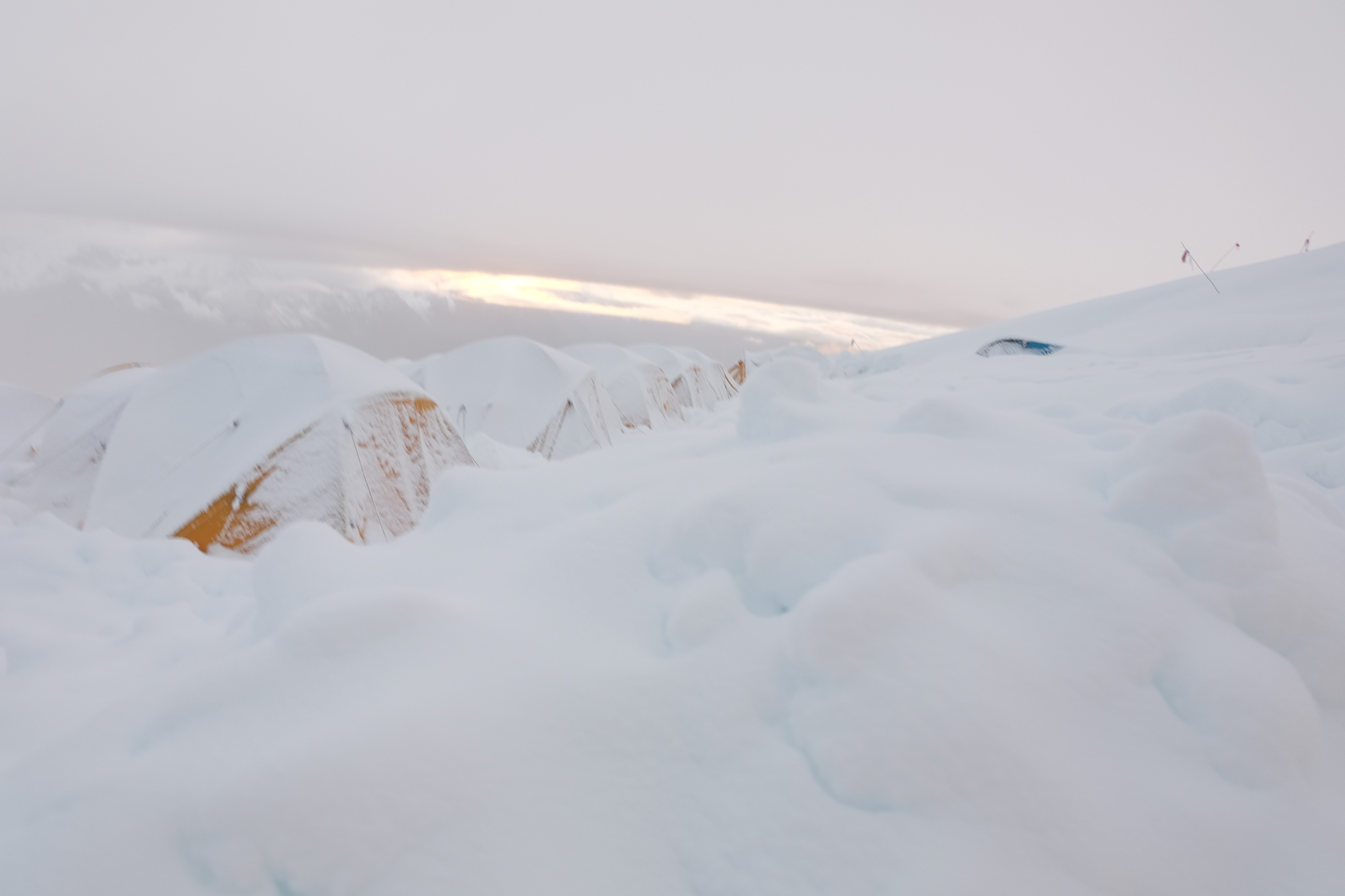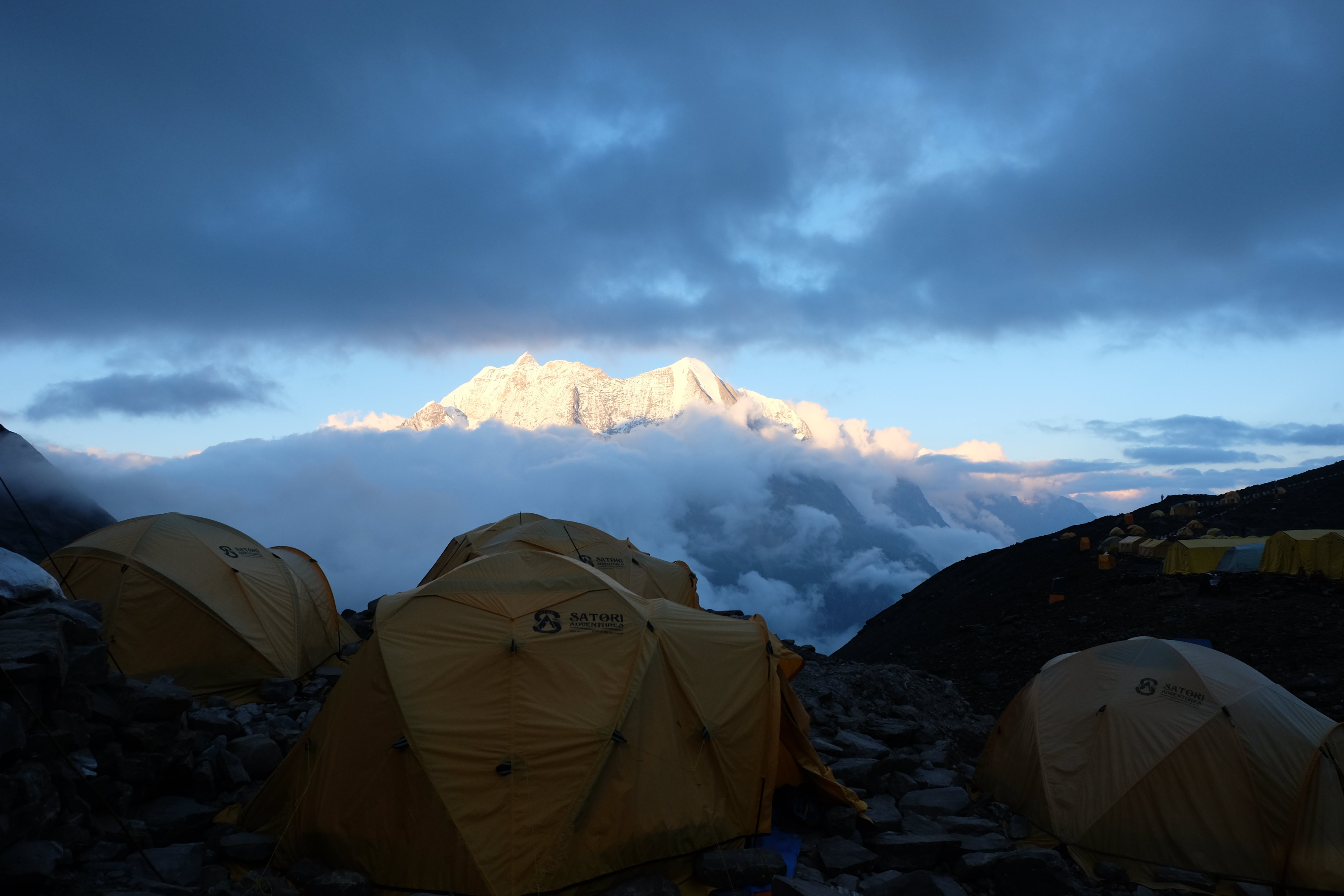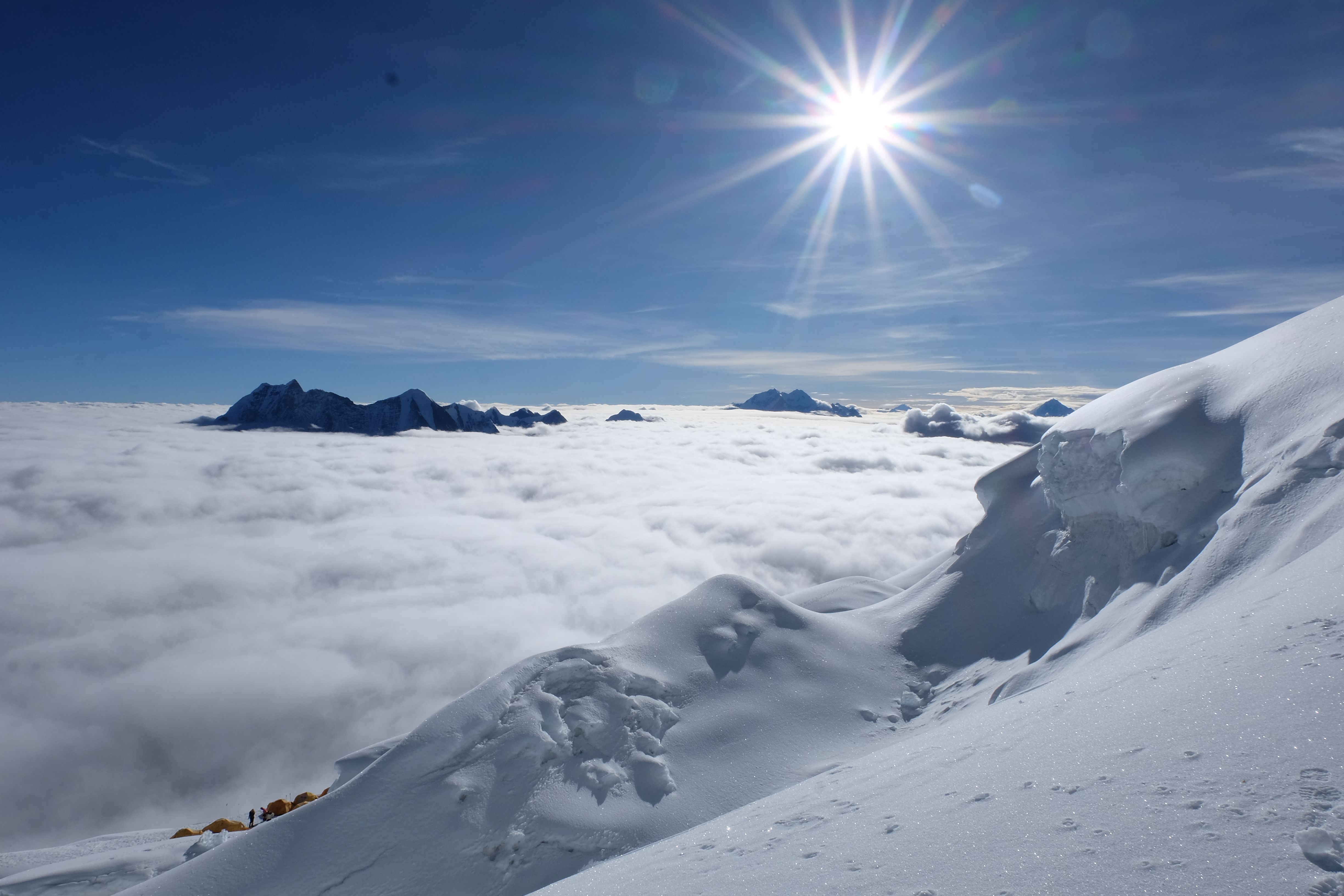 Bewältigt man sämtliche Hindernisse, wartet auf einen die letzte Nacht. Die Erschöpfung, Dunkelheit und Kälte schreien einem eigentlich in beide Ohren, man solle das Zelt nicht verlassen, der Gipfel flüstert lediglich mit einer kaum wahrnehmbaren Klang, er warte dort auf einen, lediglich eine letzte Anstrengung entfernt, nur eine… Schwierig zu hören, dieser Klang während man sich in der eisigen Kälte die Steigeisen anlegt. Man schaltet die Stirnlampe an in der Hoffnung diesen schwachen Klang mit einem Bild ergänzen zu können: ein Anblick des Gipfels. Dies bleibt einem allerdings noch lange verweigert… man muss lediglich diesem leisen Klang der Hoffnung Glauben schenken und einen Fuss nach dem anderen setzen. Komischerweise lässt (im Gegensatz) zu den anderen Tagen die Erschöpfung mit jedem Schritt nach. Je weiter man kommt, desto weniger müde man ist, desto lauter wird der Ruf des Gipfels. Sogar die Sonne wird aus ihrem Tiefschlaf geweckt und geht auf um einem zuzuschauen: schafft er es oder nicht? Und dann kommt plötzlich der schönste Augenblick: nicht der Gipfel selber, der wird vermutlich schnell sein, ein paar Fotos, Stress um den besten Augenblick ohne andere Leute dort oben, usw. Nein, der schönste Augenblick ist 15 Minuten vor dem Gipfel: wenn man diesen tatsächlich erblickt und sicher weiss, man wird es schaffen. Dann überwältigen einen alle Gefühle, die Erinnerungen und Gedanken an die Leute die man vermisst, aber deren Arme man fast hinaufstossen spürt… und dann kommen die Tränen.