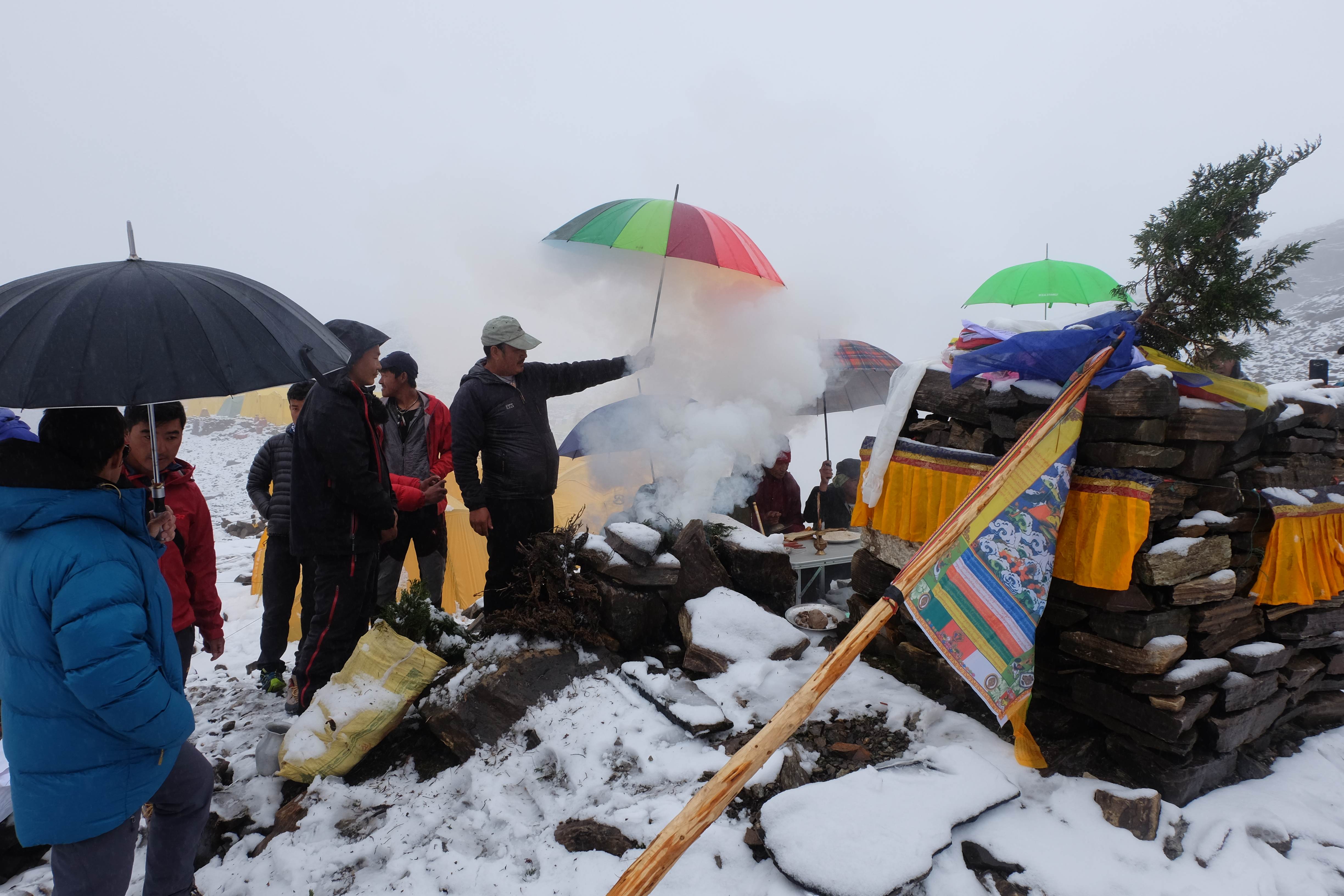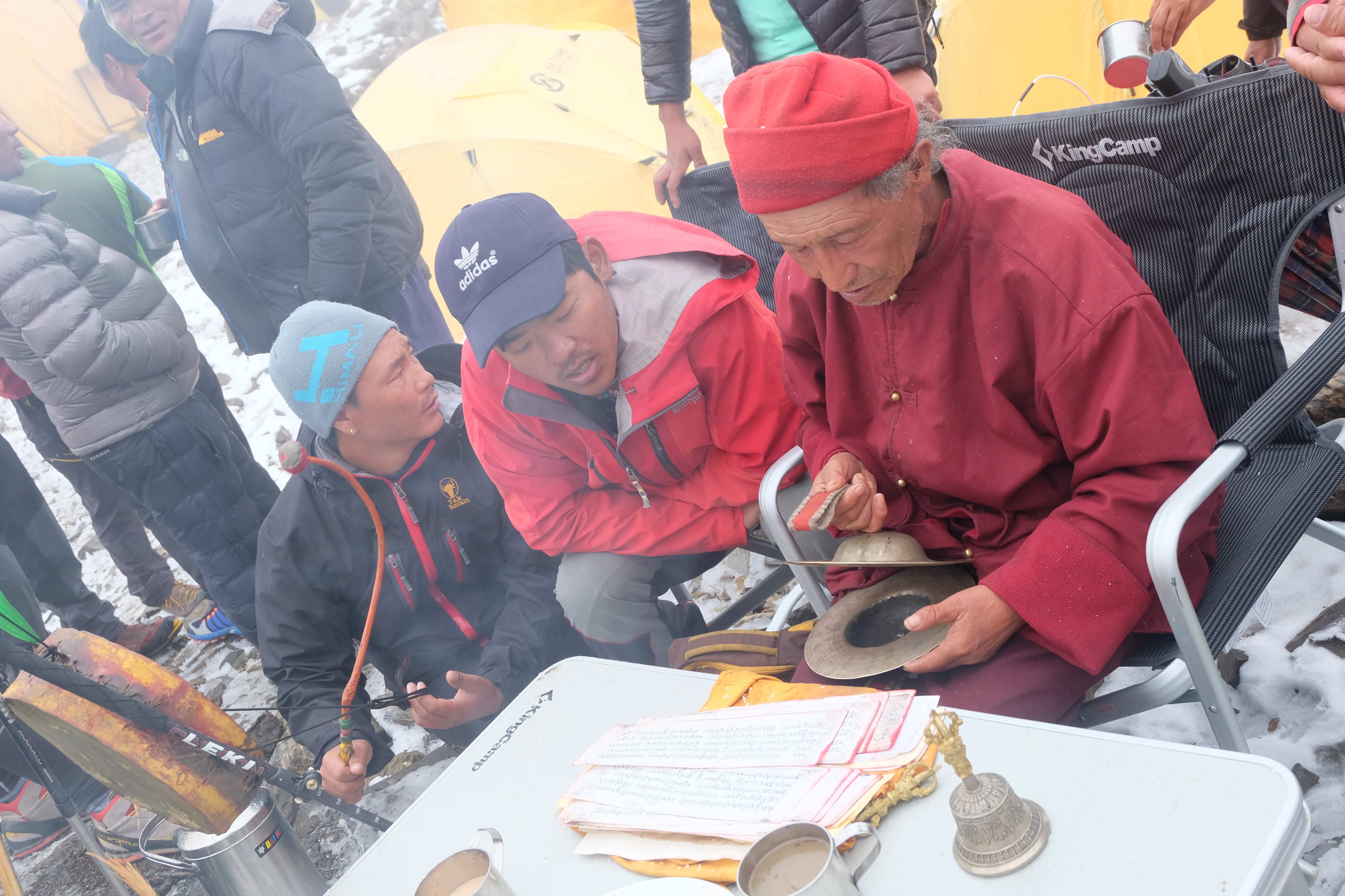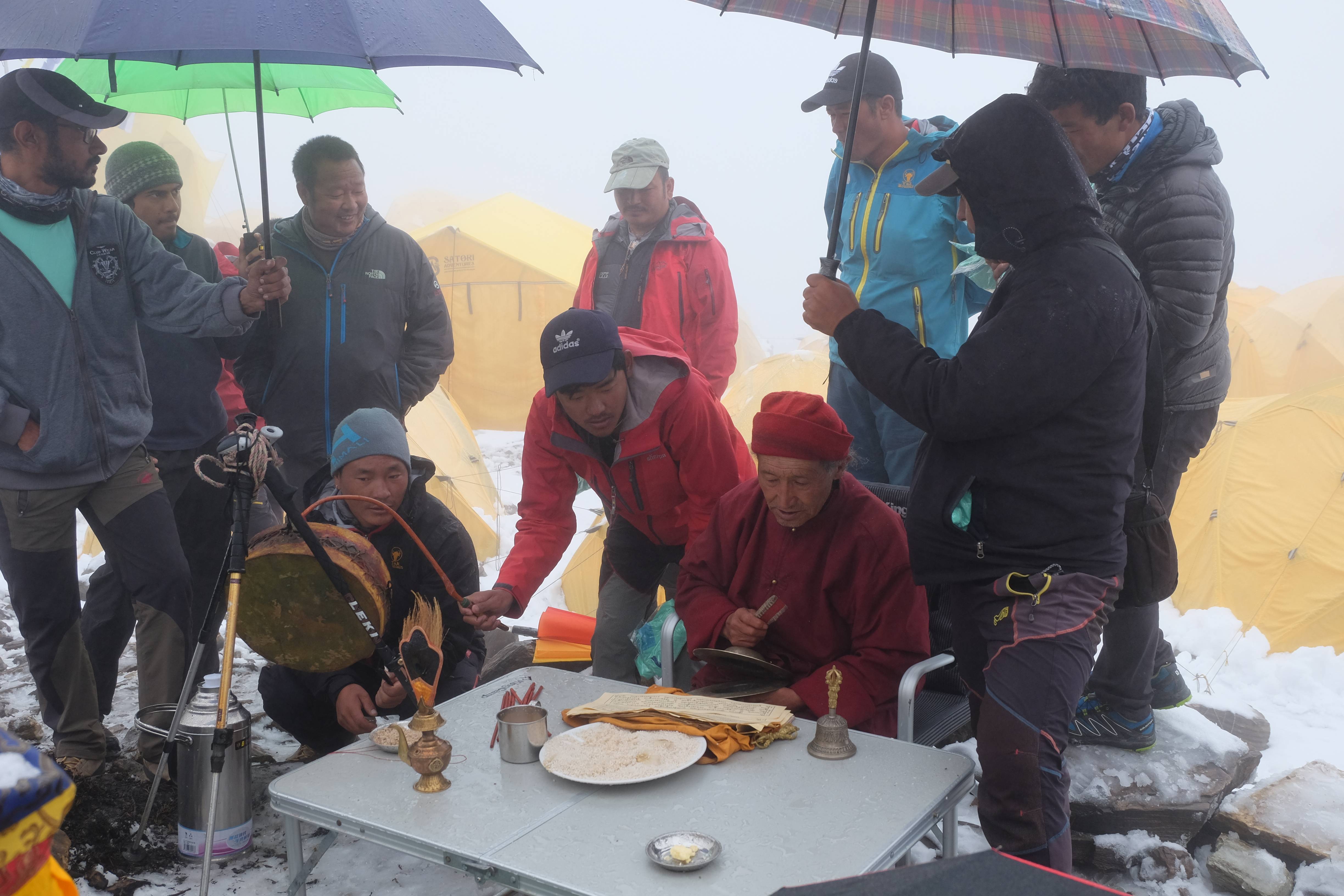 Un lucru preluat intr-un mod superficial de catre alpinistii vestici insa o conditie sine qua non pentru serpasi a fost ceremonia de Pujah. Este vorba despre un ritual budist inaintea escaladarii unui asemenea munte, ritual pentru noi ce-i drept un pic ciudat insa care nu te lasa rece. Prin acest ritual este invocat spiritul muntelui care se va escalada si este ceruta ingaduinta acestuia. De asemenea este ceruta permisiunea de la zeul muntelui (fiecare optmiar are zeul sau) de a sta pe varf. In ziua respectiva nu se escaladeaza nimic ci se sarbatoreste si se bea. Consumul de alcool tine de ziua respectiva, este parte din sarbatoare, este insa privit sceptic de catre alpinistii vestici avand in vedere ca nu se incadreaza deloc bine in regimul unui antrenament foarte strict al unui atlet inaintea unei asemenea provocari. Faptul ca din intreaga echipa de 11 oameni care am impartit facilitatile in tabara de baza eu am fost singura care a baut o bere si traditionala “sherpa soup” cu serpasii spune deja multe.