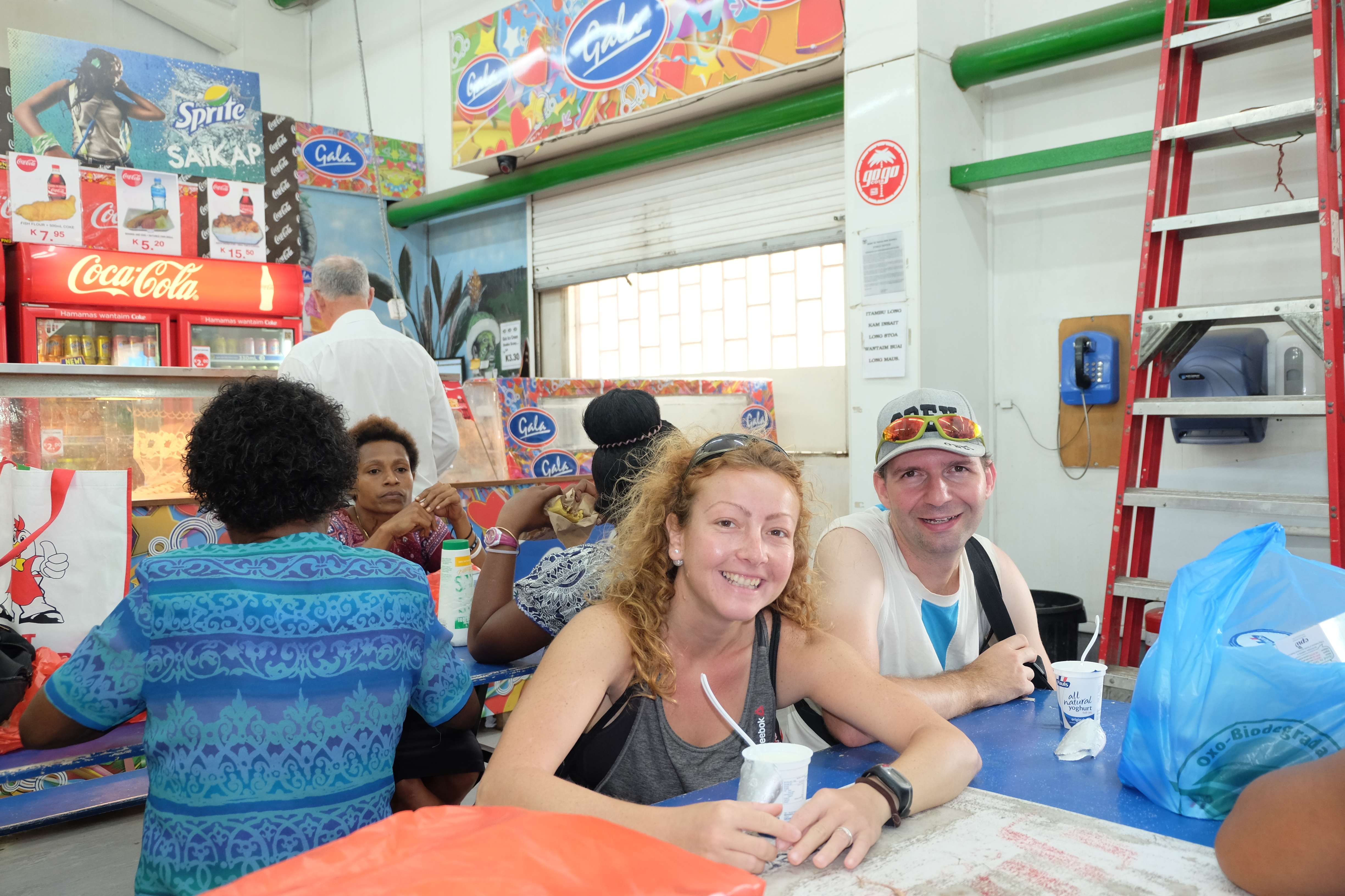 Nicht nur auf dem Meeresboden liessen wir viel Geld liegen, sondern auch in der einen Supermarkt-Kasse. Wir sehnten uns nämlich nach Joghurt, was hier in Papua Neu-Guinea eher so ist, als würde eine Kuh von Flügeln träumen oder wir von einem Gastauftritt von Silvester Stallone in unserer malaiischen Rambo-Verfilmung. In der modernen Welt sind ab und zu auch fliegende Kühe möglich – apropos Kühe: Rafis Kuh-Verhaltensmuster Forschung stagniert momentan, da sozial verstörte Exemplare, welche wie in Indien asozial und ohne ihre Kuhfamilienmitgliedern durch die Strassen schlendern hier eine Mangelerscheinung sind! Zurück zu den fliegenden Tieren: wir fanden tatsächlich unser Joghurt, zahlten stolze 6 CHF dafür und realisierten mit jedem Löffel, dass wir gerade einen CHF runterschluckten. 🙂
