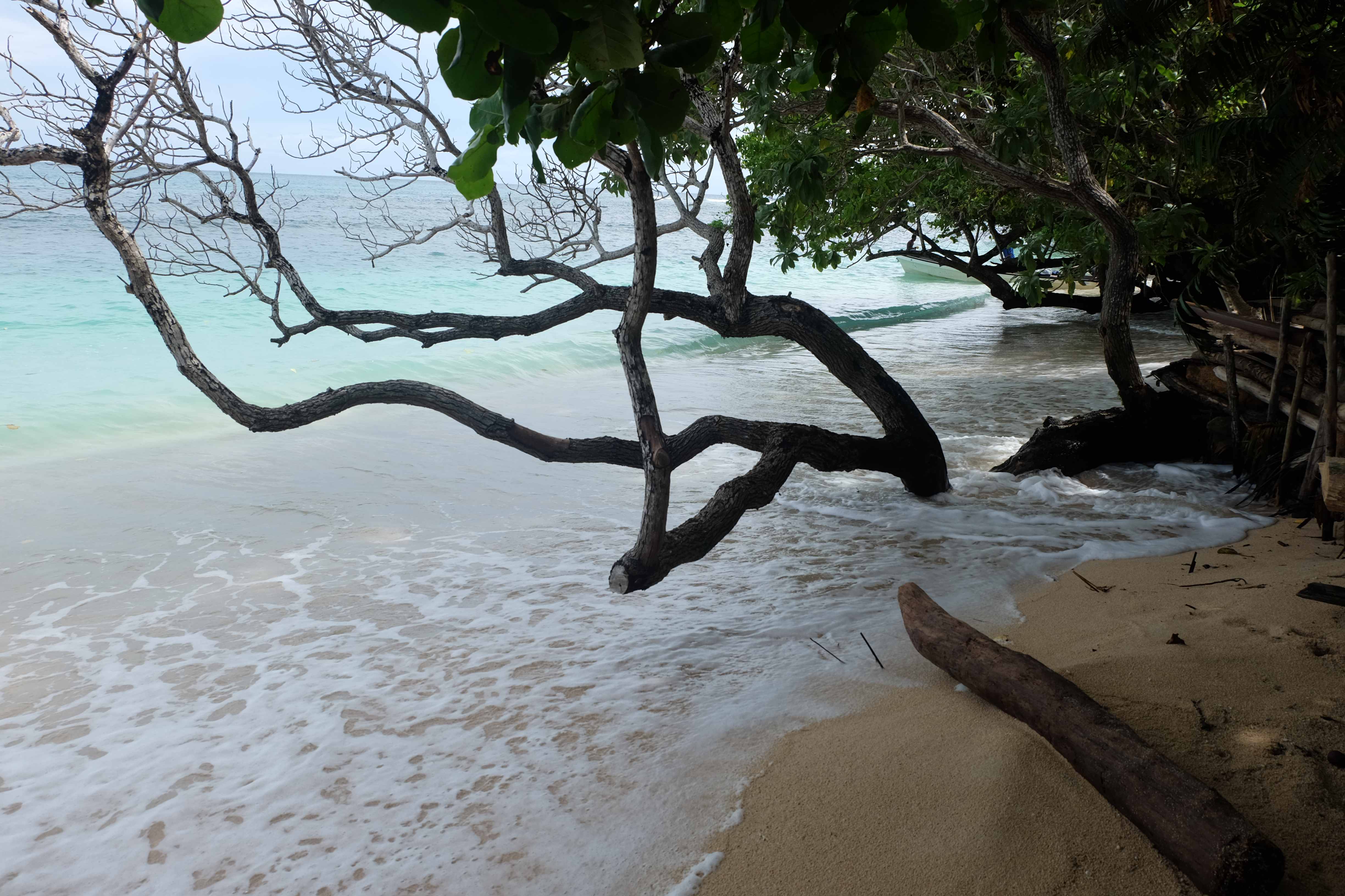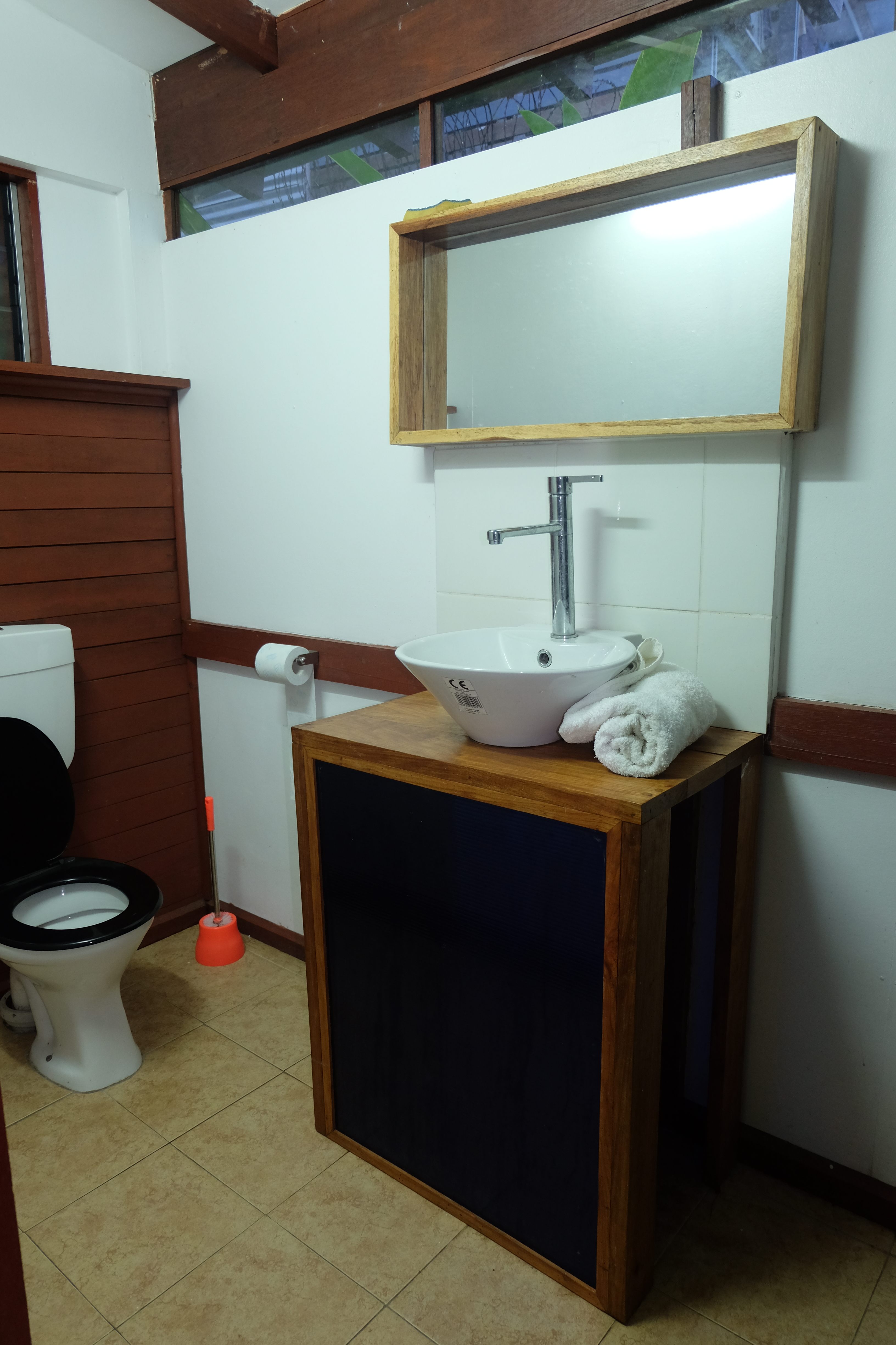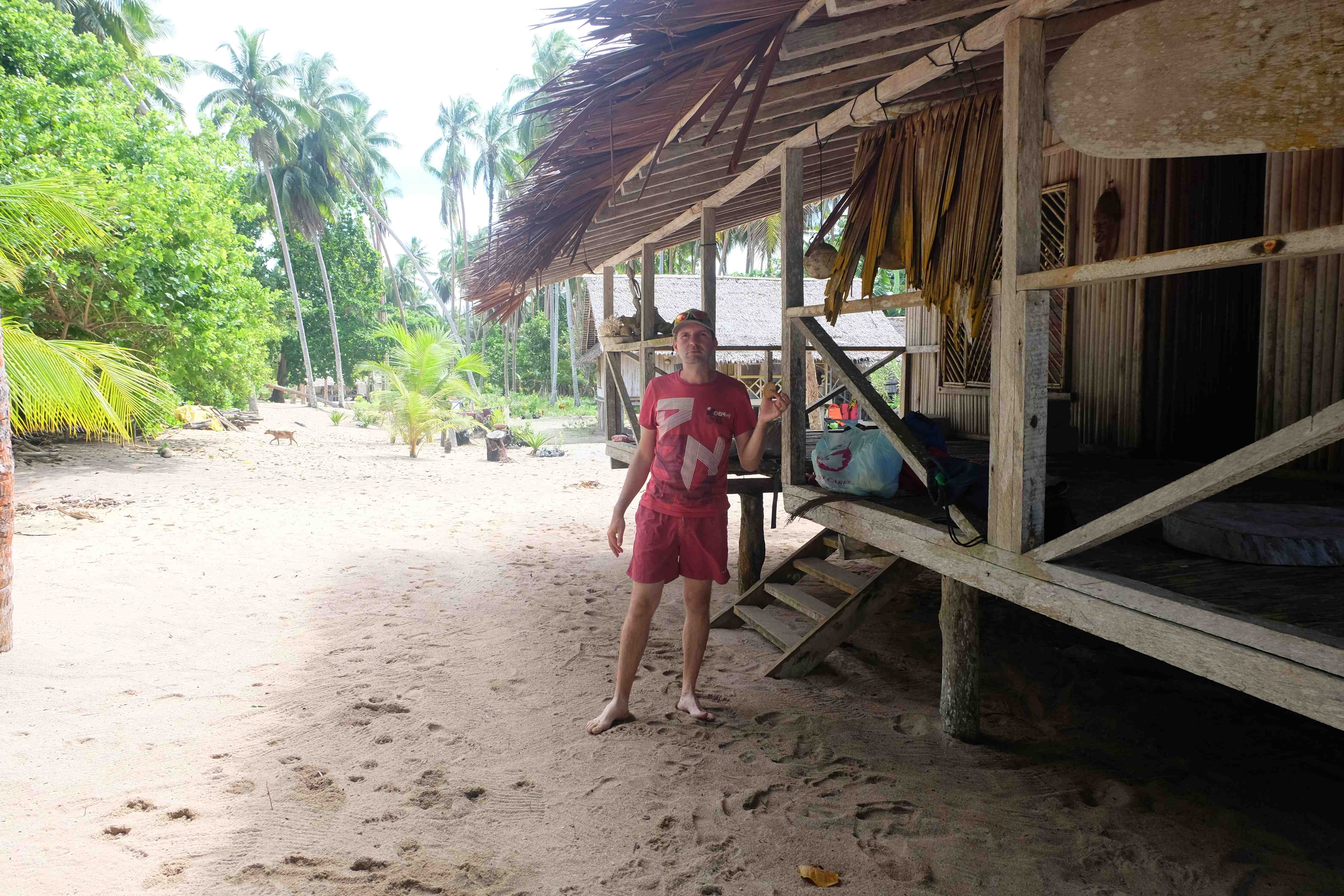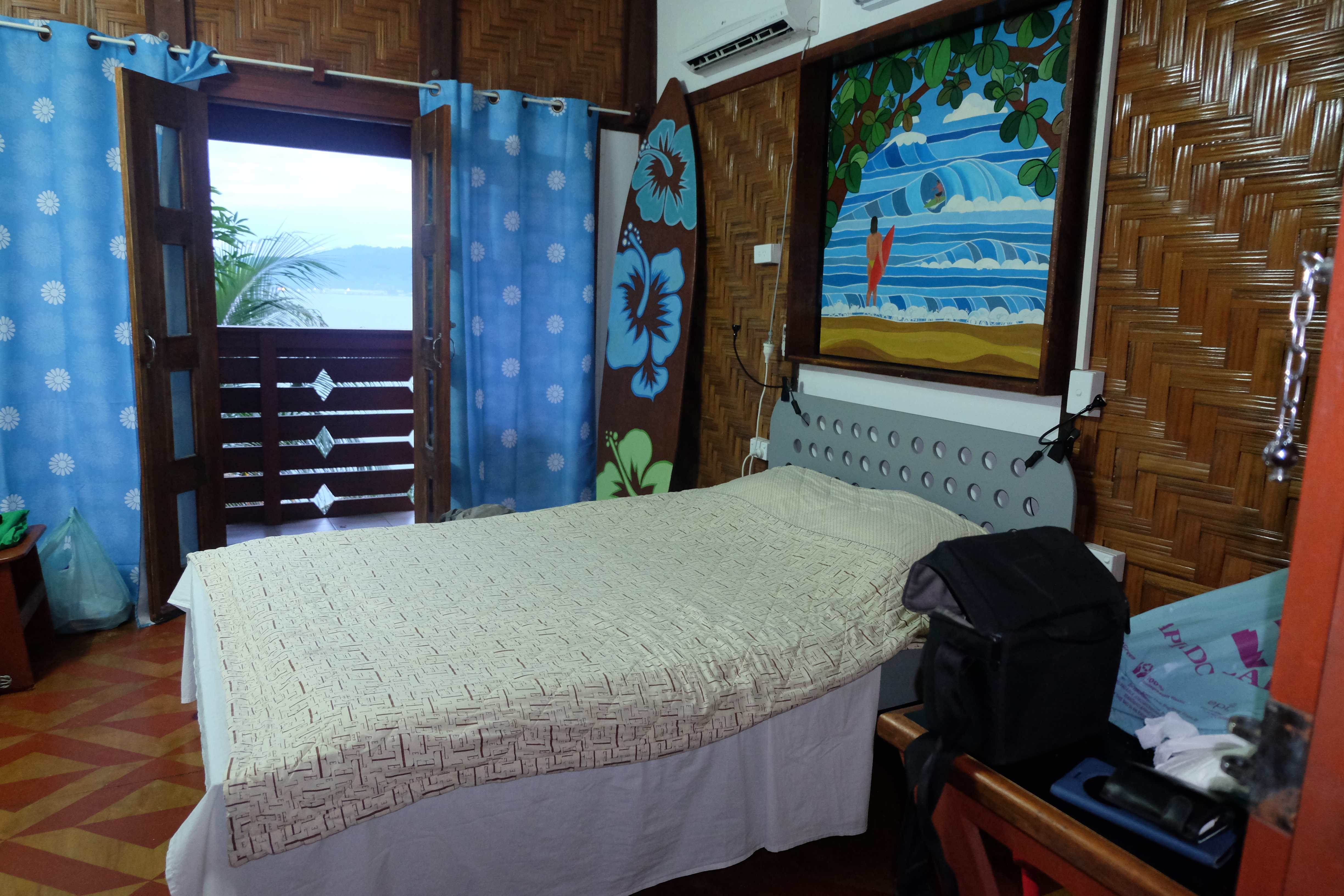 Als wir 3 Stunden später endlich unseren Tauchtypen erreichten konnten und uns dieser mitteilte, dass er aufgrund schlechten Wetters immer noch auf der Nachbarinsel fest stecke und erst am Tag darauf uns abholen kommen könne, wussten wir sofort, dass unser neuer Freund, der Cosmo – wie der Kosmos, um seiner Vorstellungsart treu zu bleiben – Retter in der Not für uns spielen musste. Wo würden wir denn nun übernachten? Also folgten wir ihm, der behauptete dort oben – im Gebüsch – befände sich ein Gasthaus, eines, das einem sich dort vor Jahren niedergelassenen Deutschen und seiner einheimischen Frau gehöre, eines das den Touristenblicken fern blieb und somit ein Geheimtipp sei. Ob das nun stimmt? – fragten wir uns während wir der 1,5 m kleinen aber ein 0,5 m schwertähnliches Buschmesser tragenden Gestalt namens Cosmo wie der Kosmos ins Gestrüpp folgten. Und siehe da, nachdem wir sein Reich passierten kamen wir am besagten Ort an: ein verstecktes Juwel, ein Geheimtipp tatsächlich und somit eine unglaubliche Überraschung zu einem mehr als normalen Preis. Wir erhielten ein Zimmer mit einer wunderschönen Aussicht aufs Meer, genossen moderne Privilegien wie Klimaanlage und warmes Wasser und vor allem lernten eine weitere wichtige Lebenslektion: nichts ist was es scheint!