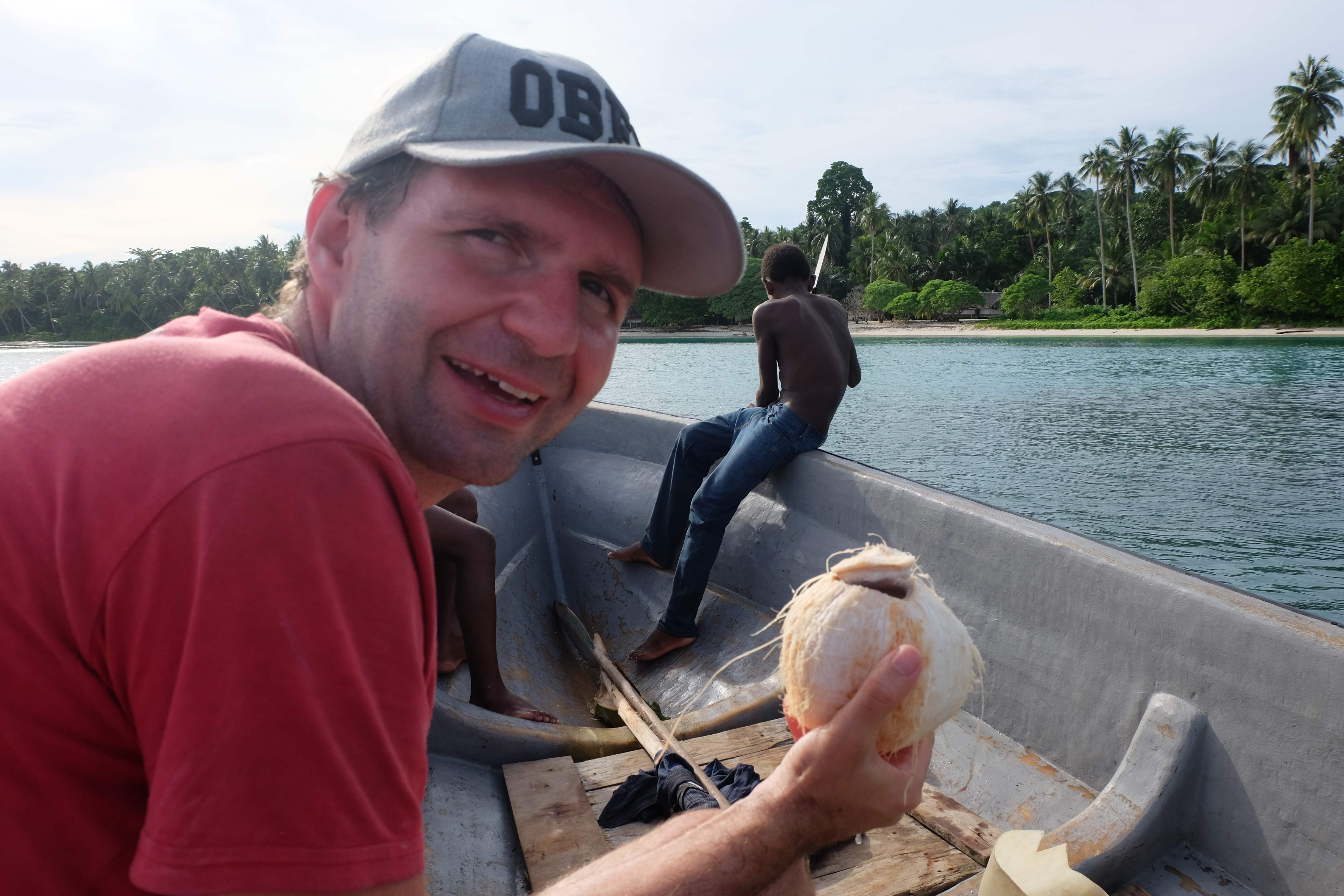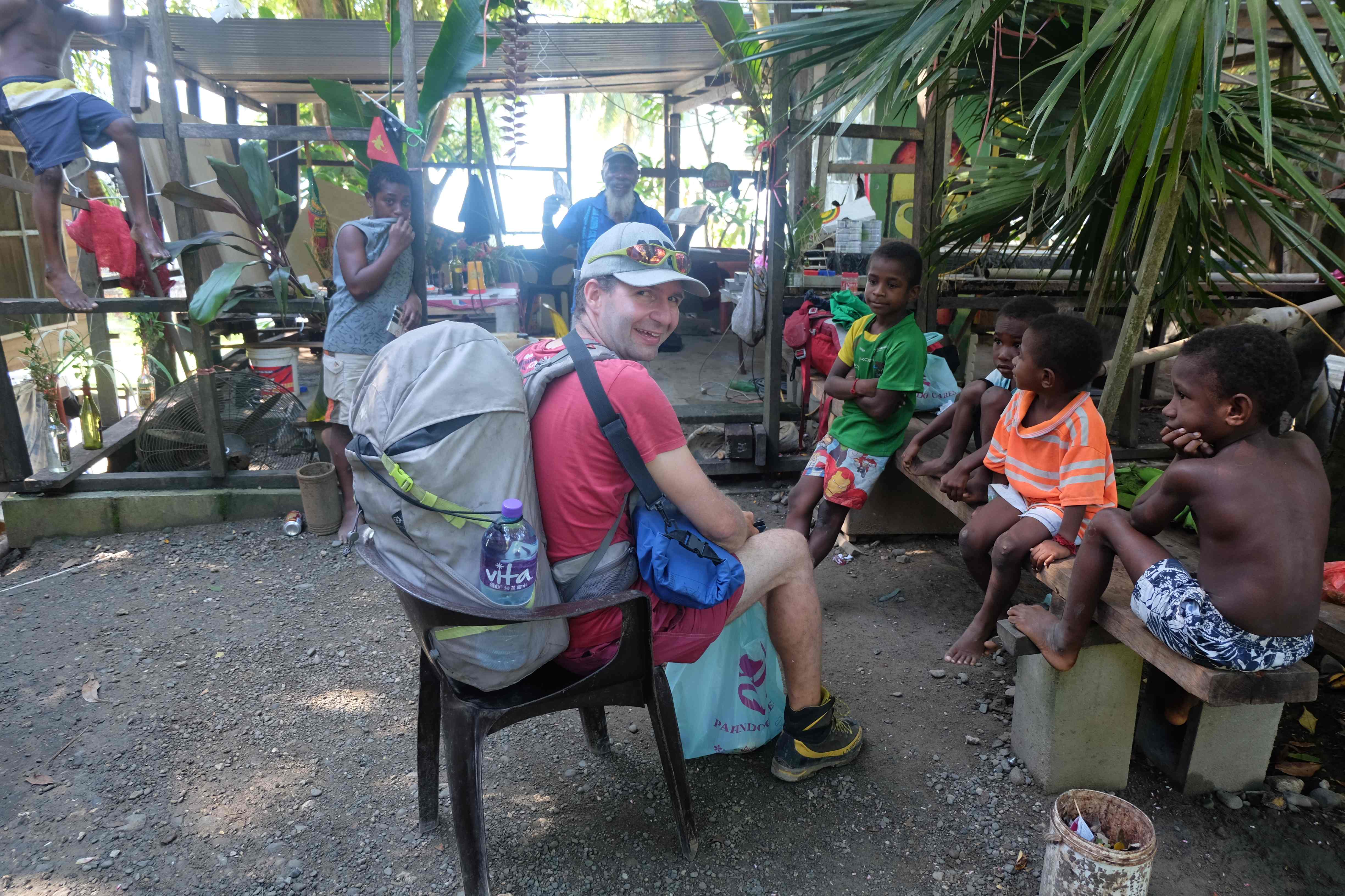 Zwei Weisserlein, die mit ihrem Hab und Gut am Bootstreffpunkt, neben zwei Strassenverkäufer-Ständen und inmitten der Einheimischen warten. Worauf denn? – fragten sich die Einheimischen und fingen an mit uns zu sprechen um sicherzustellen, dass wir in Ordnung seien und keiner Hilfe bedürften. Alle kannten den Typen auf den wir warteten: der George von der Mushu Island mit seinem Boot und seiner Tauchausrüstung. Wo steckte er bloss? Die vereinabrte Uhrzeit war schon längst vorbei, telefonisch erreichbar war er auch nicht. Er ist hoffentlich nicht mit meinem Geld abgehauen und gedenkt gar nicht mehr aufzutauchen, so ein fieser Mensch kann er doch nicht sein, oder?!