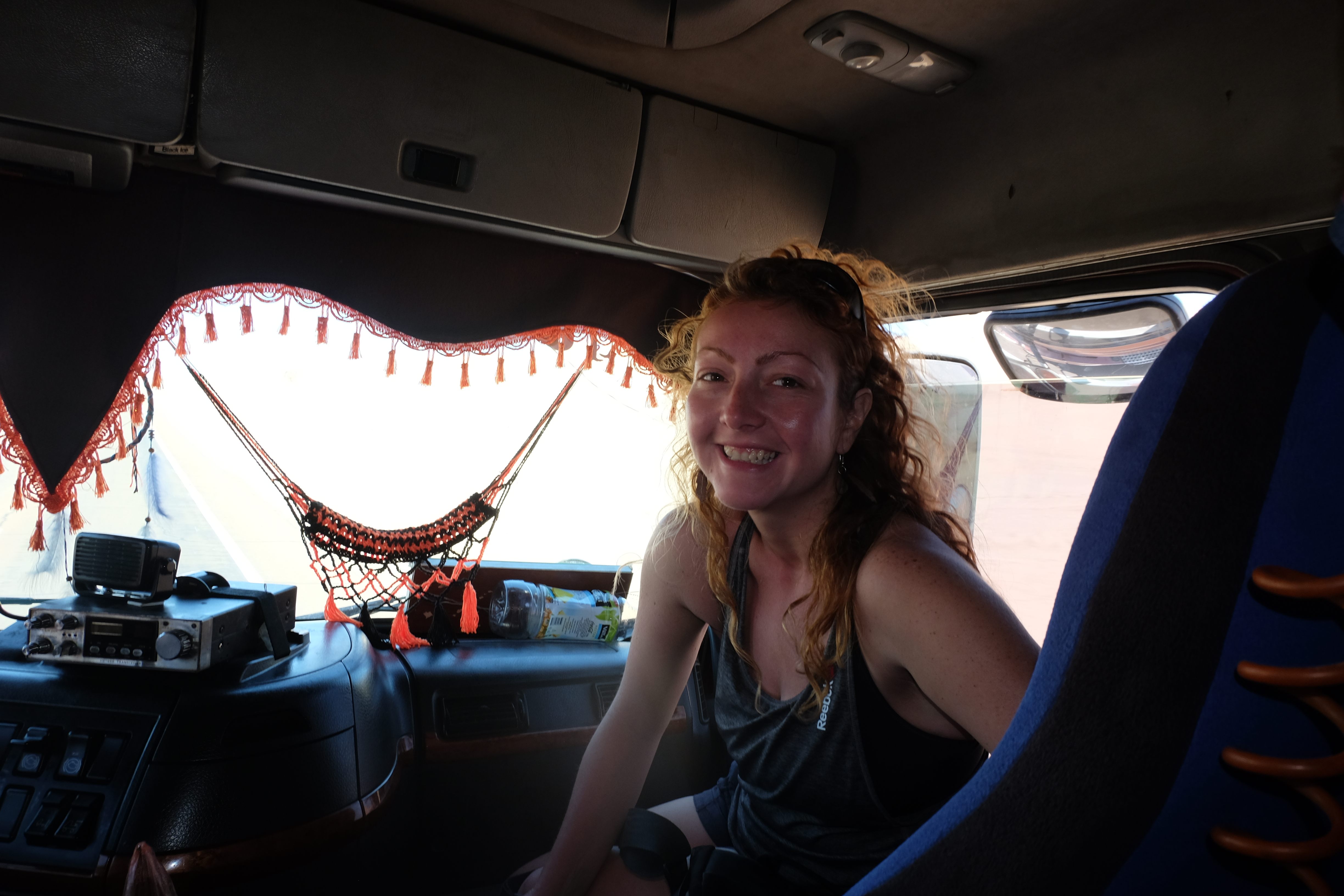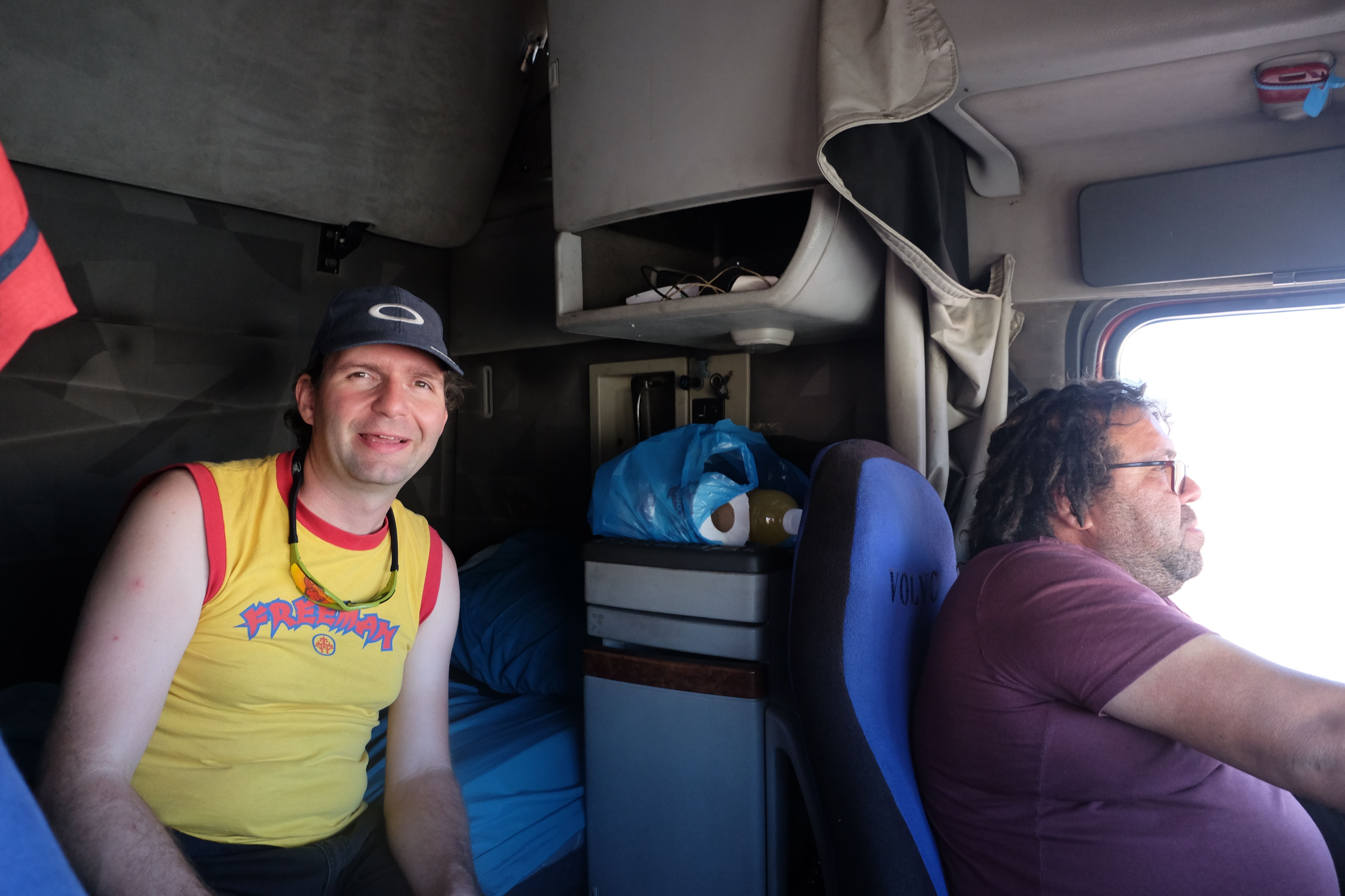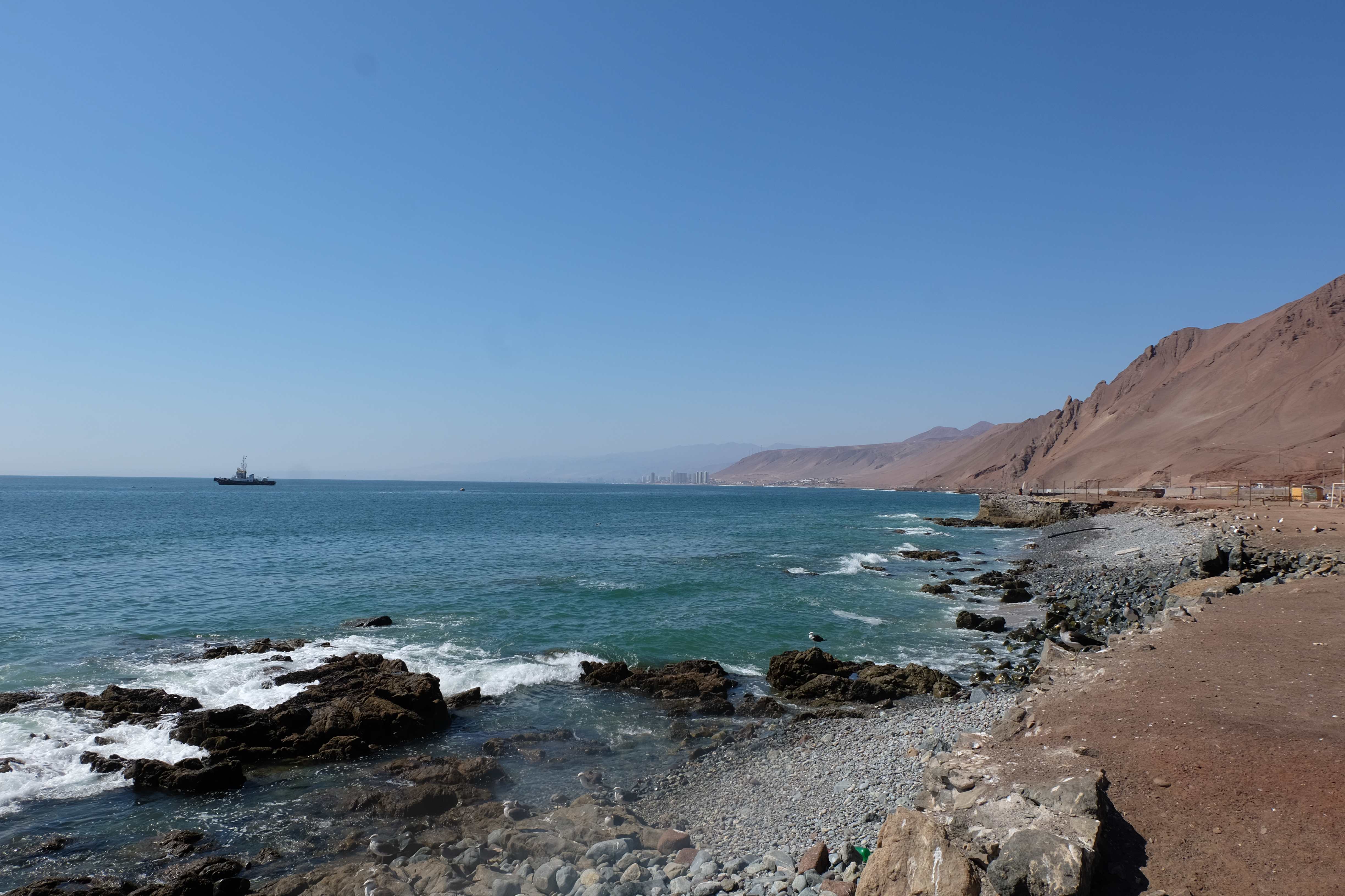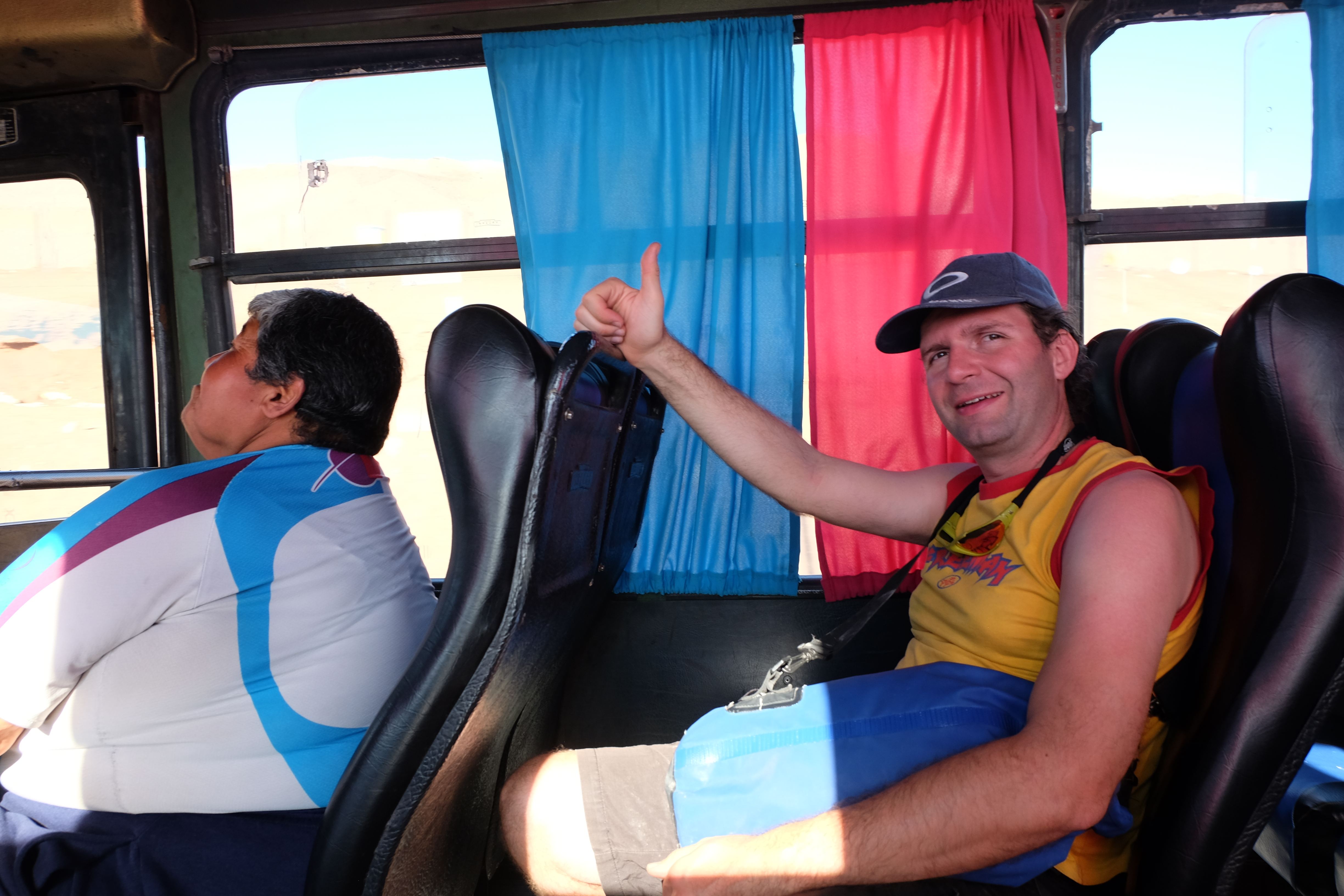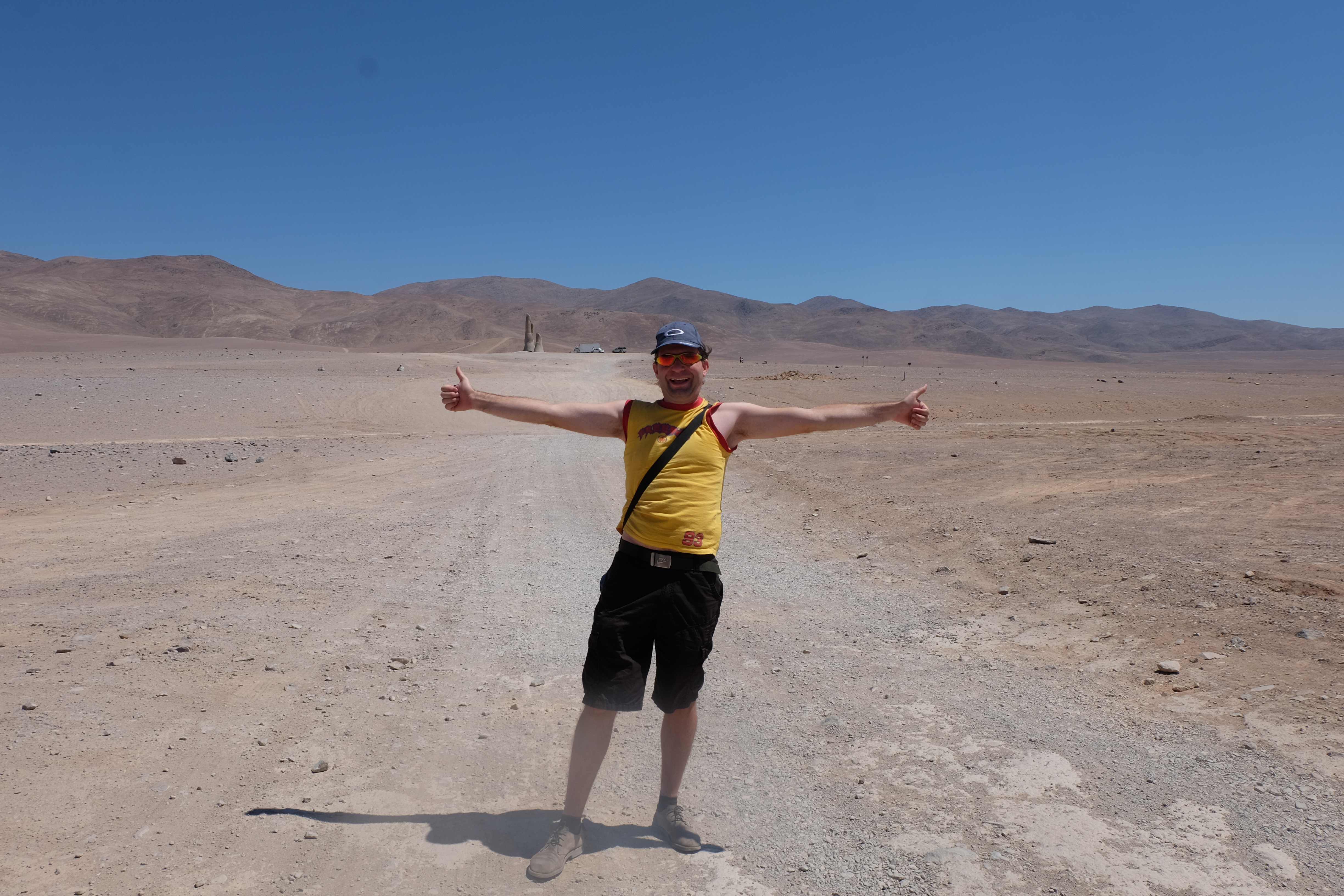 In Antofagasta hatten wir lediglich einen vollen Tag bzw. 2 Nächte geplant. Also mussten wir am darauffolgenden Tag alles sehen, was wir sehen wollten. Na ja, viel war es eigentlich nicht: lediglich das „La mano del desierto“… eine mitten in der Wüste aufgestellte Skulptur einer riesigen Hand, welche uns aufhalten sollte, unsere Umwelt so schlecht zu behandeln, wie wir es heutzutage tun um zu vermeiden, dass eines Tages die ganze Welt zu einer solchen Wüste wird. Klingt alles prima, oder? Nur… wie kommt man dorthin? Es gibt weder ö. V. noch irgendwelche Touristenbusse dorthin… Hmmmm, wie denn sonst? Klar doch: Daumen im Wind – Autostopp solang das Zeugs hält! 🙂 Da die Skulptur direkt an der Route 5 liegt, nämlich die einzige Strasse, welche das ganze Land durchquert, war es nicht einmal so schwierig eine Fahrt zu finden. Oder mehrere… 🙂 Dazu kommt, dass Antofagasta mitten in der grössten Minenregion der Welt liegt, also dürft ihr 3 Mal raten was für Fahrzeuge dort am häufigsten verkehren… nein, keine Luxus BMW-s! Nein, auch keine selbstfahrende Teslas! Genau… riesige, staubige, hoooooohe LKWs… und mit diesen Monstern waren wir den ganzen Vormittag unterwegs! Während wir bei der Hinfahrt zur Skulptur einige Warteminuten in Kauf nehmen mussten, gelang es unserem Däumchen bei der Rückfahrt so schnell ein Monster-Fahrzeug zu stoppen, dass dieses sogar noch warten musste, bis wir es erreichten. 🙂 Mit Privat-Chauffeur unterwegs zu sein während dieser eigentlich von einer Lebensmittelkette bezahlt wird, da er für sie frisches Gemüse liefert, ist – wage ich mal zu behaupten – auch nicht schlecht. 🙂 Erstes Ziel des Tages also geschafft – „La mano del desierto“ gratis gesehen! 🙂