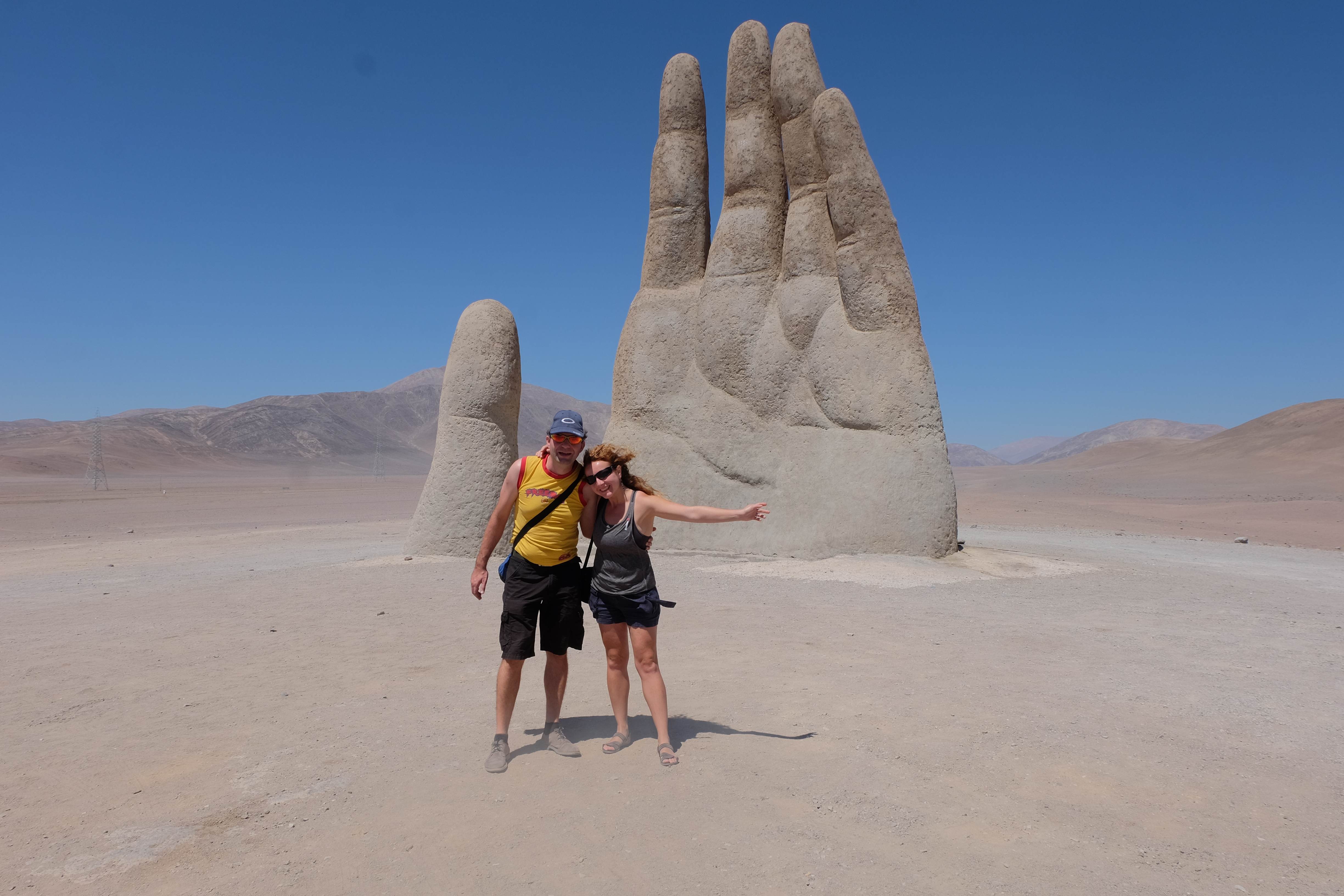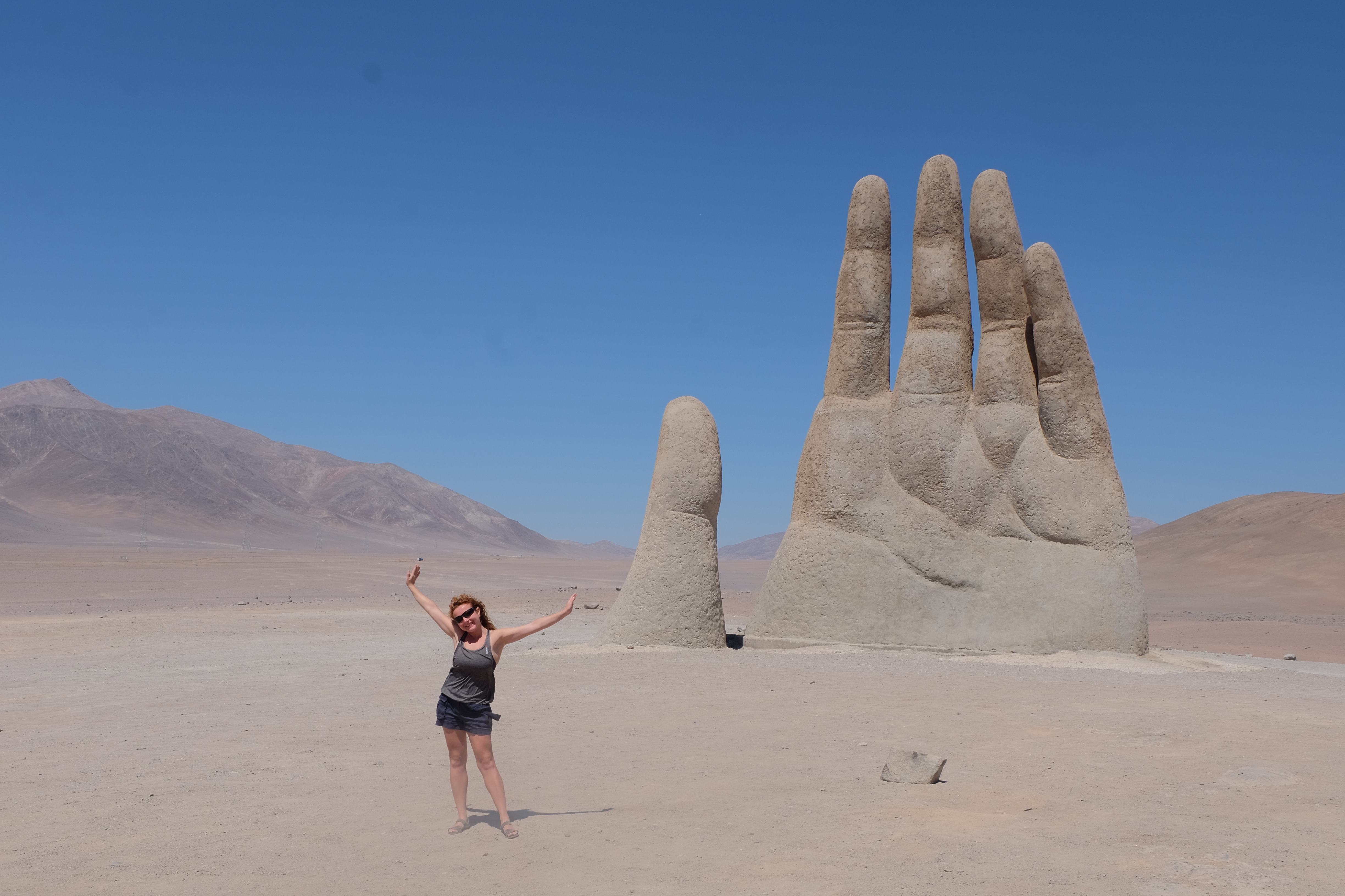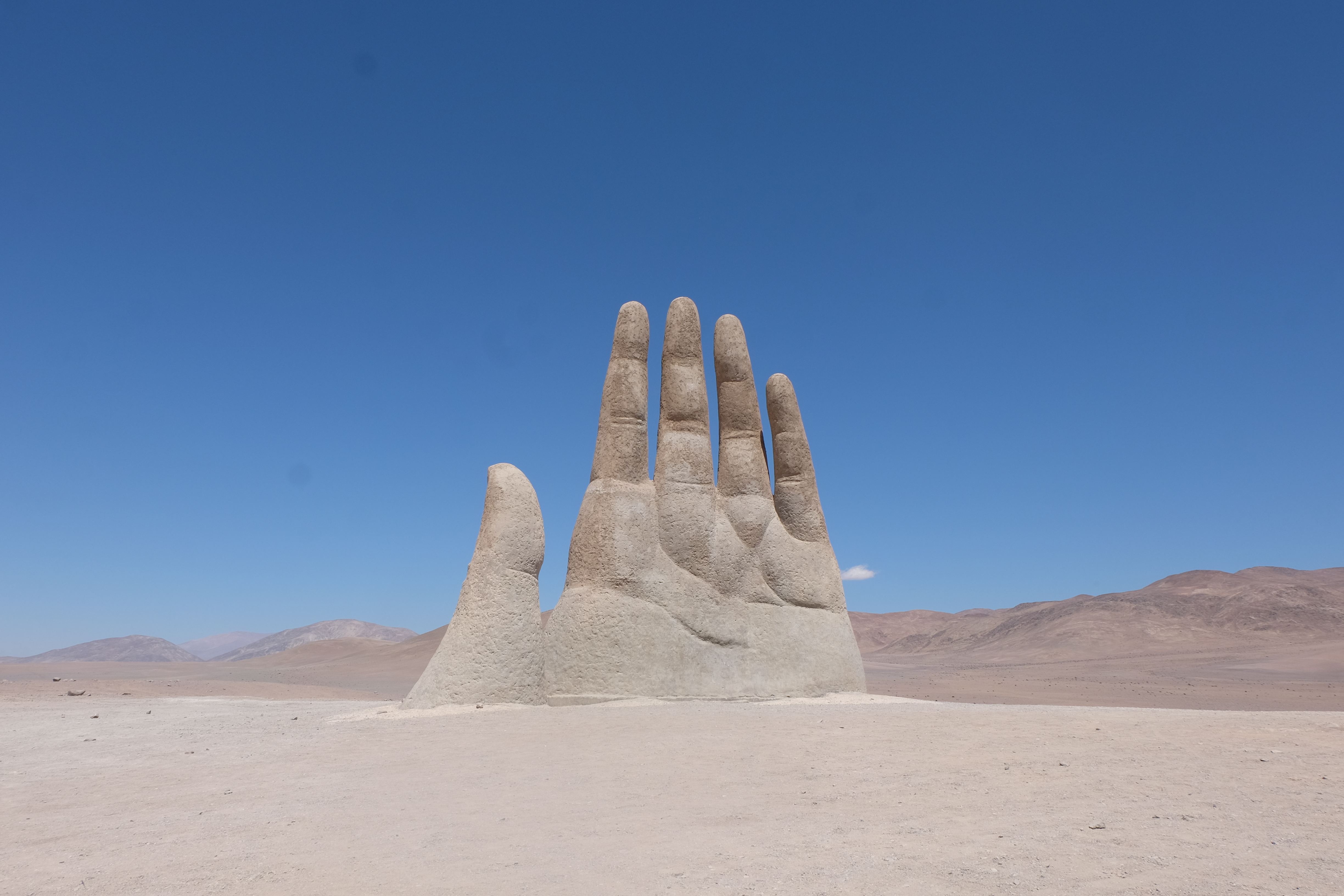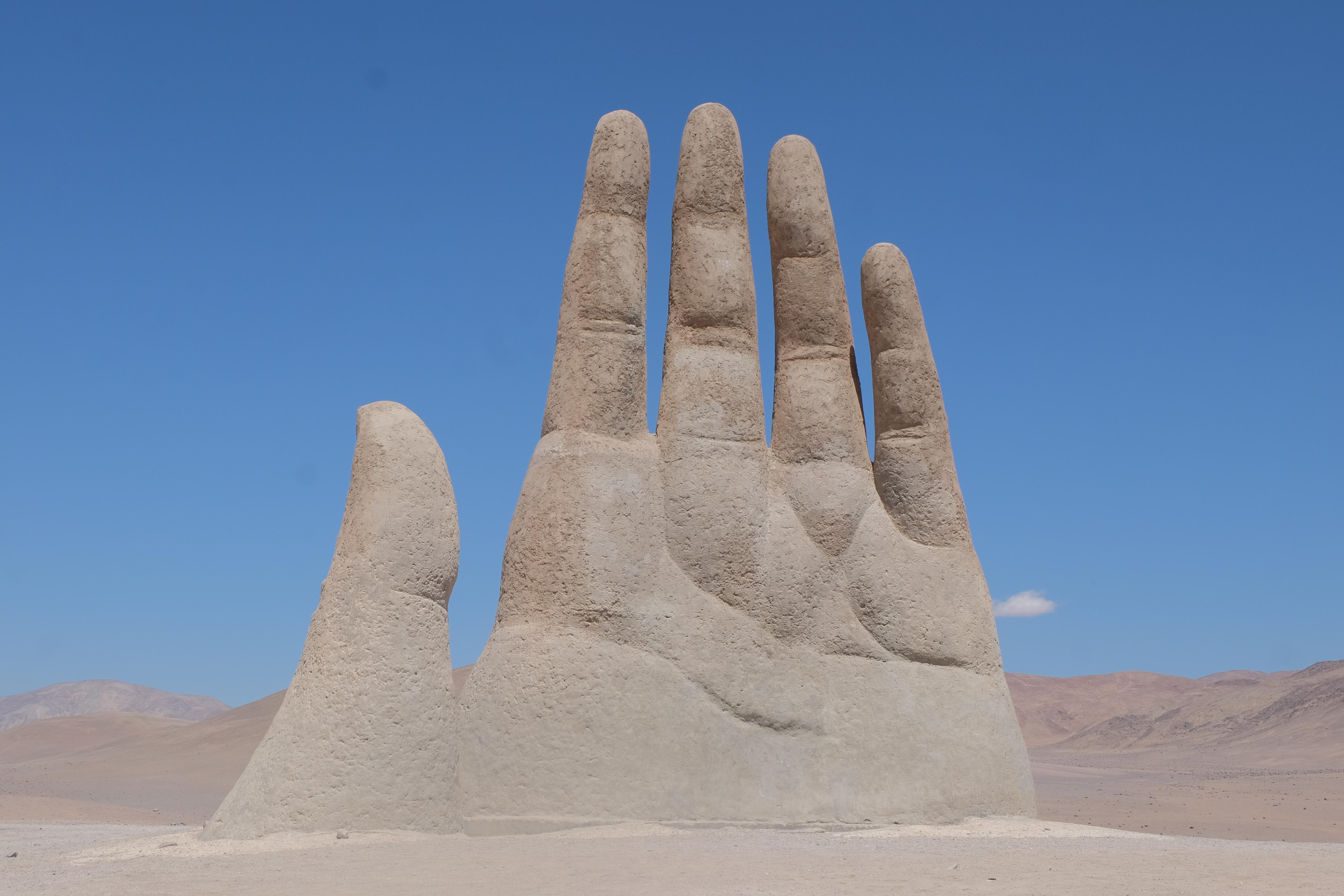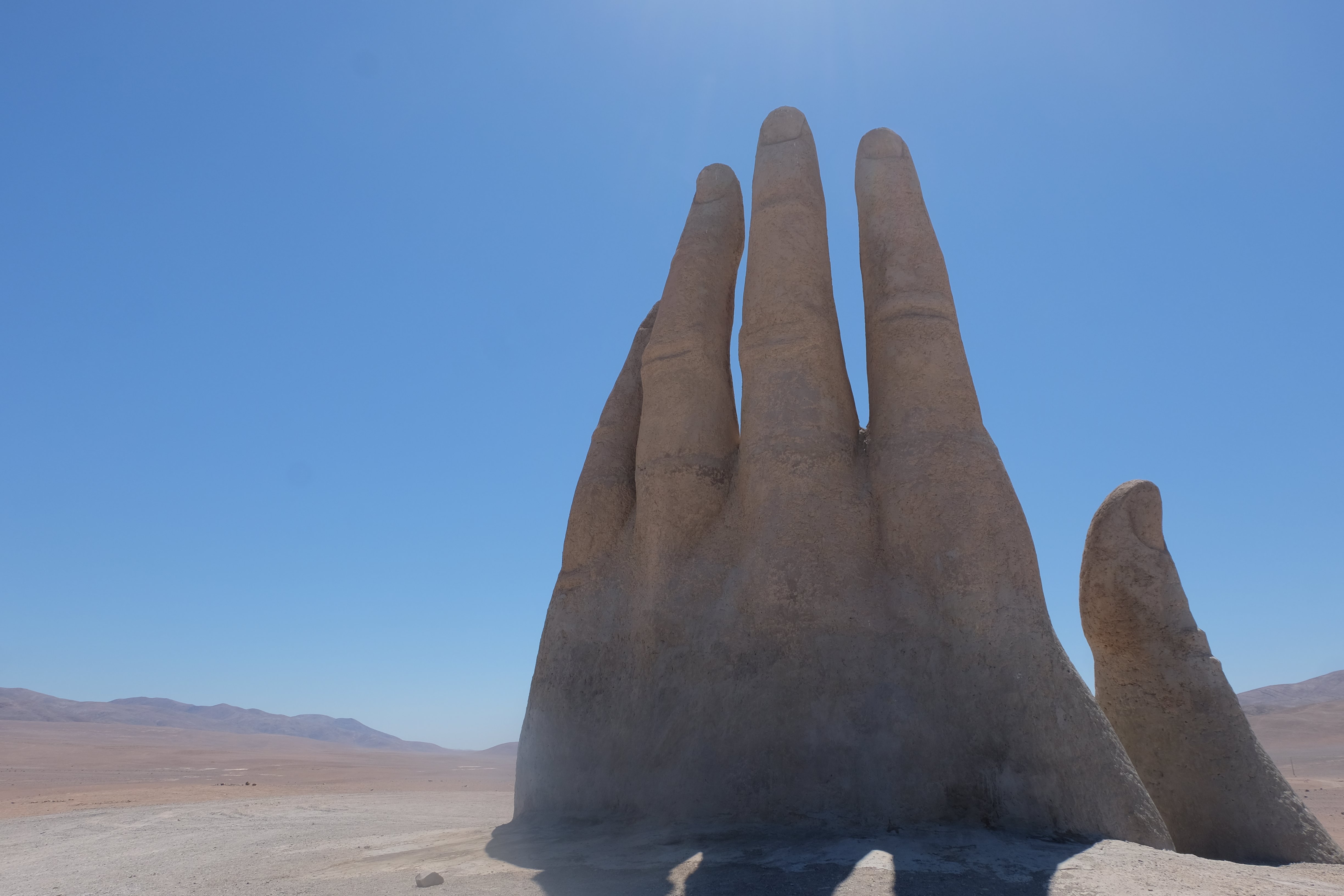 In Antofagasta planuiseram de fapt doar o zi plina, respectiv 2 nopti. In concluzie, ziua urmatoare a trebuit sa vedem tot ceea ce vroiam sa vedem. Ce-i drept, nu era mult: doar „La mano del desierto „ – o sculptura uriasa in forma unei maini in mijlocul desertului. Simbolul acesteia este de a ne opri, de a ne indemna a nu mai maltrata mediul ambient si natura in felul in care o facem pentru ca altfel intreaga planeta ar putea deveni un desert. Suna bine, nu? Ei… dar cum ajungem acolo? Nu exista nici transport public, nici autobuze turistice… hmmm, pai cum credeti? Bineinteles ca s-a implementat metoda „degetel in vant.“ 🙂 Avand in vedere ca sculptura se afla chiar de-a lungul rutei 5, singura strada care traverseaza intregul Chile, asa numita coloana vertebrala a tarii, nici nu a fost asa de dificil sa gasim o masina care sa ne duca incolo. Una sau mai multe, ma rog… In afara de asta, Antofagasta se afla in cea mai mare zona miniera din lume, in consecinta va lasam sa ghiciti cam ce autovehicule circula pe acolo… nu, nu sunt BMW-uri de lux! Nu, nici Tesla-uri cu autopilot! Exact… camioane si tiruri murdare, pline de praf si foooooooarte inalte… si cu acesti monstri ne-am preumblat noi intreaga inainte de masa! In timp ce la dus a trebuit sa asteptam cateva minute, la intors degetelul nostru a fost atat de eficient in a opri un asemenea monstru sacru, incat a si trebui sa fugim pentru a il ajunge din urma. 🙂 Nu e deloc rau sa circuli cu sofer privat prin America de Sud in timp ce un lant de magazine il plateste pentru ca acesta le livreaza legumele. 🙂 Prima destinatie a zilei o reusiseram – vazuseram „La mano del desierto” gratis. 🙂
