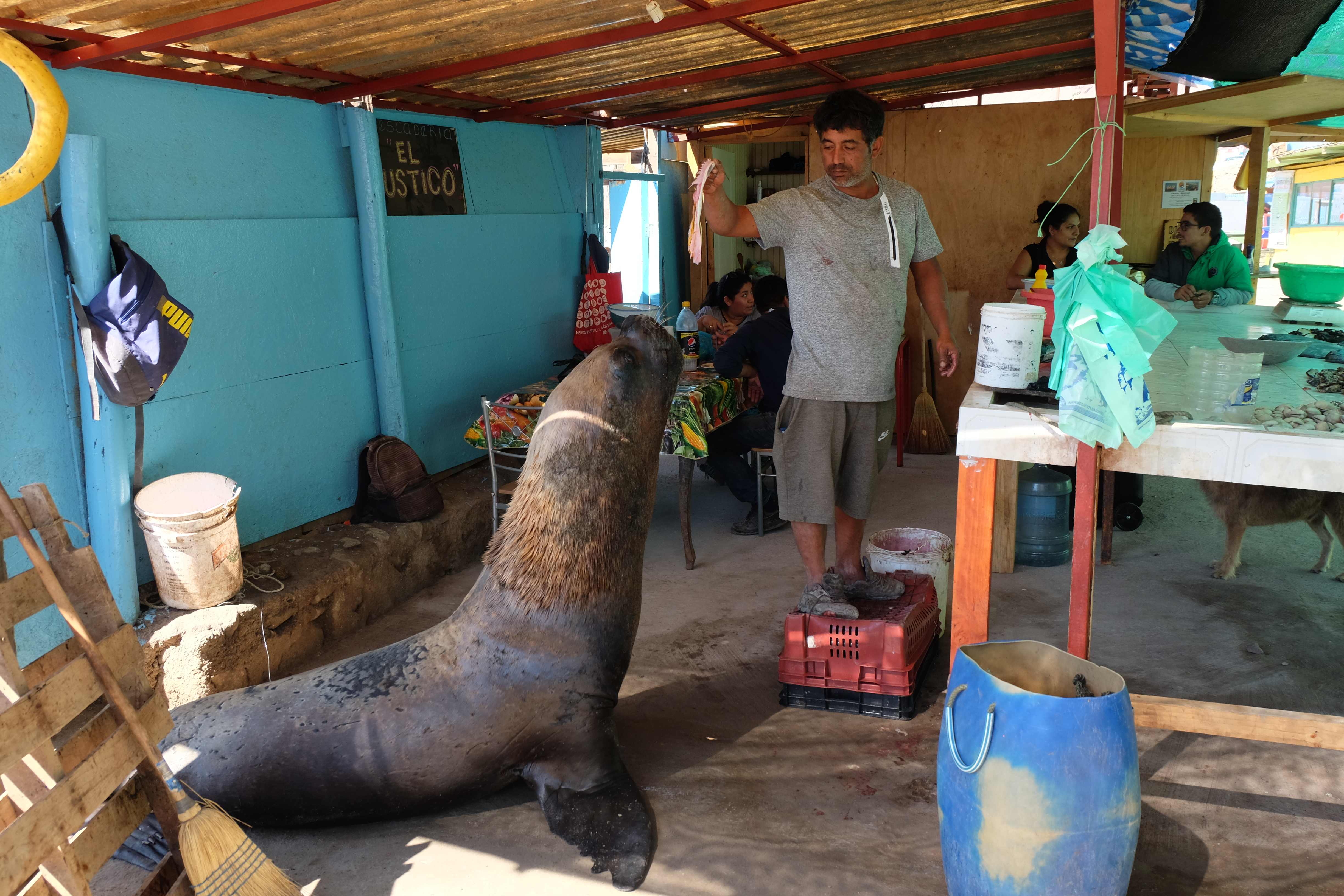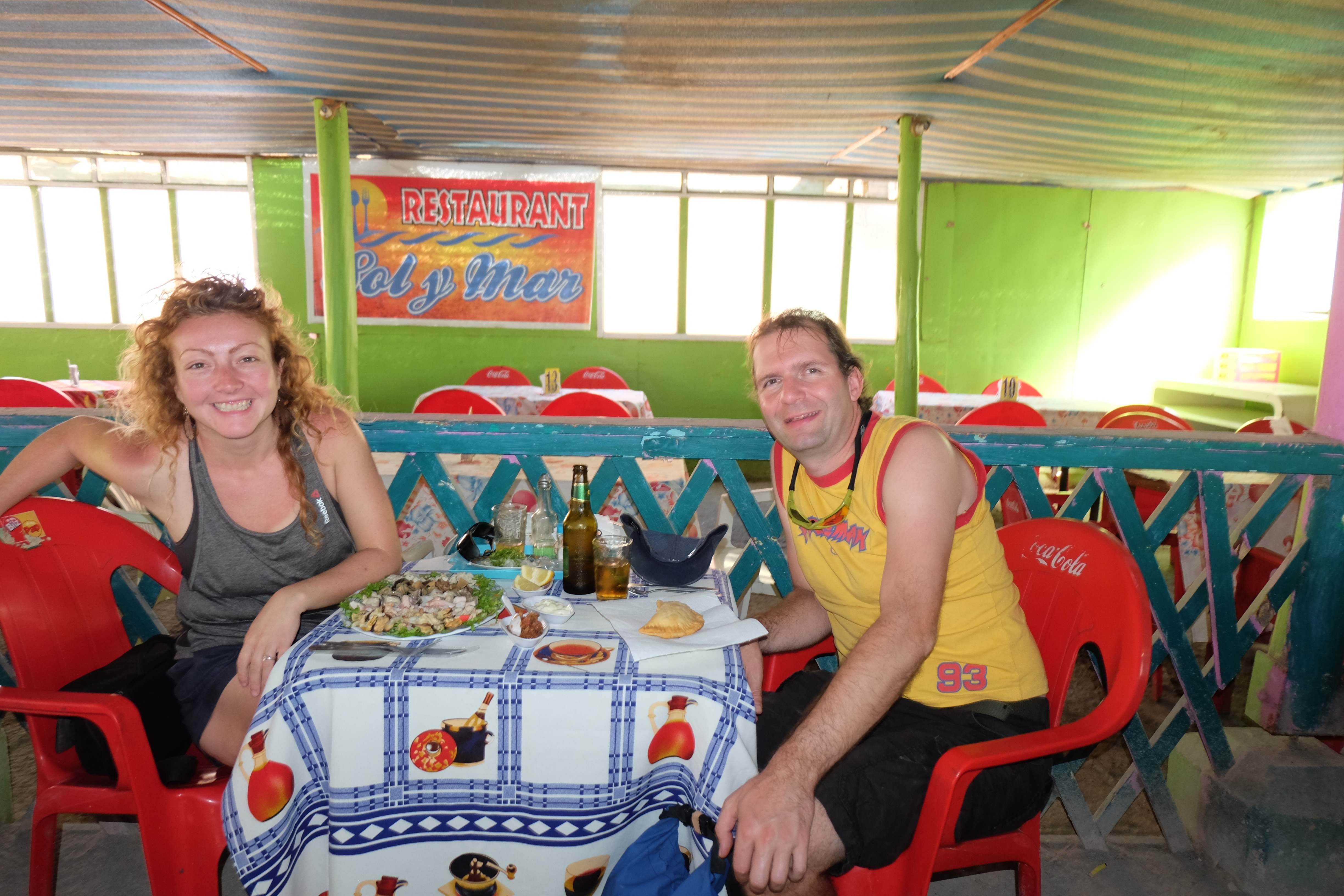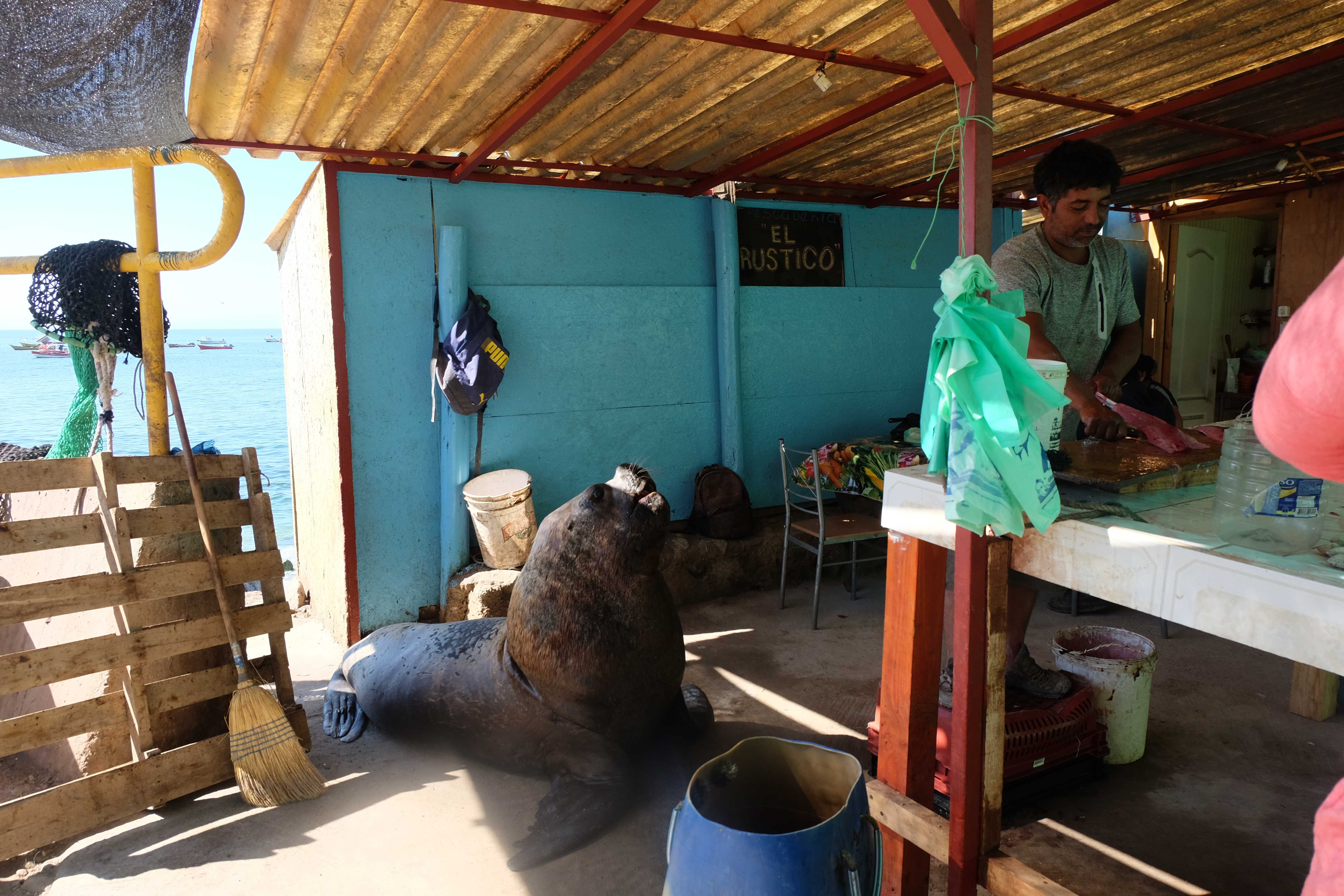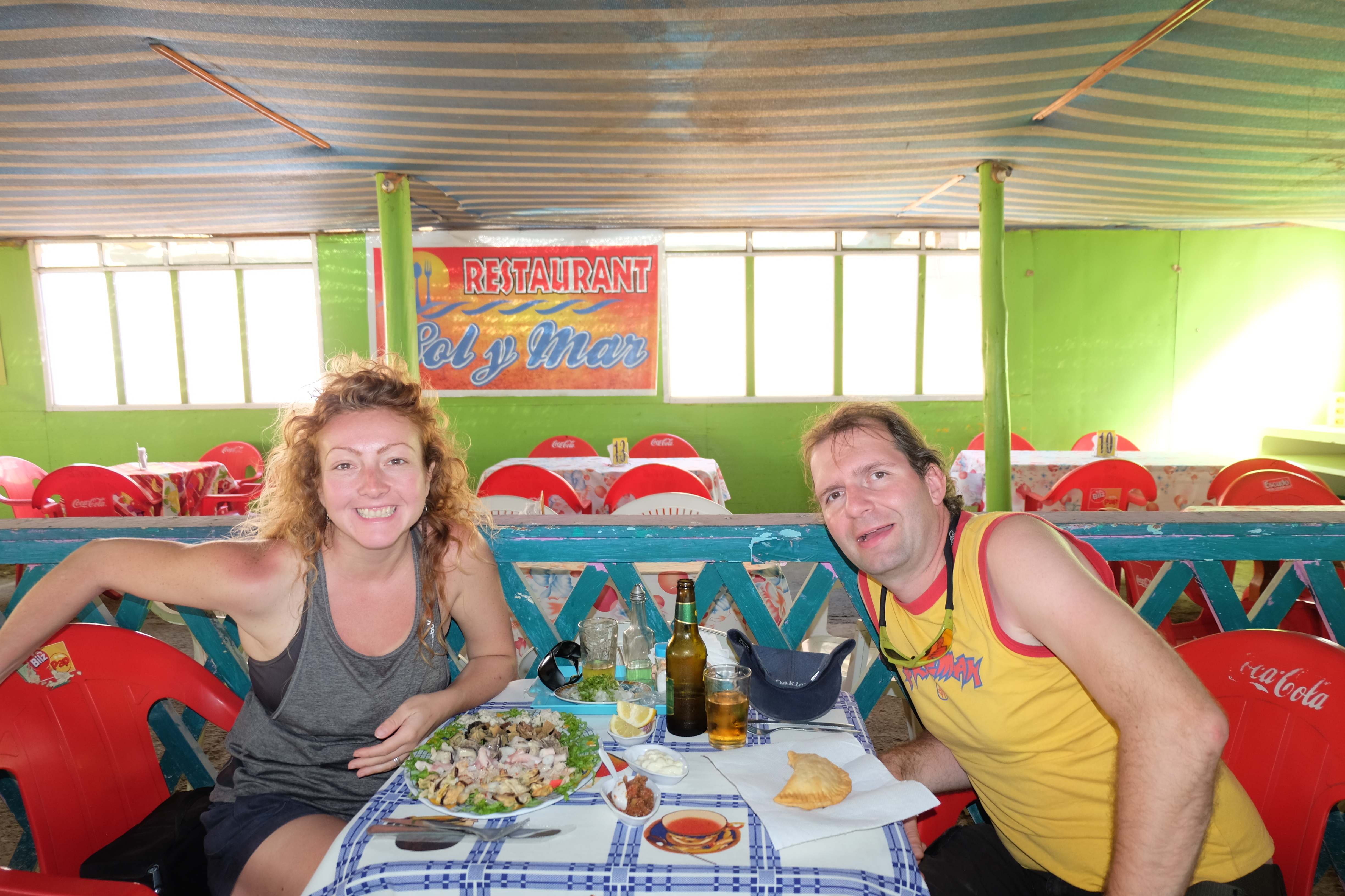 In Coloso ass ich mich mit Meeresfrüchten voll, wir schauten einem Seelöwen zu wie er bei einer Fischer-Theke zuhause war und… wurden auf dem Heimweg an der Bushaltestelle plötzlich vom Fahrer eines vor uns anhaltenden Autos angesprochen. „Habt ihr es geschafft?“ hiess es… „Ja, vielen Dank, wir kamen dorthin und zurück!“ Versteht ihr nur Bahnhof? Genau so erging es den anderen auf den Bus wartenden Fahrgästen… Ok, hier eine Erklärung: bei dem Typen handelte es sich um einen netten Fahrer, der uns am Morgen auf unseren Weg zur Skulptur ca. 300 m weiterfuhr, da wir falsch platziert waren um ein Auto anzuhalten. Nun hatte er uns wiedergesehen und wollte neugierig herausfinden, wie es uns erging. Ok, wir waren nun offiziell bekannt als Star-Autostopper der Region! 🙂