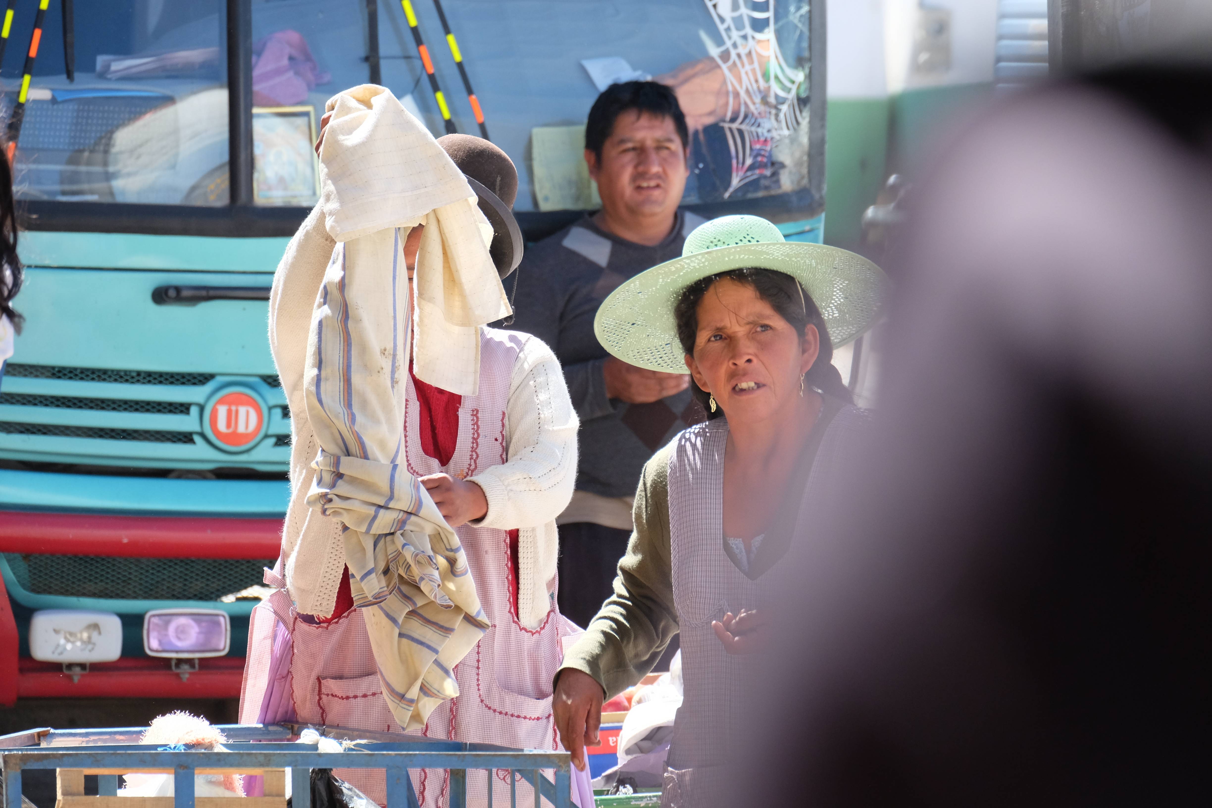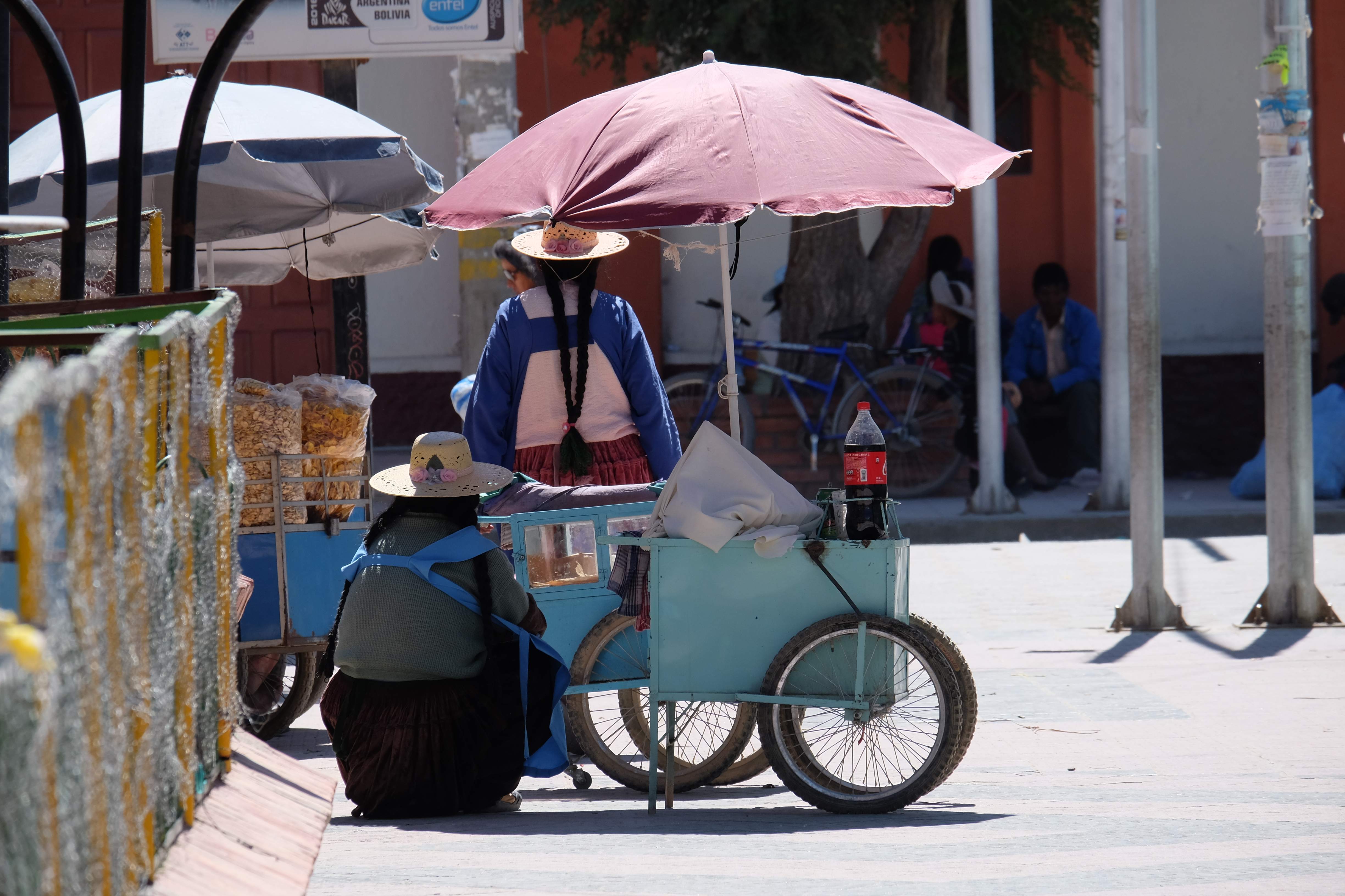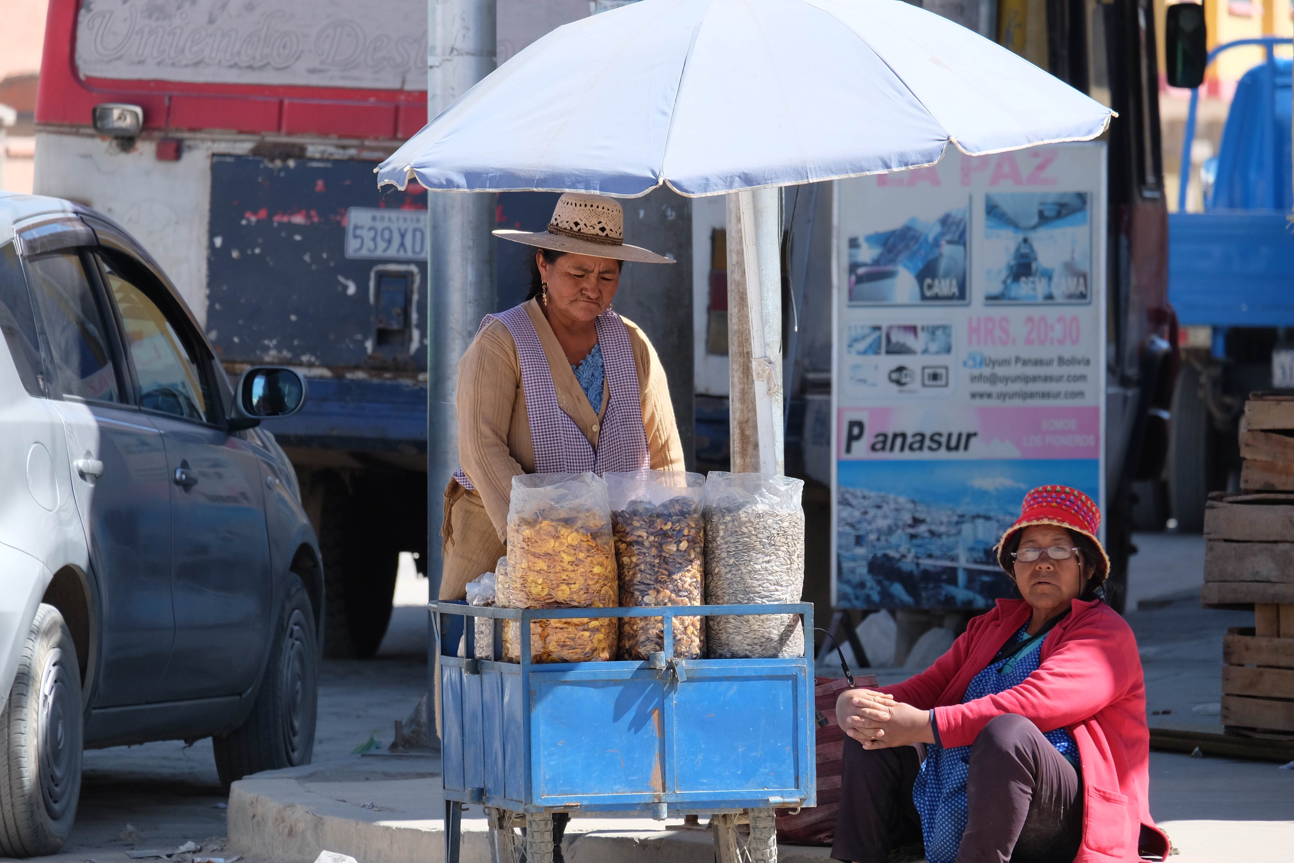 In Uyuni angekommen dachte ich, ich sei im Fotografen-Paradies: so viele traditionell angezogene Frauen (sog. Cholitas), so viele typische Gesichter, so viele Farben und Eindrücke, die lediglich darauf warteten vor meiner Linse zu kommen… leider durfte ich herausfinden, dass die Leute etwas scheu, schüchtern und gar nicht foto-bereit waren. Daher wusste ich: hierzulande hatte ich nur eine indische Fotographen-Spion-Karriere: Leute ohne ihre Erlaubnis und im Geheimen fotografieren, ohne dass sie es ahnen. Aber zurück zu unserer Geschichte: wir mussten trotz Schlafmangel, beinaher Deportation und langer Reise doch noch eine Tour aussuchen, da der arme Patric ebenso erschöpft am Tag darauf eintreffen würde und wir nicht viel (von der zu kurzen) Zeit in Bolivien verlieren wollten. Gedacht, gesagt, getan: die 3-tägige Monster-Tour war bereits gebucht, der am nächsten Tag (nach 4 Flügen und knapp 2 Reisetagen hoffentlich nicht auf der Bahre) ankommende Patric sollte dabei noch gratis am Flughafen abgeholt werden und es sollte sofort losgehen. Wir hatten nämlich die Option zwischen allem sehen oder entspannen und entschieden uns offensichtlich für die Sehenswürdigkeiten – hofften dabei natürlich, dass Patric (trotz Erschöpfung) unserer Wahl zustimmen würde. 🙂