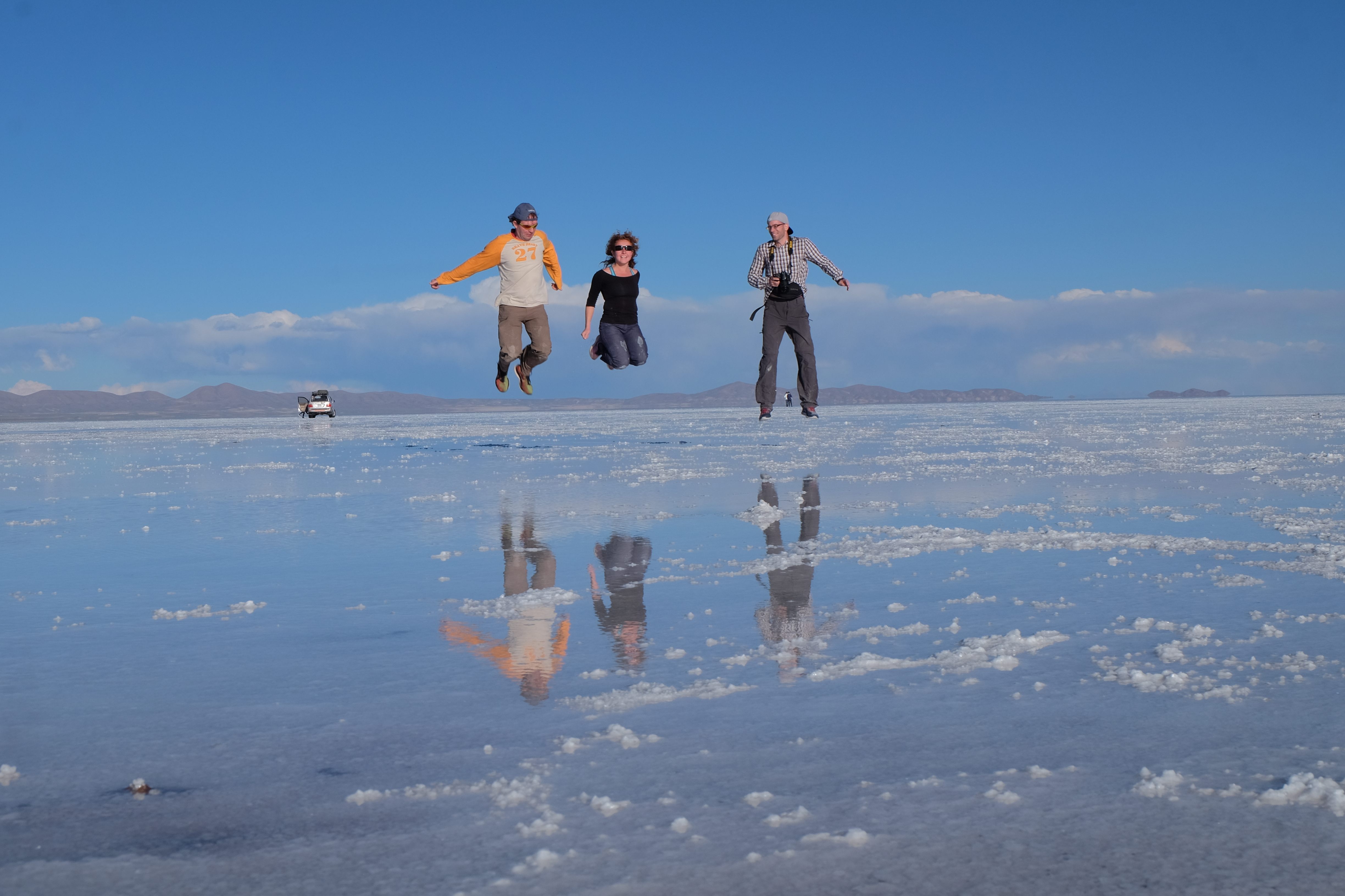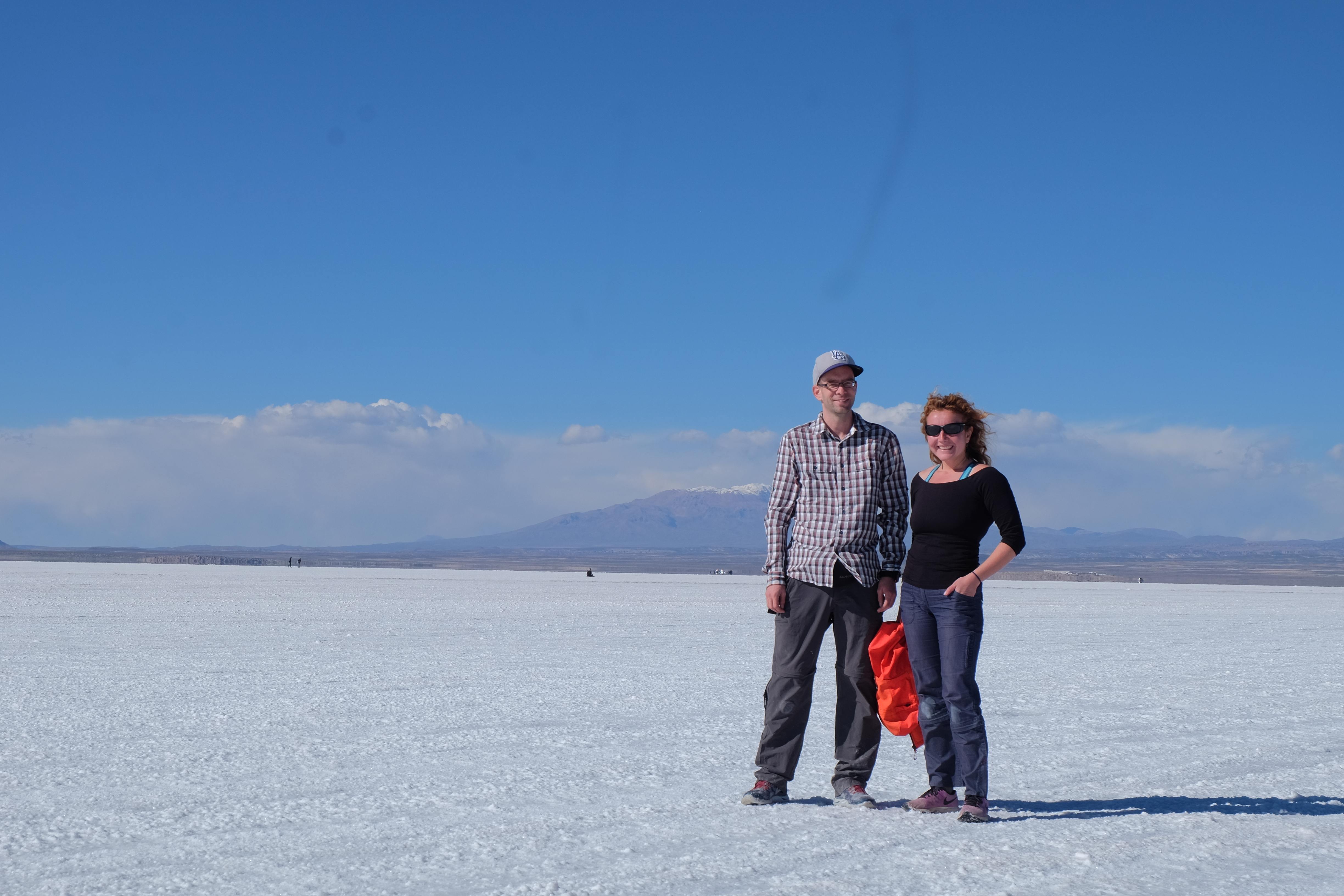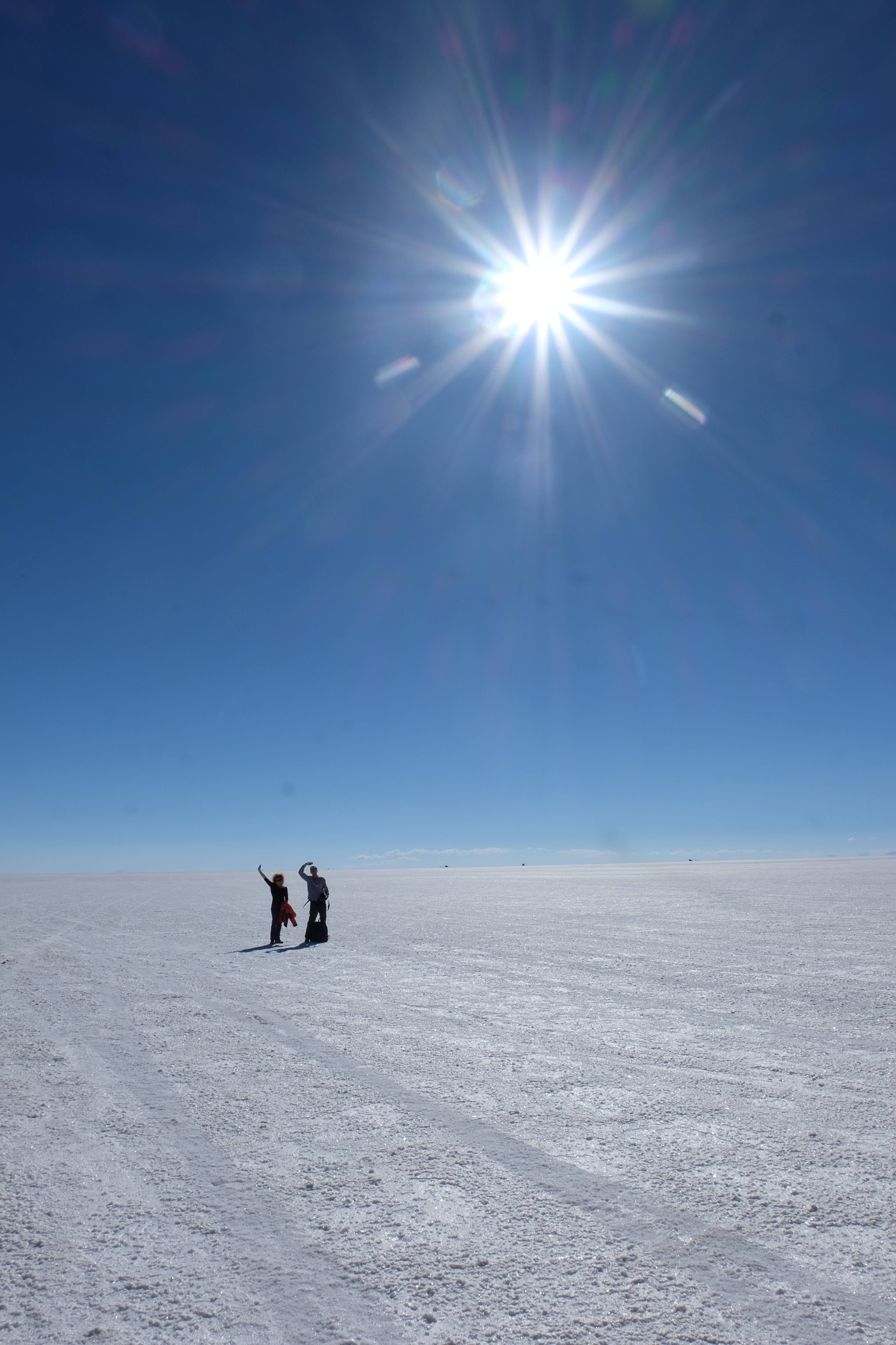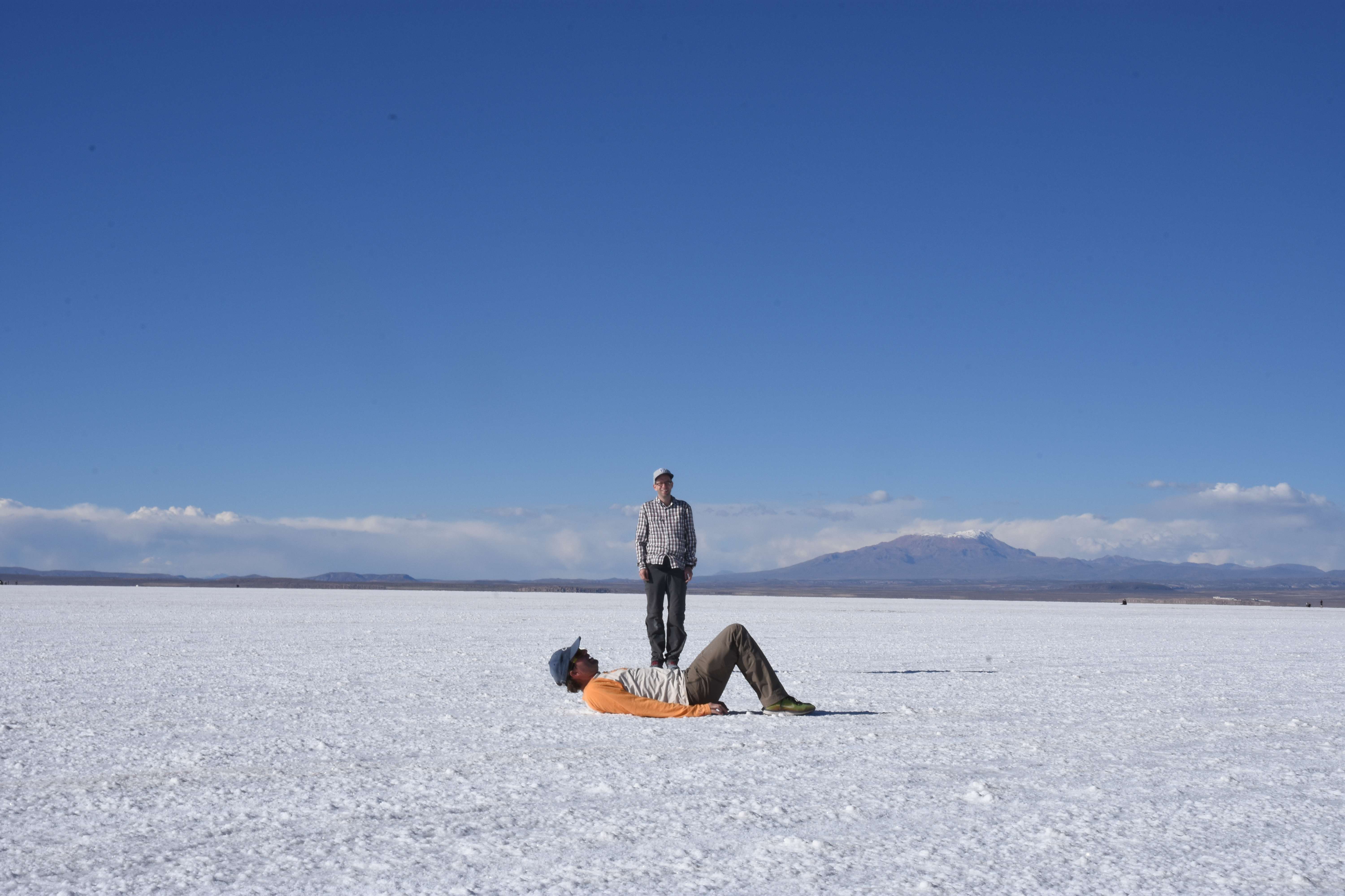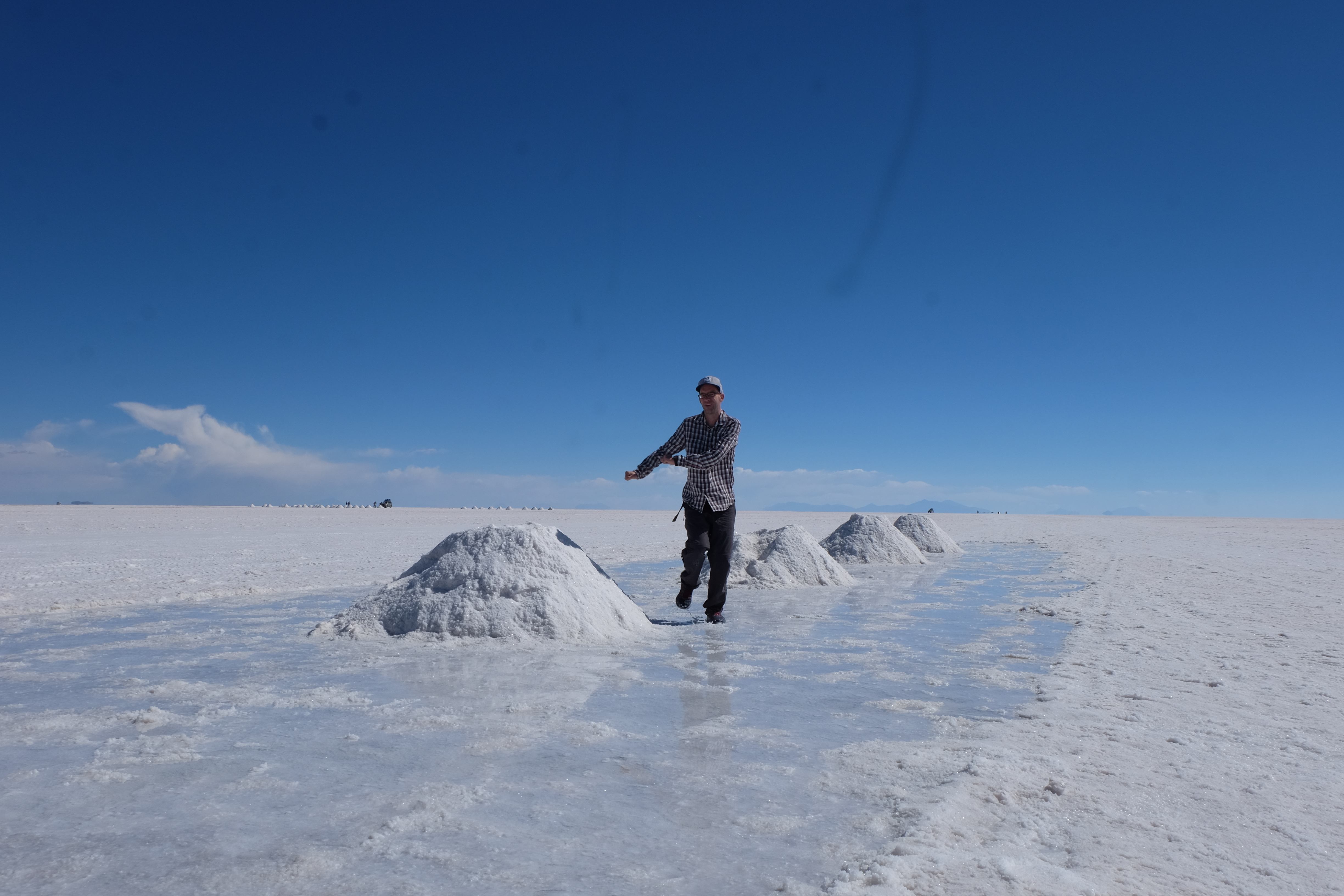 Und wie unsere Erwartungen übertroffen wurden: nach dem Mittagsessen verliessen wir den Planeten Erde und landeten plötzlich in einer unbekannten, aussergewöhnlichen und völlig surrealen Welt: unendliche Weiten an Weiss, Salzkristalle soweit das Auge reichte, Wasseransammlungen, welche die Sonne und die Landschaft spielerisch widerspiegelten, bunte darauf fahrende Fahrzeuge vollgepackt mit sprachlosen Touristen und wir inmitten dieser Wunderwelt. Wie beschreibt man so etwas? Es war, als hätte das Universum plötzlich mal einen Besuch von der Inspirationsmuse erhalten und darauf in schöpferischer Laune war. Da nahm es mal eine Unendlichkeit an Weiss und fing an darauf Wörter und Ideen mit Landschaften, Farben, Klängen, mit Licht und Schatten, ja sogar mit Leere zu dichten. Am Ende war sein Werk vollbracht: da stand ein Salzsee in seiner ganzen Pracht, das Wasser besang ihn tagtäglich, die Sonne leistete ihm Gesellschaft, das Weiss war nicht nur ein leeres Blatt, sondern eine Fülle an Emotionen, Eindrücken, Formen und Gestalten, welche ausserirdisch schienen… dermassen ausserirdisch, dass die Sonne am Ende eines jeden Tages sich diesen Anblick erneut gönnen wollte, so dass sie extra lange da verweilte und es kaum schaffte davon Abschied zu nehmen. Aber was sind Wörter? Die Aussagekraft meiner ist zumindest nichts im Vergleich zu jener der Landschaft selbst. Also macht euch mal selber ein Bild davon, während wir uns entsalzen (wenn jemand noch Salz für seine Grillabende möchte, bitte bei uns melden!) 🙂