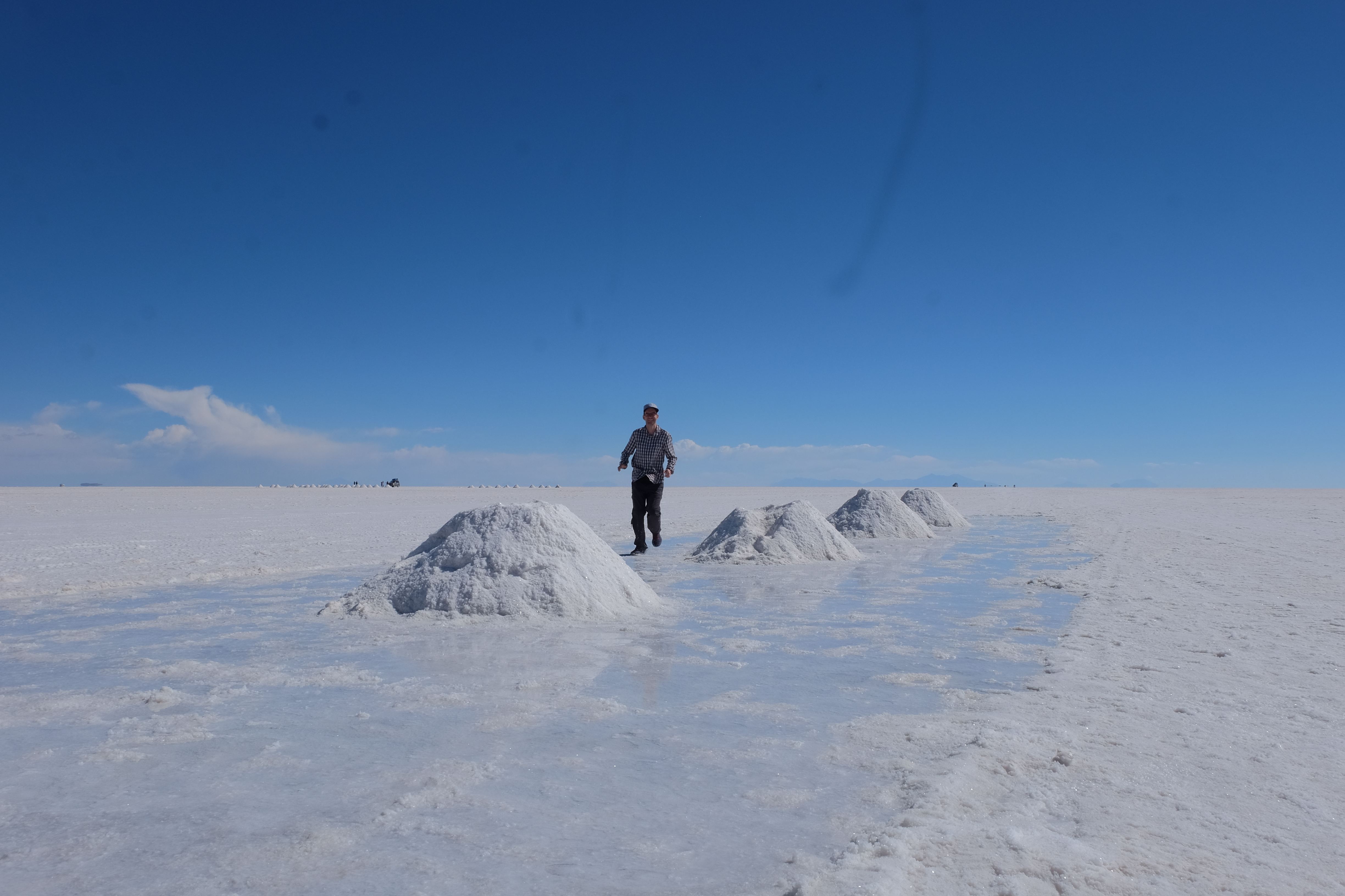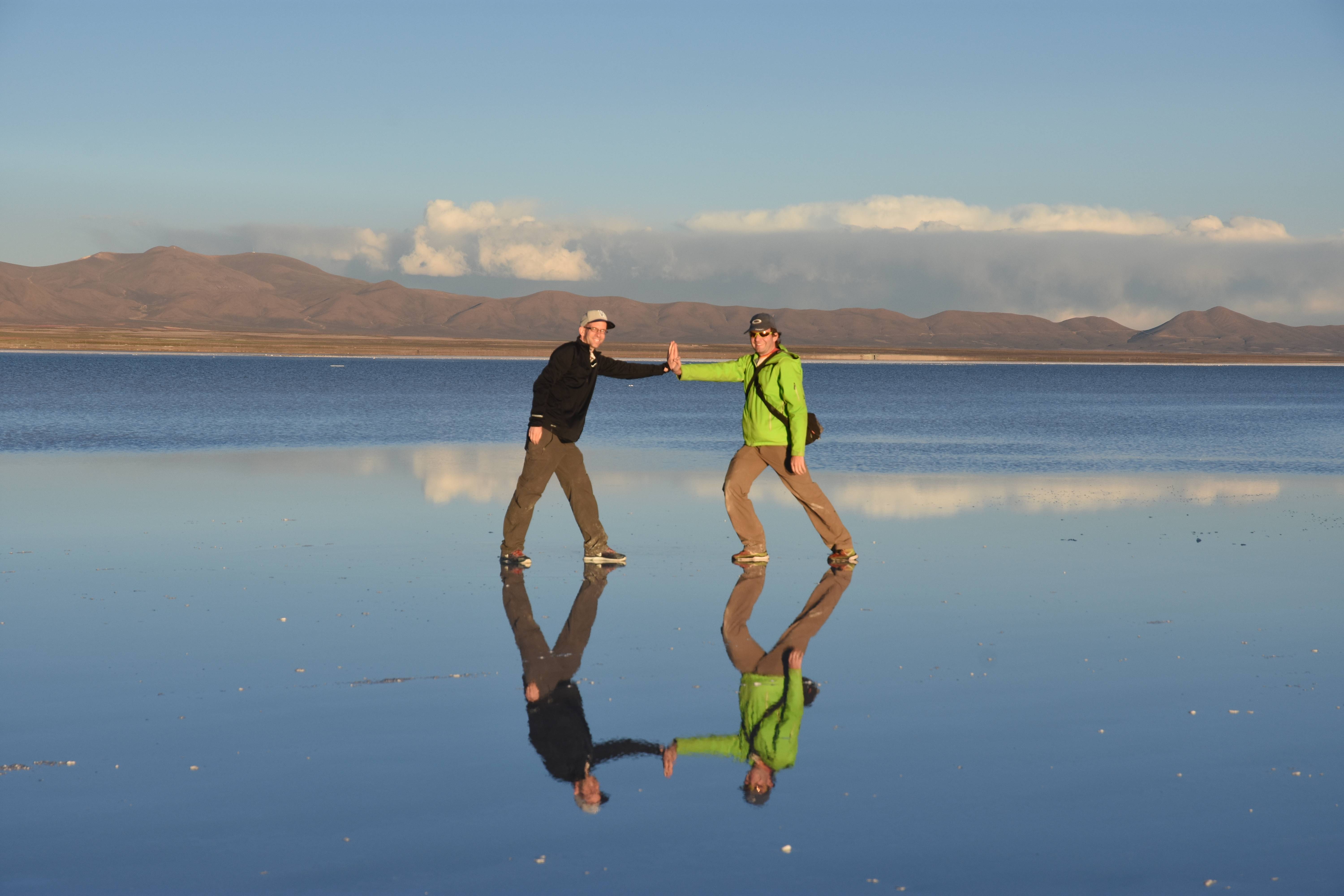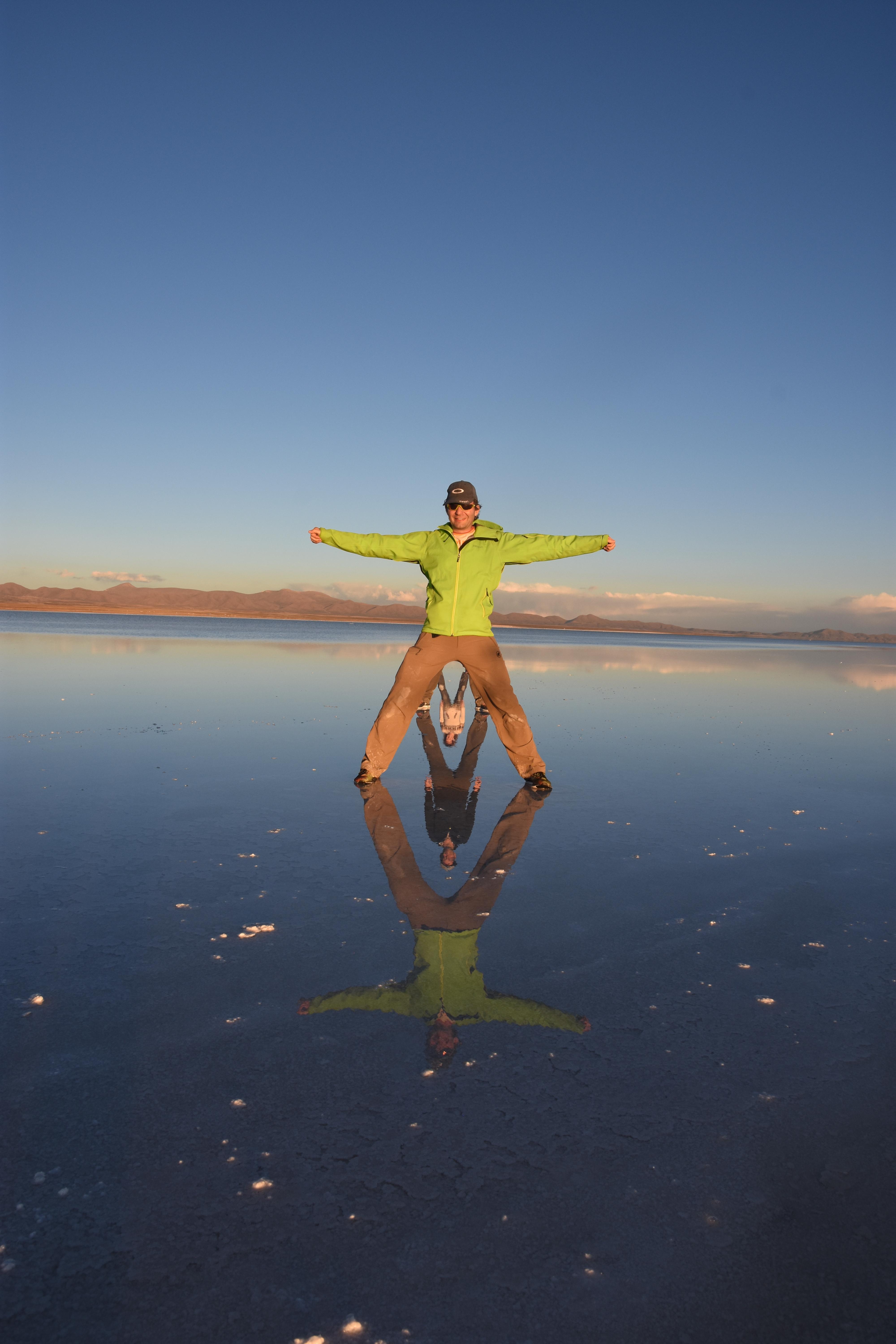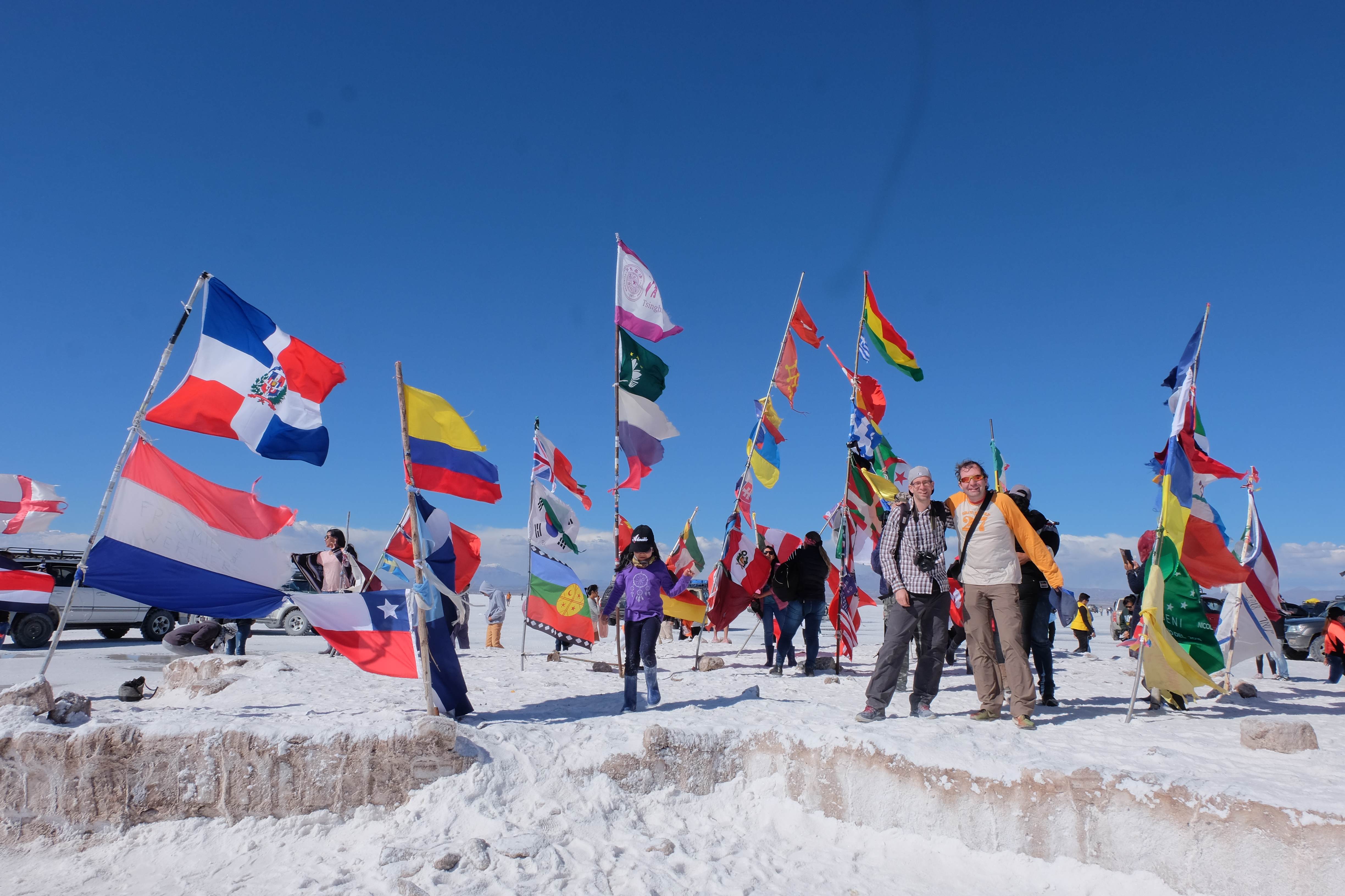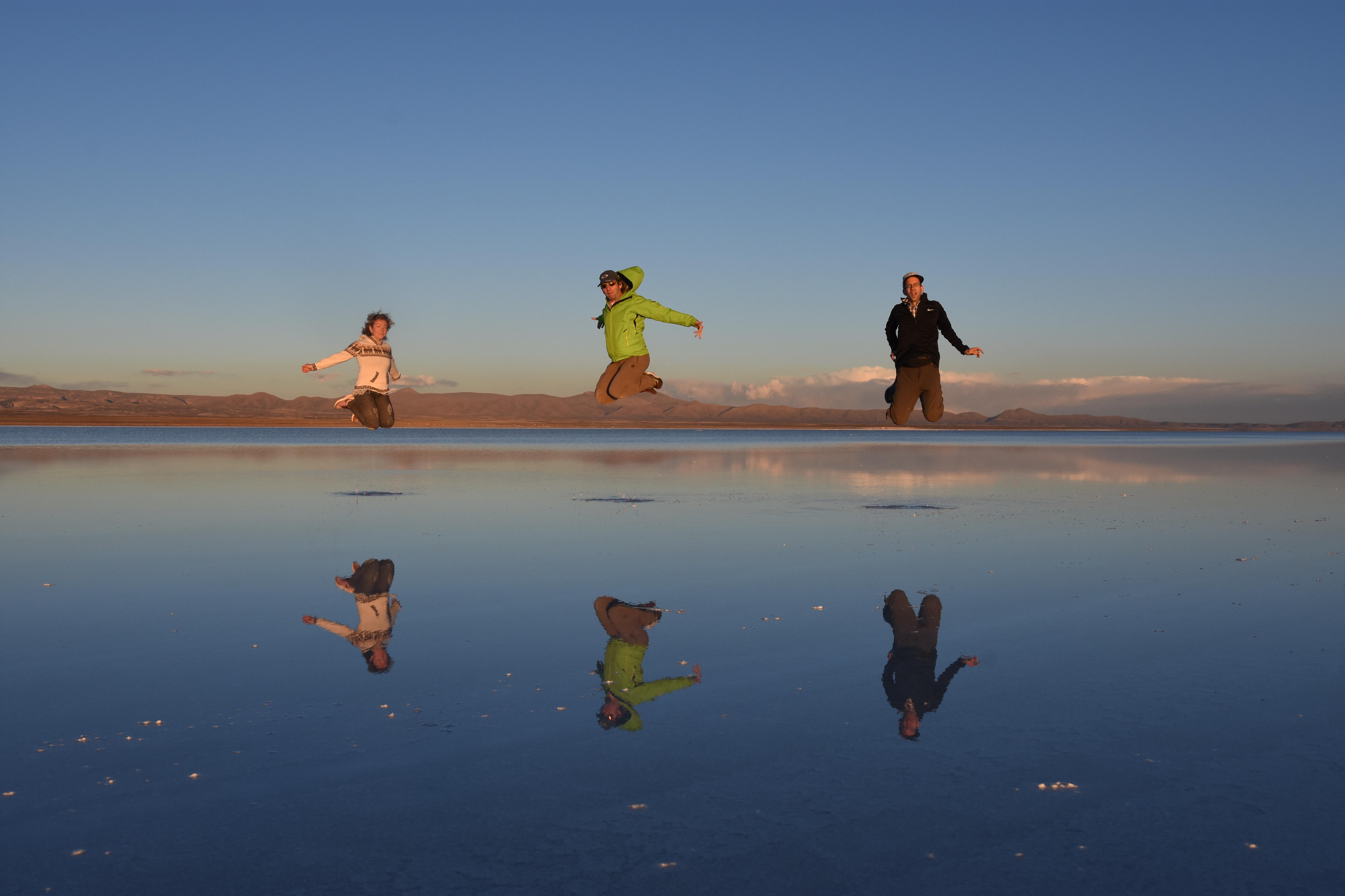 Und wie unsere Erwartungen übertroffen wurden: nach dem Mittagsessen verliessen wir den Planeten Erde und landeten plötzlich in einer unbekannten, aussergewöhnlichen und völlig surrealen Welt: unendliche Weiten an Weiss, Salzkristalle soweit das Auge reichte, Wasseransammlungen, welche die Sonne und die Landschaft spielerisch widerspiegelten, bunte darauf fahrende Fahrzeuge vollgepackt mit sprachlosen Touristen und wir inmitten dieser Wunderwelt. Wie beschreibt man so etwas? Es war, als hätte das Universum plötzlich mal einen Besuch von der Inspirationsmuse erhalten und darauf in schöpferischer Laune war. Da nahm es mal eine Unendlichkeit an Weiss und fing an darauf Wörter und Ideen mit Landschaften, Farben, Klängen, mit Licht und Schatten, ja sogar mit Leere zu dichten. Am Ende war sein Werk vollbracht: da stand ein Salzsee in seiner ganzen Pracht, das Wasser besang ihn tagtäglich, die Sonne leistete ihm Gesellschaft, das Weiss war nicht nur ein leeres Blatt, sondern eine Fülle an Emotionen, Eindrücken, Formen und Gestalten, welche ausserirdisch schienen… dermassen ausserirdisch, dass die Sonne am Ende eines jeden Tages sich diesen Anblick erneut gönnen wollte, so dass sie extra lange da verweilte und es kaum schaffte davon Abschied zu nehmen. Aber was sind Wörter? Die Aussagekraft meiner ist zumindest nichts im Vergleich zu jener der Landschaft selbst. Also macht euch mal selber ein Bild davon, während wir uns entsalzen (wenn jemand noch Salz für seine Grillabende möchte, bitte bei uns melden!) 🙂
