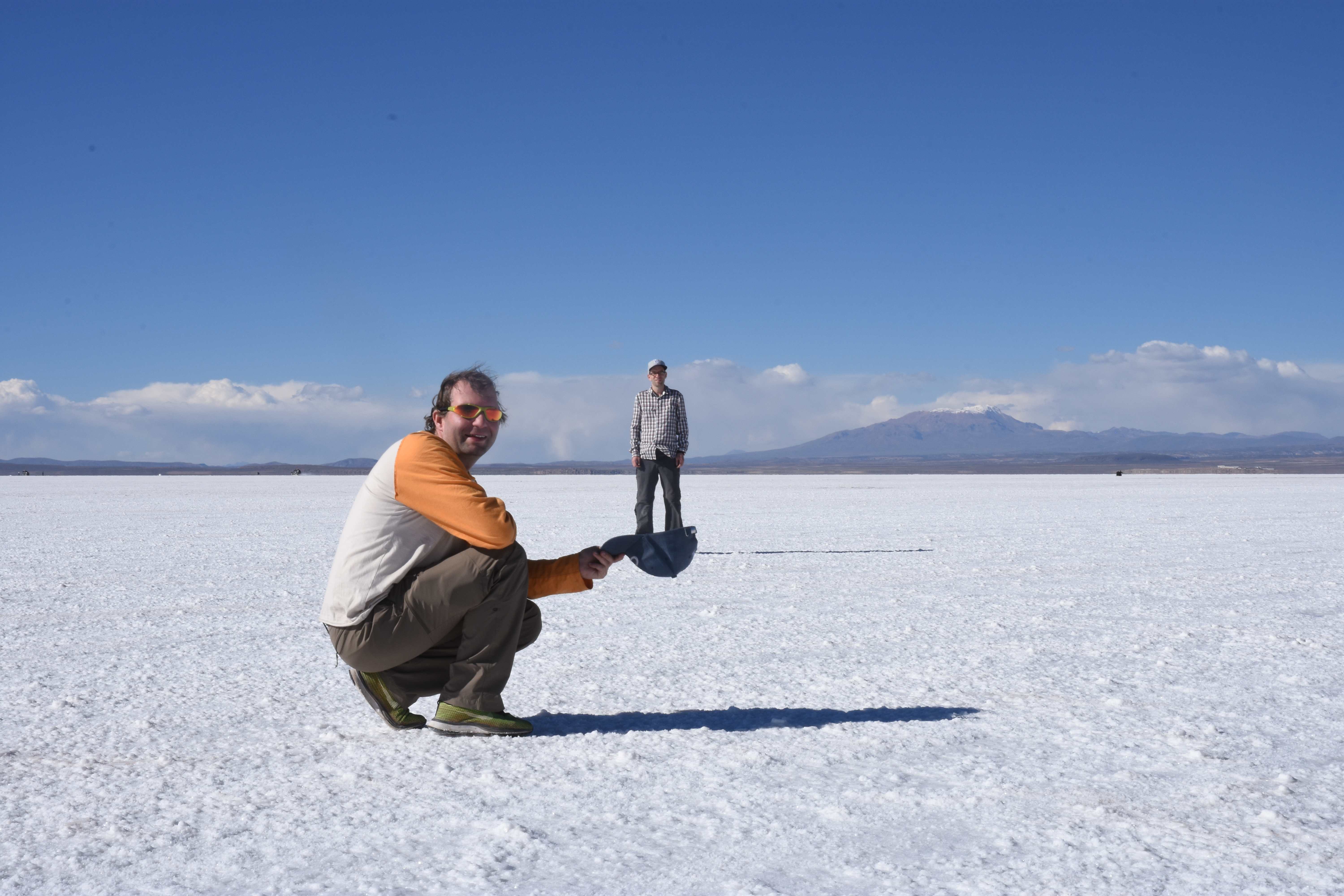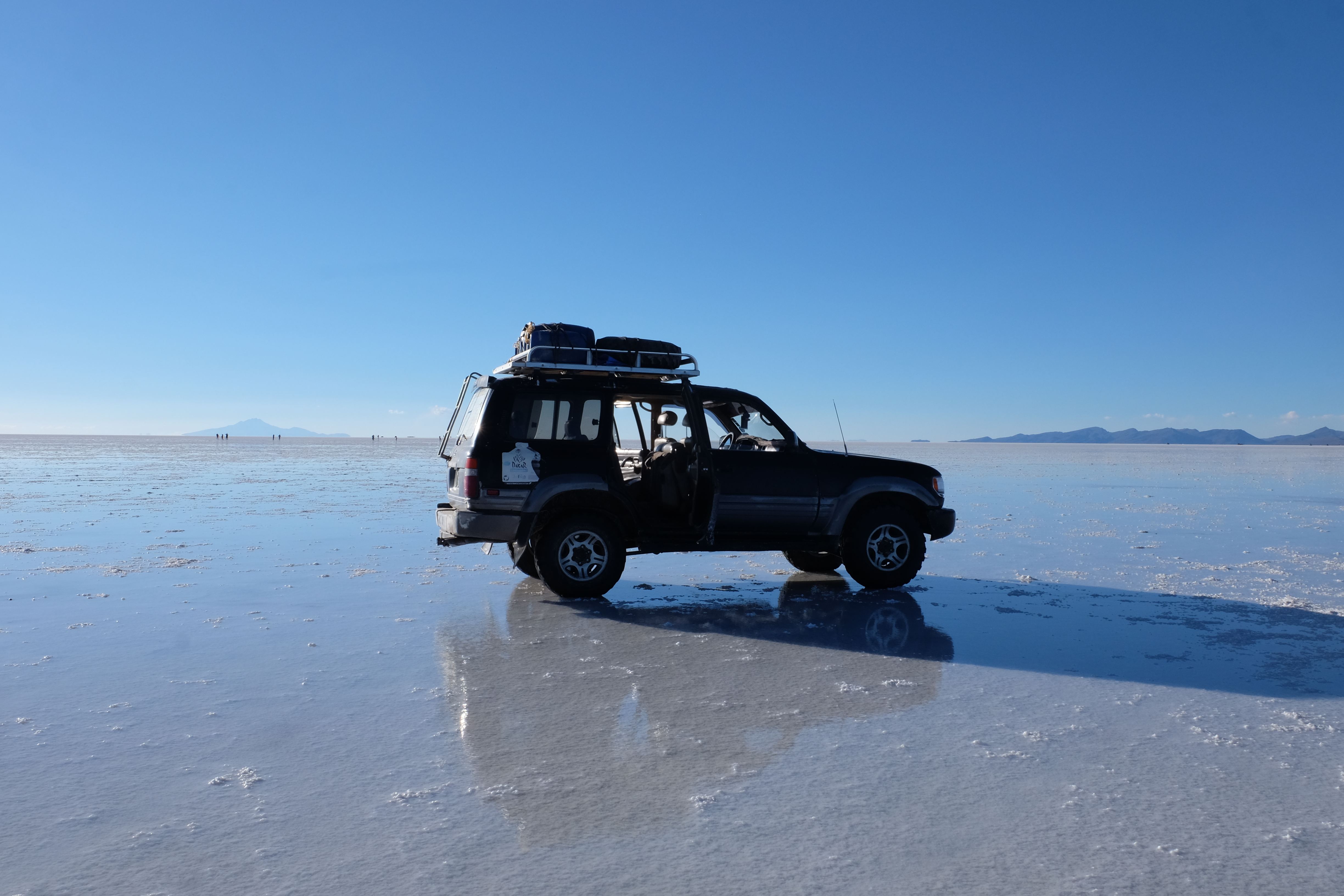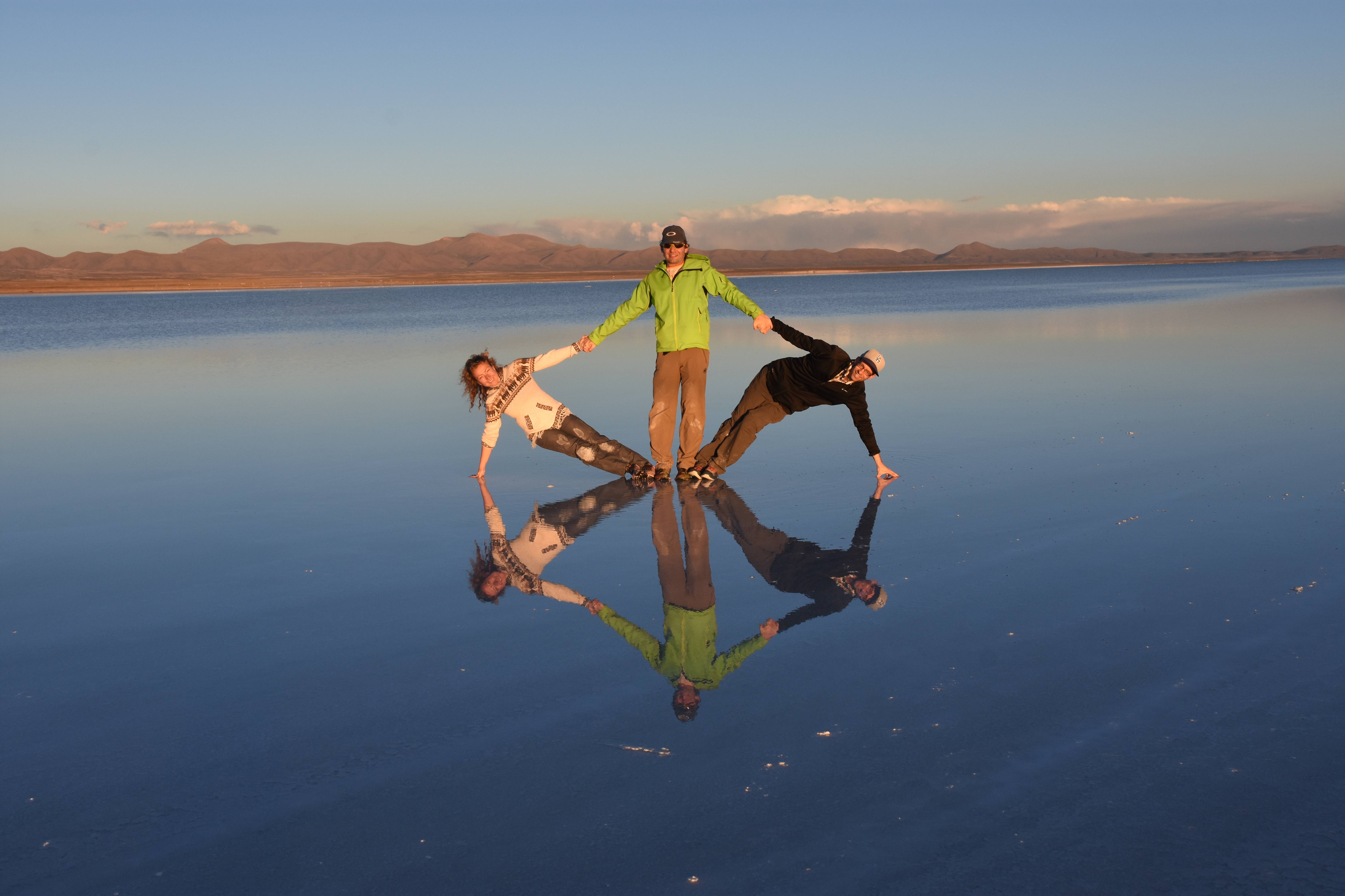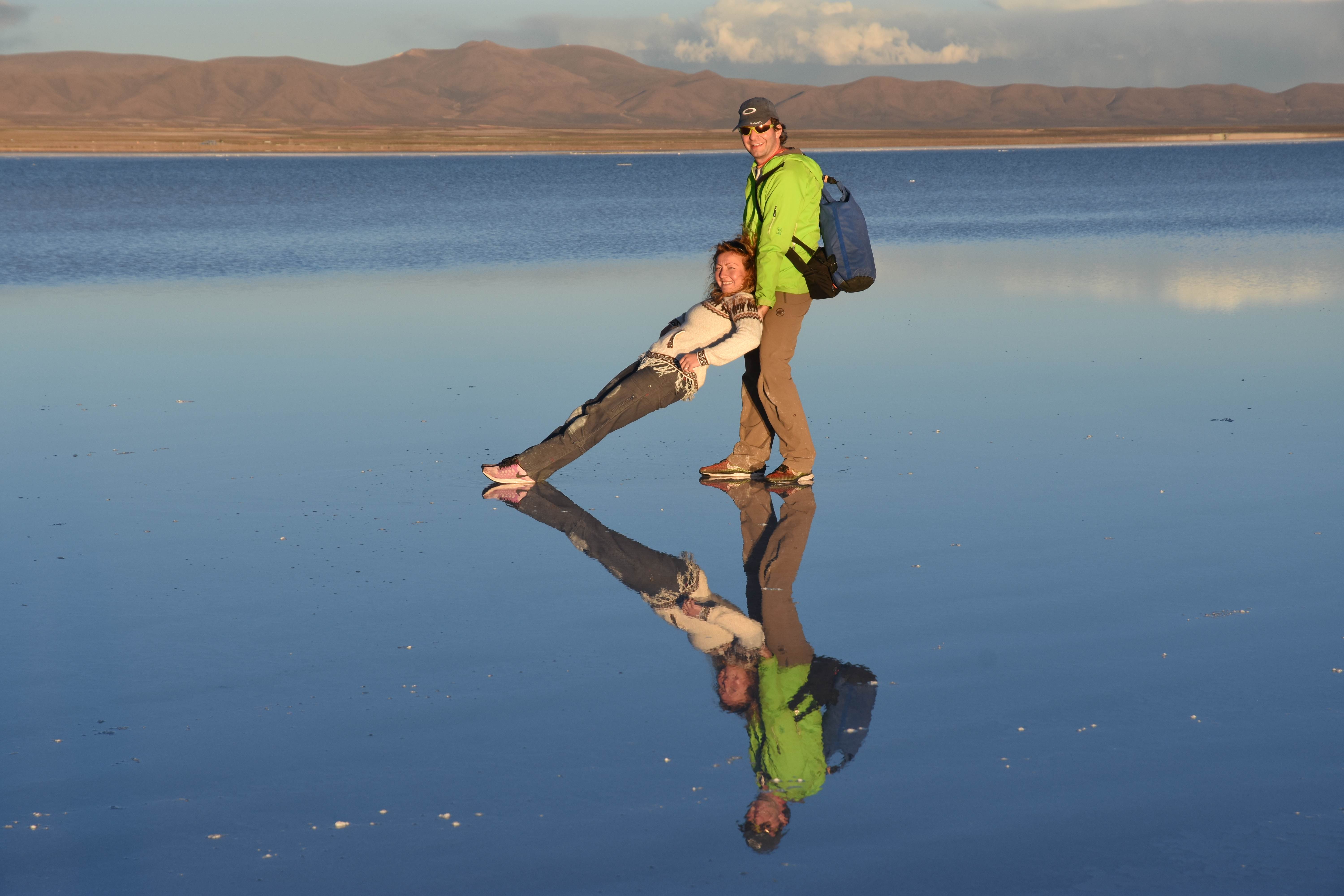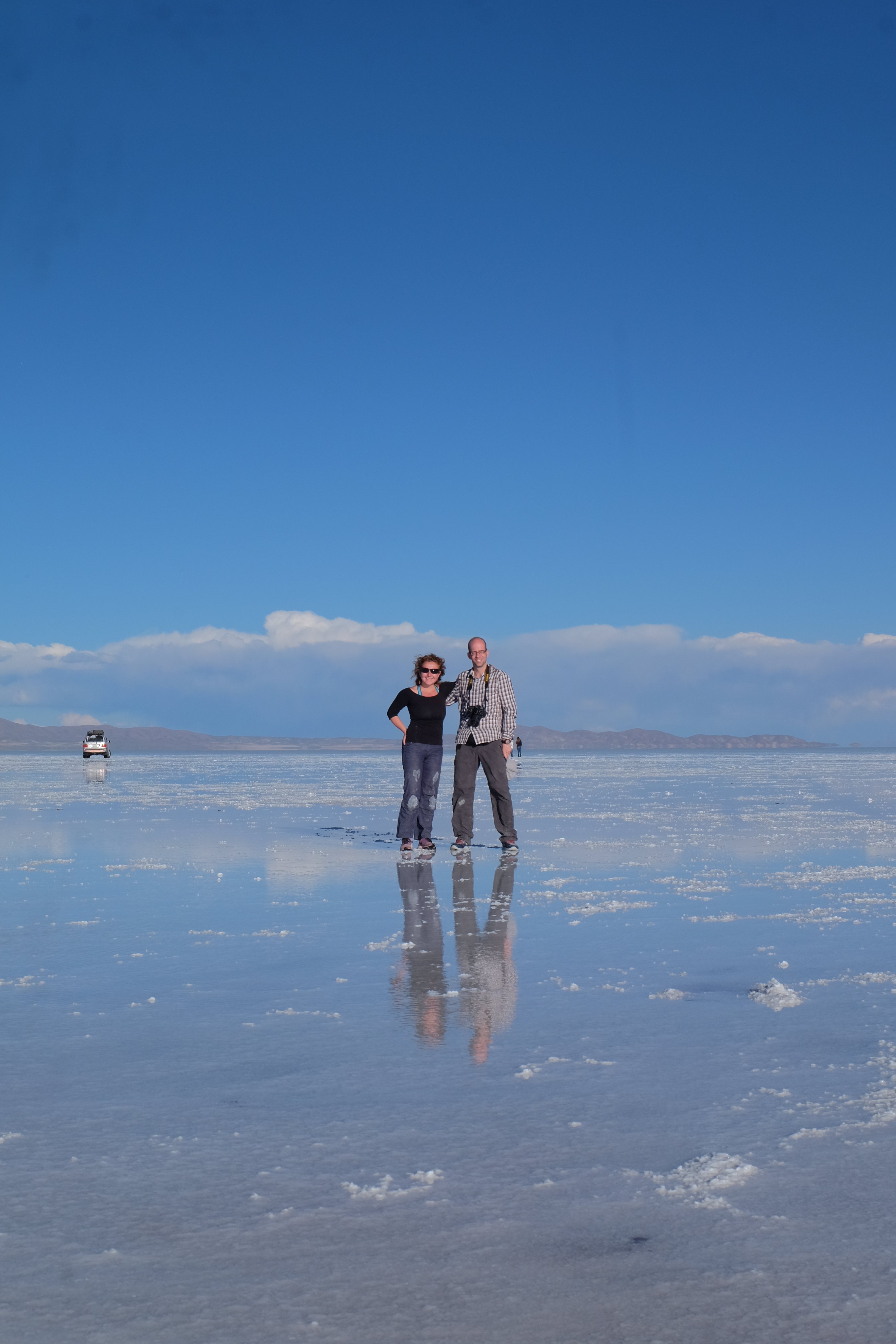 Und wie unsere Erwartungen übertroffen wurden: nach dem Mittagsessen verliessen wir den Planeten Erde und landeten plötzlich in einer unbekannten, aussergewöhnlichen und völlig surrealen Welt: unendliche Weiten an Weiss, Salzkristalle soweit das Auge reichte, Wasseransammlungen, welche die Sonne und die Landschaft spielerisch widerspiegelten, bunte darauf fahrende Fahrzeuge vollgepackt mit sprachlosen Touristen und wir inmitten dieser Wunderwelt. Wie beschreibt man so etwas? Es war, als hätte das Universum plötzlich mal einen Besuch von der Inspirationsmuse erhalten und darauf in schöpferischer Laune war. Da nahm es mal eine Unendlichkeit an Weiss und fing an darauf Wörter und Ideen mit Landschaften, Farben, Klängen, mit Licht und Schatten, ja sogar mit Leere zu dichten. Am Ende war sein Werk vollbracht: da stand ein Salzsee in seiner ganzen Pracht, das Wasser besang ihn tagtäglich, die Sonne leistete ihm Gesellschaft, das Weiss war nicht nur ein leeres Blatt, sondern eine Fülle an Emotionen, Eindrücken, Formen und Gestalten, welche ausserirdisch schienen… dermassen ausserirdisch, dass die Sonne am Ende eines jeden Tages sich diesen Anblick erneut gönnen wollte, so dass sie extra lange da verweilte und es kaum schaffte davon Abschied zu nehmen. Aber was sind Wörter? Die Aussagekraft meiner ist zumindest nichts im Vergleich zu jener der Landschaft selbst. Also macht euch mal selber ein Bild davon, während wir uns entsalzen (wenn jemand noch Salz für seine Grillabende möchte, bitte bei uns melden!) 🙂