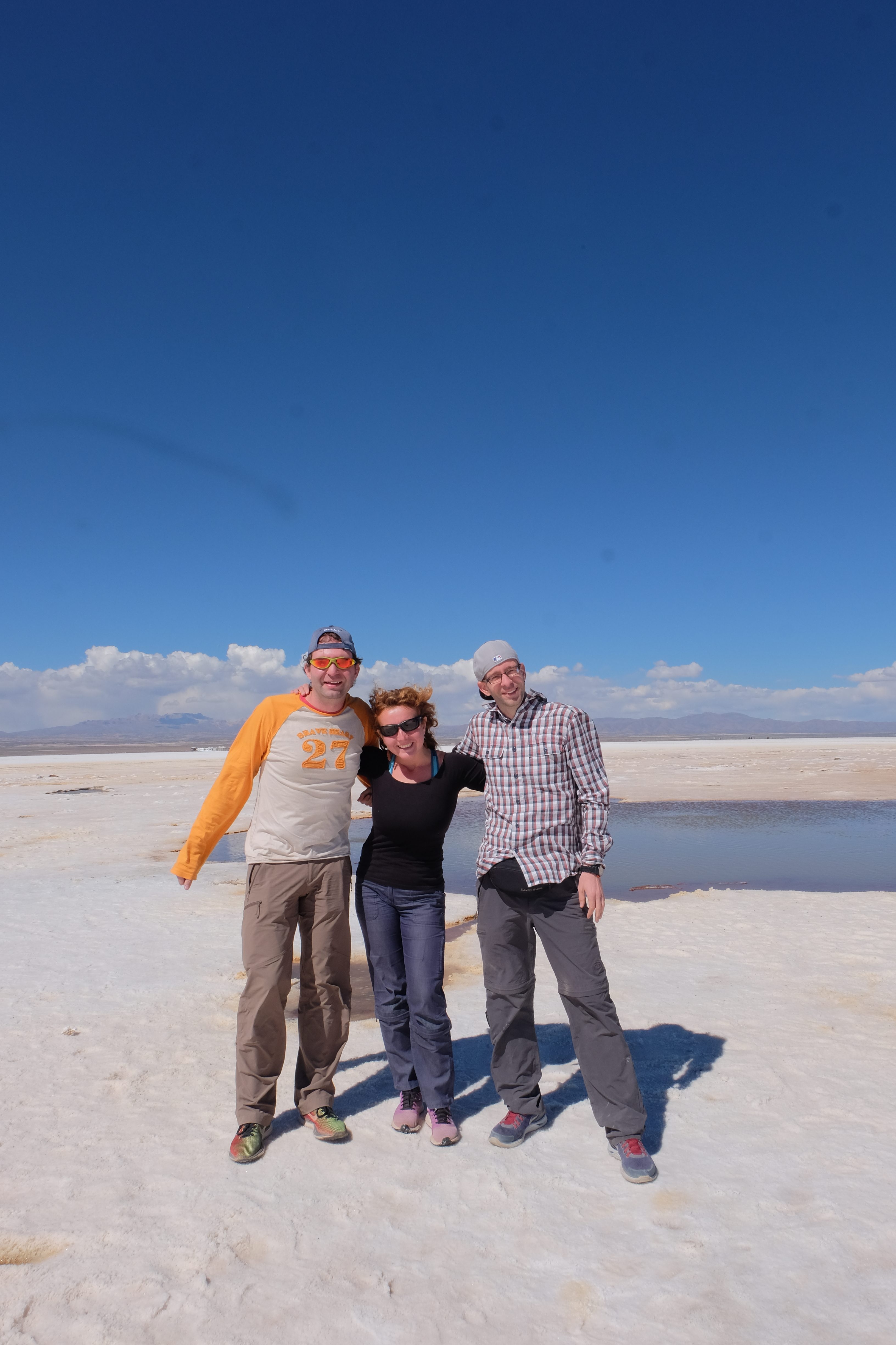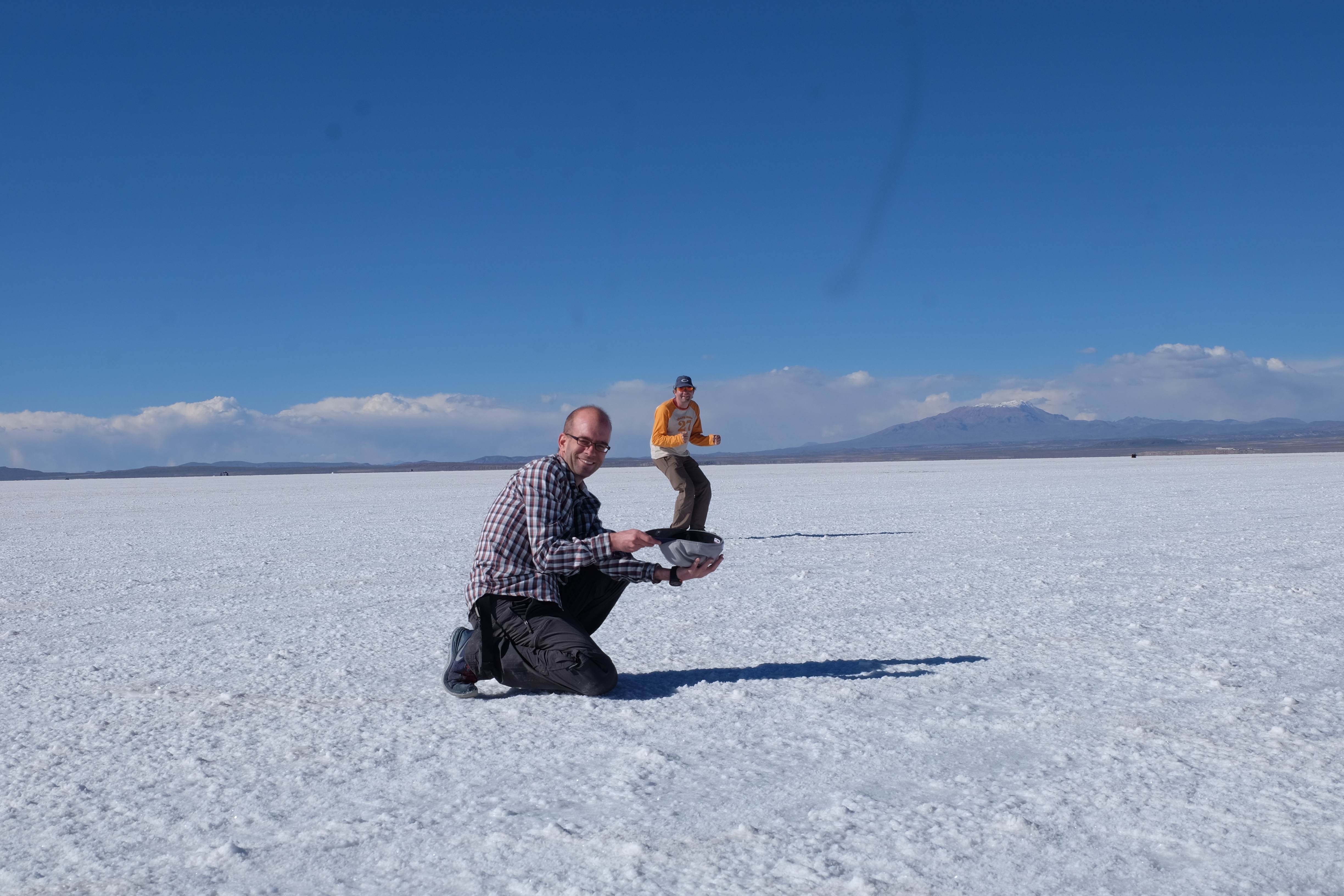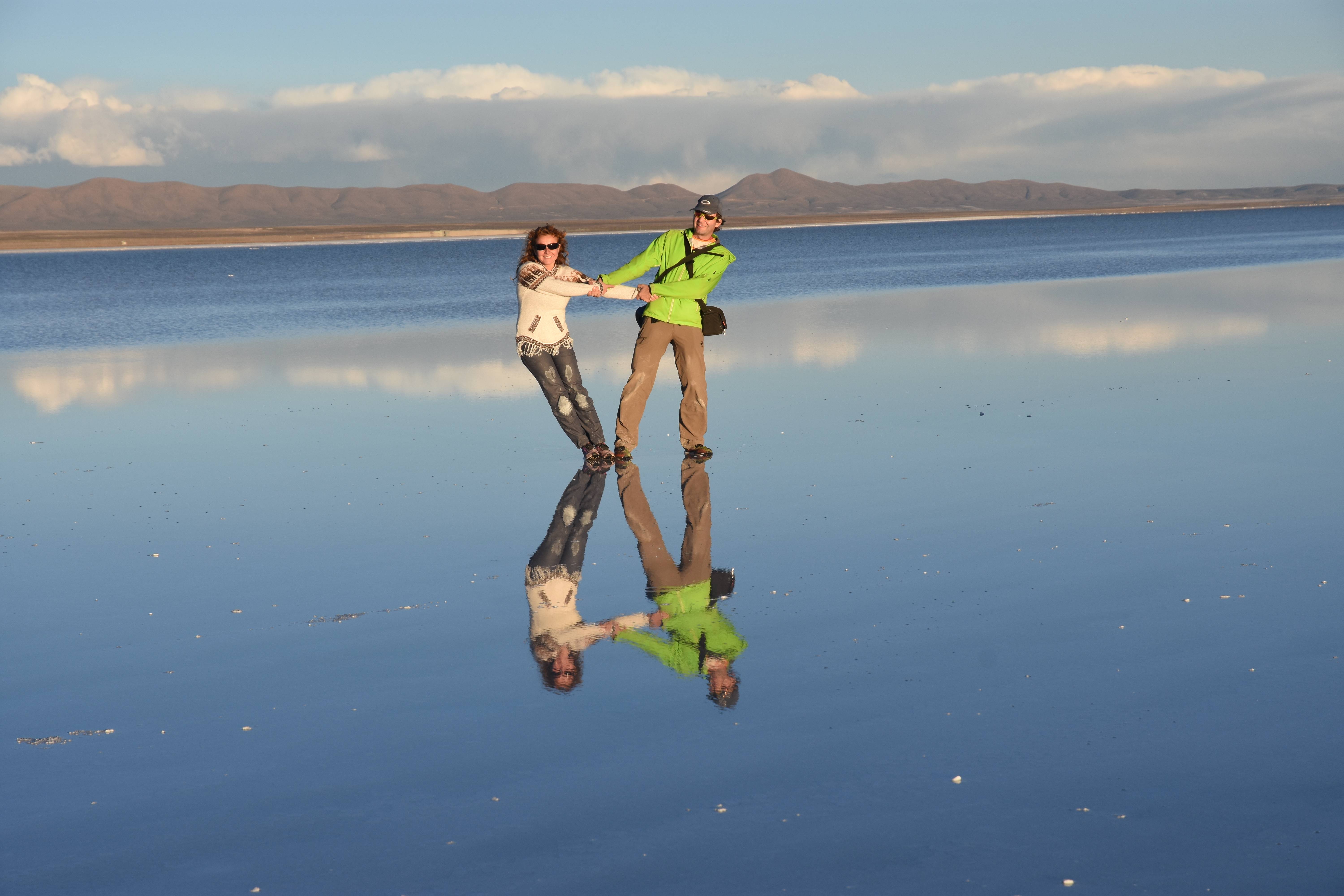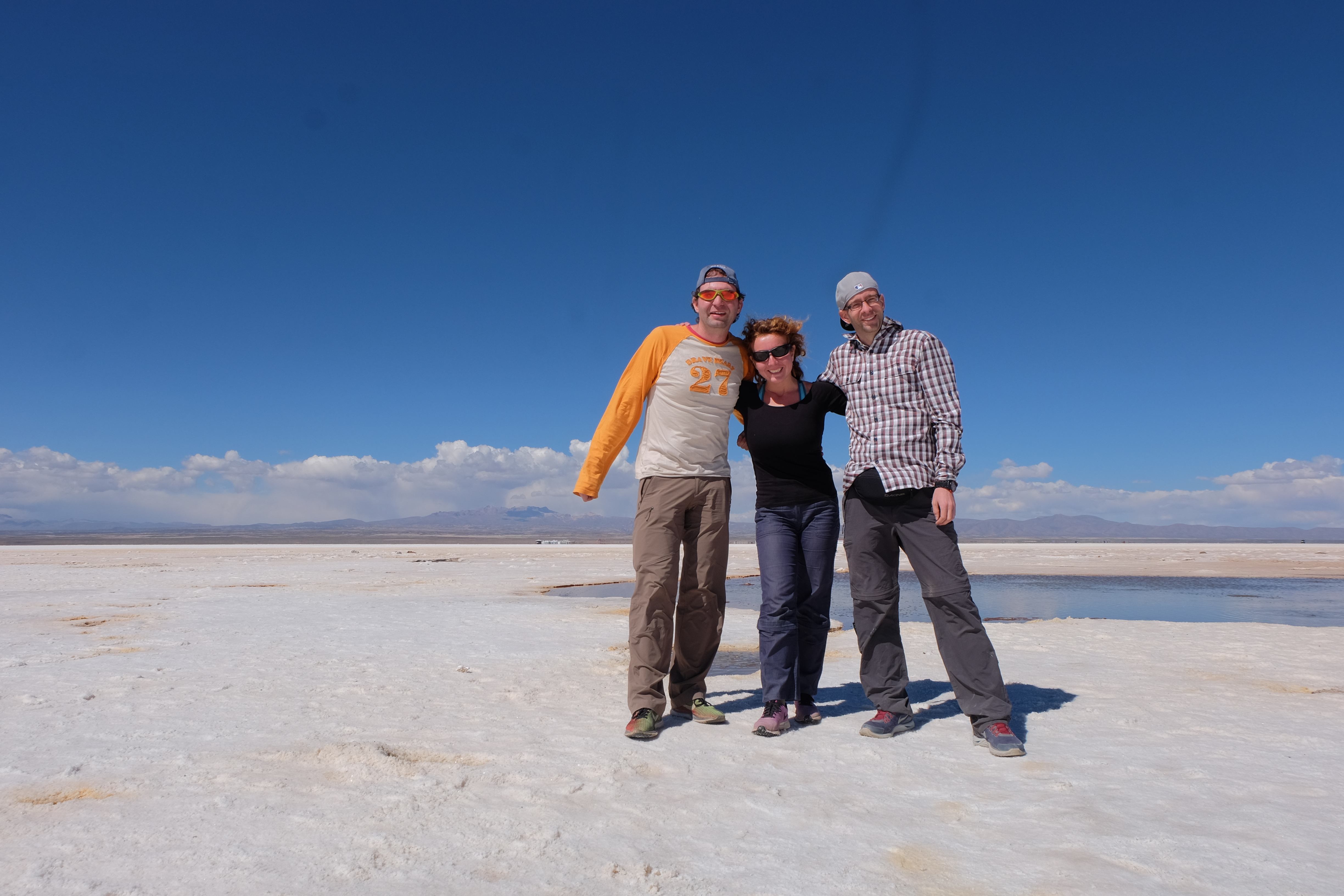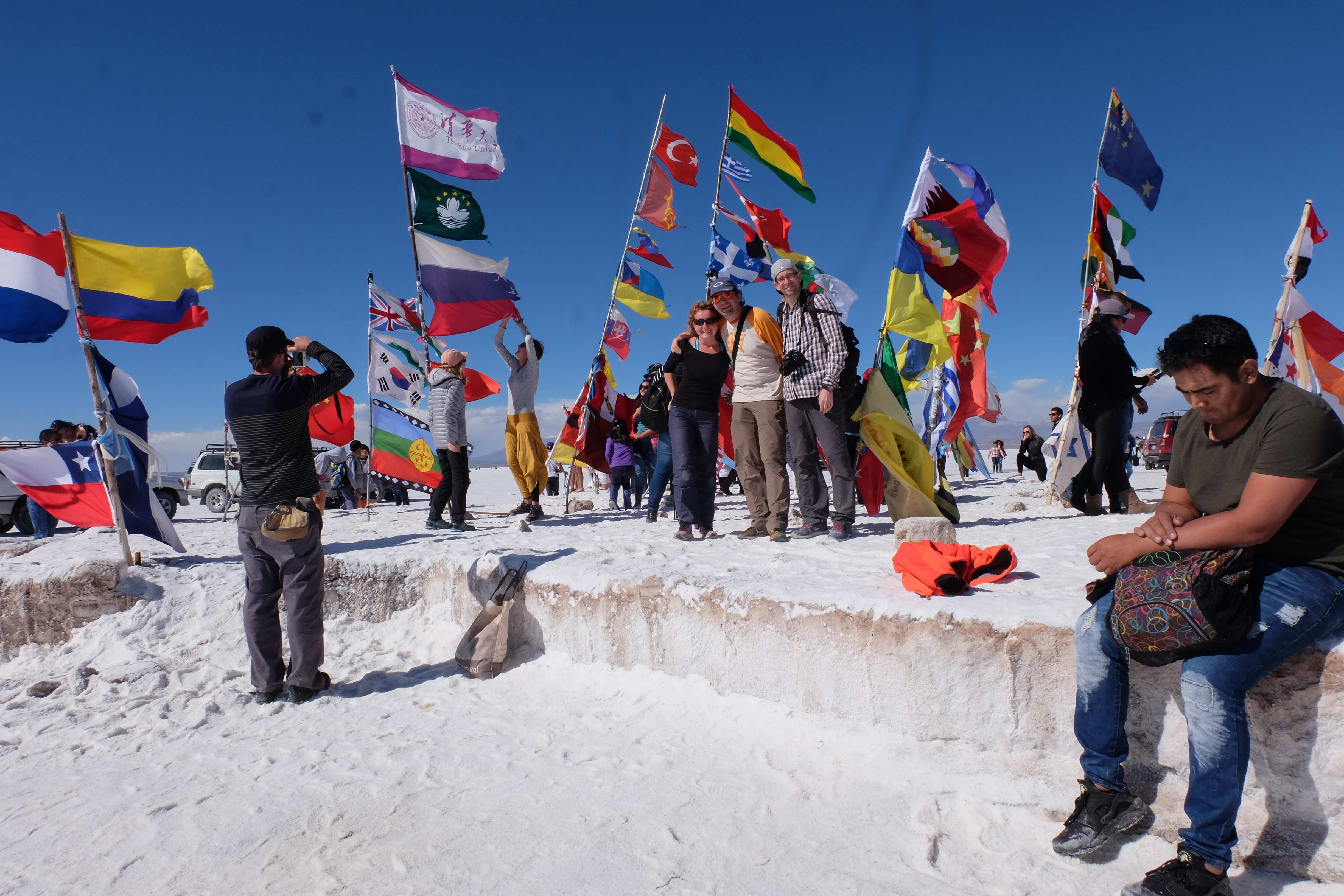 Und wie unsere Erwartungen übertroffen wurden: nach dem Mittagsessen verliessen wir den Planeten Erde und landeten plötzlich in einer unbekannten, aussergewöhnlichen und völlig surrealen Welt: unendliche Weiten an Weiss, Salzkristalle soweit das Auge reichte, Wasseransammlungen, welche die Sonne und die Landschaft spielerisch widerspiegelten, bunte darauf fahrende Fahrzeuge vollgepackt mit sprachlosen Touristen und wir inmitten dieser Wunderwelt. Wie beschreibt man so etwas? Es war, als hätte das Universum plötzlich mal einen Besuch von der Inspirationsmuse erhalten und darauf in schöpferischer Laune war. Da nahm es mal eine Unendlichkeit an Weiss und fing an darauf Wörter und Ideen mit Landschaften, Farben, Klängen, mit Licht und Schatten, ja sogar mit Leere zu dichten. Am Ende war sein Werk vollbracht: da stand ein Salzsee in seiner ganzen Pracht, das Wasser besang ihn tagtäglich, die Sonne leistete ihm Gesellschaft, das Weiss war nicht nur ein leeres Blatt, sondern eine Fülle an Emotionen, Eindrücken, Formen und Gestalten, welche ausserirdisch schienen… dermassen ausserirdisch, dass die Sonne am Ende eines jeden Tages sich diesen Anblick erneut gönnen wollte, so dass sie extra lange da verweilte und es kaum schaffte davon Abschied zu nehmen. Aber was sind Wörter? Die Aussagekraft meiner ist zumindest nichts im Vergleich zu jener der Landschaft selbst. Also macht euch mal selber ein Bild davon, während wir uns entsalzen (wenn jemand noch Salz für seine Grillabende möchte, bitte bei uns melden!) 🙂
