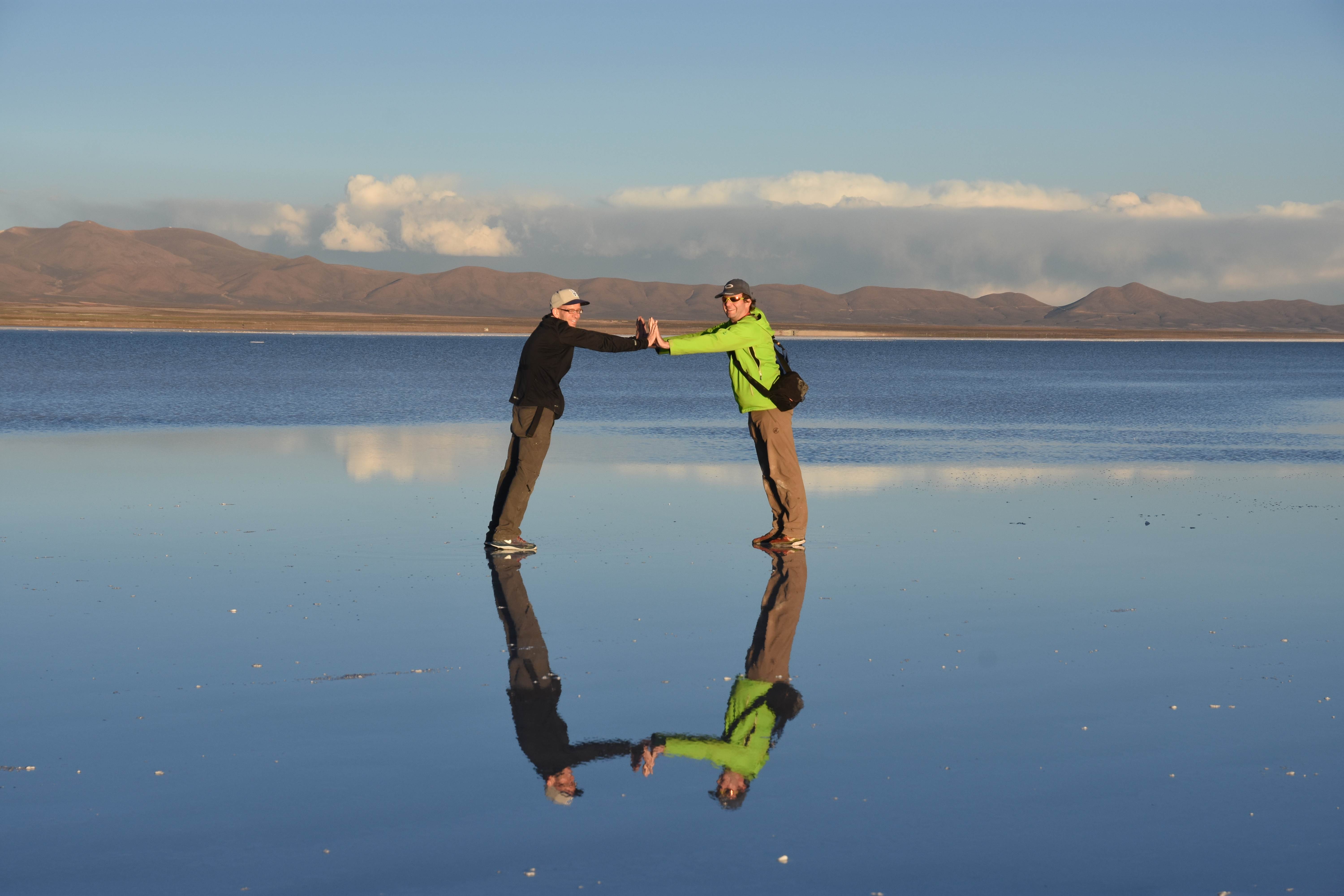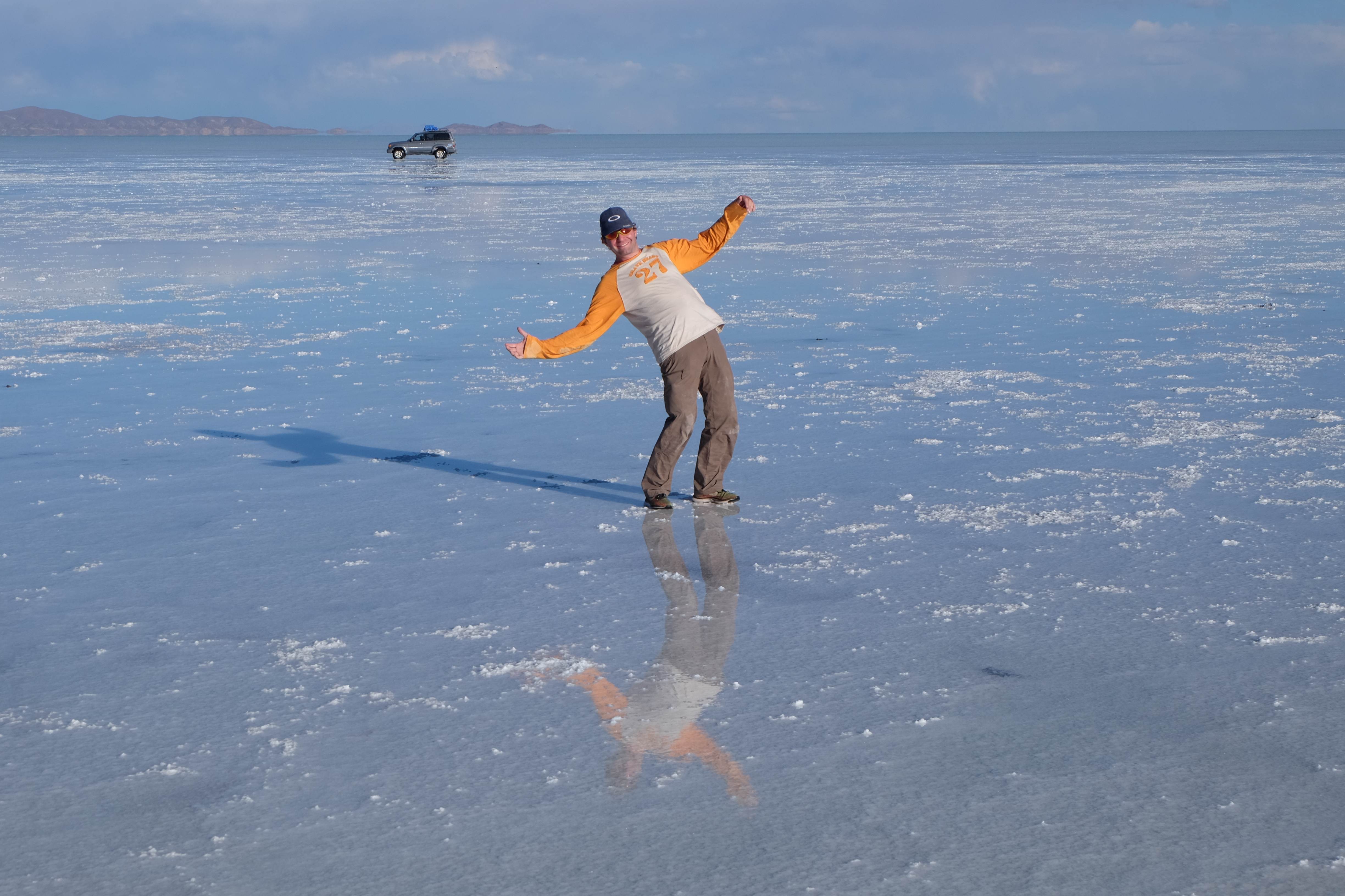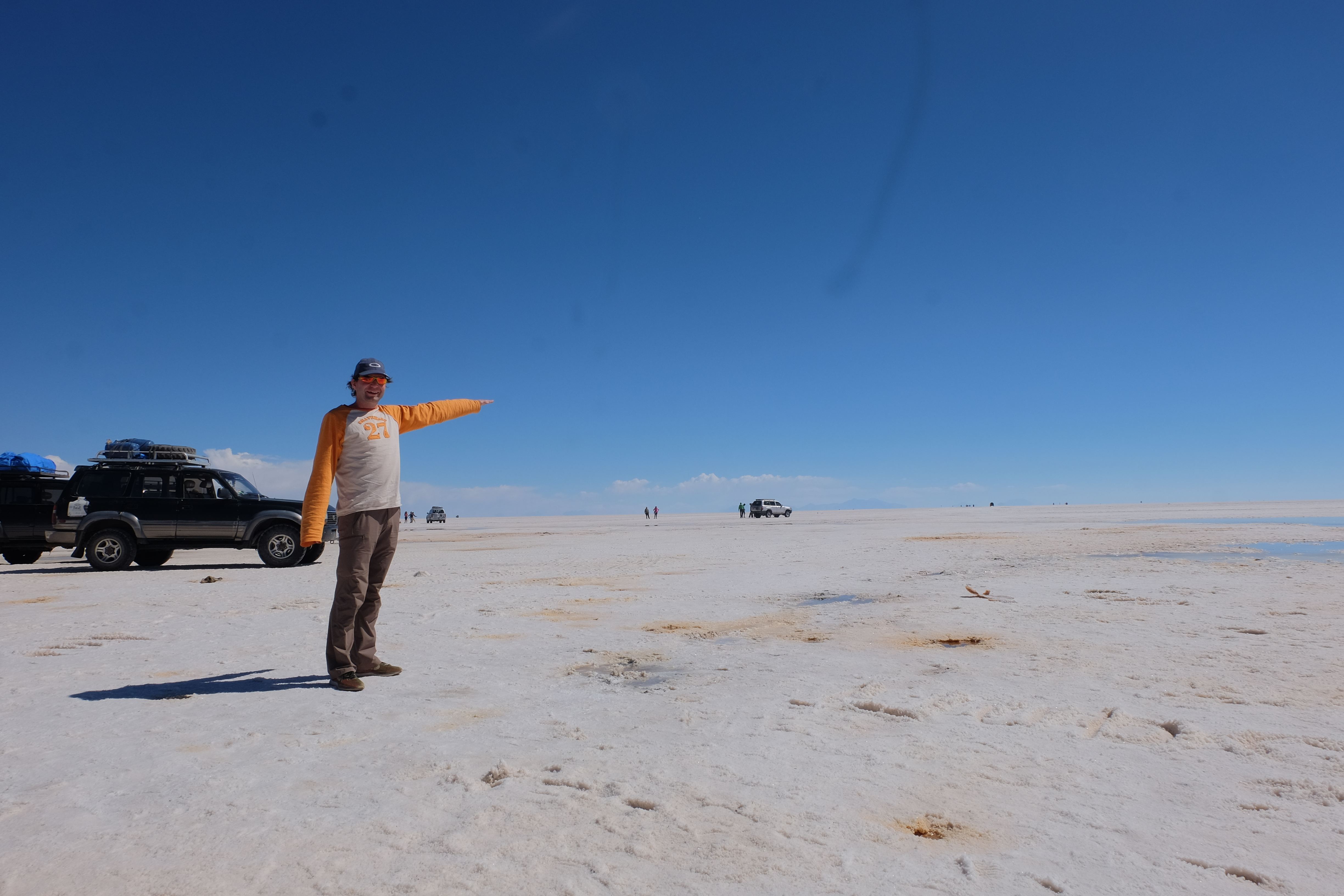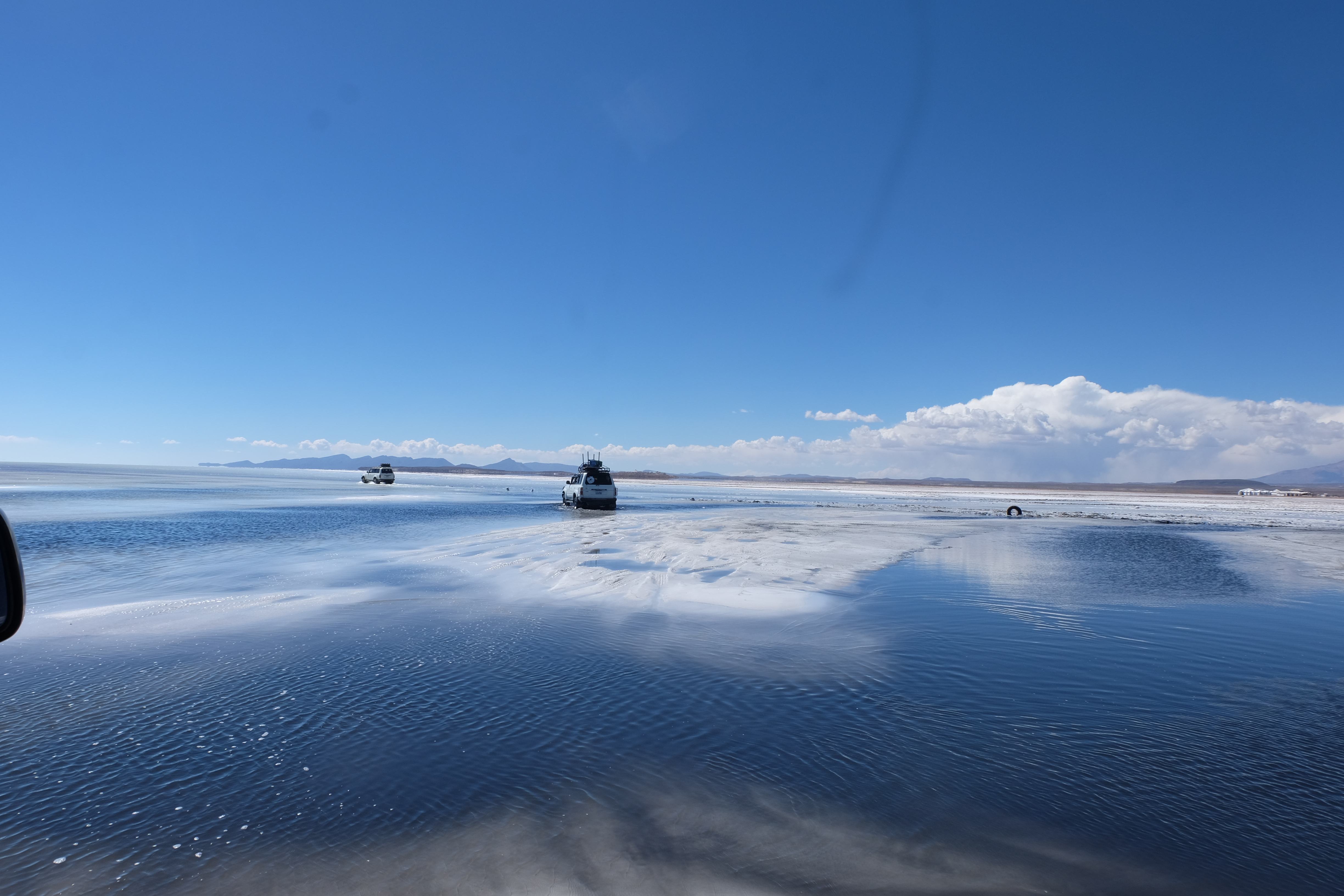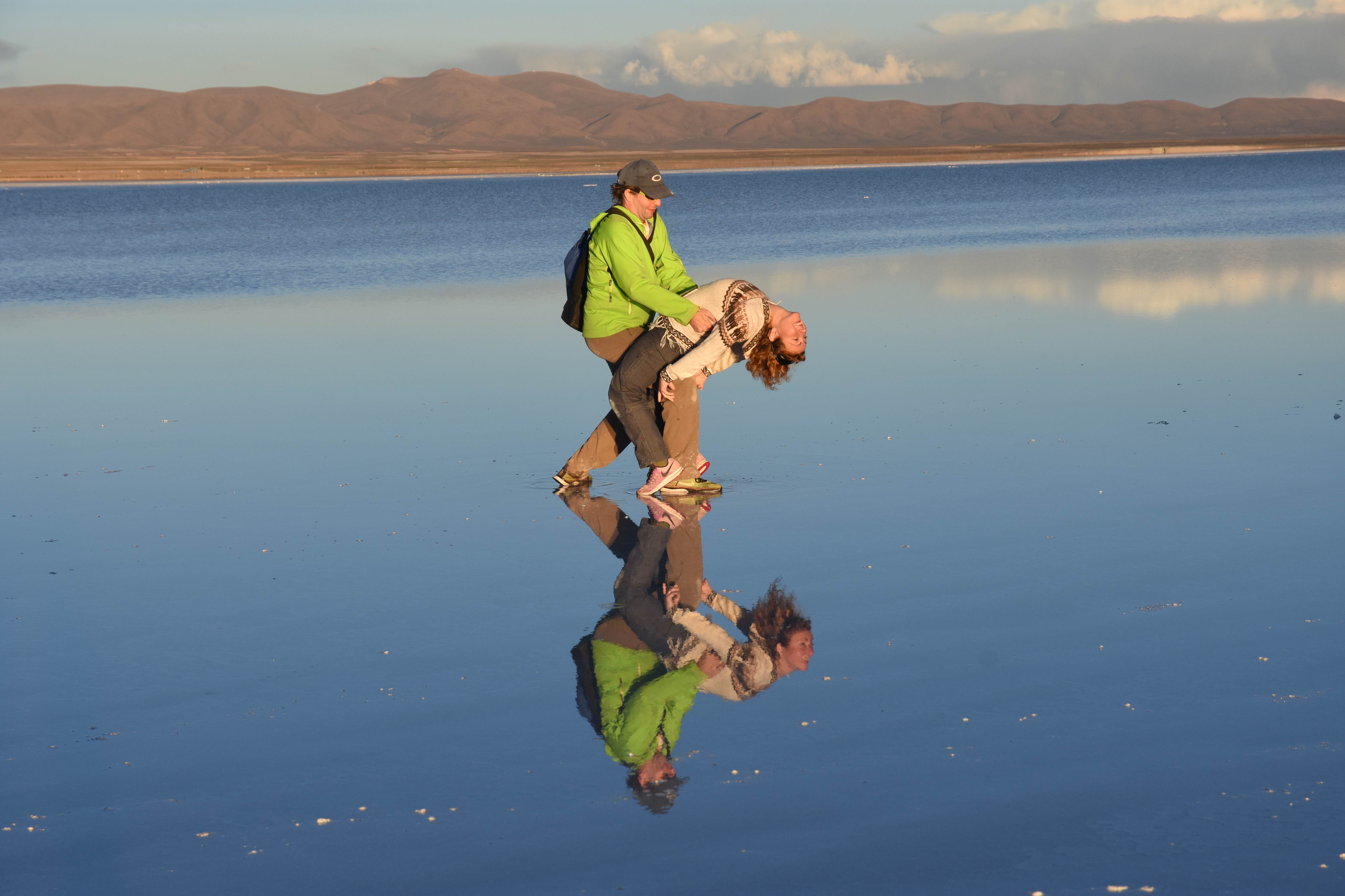 Und wie unsere Erwartungen übertroffen wurden: nach dem Mittagsessen verliessen wir den Planeten Erde und landeten plötzlich in einer unbekannten, aussergewöhnlichen und völlig surrealen Welt: unendliche Weiten an Weiss, Salzkristalle soweit das Auge reichte, Wasseransammlungen, welche die Sonne und die Landschaft spielerisch widerspiegelten, bunte darauf fahrende Fahrzeuge vollgepackt mit sprachlosen Touristen und wir inmitten dieser Wunderwelt. Wie beschreibt man so etwas? Es war, als hätte das Universum plötzlich mal einen Besuch von der Inspirationsmuse erhalten und darauf in schöpferischer Laune war. Da nahm es mal eine Unendlichkeit an Weiss und fing an darauf Wörter und Ideen mit Landschaften, Farben, Klängen, mit Licht und Schatten, ja sogar mit Leere zu dichten. Am Ende war sein Werk vollbracht: da stand ein Salzsee in seiner ganzen Pracht, das Wasser besang ihn tagtäglich, die Sonne leistete ihm Gesellschaft, das Weiss war nicht nur ein leeres Blatt, sondern eine Fülle an Emotionen, Eindrücken, Formen und Gestalten, welche ausserirdisch schienen… dermassen ausserirdisch, dass die Sonne am Ende eines jeden Tages sich diesen Anblick erneut gönnen wollte, so dass sie extra lange da verweilte und es kaum schaffte davon Abschied zu nehmen. Aber was sind Wörter? Die Aussagekraft meiner ist zumindest nichts im Vergleich zu jener der Landschaft selbst. Also macht euch mal selber ein Bild davon, während wir uns entsalzen (wenn jemand noch Salz für seine Grillabende möchte, bitte bei uns melden!) 🙂