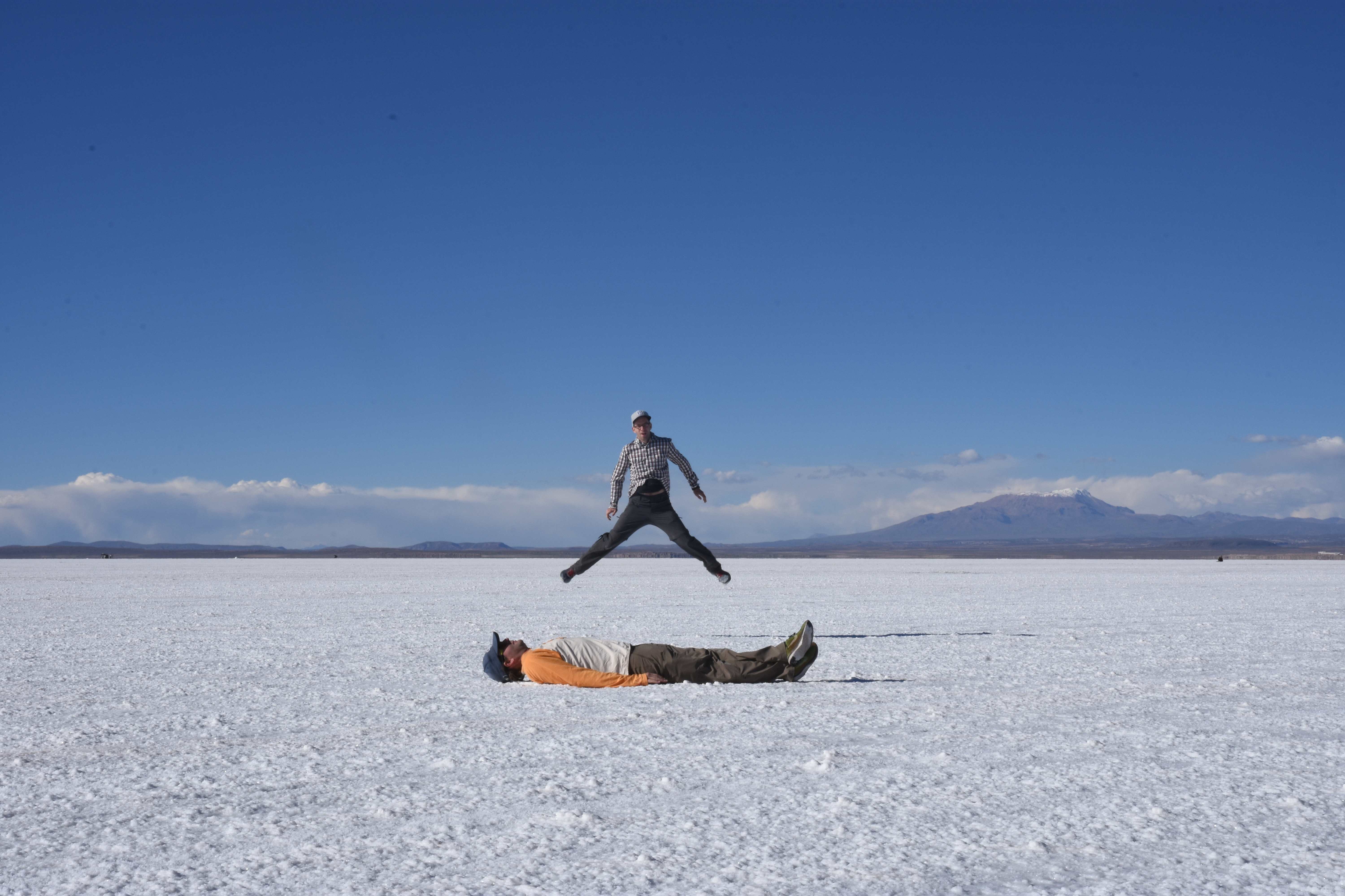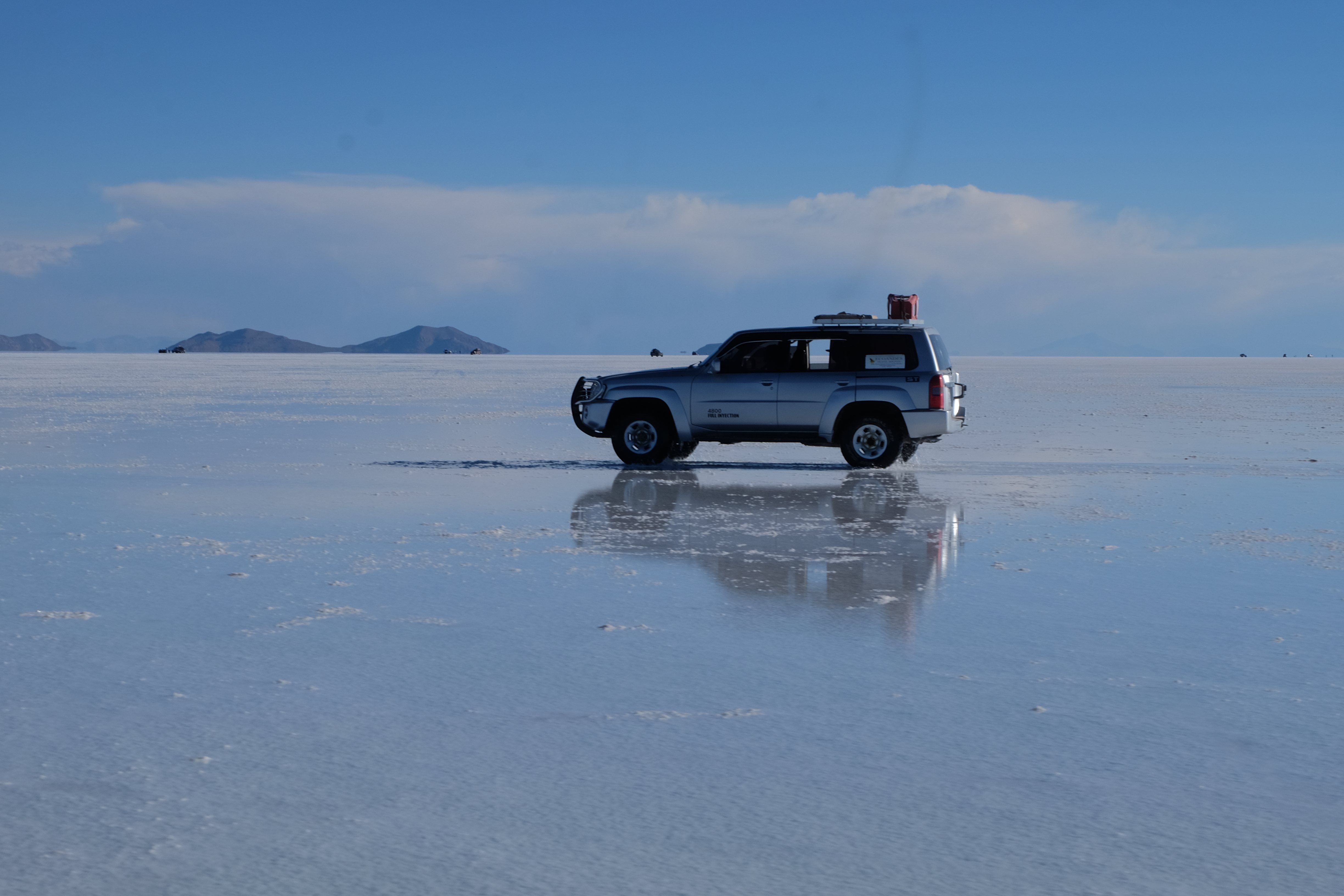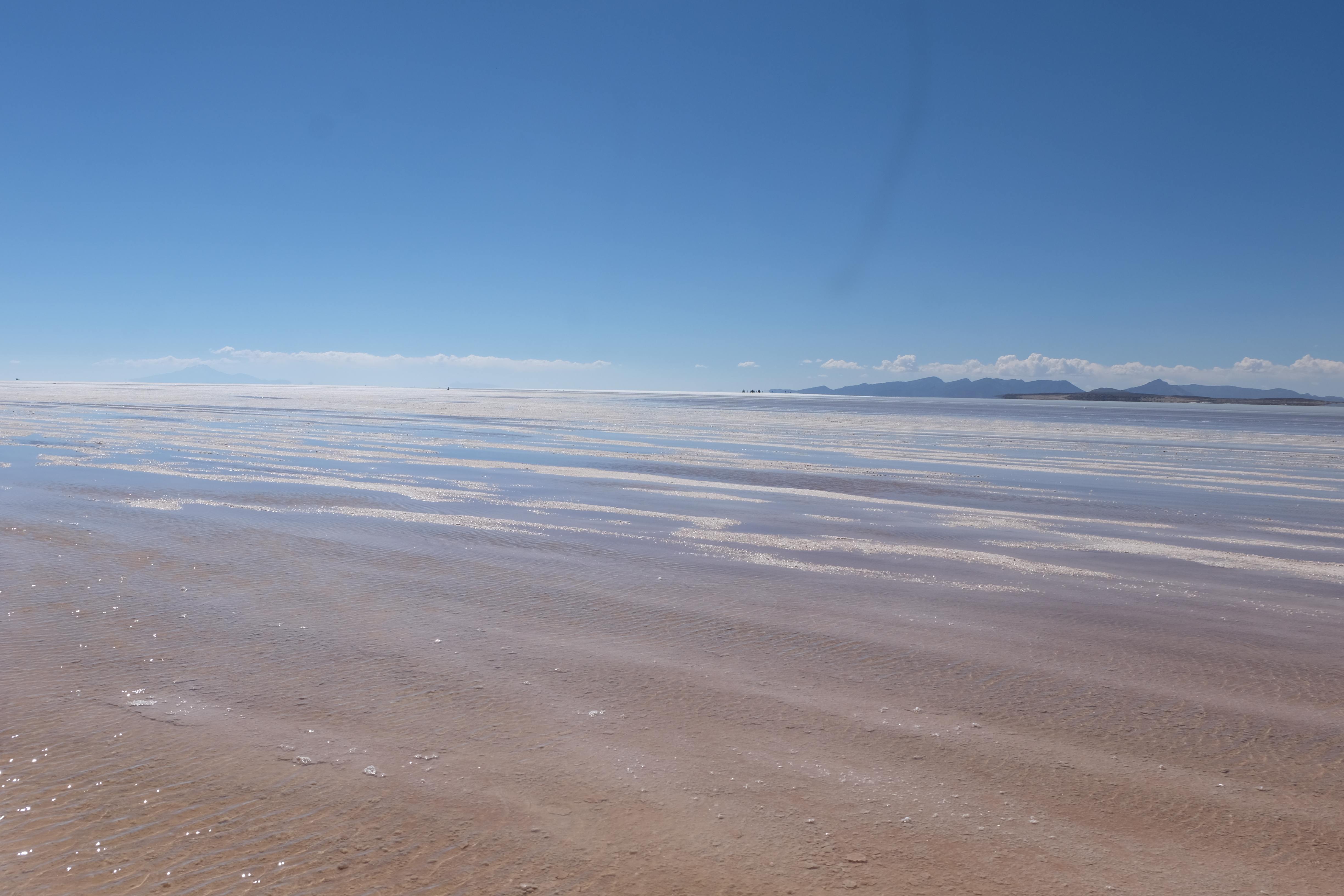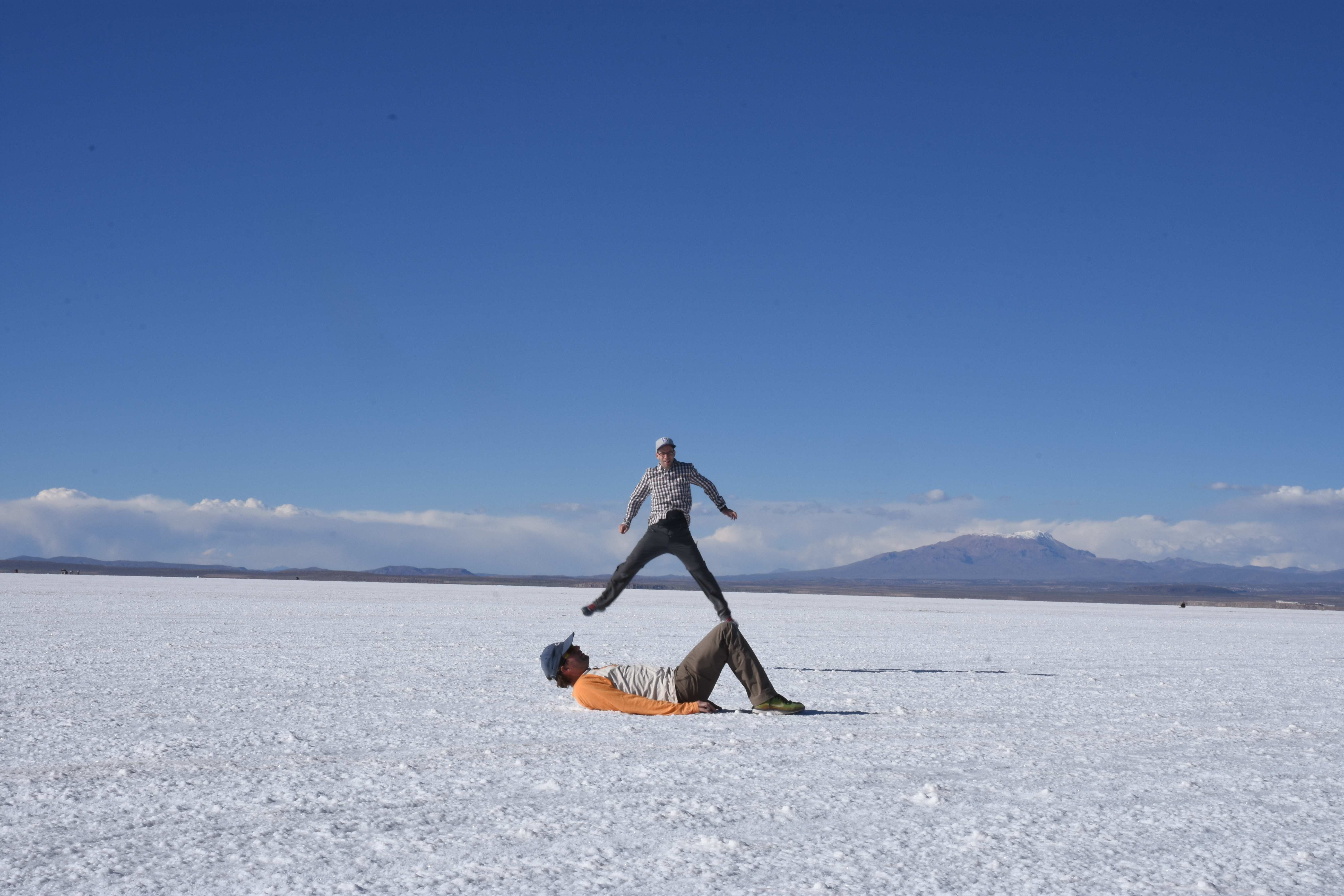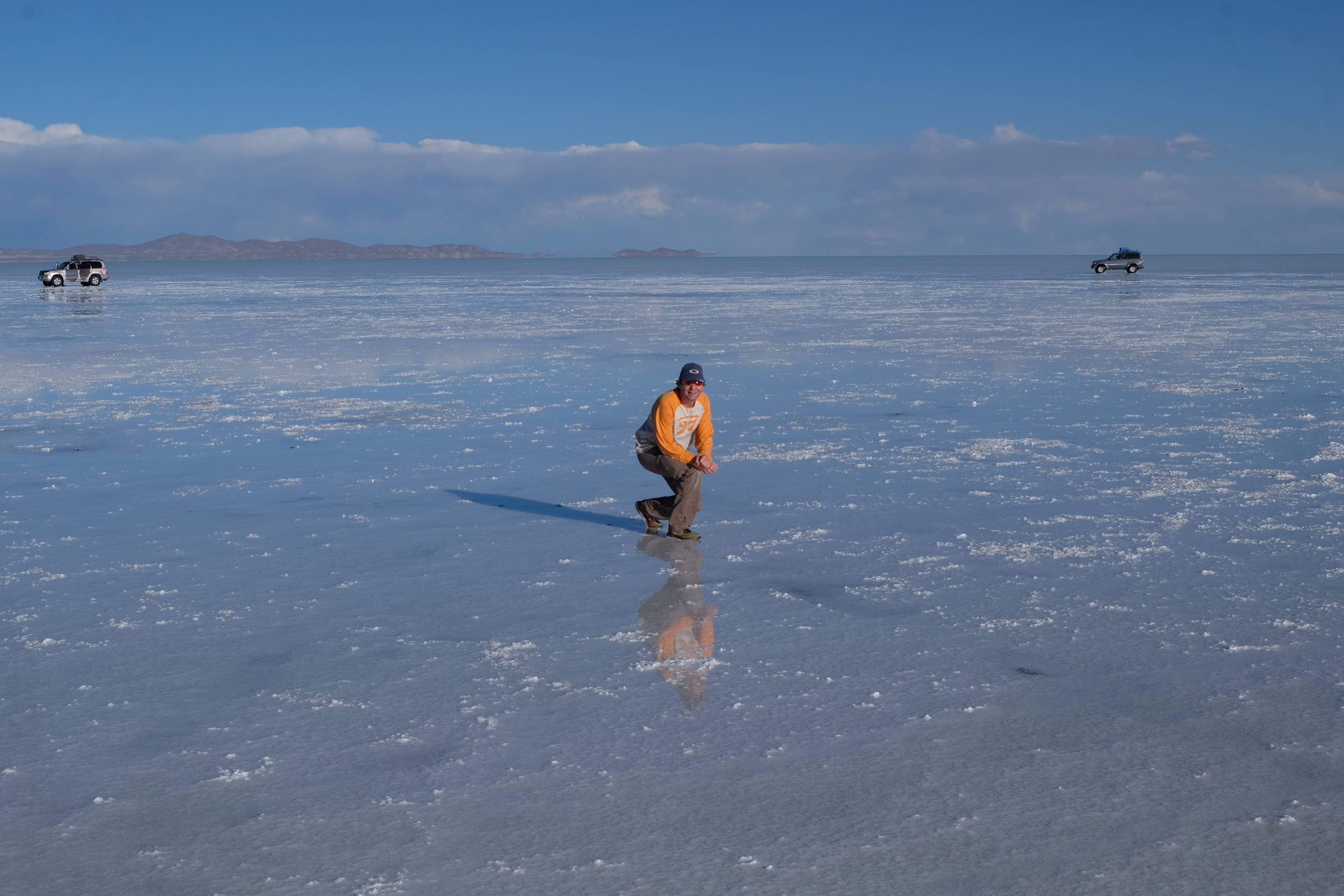 Und wie unsere Erwartungen übertroffen wurden: nach dem Mittagsessen verliessen wir den Planeten Erde und landeten plötzlich in einer unbekannten, aussergewöhnlichen und völlig surrealen Welt: unendliche Weiten an Weiss, Salzkristalle soweit das Auge reichte, Wasseransammlungen, welche die Sonne und die Landschaft spielerisch widerspiegelten, bunte darauf fahrende Fahrzeuge vollgepackt mit sprachlosen Touristen und wir inmitten dieser Wunderwelt. Wie beschreibt man so etwas? Es war, als hätte das Universum plötzlich mal einen Besuch von der Inspirationsmuse erhalten und darauf in schöpferischer Laune war. Da nahm es mal eine Unendlichkeit an Weiss und fing an darauf Wörter und Ideen mit Landschaften, Farben, Klängen, mit Licht und Schatten, ja sogar mit Leere zu dichten. Am Ende war sein Werk vollbracht: da stand ein Salzsee in seiner ganzen Pracht, das Wasser besang ihn tagtäglich, die Sonne leistete ihm Gesellschaft, das Weiss war nicht nur ein leeres Blatt, sondern eine Fülle an Emotionen, Eindrücken, Formen und Gestalten, welche ausserirdisch schienen… dermassen ausserirdisch, dass die Sonne am Ende eines jeden Tages sich diesen Anblick erneut gönnen wollte, so dass sie extra lange da verweilte und es kaum schaffte davon Abschied zu nehmen. Aber was sind Wörter? Die Aussagekraft meiner ist zumindest nichts im Vergleich zu jener der Landschaft selbst. Also macht euch mal selber ein Bild davon, während wir uns entsalzen (wenn jemand noch Salz für seine Grillabende möchte, bitte bei uns melden!) 🙂
