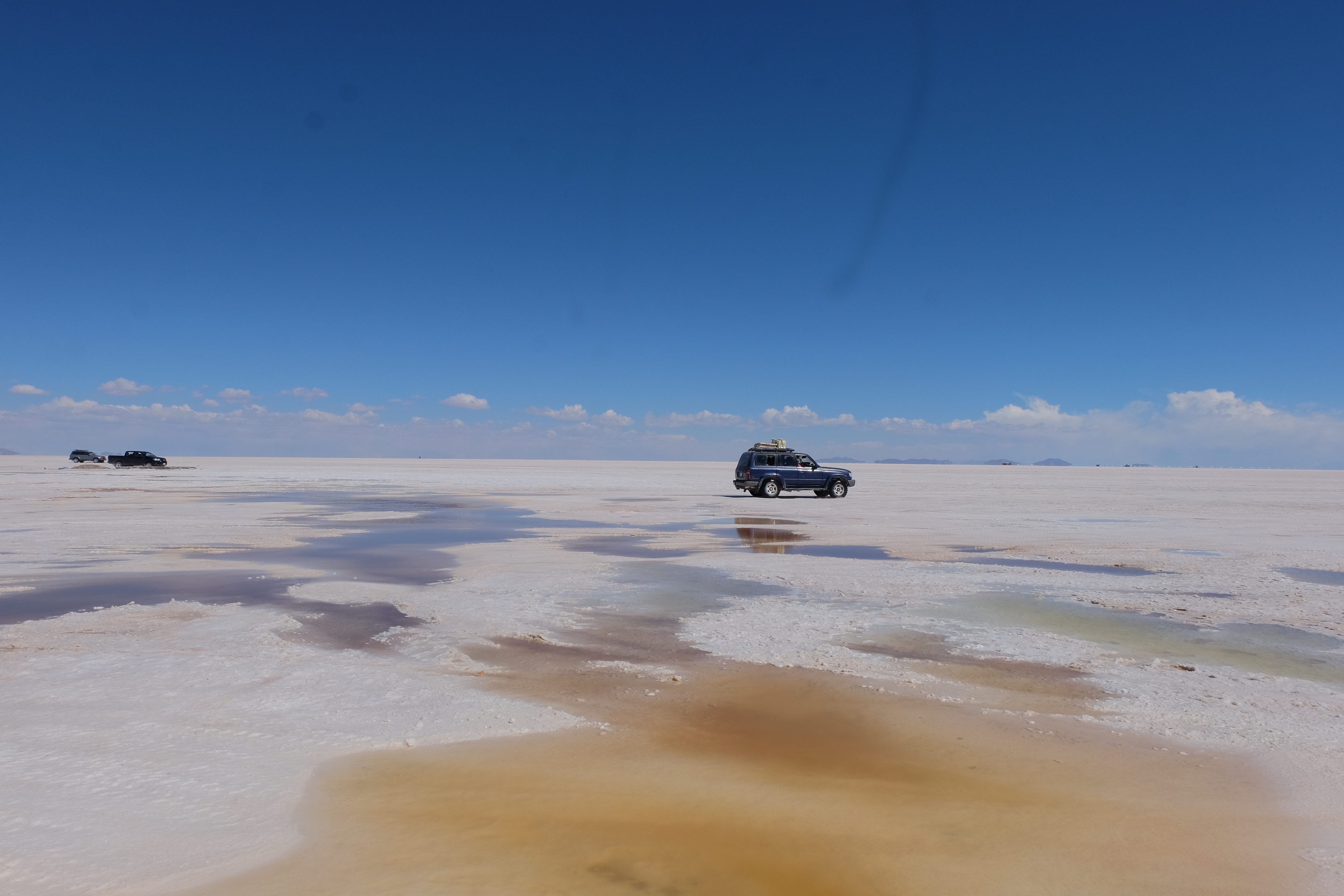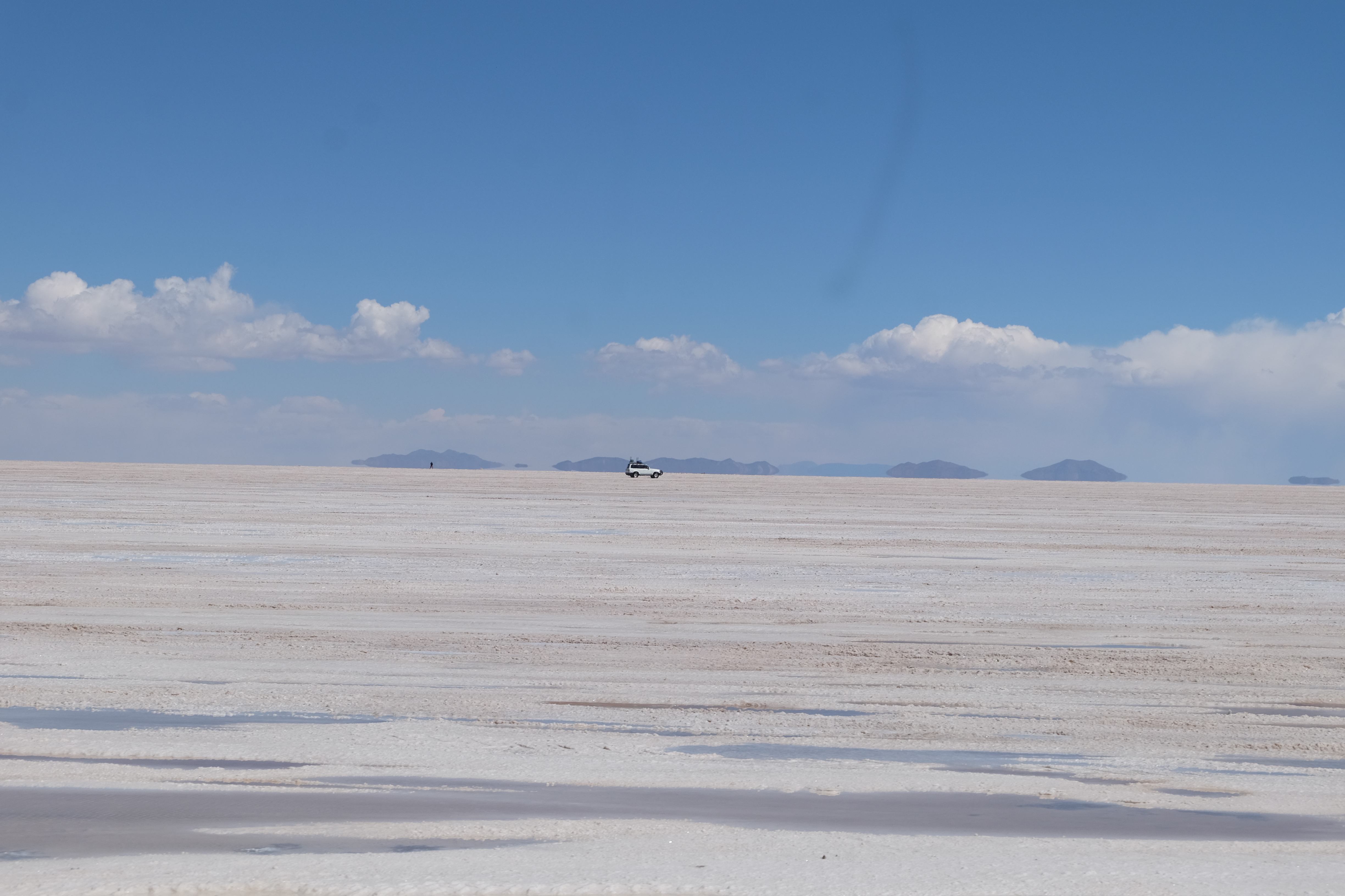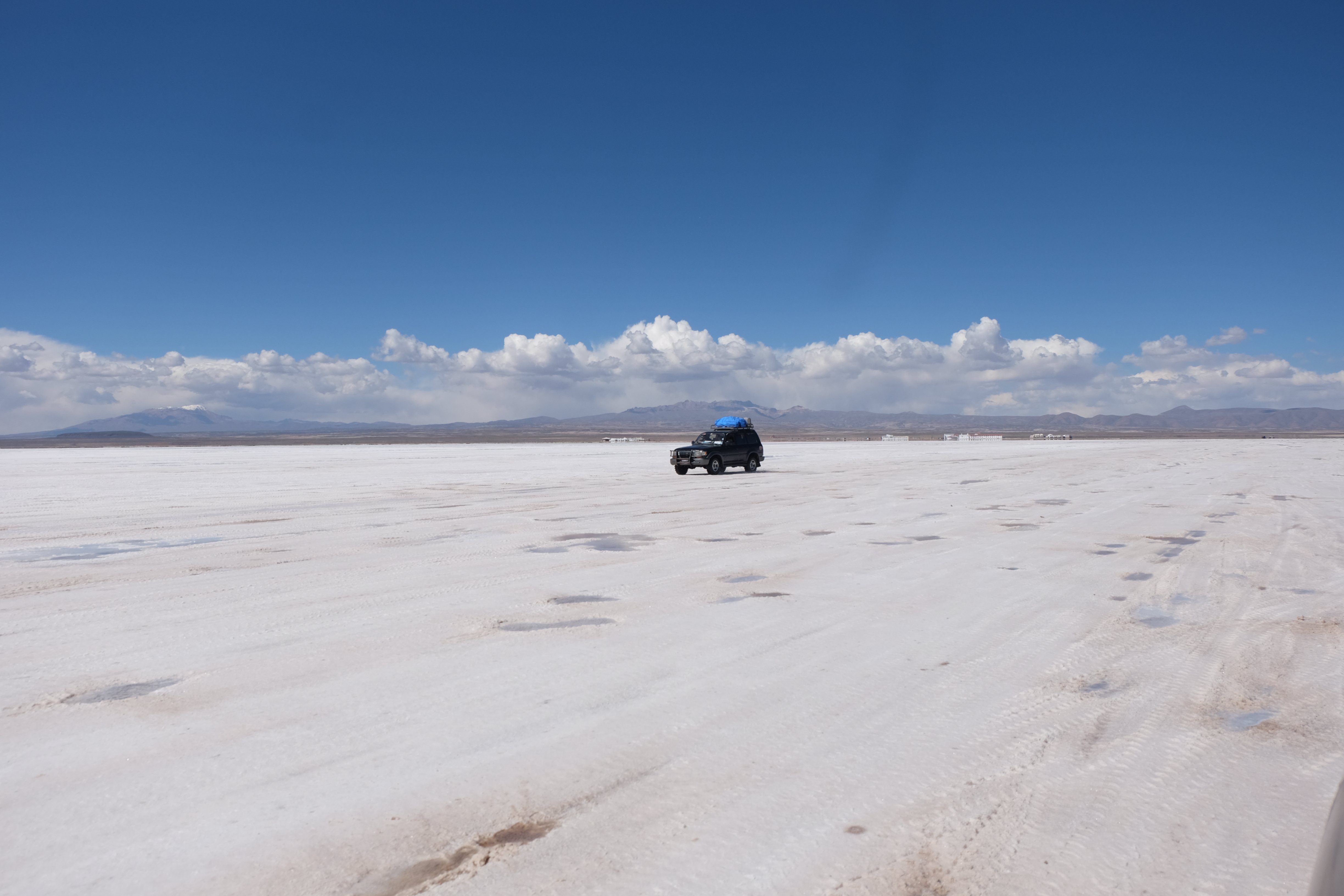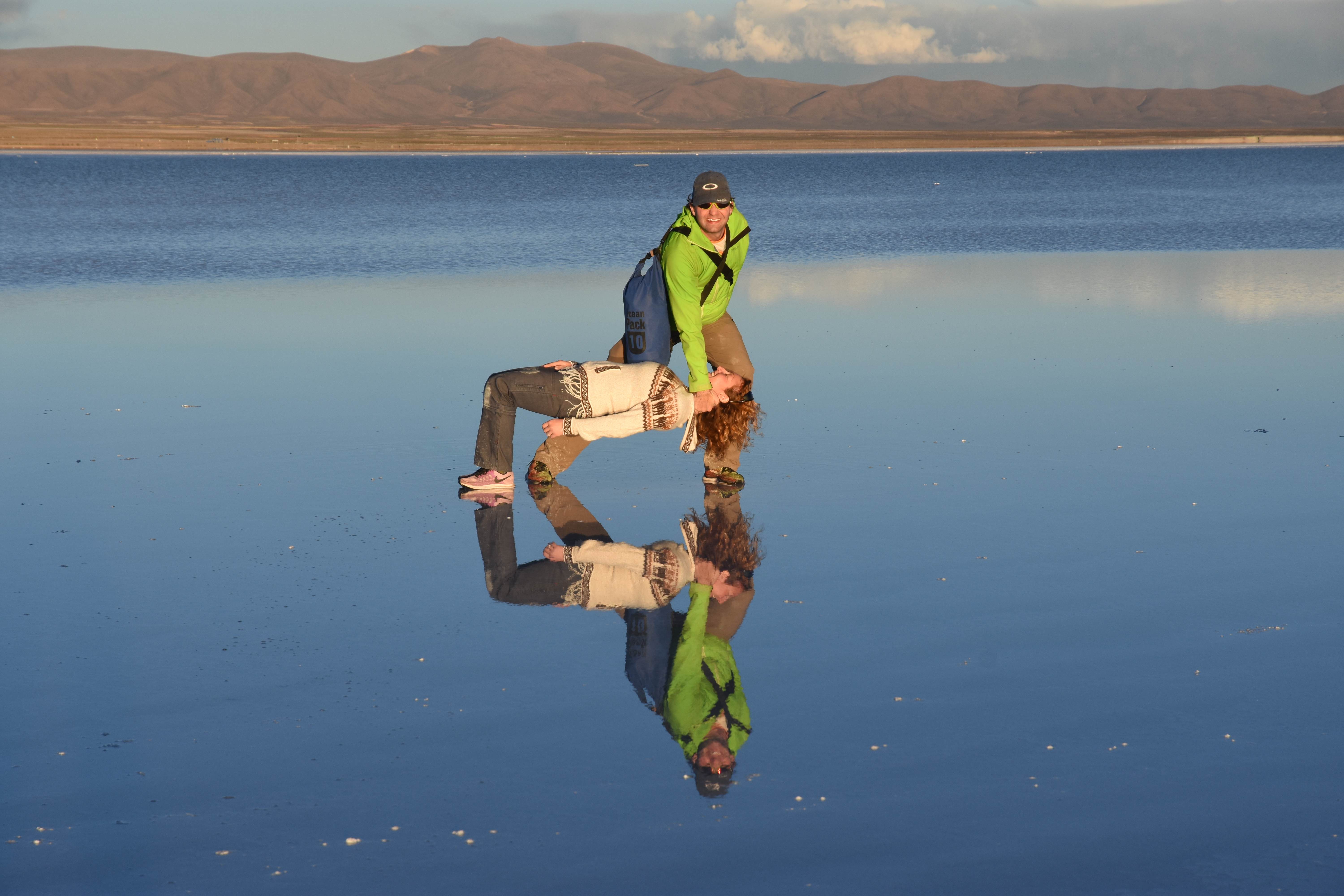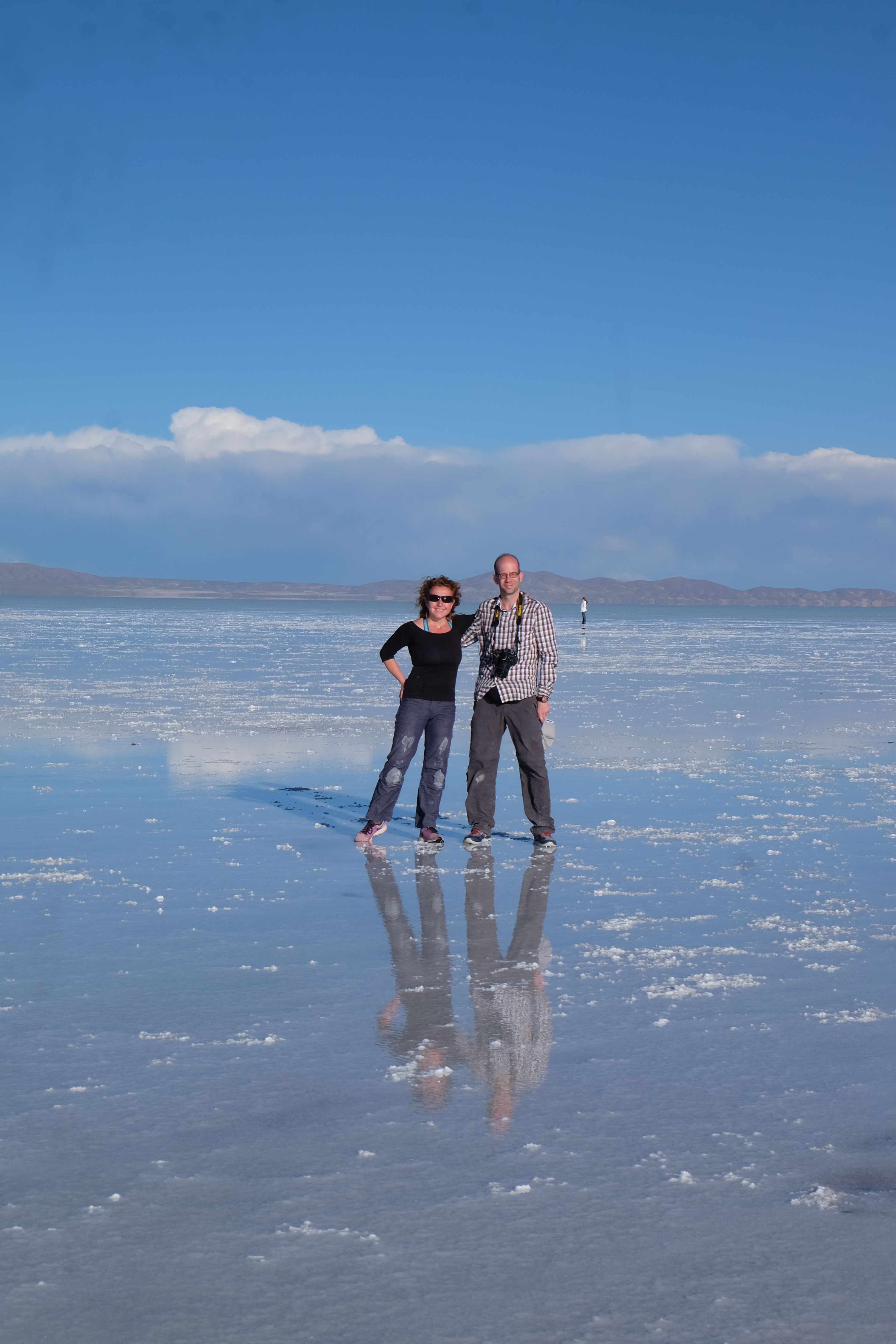 Und wie unsere Erwartungen übertroffen wurden: nach dem Mittagsessen verliessen wir den Planeten Erde und landeten plötzlich in einer unbekannten, aussergewöhnlichen und völlig surrealen Welt: unendliche Weiten an Weiss, Salzkristalle soweit das Auge reichte, Wasseransammlungen, welche die Sonne und die Landschaft spielerisch widerspiegelten, bunte darauf fahrende Fahrzeuge vollgepackt mit sprachlosen Touristen und wir inmitten dieser Wunderwelt. Wie beschreibt man so etwas? Es war, als hätte das Universum plötzlich mal einen Besuch von der Inspirationsmuse erhalten und darauf in schöpferischer Laune war. Da nahm es mal eine Unendlichkeit an Weiss und fing an darauf Wörter und Ideen mit Landschaften, Farben, Klängen, mit Licht und Schatten, ja sogar mit Leere zu dichten. Am Ende war sein Werk vollbracht: da stand ein Salzsee in seiner ganzen Pracht, das Wasser besang ihn tagtäglich, die Sonne leistete ihm Gesellschaft, das Weiss war nicht nur ein leeres Blatt, sondern eine Fülle an Emotionen, Eindrücken, Formen und Gestalten, welche ausserirdisch schienen… dermassen ausserirdisch, dass die Sonne am Ende eines jeden Tages sich diesen Anblick erneut gönnen wollte, so dass sie extra lange da verweilte und es kaum schaffte davon Abschied zu nehmen. Aber was sind Wörter? Die Aussagekraft meiner ist zumindest nichts im Vergleich zu jener der Landschaft selbst. Also macht euch mal selber ein Bild davon, während wir uns entsalzen (wenn jemand noch Salz für seine Grillabende möchte, bitte bei uns melden!) 🙂