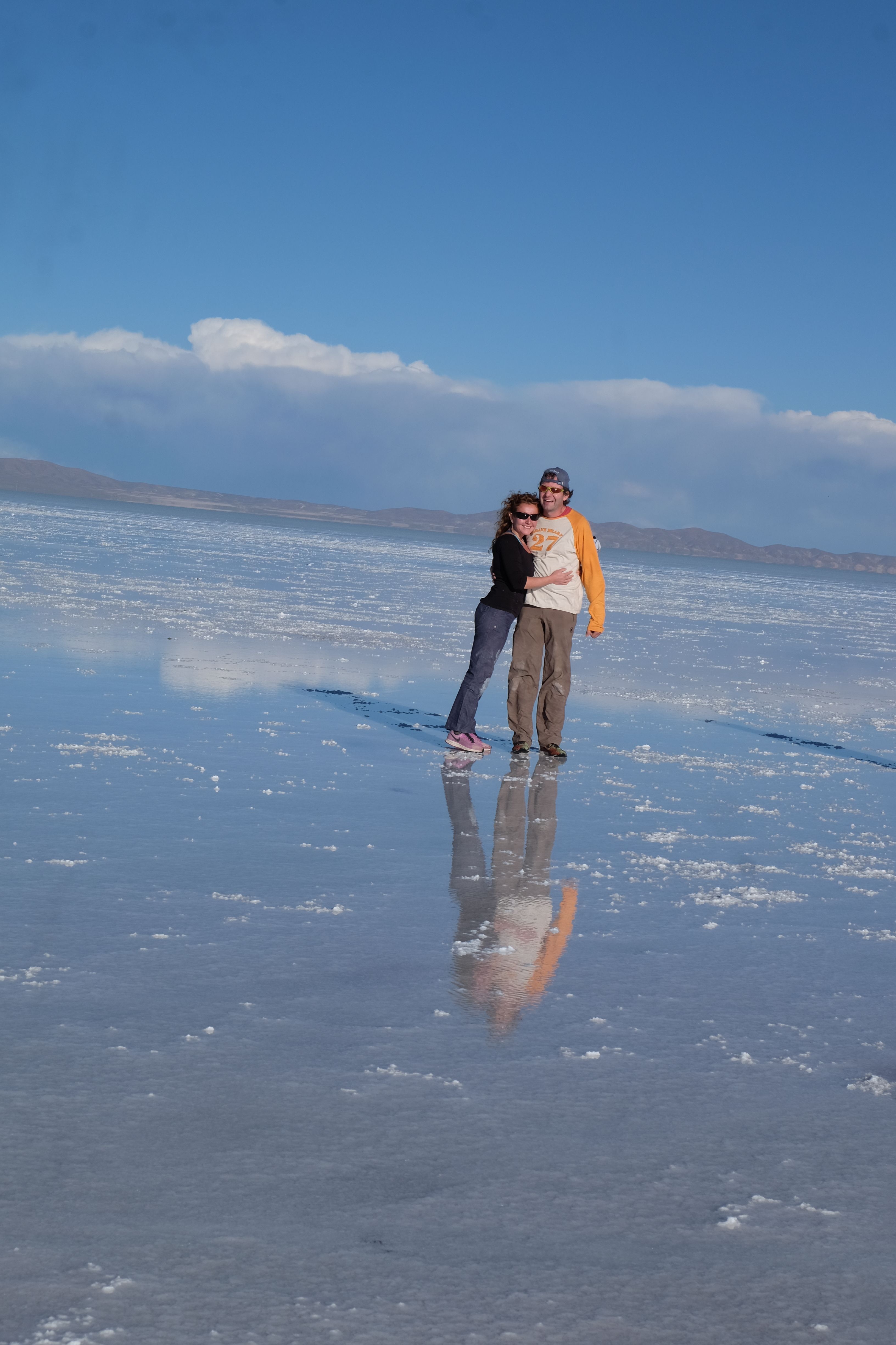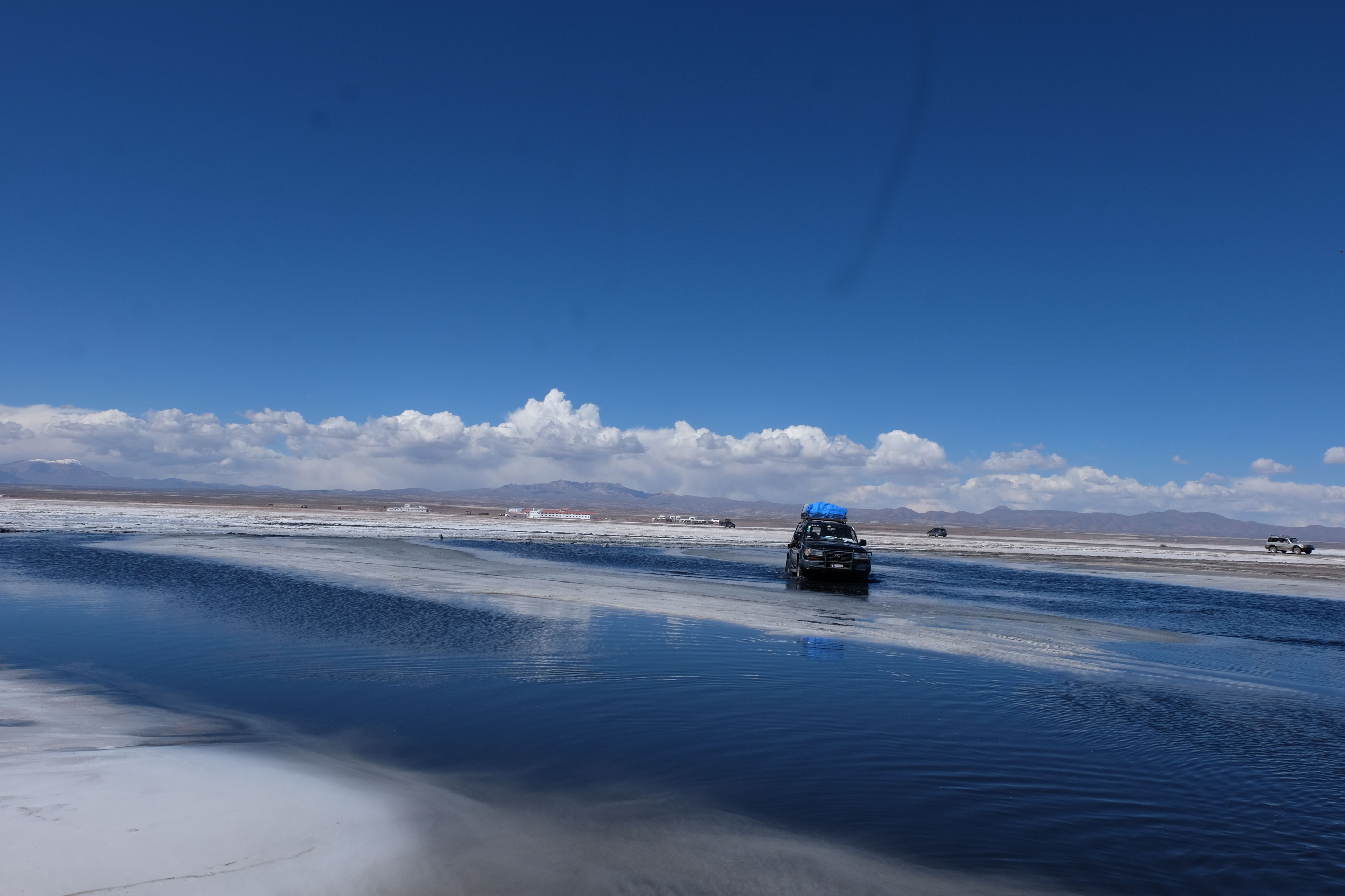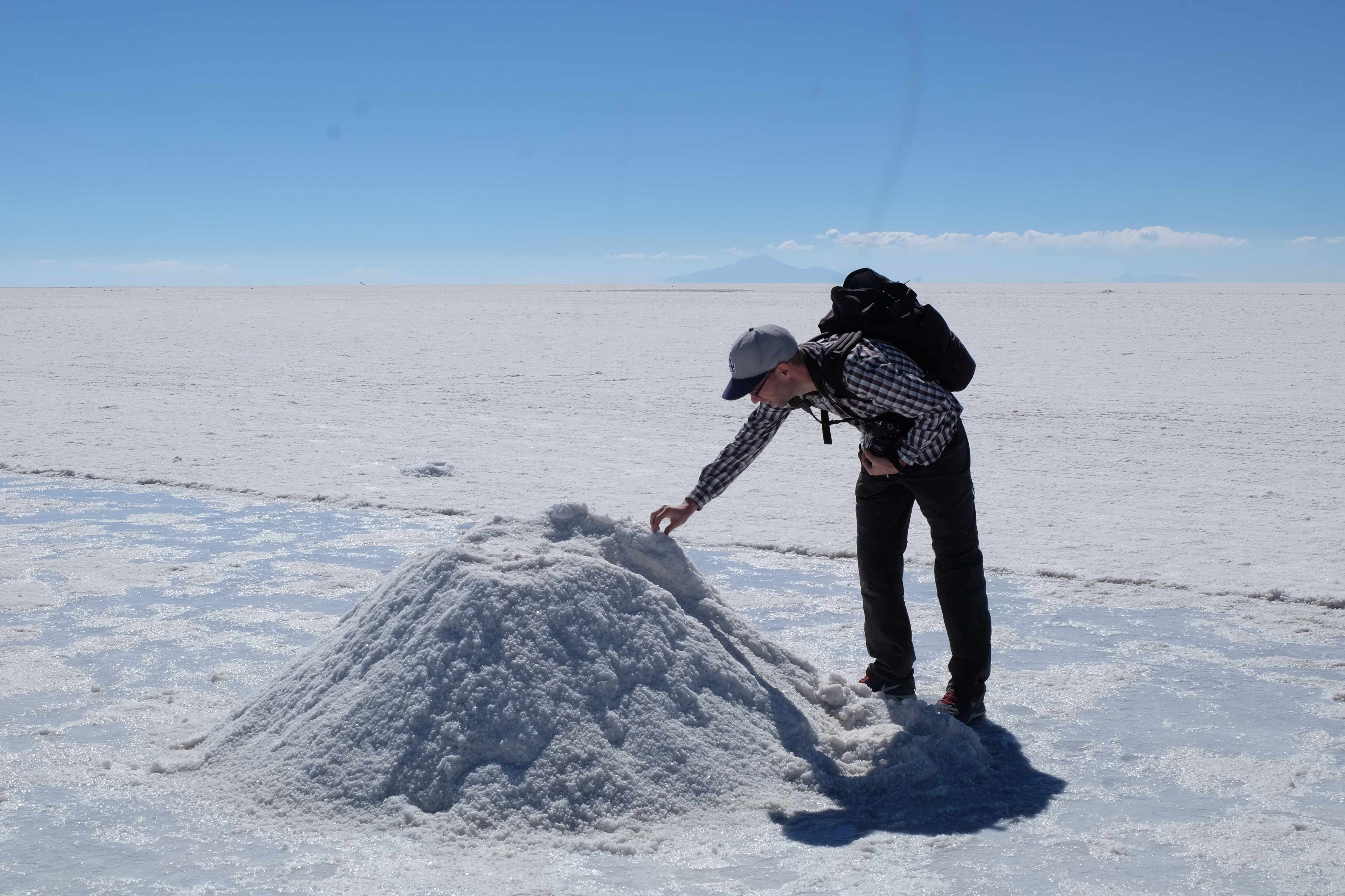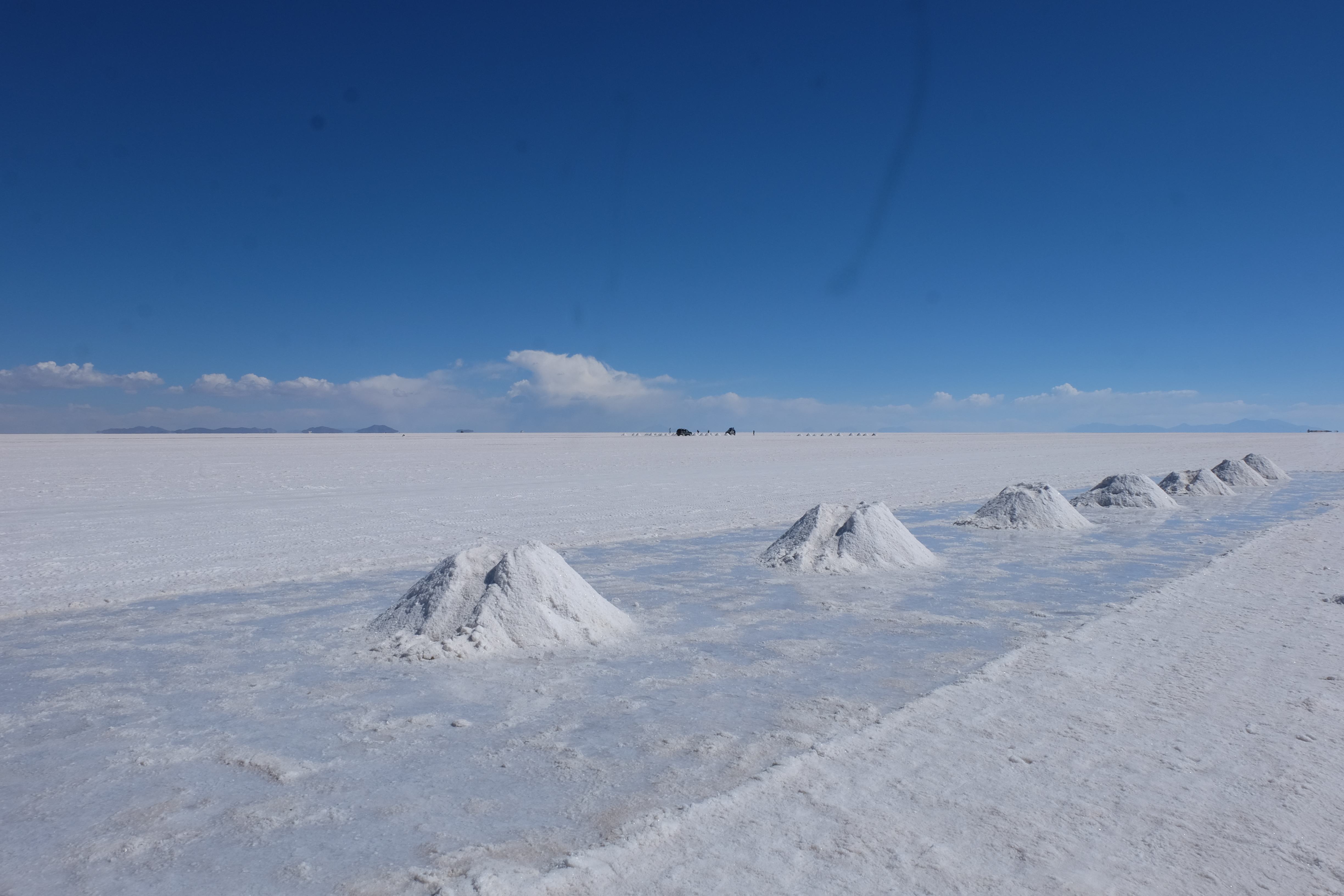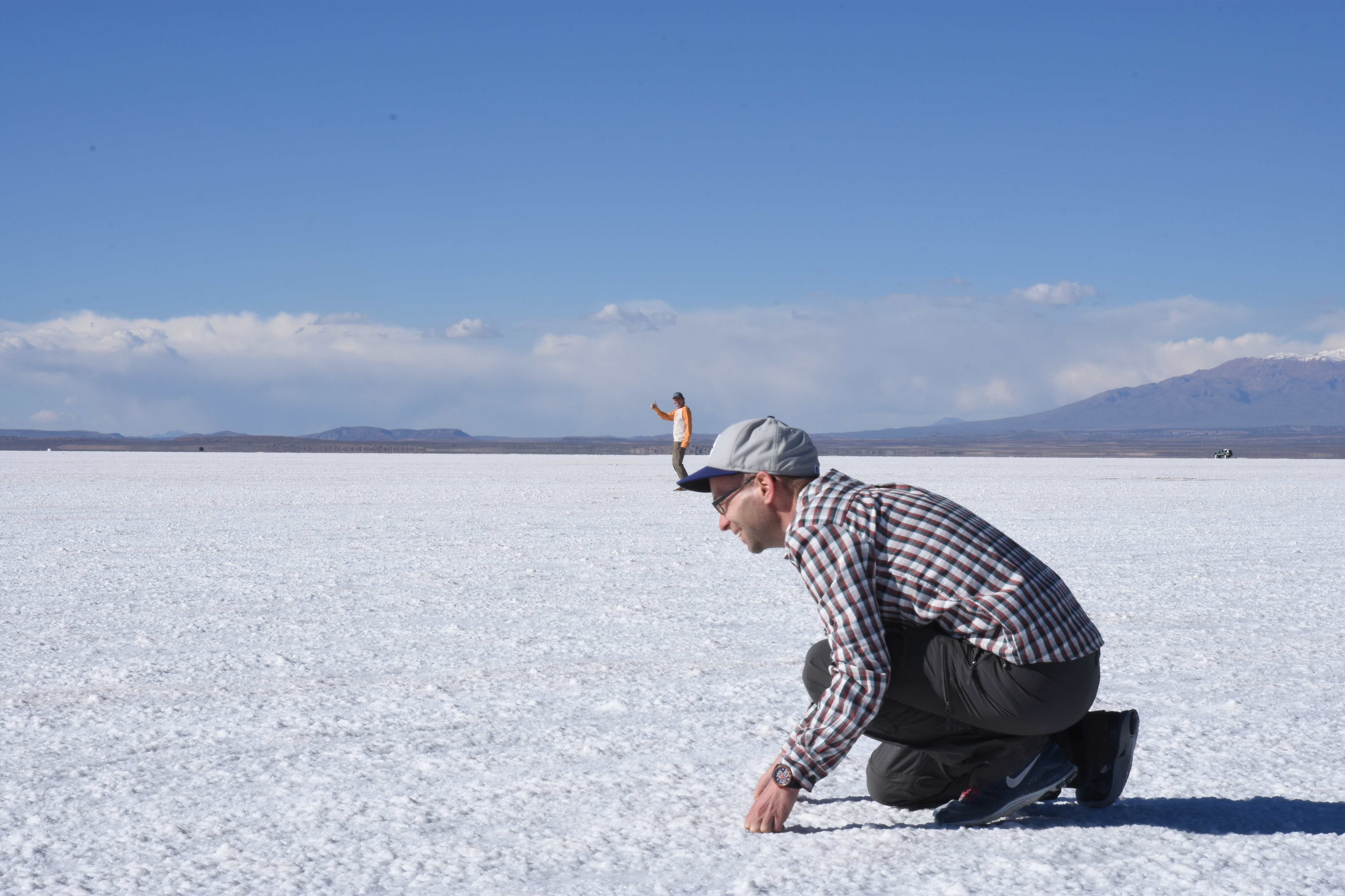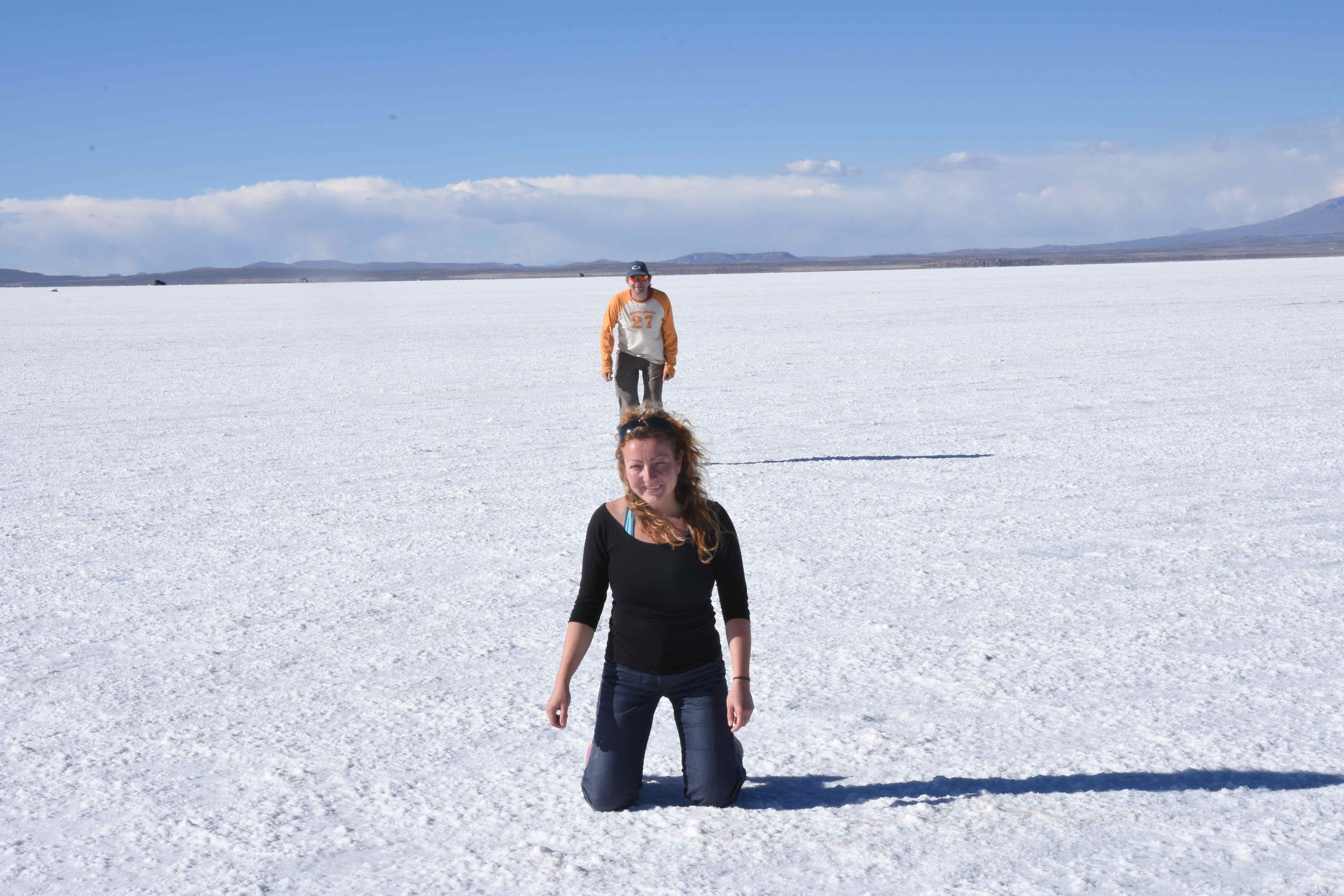 Und wie unsere Erwartungen übertroffen wurden: nach dem Mittagsessen verliessen wir den Planeten Erde und landeten plötzlich in einer unbekannten, aussergewöhnlichen und völlig surrealen Welt: unendliche Weiten an Weiss, Salzkristalle soweit das Auge reichte, Wasseransammlungen, welche die Sonne und die Landschaft spielerisch widerspiegelten, bunte darauf fahrende Fahrzeuge vollgepackt mit sprachlosen Touristen und wir inmitten dieser Wunderwelt. Wie beschreibt man so etwas? Es war, als hätte das Universum plötzlich mal einen Besuch von der Inspirationsmuse erhalten und darauf in schöpferischer Laune war. Da nahm es mal eine Unendlichkeit an Weiss und fing an darauf Wörter und Ideen mit Landschaften, Farben, Klängen, mit Licht und Schatten, ja sogar mit Leere zu dichten. Am Ende war sein Werk vollbracht: da stand ein Salzsee in seiner ganzen Pracht, das Wasser besang ihn tagtäglich, die Sonne leistete ihm Gesellschaft, das Weiss war nicht nur ein leeres Blatt, sondern eine Fülle an Emotionen, Eindrücken, Formen und Gestalten, welche ausserirdisch schienen… dermassen ausserirdisch, dass die Sonne am Ende eines jeden Tages sich diesen Anblick erneut gönnen wollte, so dass sie extra lange da verweilte und es kaum schaffte davon Abschied zu nehmen. Aber was sind Wörter? Die Aussagekraft meiner ist zumindest nichts im Vergleich zu jener der Landschaft selbst. Also macht euch mal selber ein Bild davon, während wir uns entsalzen (wenn jemand noch Salz für seine Grillabende möchte, bitte bei uns melden!) 🙂