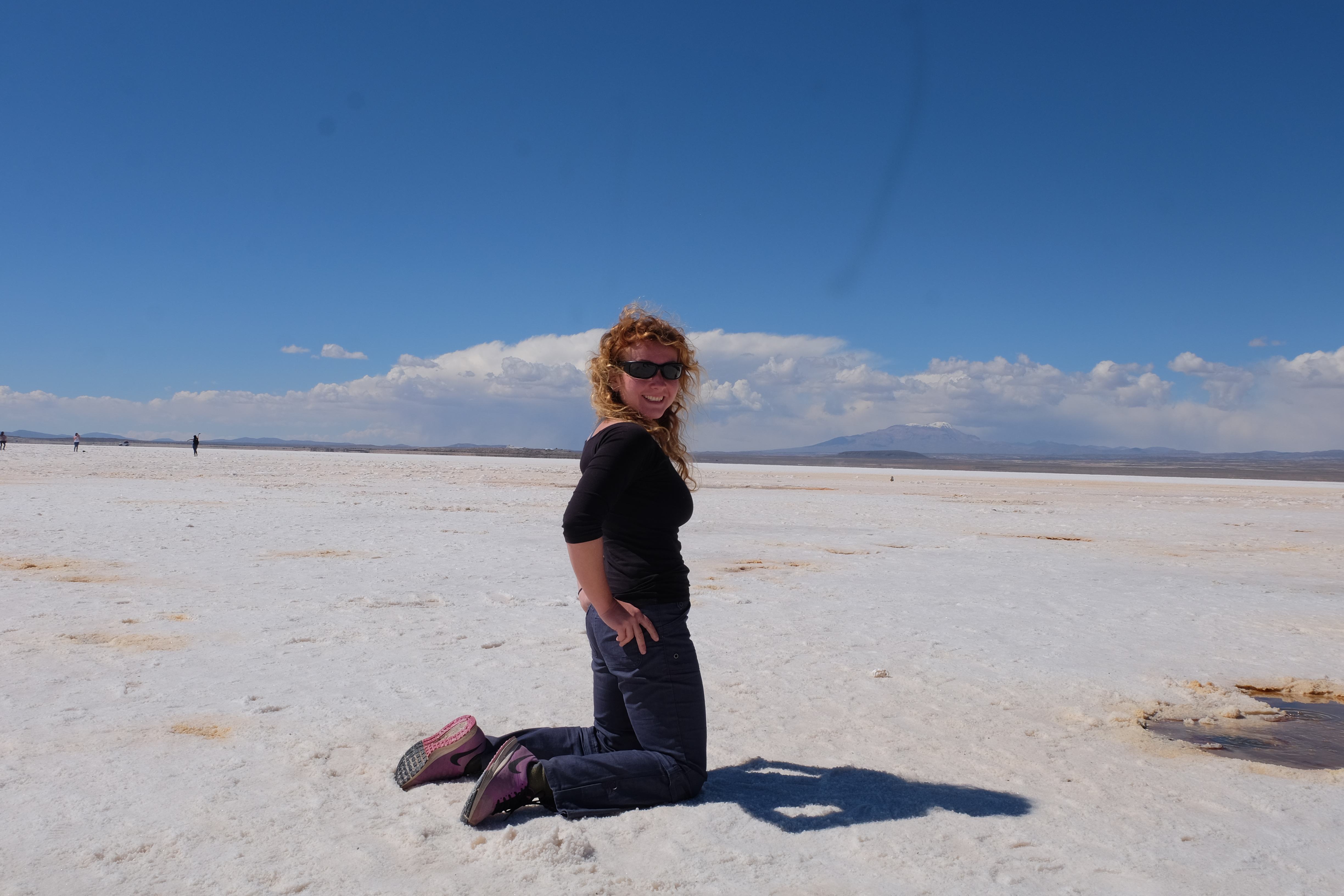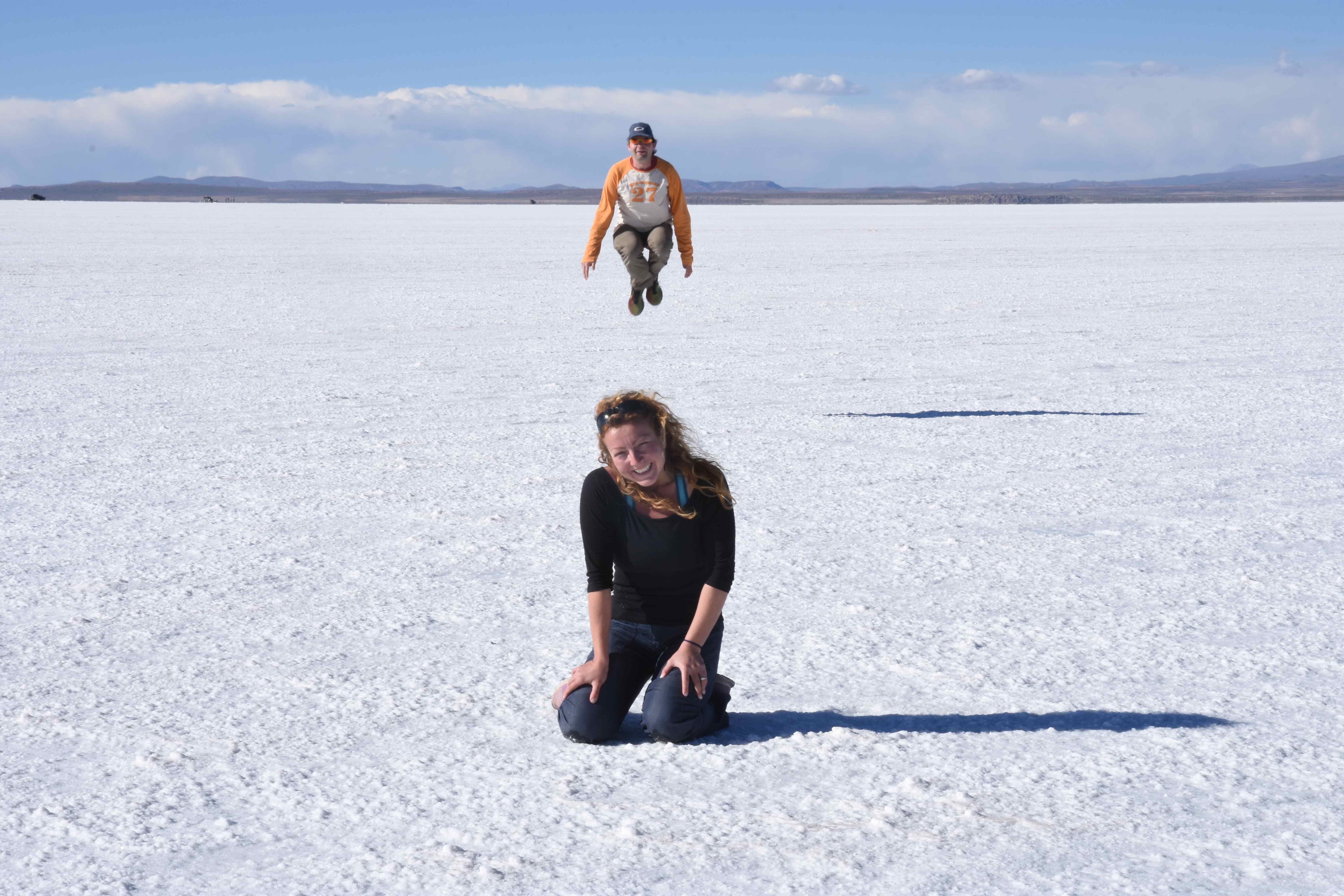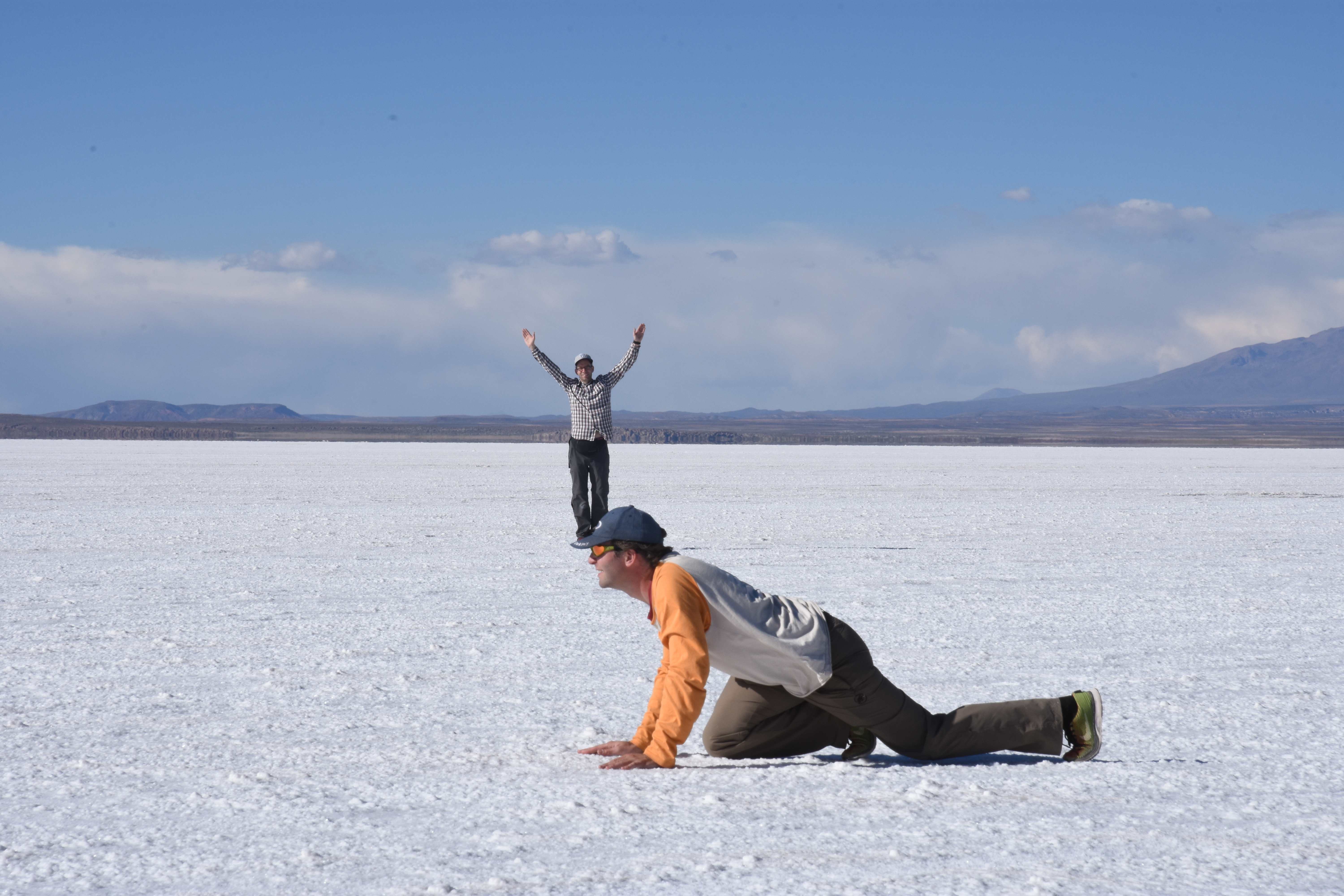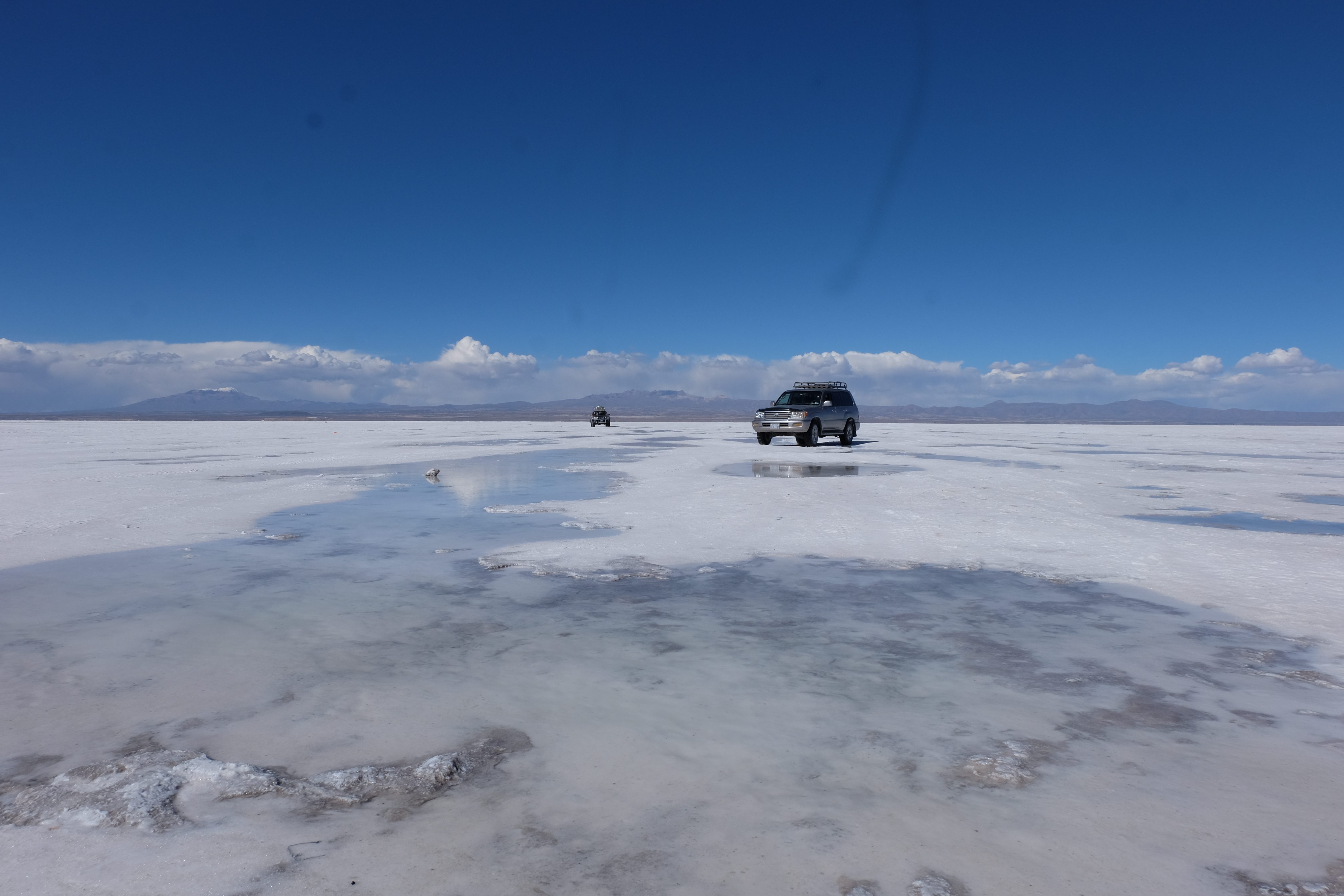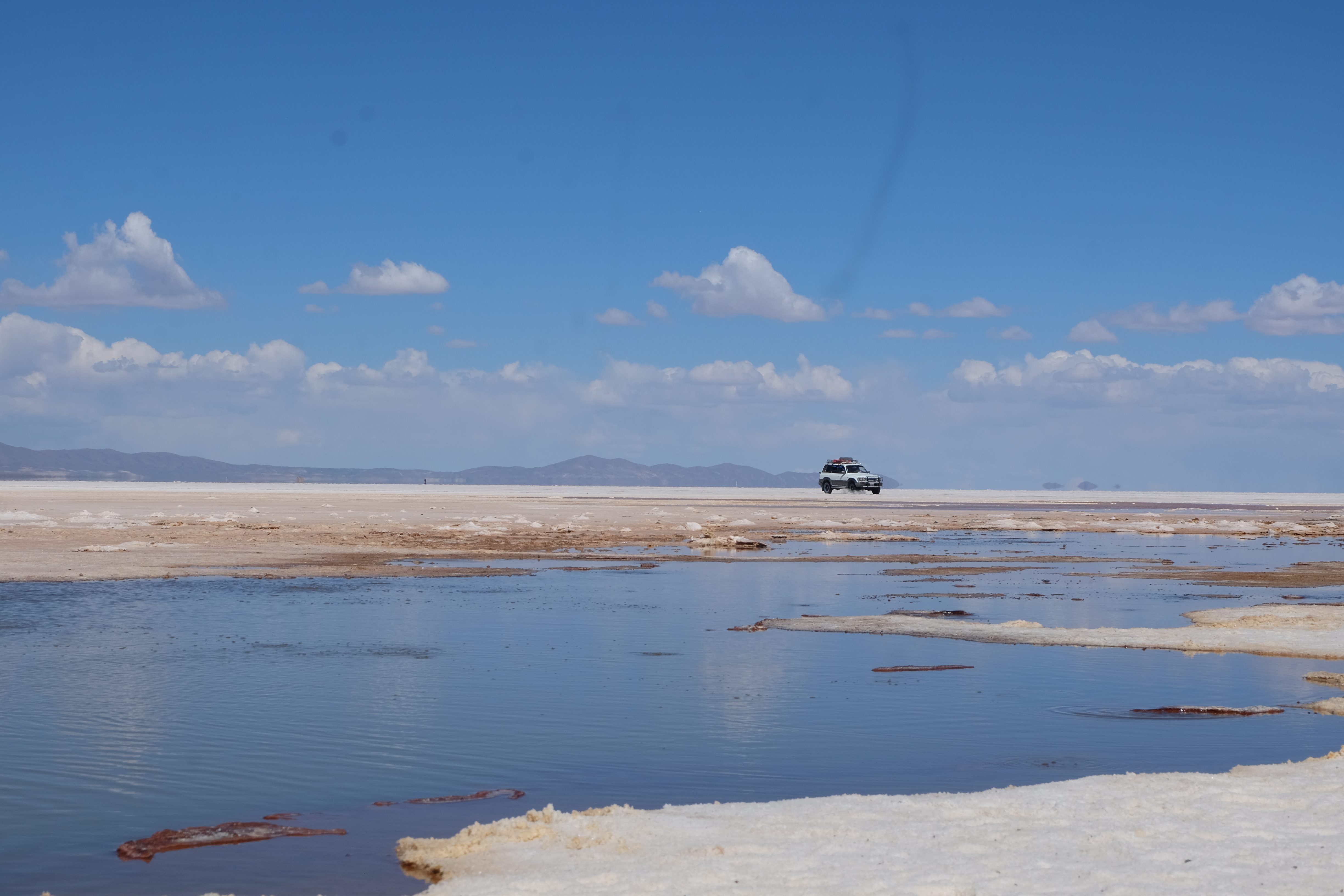 Und wie unsere Erwartungen übertroffen wurden: nach dem Mittagsessen verliessen wir den Planeten Erde und landeten plötzlich in einer unbekannten, aussergewöhnlichen und völlig surrealen Welt: unendliche Weiten an Weiss, Salzkristalle soweit das Auge reichte, Wasseransammlungen, welche die Sonne und die Landschaft spielerisch widerspiegelten, bunte darauf fahrende Fahrzeuge vollgepackt mit sprachlosen Touristen und wir inmitten dieser Wunderwelt. Wie beschreibt man so etwas? Es war, als hätte das Universum plötzlich mal einen Besuch von der Inspirationsmuse erhalten und darauf in schöpferischer Laune war. Da nahm es mal eine Unendlichkeit an Weiss und fing an darauf Wörter und Ideen mit Landschaften, Farben, Klängen, mit Licht und Schatten, ja sogar mit Leere zu dichten. Am Ende war sein Werk vollbracht: da stand ein Salzsee in seiner ganzen Pracht, das Wasser besang ihn tagtäglich, die Sonne leistete ihm Gesellschaft, das Weiss war nicht nur ein leeres Blatt, sondern eine Fülle an Emotionen, Eindrücken, Formen und Gestalten, welche ausserirdisch schienen… dermassen ausserirdisch, dass die Sonne am Ende eines jeden Tages sich diesen Anblick erneut gönnen wollte, so dass sie extra lange da verweilte und es kaum schaffte davon Abschied zu nehmen. Aber was sind Wörter? Die Aussagekraft meiner ist zumindest nichts im Vergleich zu jener der Landschaft selbst. Also macht euch mal selber ein Bild davon, während wir uns entsalzen (wenn jemand noch Salz für seine Grillabende möchte, bitte bei uns melden!) 🙂