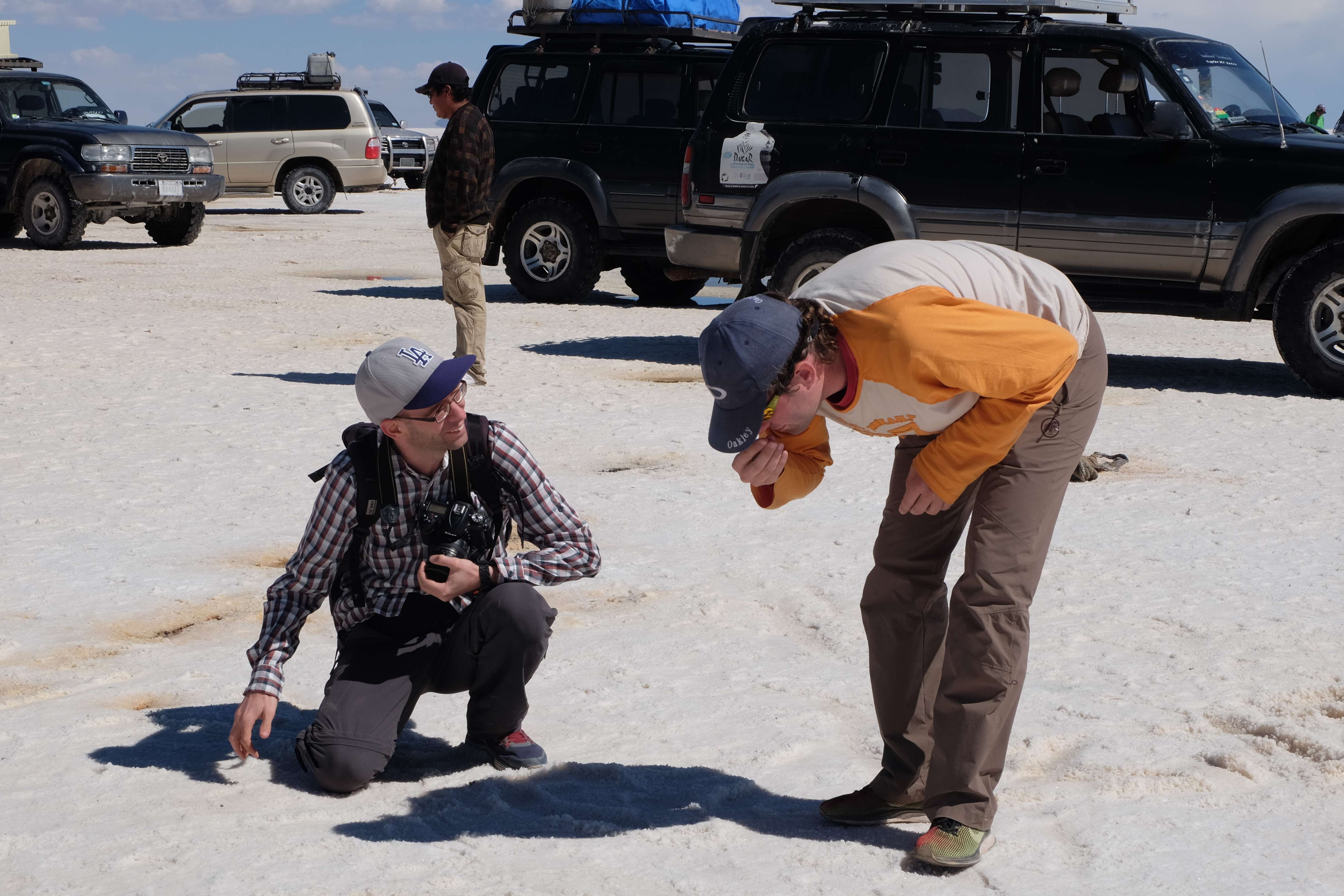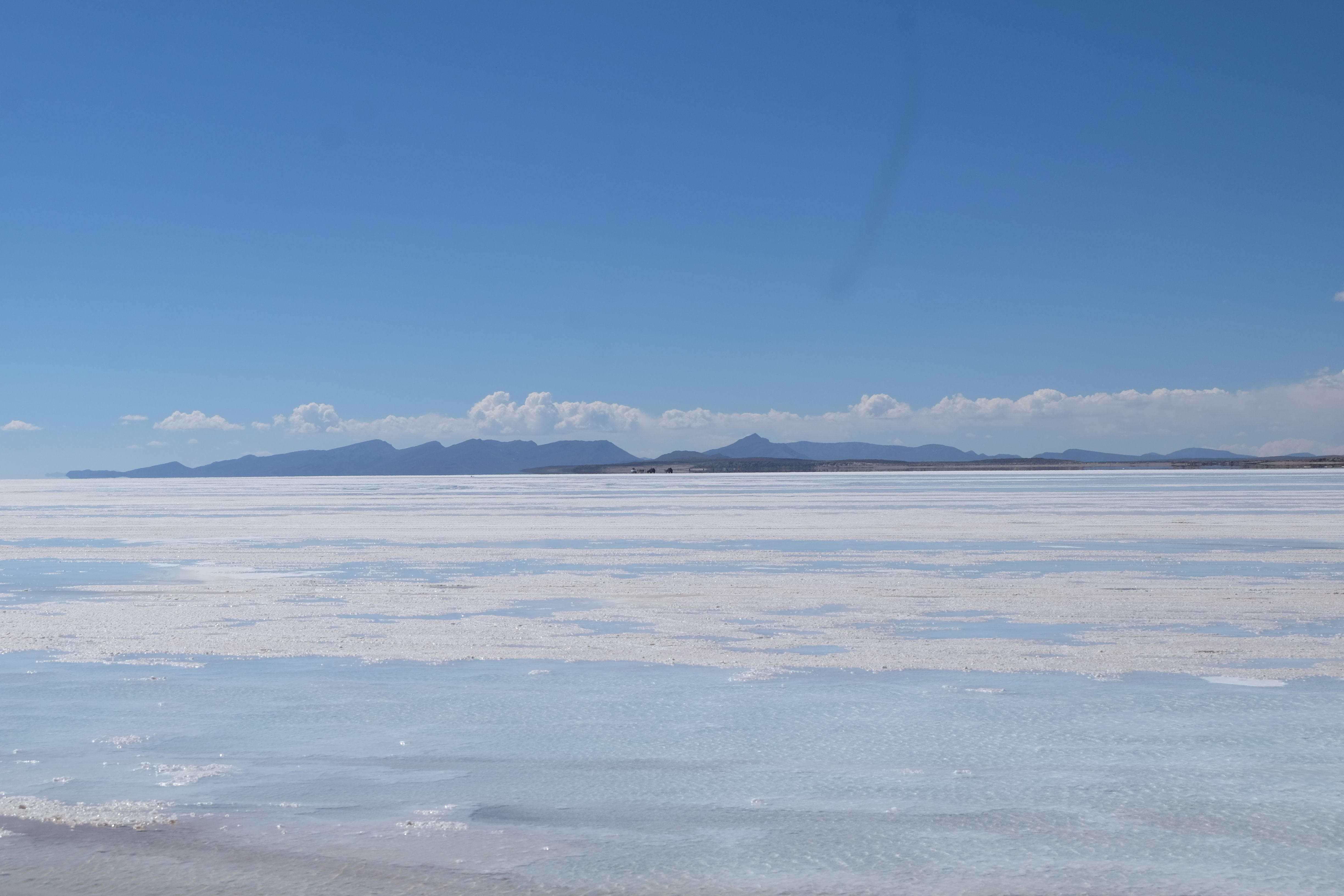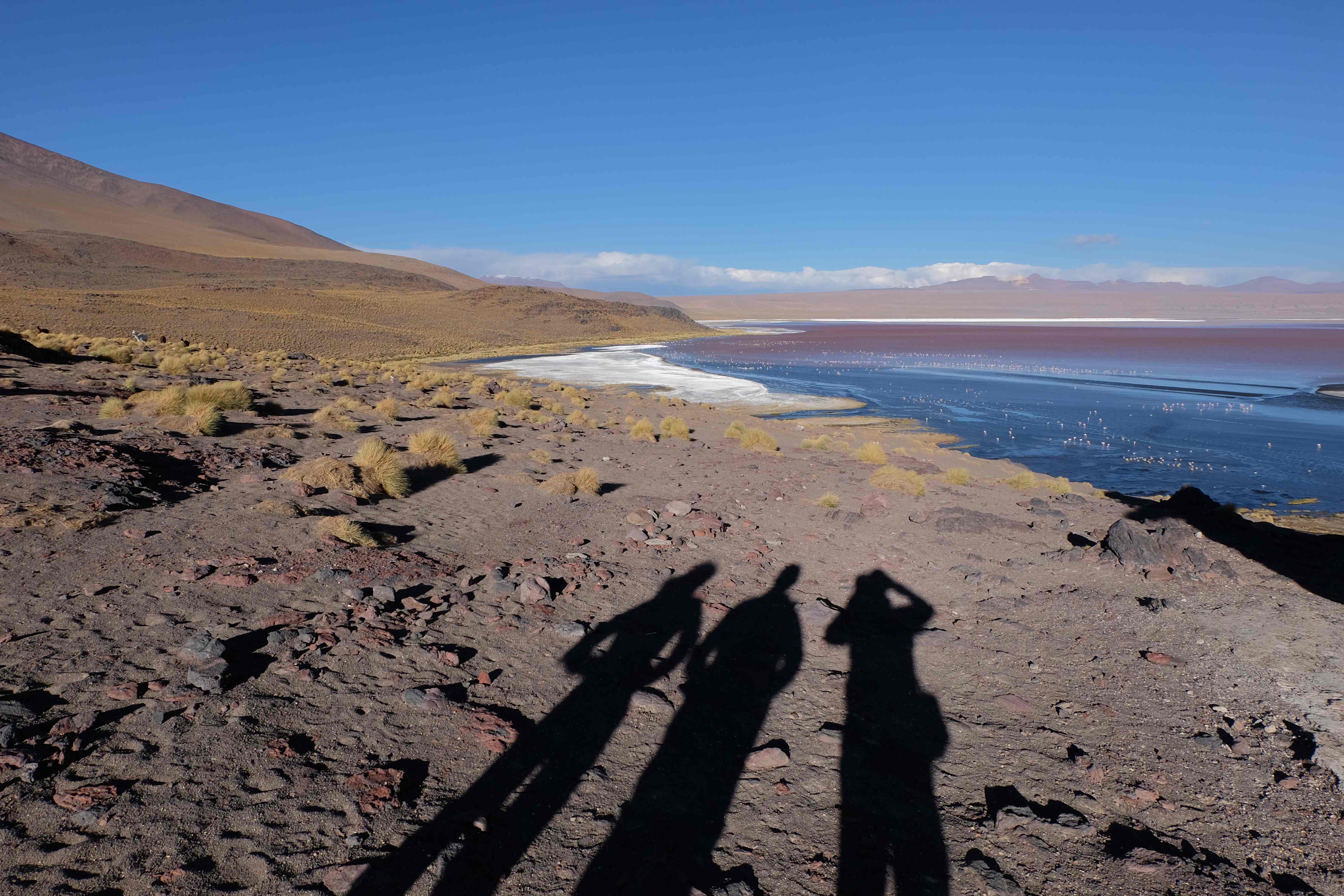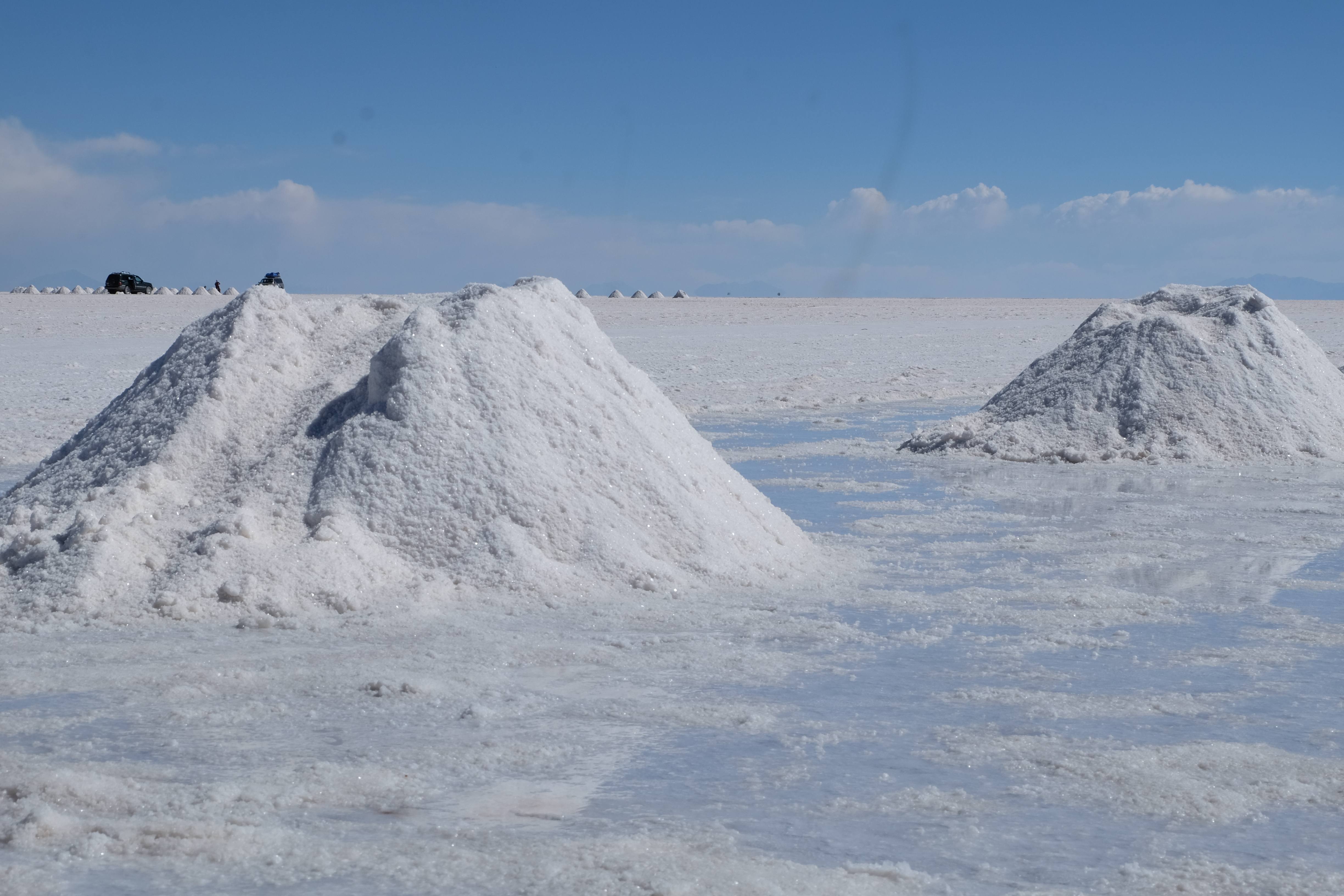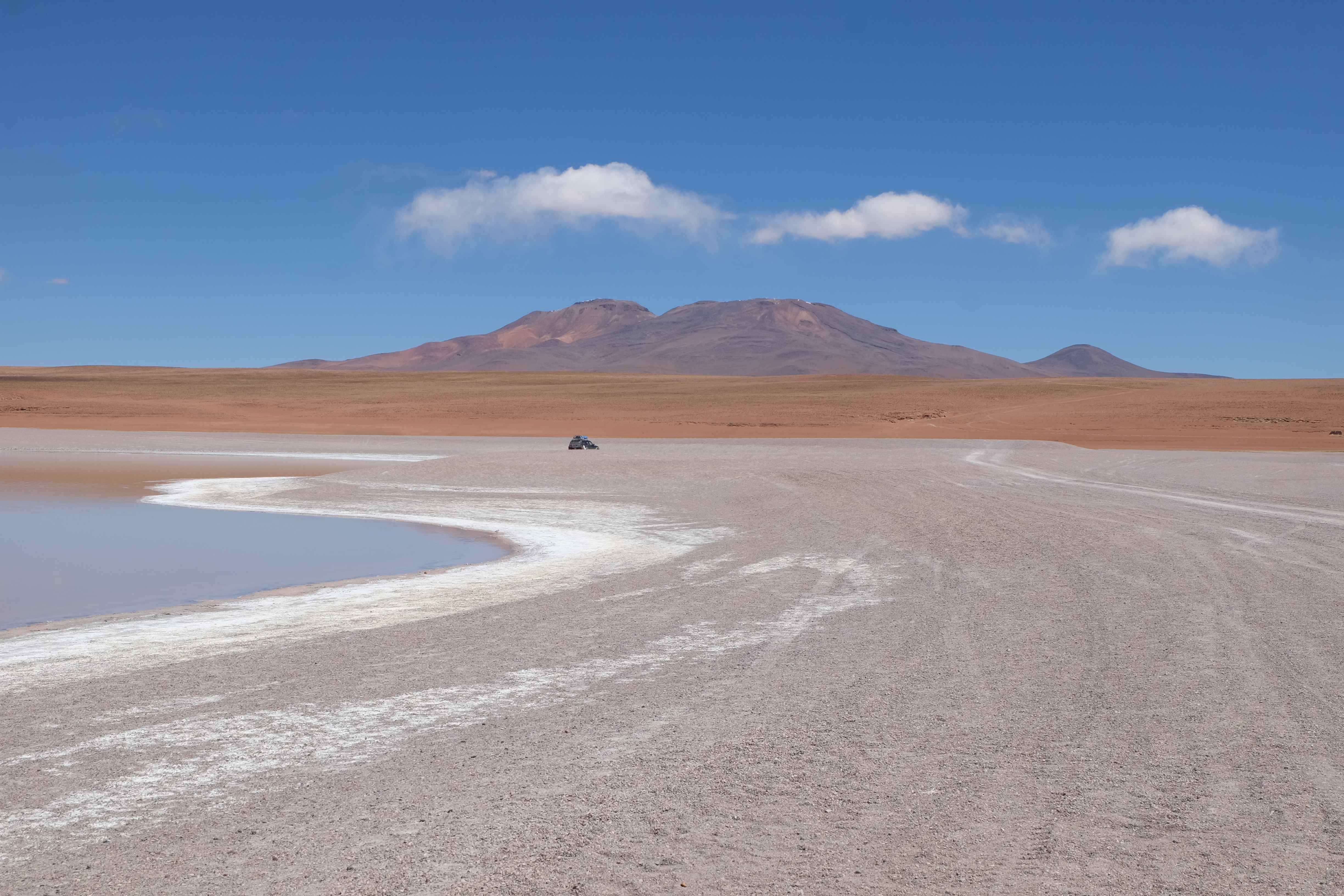 Und wie unsere Erwartungen übertroffen wurden: nach dem Mittagsessen verliessen wir den Planeten Erde und landeten plötzlich in einer unbekannten, aussergewöhnlichen und völlig surrealen Welt: unendliche Weiten an Weiss, Salzkristalle soweit das Auge reichte, Wasseransammlungen, welche die Sonne und die Landschaft spielerisch widerspiegelten, bunte darauf fahrende Fahrzeuge vollgepackt mit sprachlosen Touristen und wir inmitten dieser Wunderwelt. Wie beschreibt man so etwas? Es war, als hätte das Universum plötzlich mal einen Besuch von der Inspirationsmuse erhalten und darauf in schöpferischer Laune war. Da nahm es mal eine Unendlichkeit an Weiss und fing an darauf Wörter und Ideen mit Landschaften, Farben, Klängen, mit Licht und Schatten, ja sogar mit Leere zu dichten. Am Ende war sein Werk vollbracht: da stand ein Salzsee in seiner ganzen Pracht, das Wasser besang ihn tagtäglich, die Sonne leistete ihm Gesellschaft, das Weiss war nicht nur ein leeres Blatt, sondern eine Fülle an Emotionen, Eindrücken, Formen und Gestalten, welche ausserirdisch schienen… dermassen ausserirdisch, dass die Sonne am Ende eines jeden Tages sich diesen Anblick erneut gönnen wollte, so dass sie extra lange da verweilte und es kaum schaffte davon Abschied zu nehmen. Aber was sind Wörter? Die Aussagekraft meiner ist zumindest nichts im Vergleich zu jener der Landschaft selbst. Also macht euch mal selber ein Bild davon, während wir uns entsalzen (wenn jemand noch Salz für seine Grillabende möchte, bitte bei uns melden!) 🙂