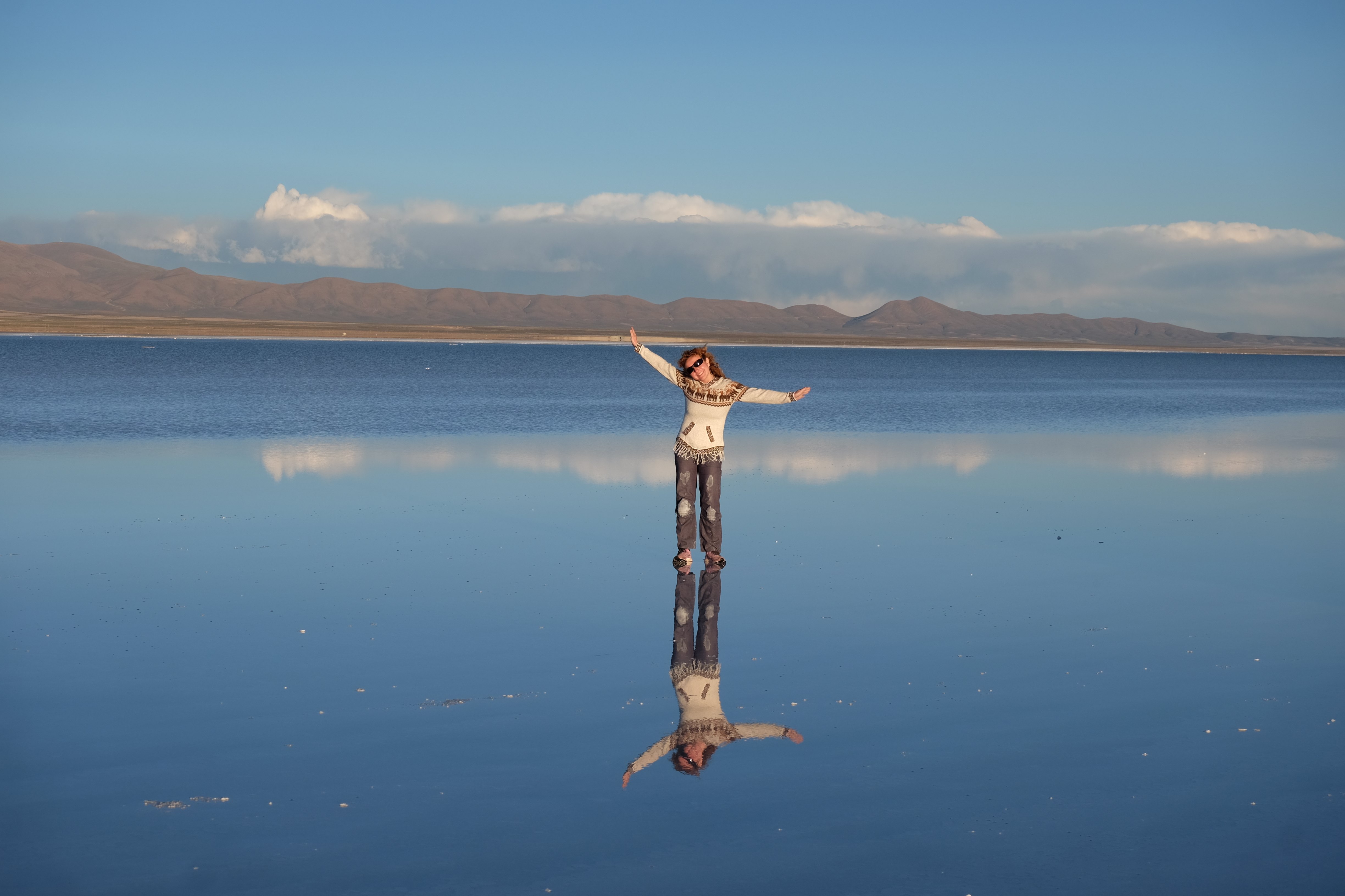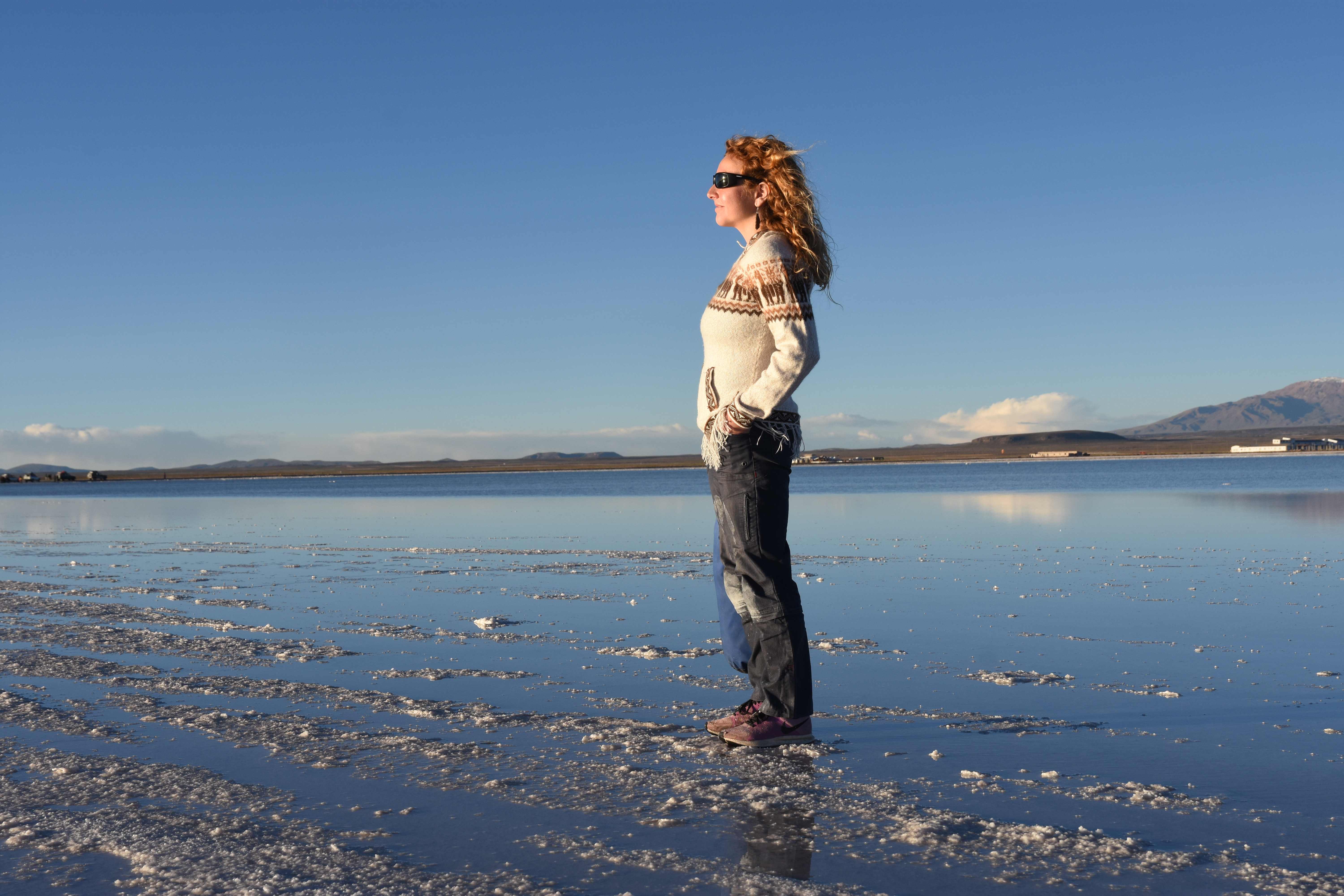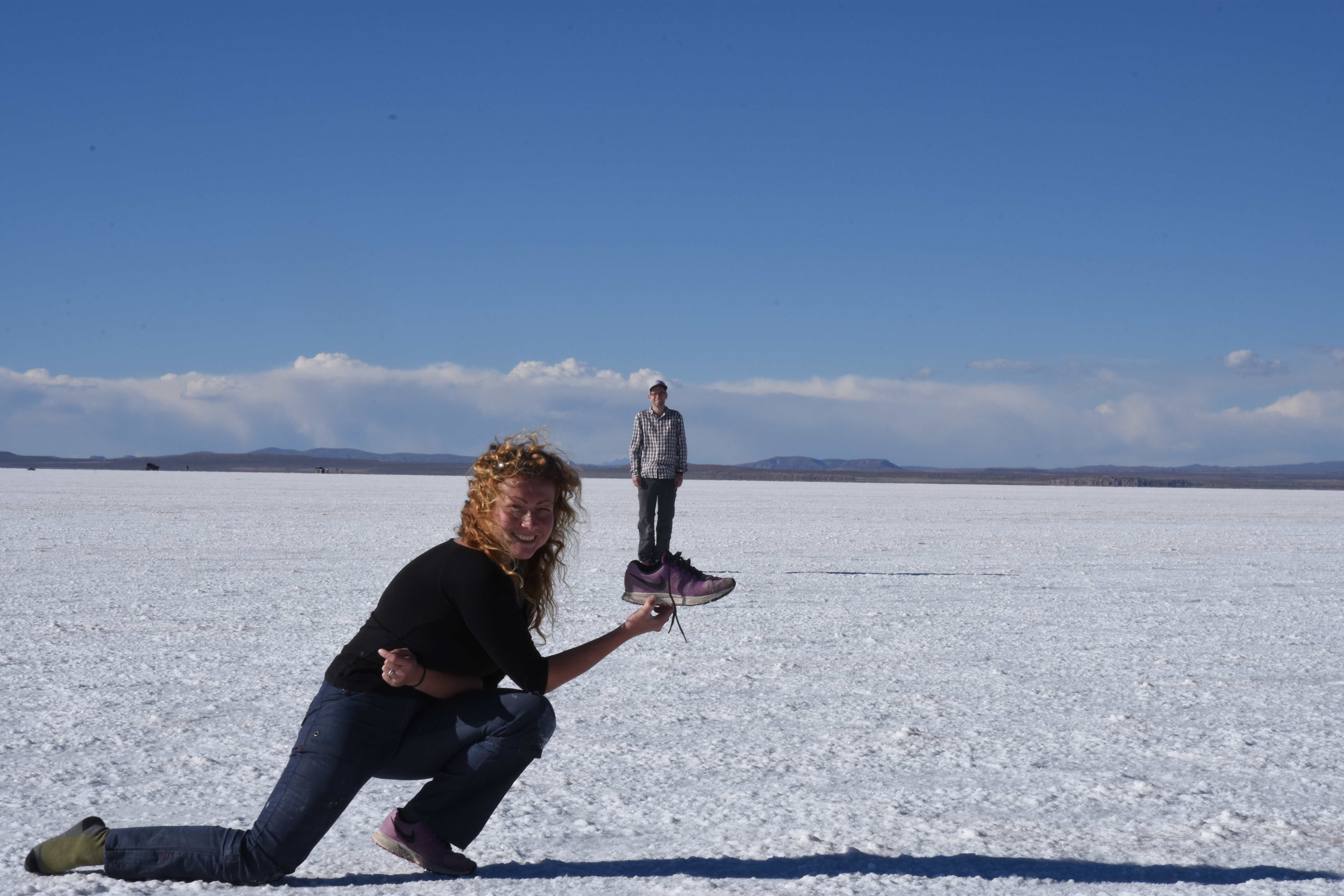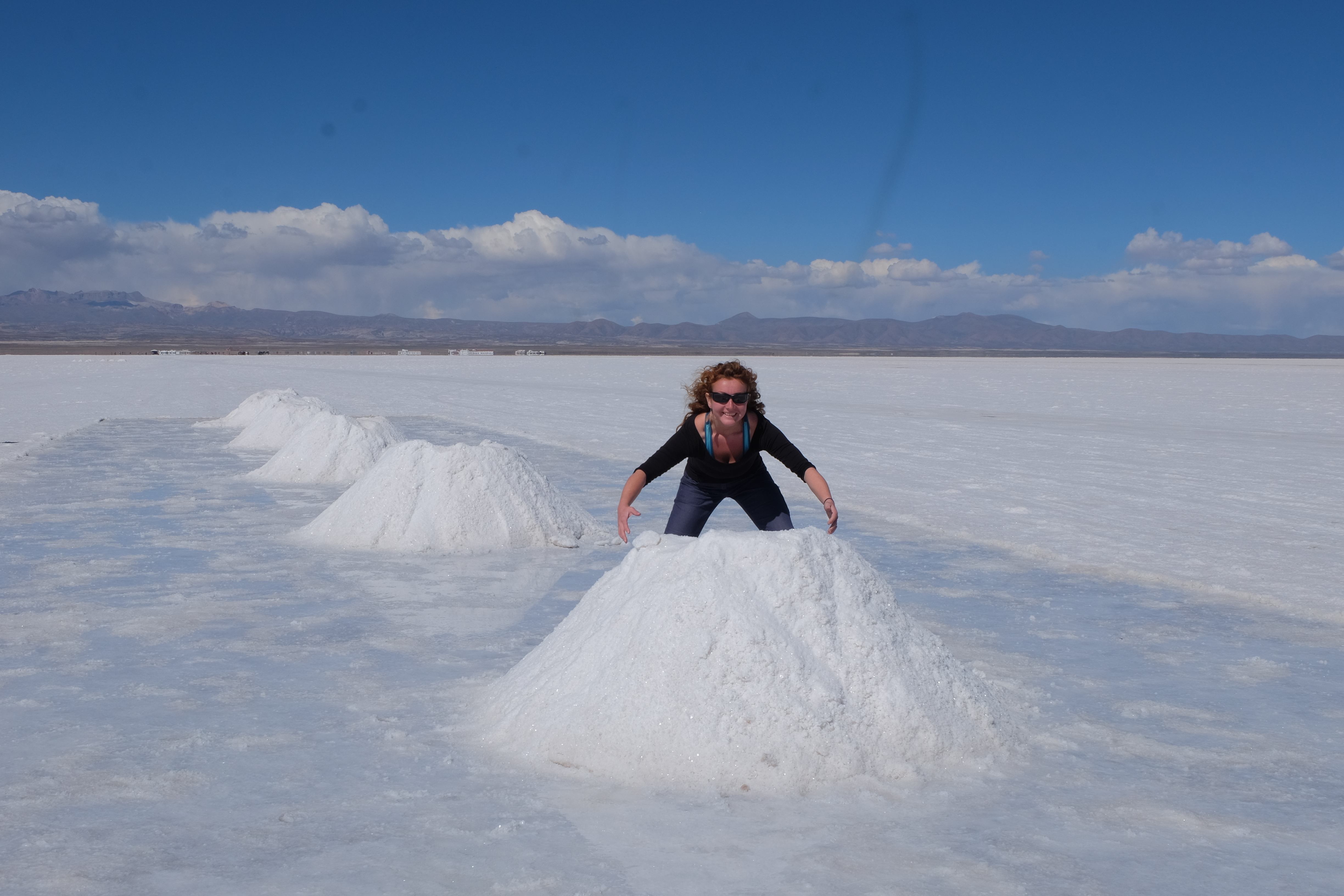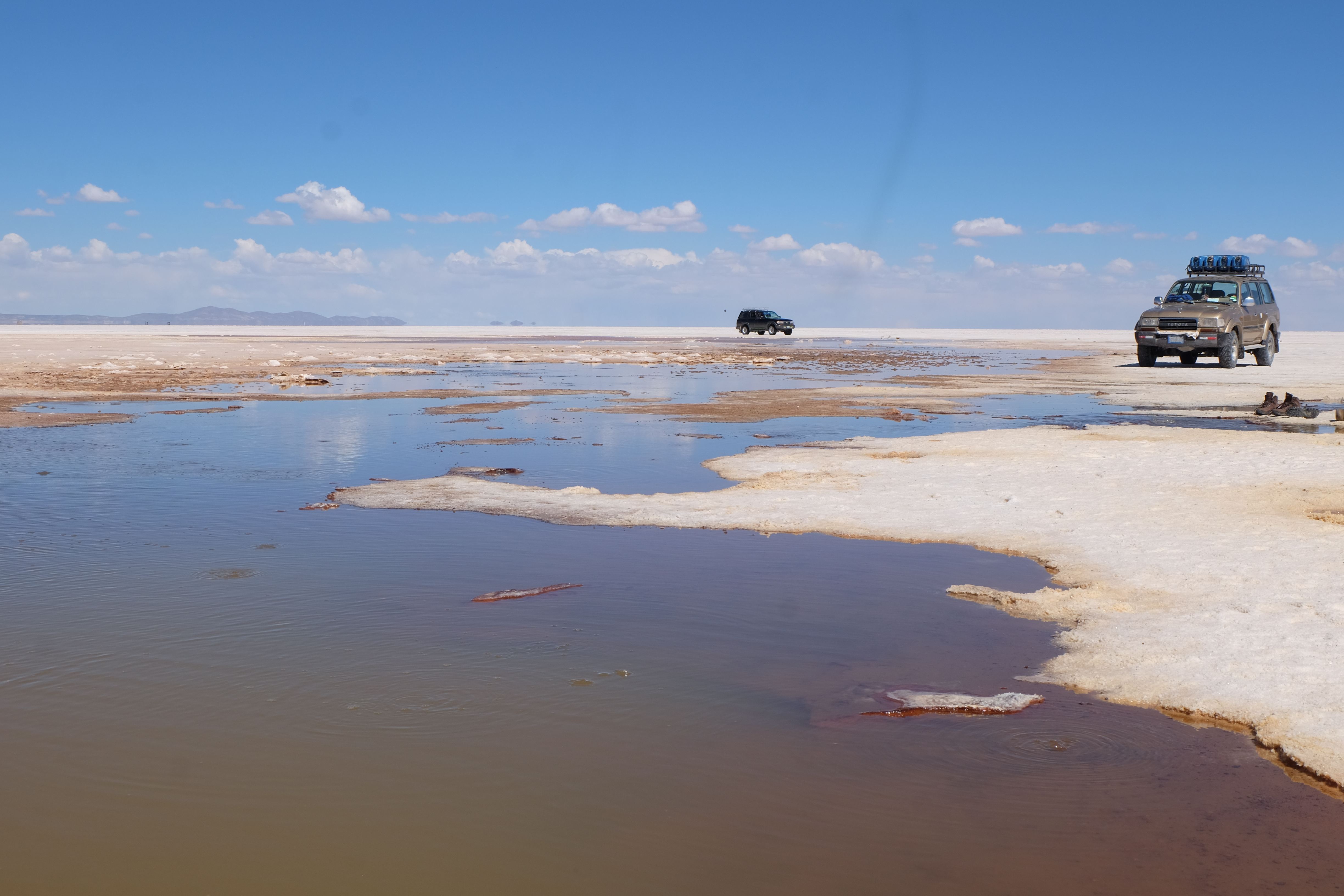 Und wie unsere Erwartungen übertroffen wurden: nach dem Mittagsessen verliessen wir den Planeten Erde und landeten plötzlich in einer unbekannten, aussergewöhnlichen und völlig surrealen Welt: unendliche Weiten an Weiss, Salzkristalle soweit das Auge reichte, Wasseransammlungen, welche die Sonne und die Landschaft spielerisch widerspiegelten, bunte darauf fahrende Fahrzeuge vollgepackt mit sprachlosen Touristen und wir inmitten dieser Wunderwelt. Wie beschreibt man so etwas? Es war, als hätte das Universum plötzlich mal einen Besuch von der Inspirationsmuse erhalten und darauf in schöpferischer Laune war. Da nahm es mal eine Unendlichkeit an Weiss und fing an darauf Wörter und Ideen mit Landschaften, Farben, Klängen, mit Licht und Schatten, ja sogar mit Leere zu dichten. Am Ende war sein Werk vollbracht: da stand ein Salzsee in seiner ganzen Pracht, das Wasser besang ihn tagtäglich, die Sonne leistete ihm Gesellschaft, das Weiss war nicht nur ein leeres Blatt, sondern eine Fülle an Emotionen, Eindrücken, Formen und Gestalten, welche ausserirdisch schienen… dermassen ausserirdisch, dass die Sonne am Ende eines jeden Tages sich diesen Anblick erneut gönnen wollte, so dass sie extra lange da verweilte und es kaum schaffte davon Abschied zu nehmen. Aber was sind Wörter? Die Aussagekraft meiner ist zumindest nichts im Vergleich zu jener der Landschaft selbst. Also macht euch mal selber ein Bild davon, während wir uns entsalzen (wenn jemand noch Salz für seine Grillabende möchte, bitte bei uns melden!) 🙂