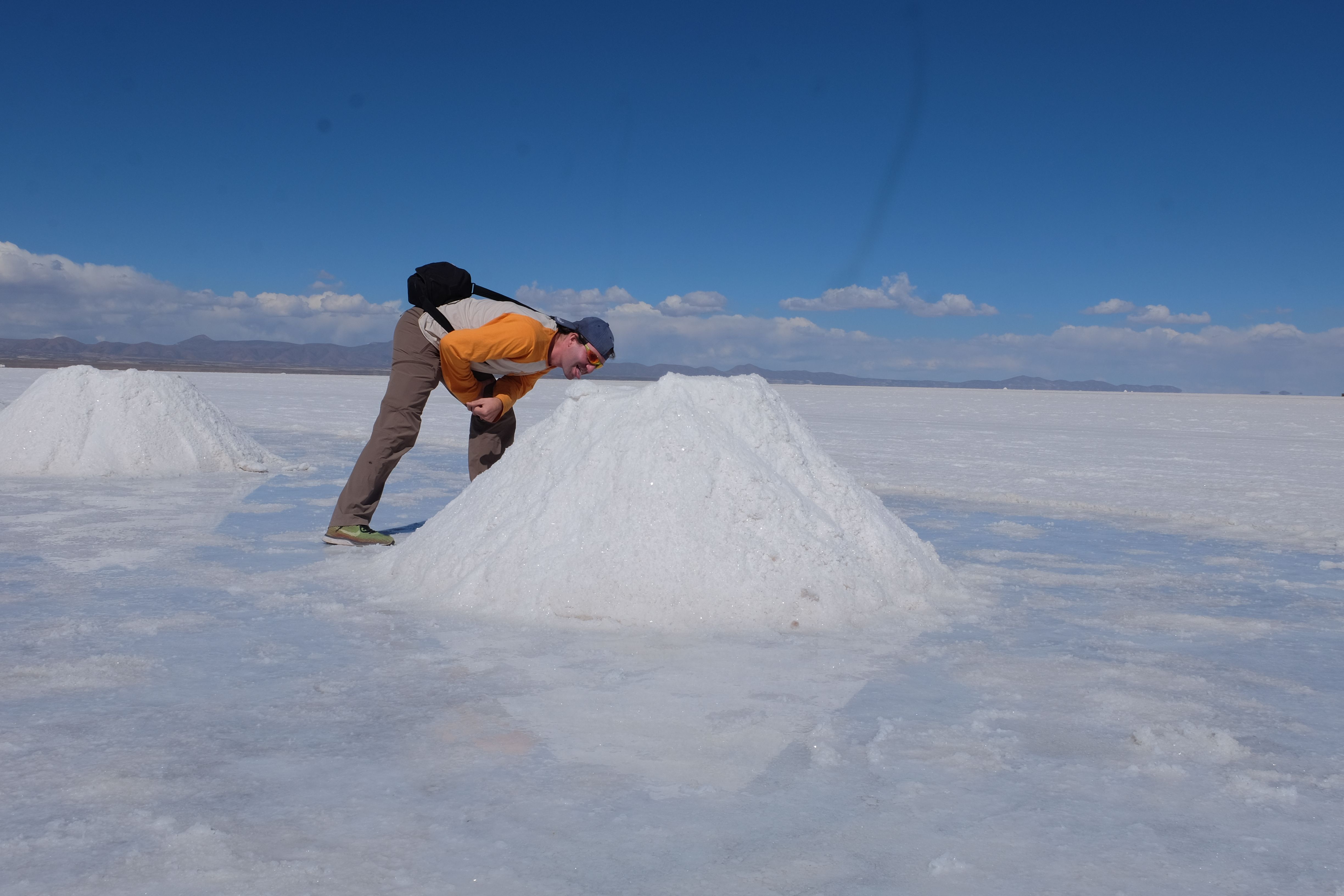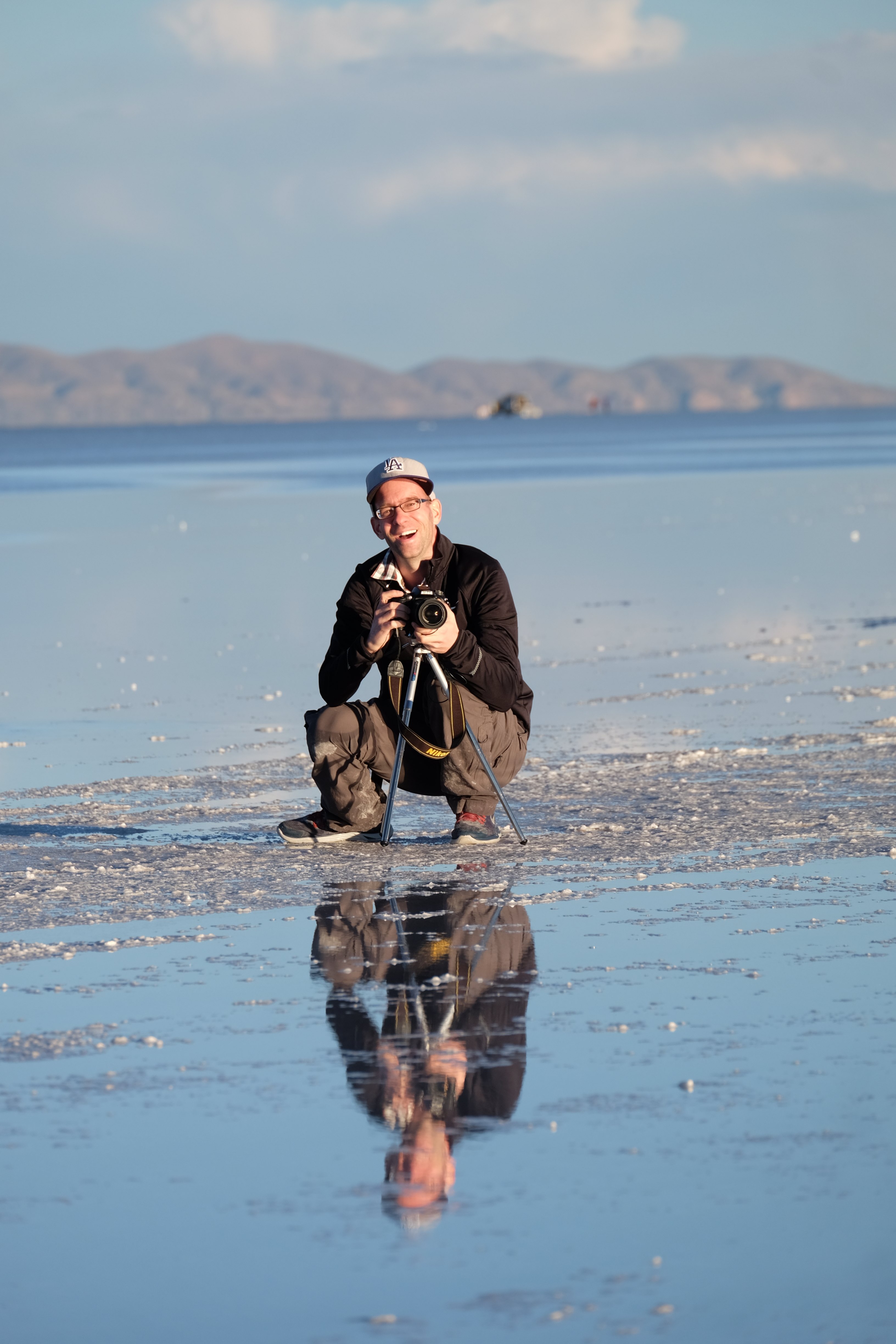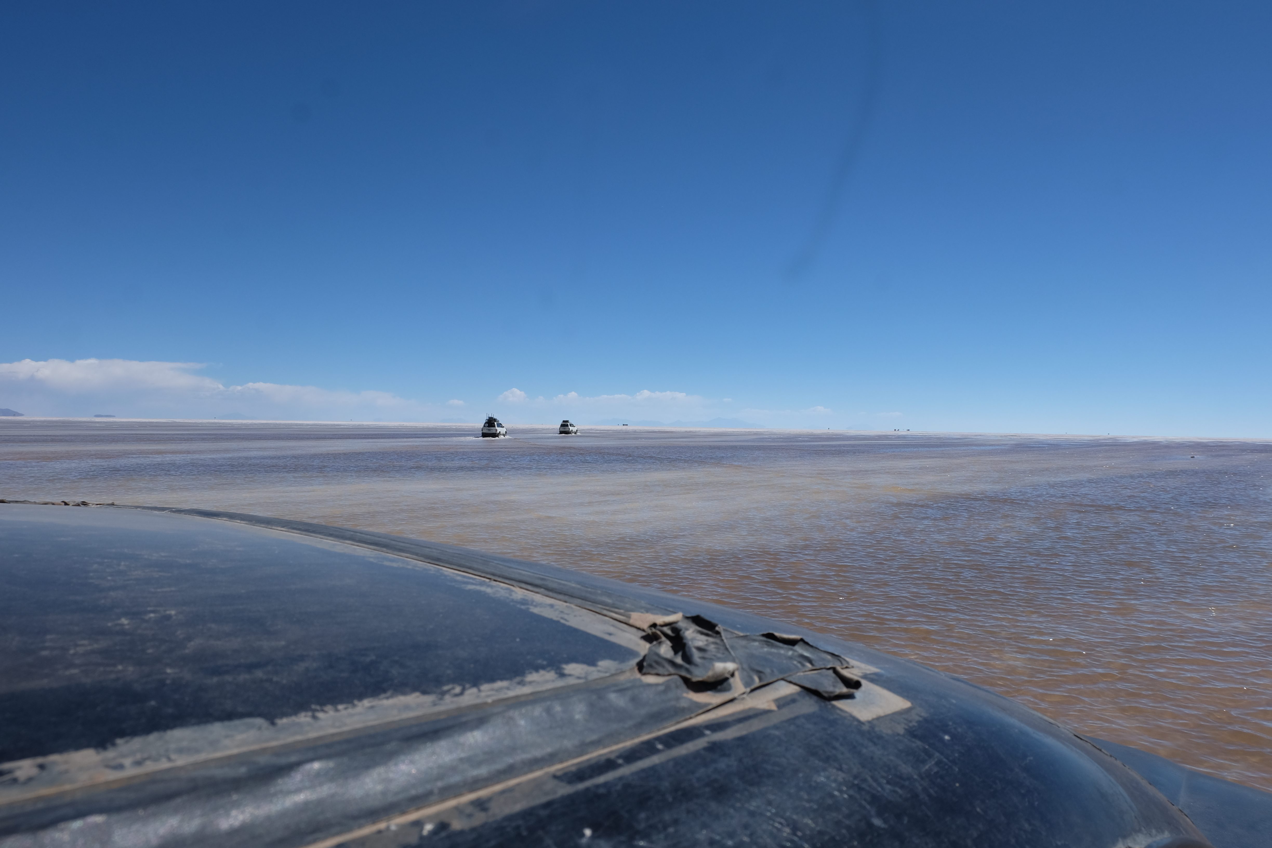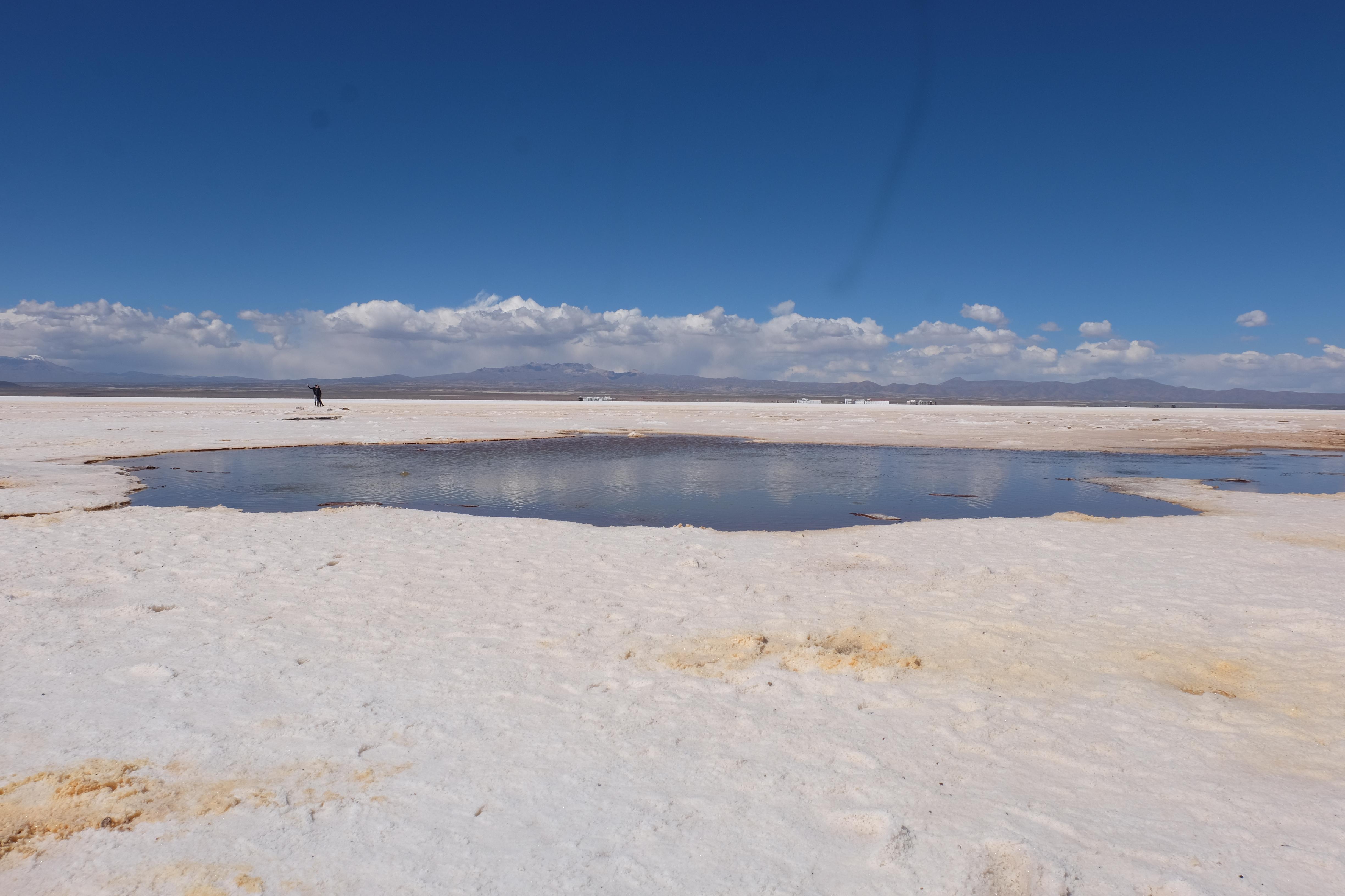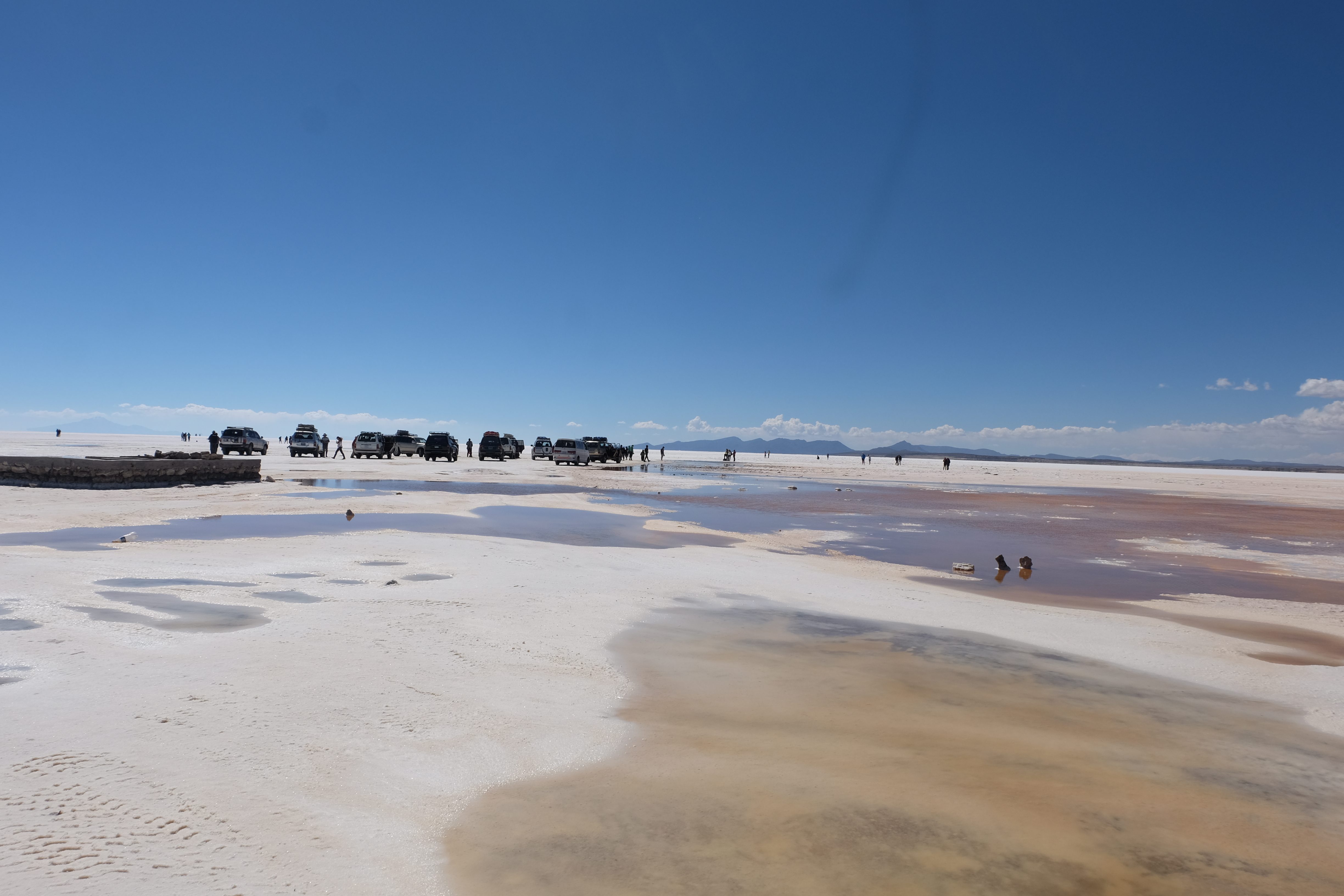 Und wie unsere Erwartungen übertroffen wurden: nach dem Mittagsessen verliessen wir den Planeten Erde und landeten plötzlich in einer unbekannten, aussergewöhnlichen und völlig surrealen Welt: unendliche Weiten an Weiss, Salzkristalle soweit das Auge reichte, Wasseransammlungen, welche die Sonne und die Landschaft spielerisch widerspiegelten, bunte darauf fahrende Fahrzeuge vollgepackt mit sprachlosen Touristen und wir inmitten dieser Wunderwelt. Wie beschreibt man so etwas? Es war, als hätte das Universum plötzlich mal einen Besuch von der Inspirationsmuse erhalten und darauf in schöpferischer Laune war. Da nahm es mal eine Unendlichkeit an Weiss und fing an darauf Wörter und Ideen mit Landschaften, Farben, Klängen, mit Licht und Schatten, ja sogar mit Leere zu dichten. Am Ende war sein Werk vollbracht: da stand ein Salzsee in seiner ganzen Pracht, das Wasser besang ihn tagtäglich, die Sonne leistete ihm Gesellschaft, das Weiss war nicht nur ein leeres Blatt, sondern eine Fülle an Emotionen, Eindrücken, Formen und Gestalten, welche ausserirdisch schienen… dermassen ausserirdisch, dass die Sonne am Ende eines jeden Tages sich diesen Anblick erneut gönnen wollte, so dass sie extra lange da verweilte und es kaum schaffte davon Abschied zu nehmen. Aber was sind Wörter? Die Aussagekraft meiner ist zumindest nichts im Vergleich zu jener der Landschaft selbst. Also macht euch mal selber ein Bild davon, während wir uns entsalzen (wenn jemand noch Salz für seine Grillabende möchte, bitte bei uns melden!) 🙂