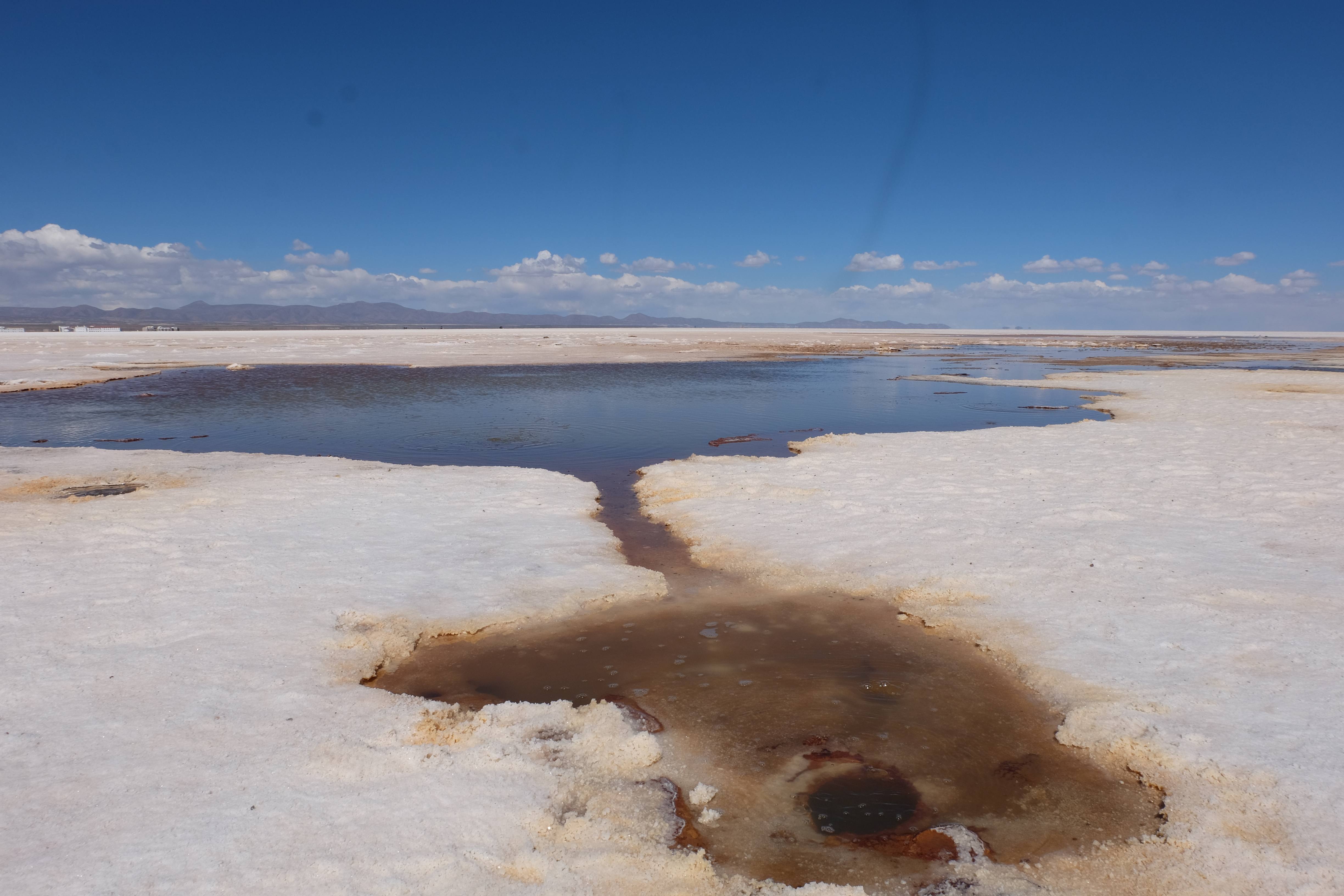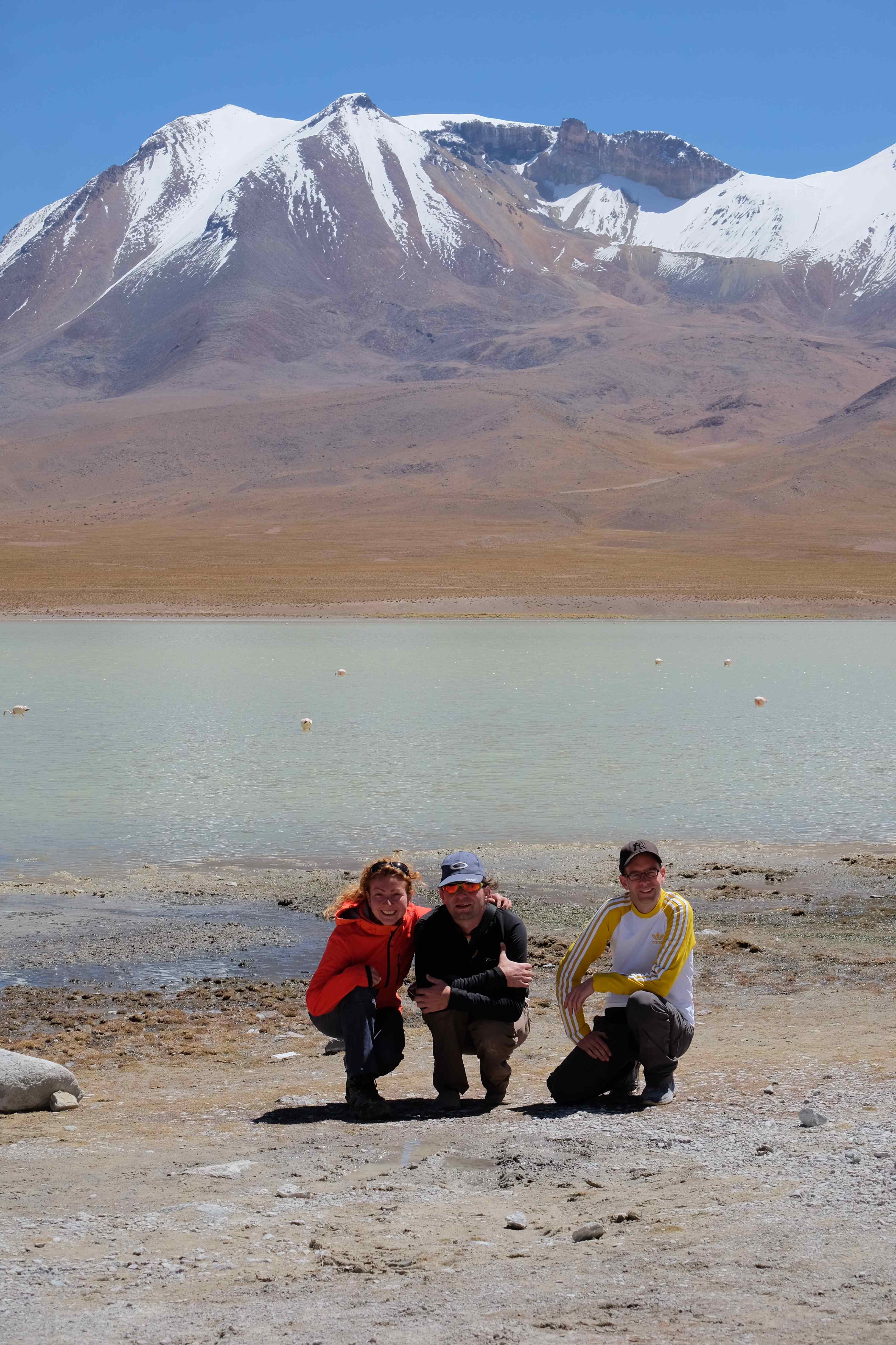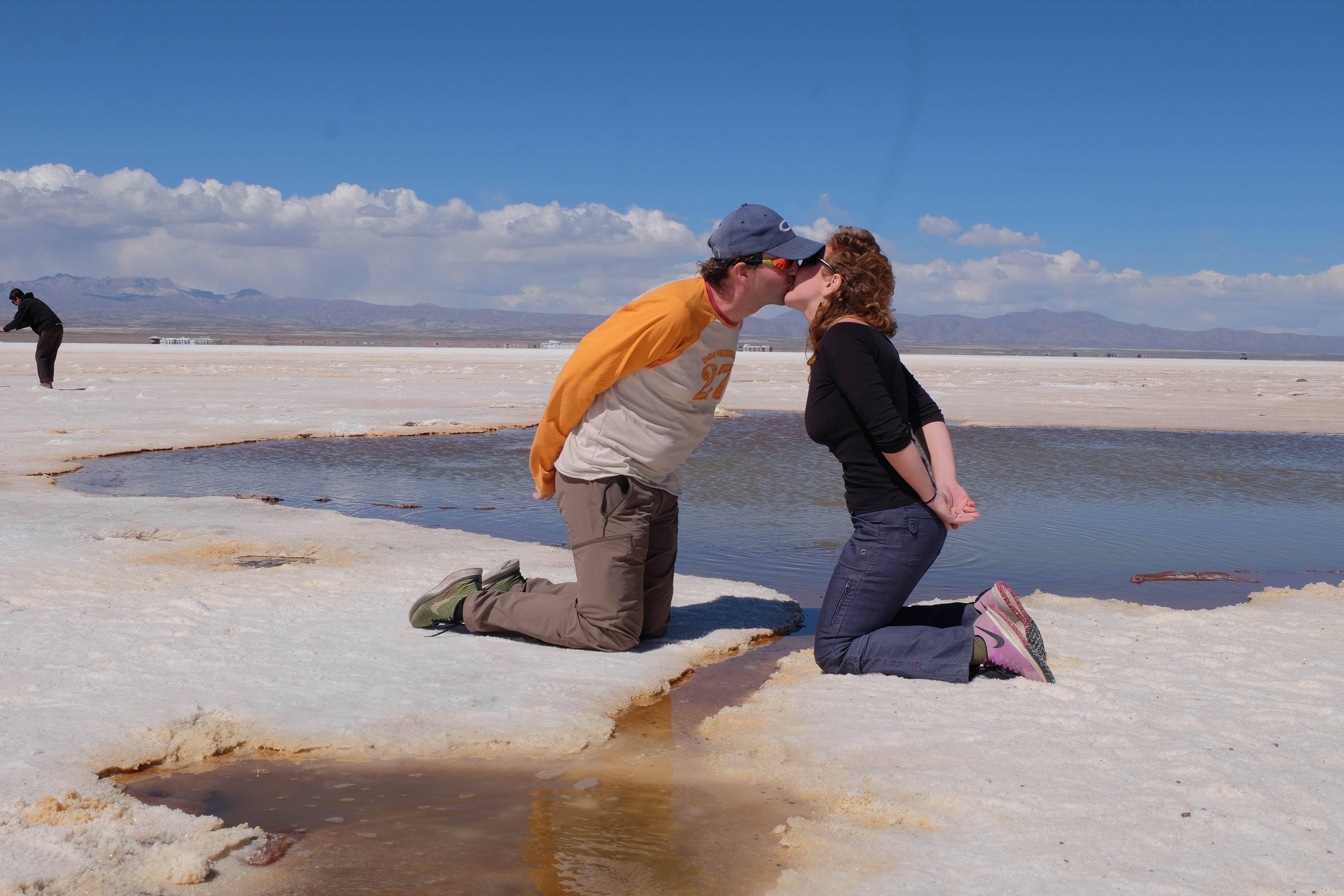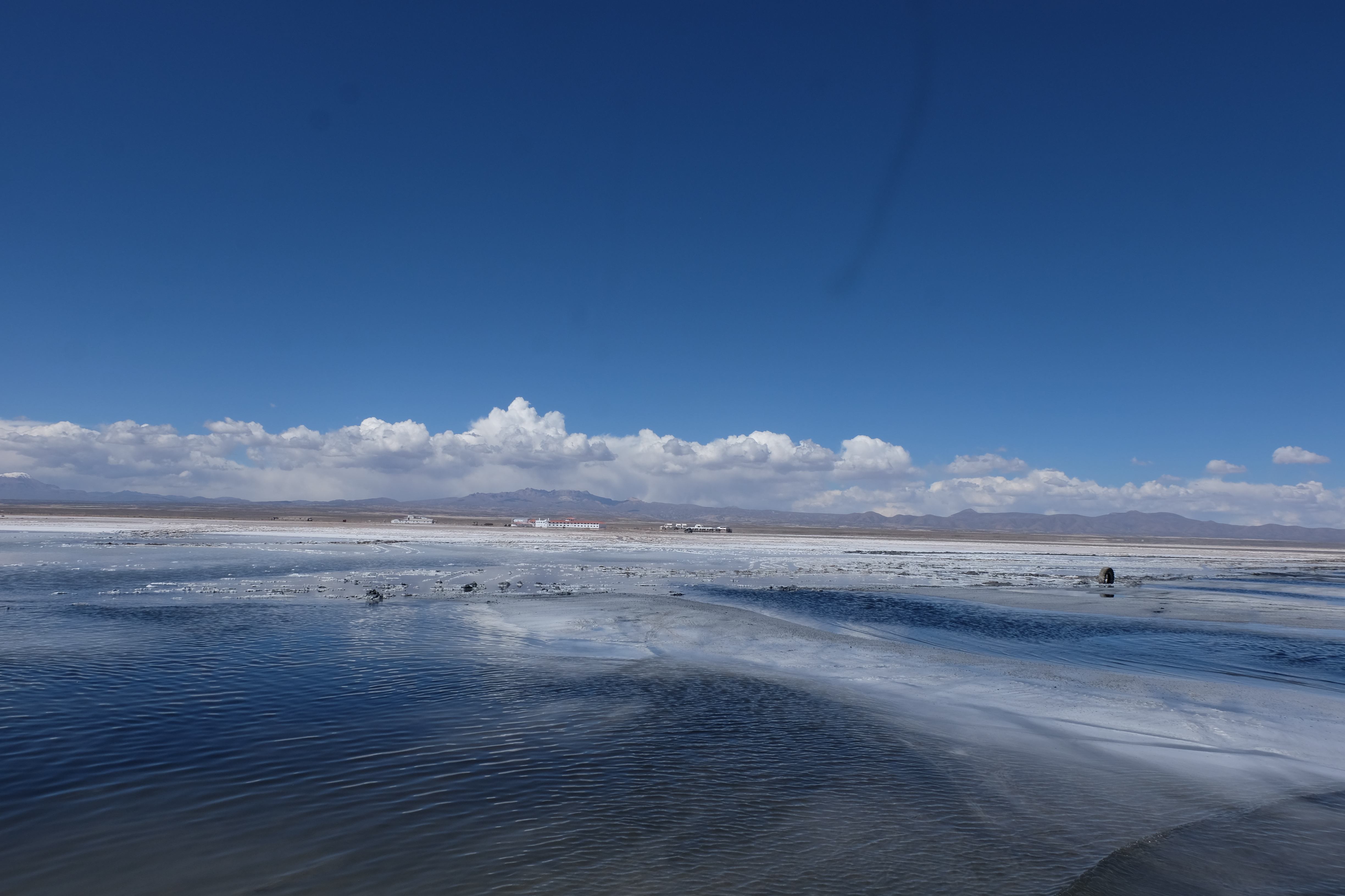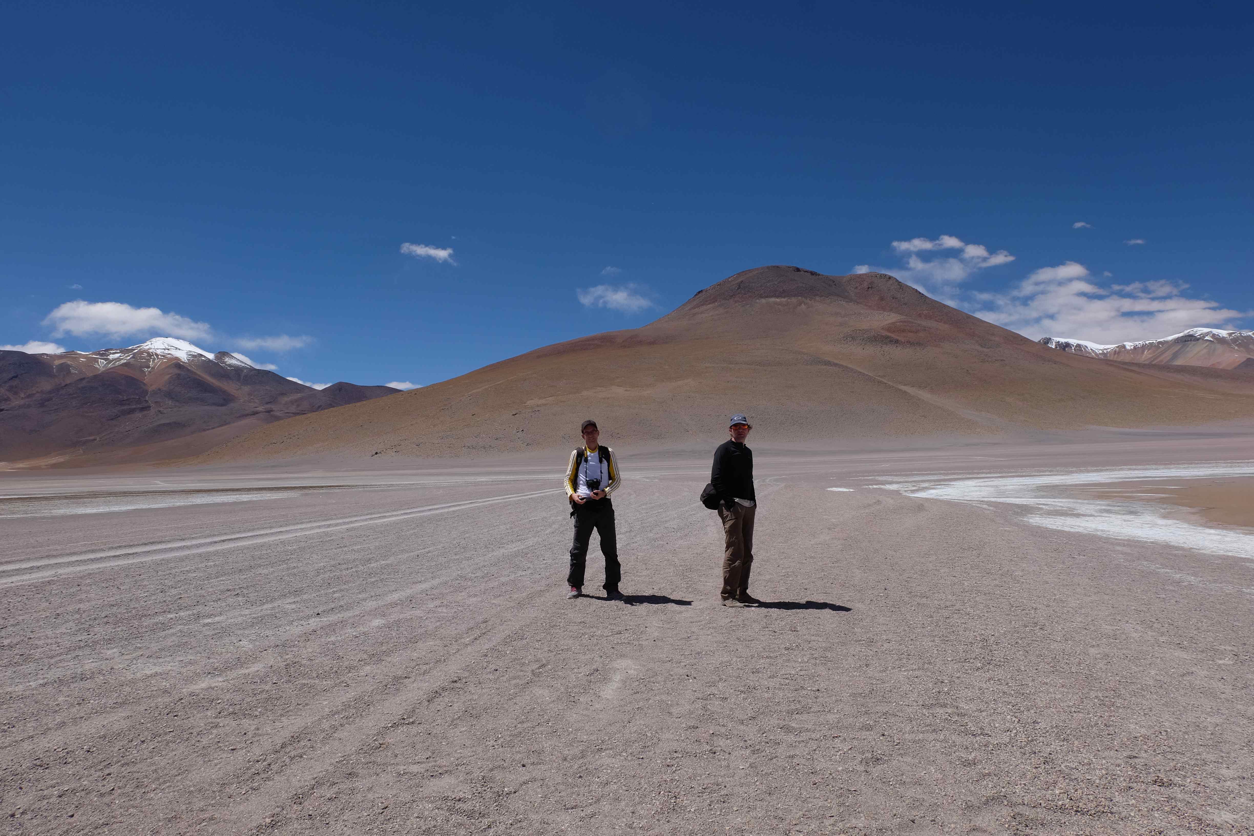 Und wie unsere Erwartungen übertroffen wurden: nach dem Mittagsessen verliessen wir den Planeten Erde und landeten plötzlich in einer unbekannten, aussergewöhnlichen und völlig surrealen Welt: unendliche Weiten an Weiss, Salzkristalle soweit das Auge reichte, Wasseransammlungen, welche die Sonne und die Landschaft spielerisch widerspiegelten, bunte darauf fahrende Fahrzeuge vollgepackt mit sprachlosen Touristen und wir inmitten dieser Wunderwelt. Wie beschreibt man so etwas? Es war, als hätte das Universum plötzlich mal einen Besuch von der Inspirationsmuse erhalten und darauf in schöpferischer Laune war. Da nahm es mal eine Unendlichkeit an Weiss und fing an darauf Wörter und Ideen mit Landschaften, Farben, Klängen, mit Licht und Schatten, ja sogar mit Leere zu dichten. Am Ende war sein Werk vollbracht: da stand ein Salzsee in seiner ganzen Pracht, das Wasser besang ihn tagtäglich, die Sonne leistete ihm Gesellschaft, das Weiss war nicht nur ein leeres Blatt, sondern eine Fülle an Emotionen, Eindrücken, Formen und Gestalten, welche ausserirdisch schienen… dermassen ausserirdisch, dass die Sonne am Ende eines jeden Tages sich diesen Anblick erneut gönnen wollte, so dass sie extra lange da verweilte und es kaum schaffte davon Abschied zu nehmen. Aber was sind Wörter? Die Aussagekraft meiner ist zumindest nichts im Vergleich zu jener der Landschaft selbst. Also macht euch mal selber ein Bild davon, während wir uns entsalzen (wenn jemand noch Salz für seine Grillabende möchte, bitte bei uns melden!) 🙂