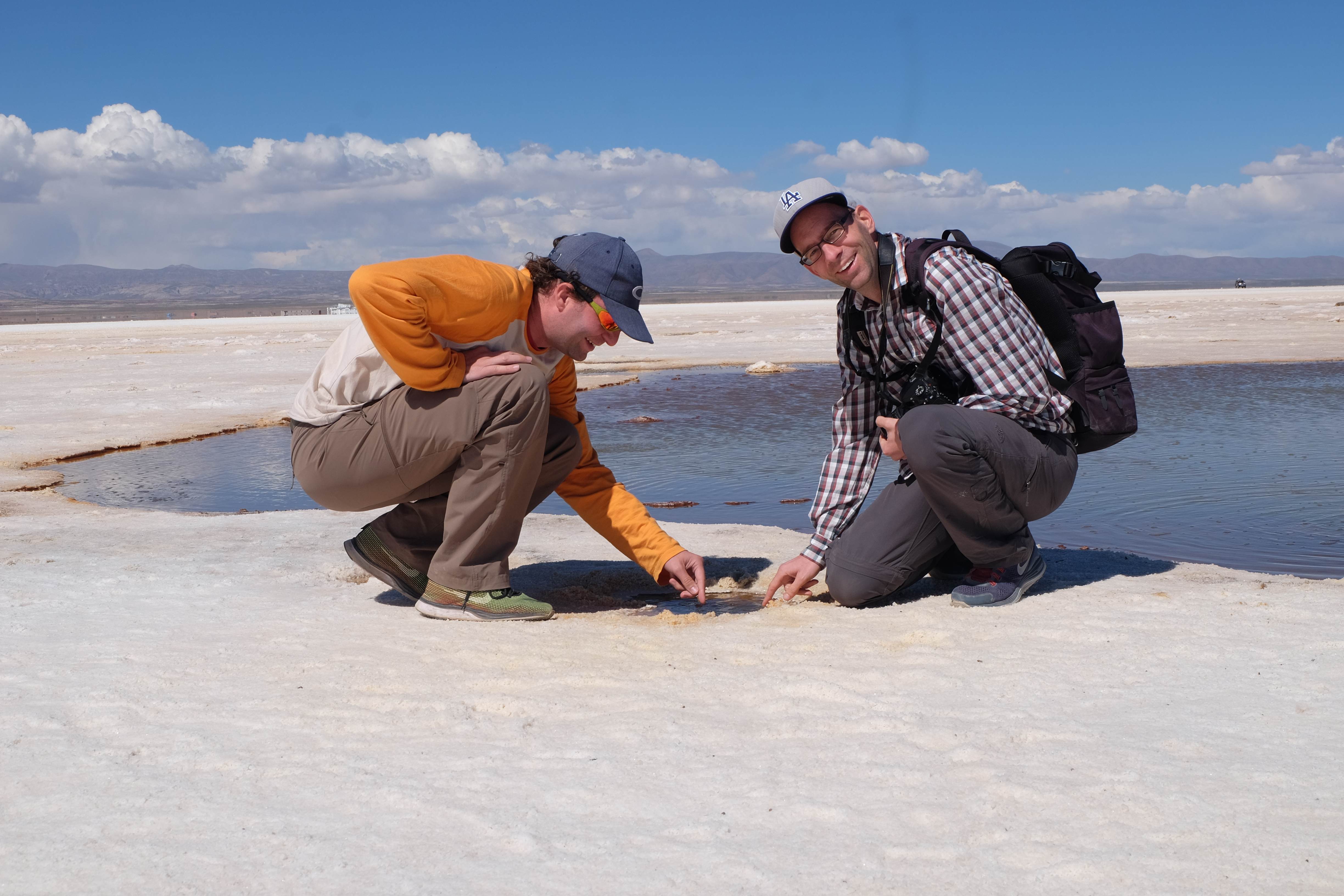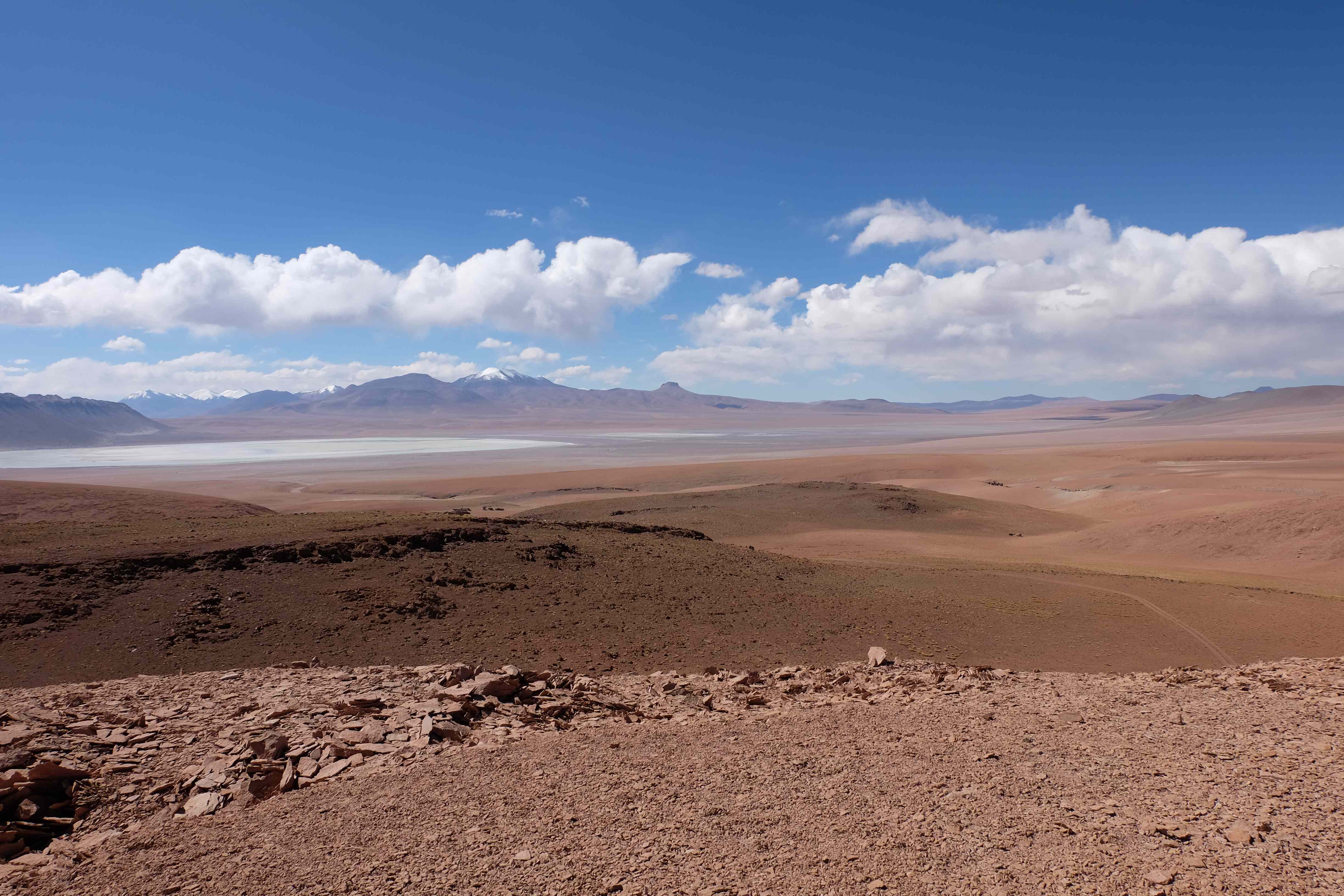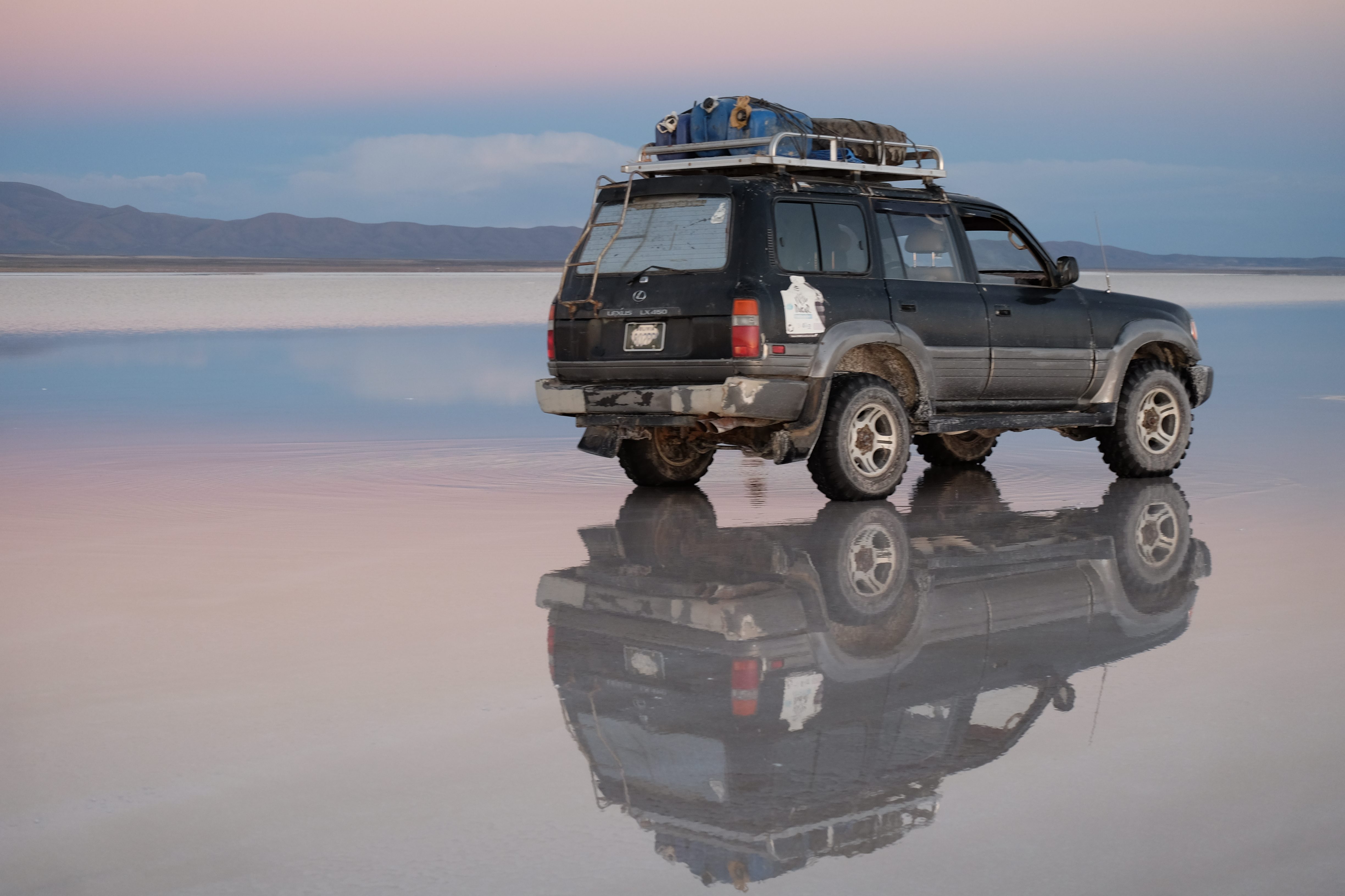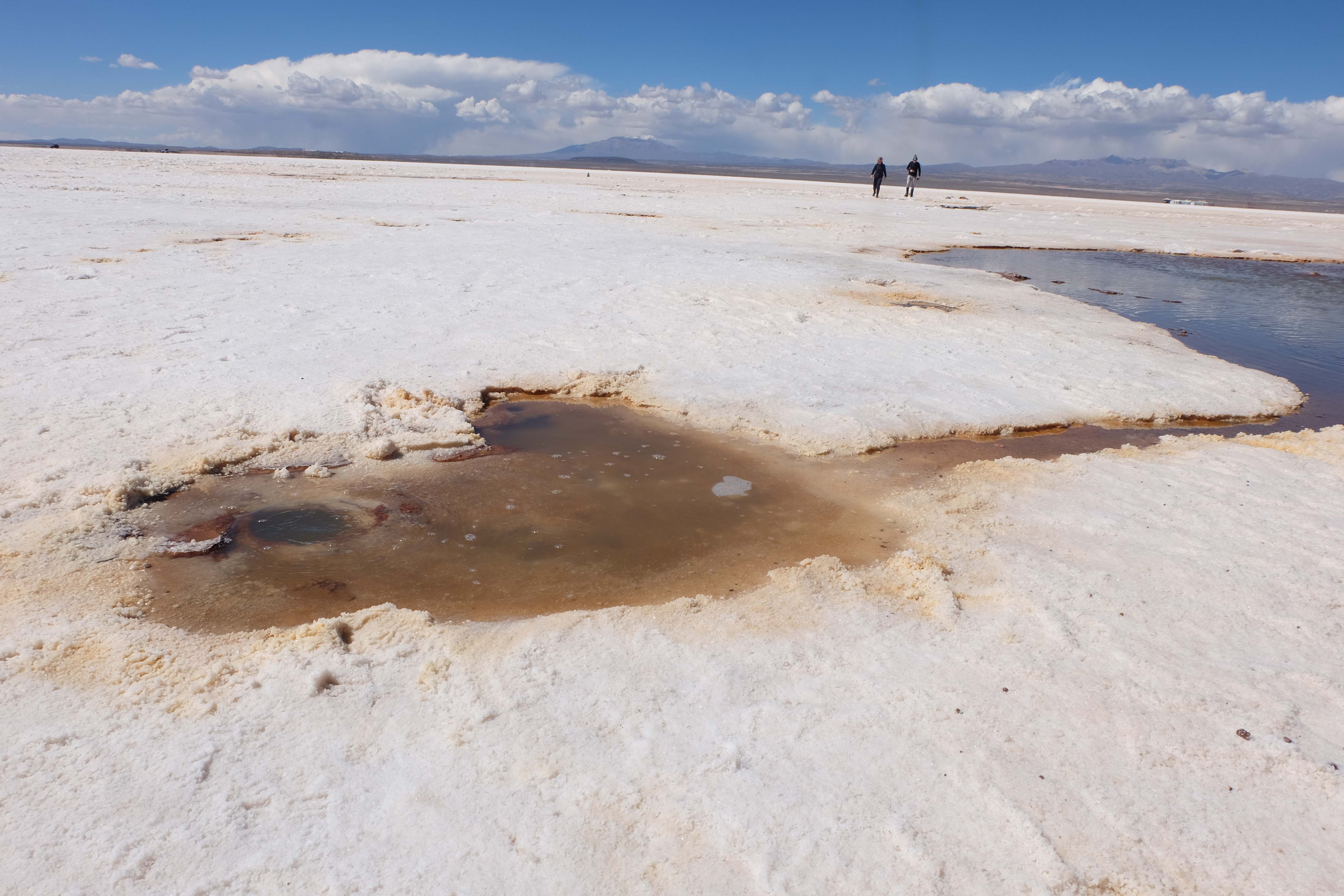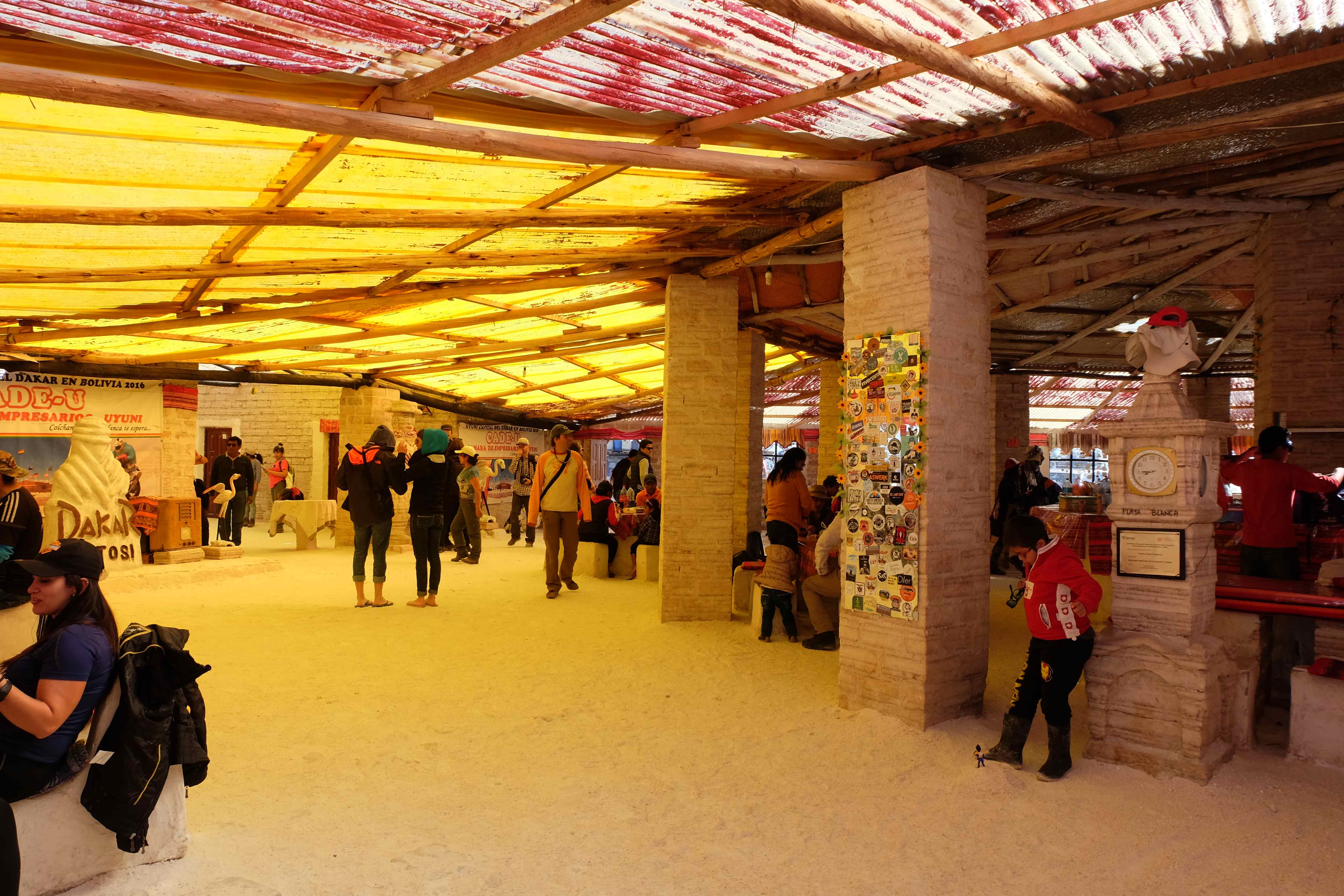Und wie unsere Erwartungen übertroffen wurden: nach dem Mittagsessen verliessen wir den Planeten Erde und landeten plötzlich in einer unbekannten, aussergewöhnlichen und völlig surrealen Welt: unendliche Weiten an Weiss, Salzkristalle soweit das Auge reichte, Wasseransammlungen, welche die Sonne und die Landschaft spielerisch widerspiegelten, bunte darauf fahrende Fahrzeuge vollgepackt mit sprachlosen Touristen und wir inmitten dieser Wunderwelt. Wie beschreibt man so etwas? Es war, als hätte das Universum plötzlich mal einen Besuch von der Inspirationsmuse erhalten und darauf in schöpferischer Laune war. Da nahm es mal eine Unendlichkeit an Weiss und fing an darauf Wörter und Ideen mit Landschaften, Farben, Klängen, mit Licht und Schatten, ja sogar mit Leere zu dichten. Am Ende war sein Werk vollbracht: da stand ein Salzsee in seiner ganzen Pracht, das Wasser besang ihn tagtäglich, die Sonne leistete ihm Gesellschaft, das Weiss war nicht nur ein leeres Blatt, sondern eine Fülle an Emotionen, Eindrücken, Formen und Gestalten, welche ausserirdisch schienen… dermassen ausserirdisch, dass die Sonne am Ende eines jeden Tages sich diesen Anblick erneut gönnen wollte, so dass sie extra lange da verweilte und es kaum schaffte davon Abschied zu nehmen. Aber was sind Wörter? Die Aussagekraft meiner ist zumindest nichts im Vergleich zu jener der Landschaft selbst. Also macht euch mal selber ein Bild davon, während wir uns entsalzen (wenn jemand noch Salz für seine Grillabende möchte, bitte bei uns melden!) 🙂