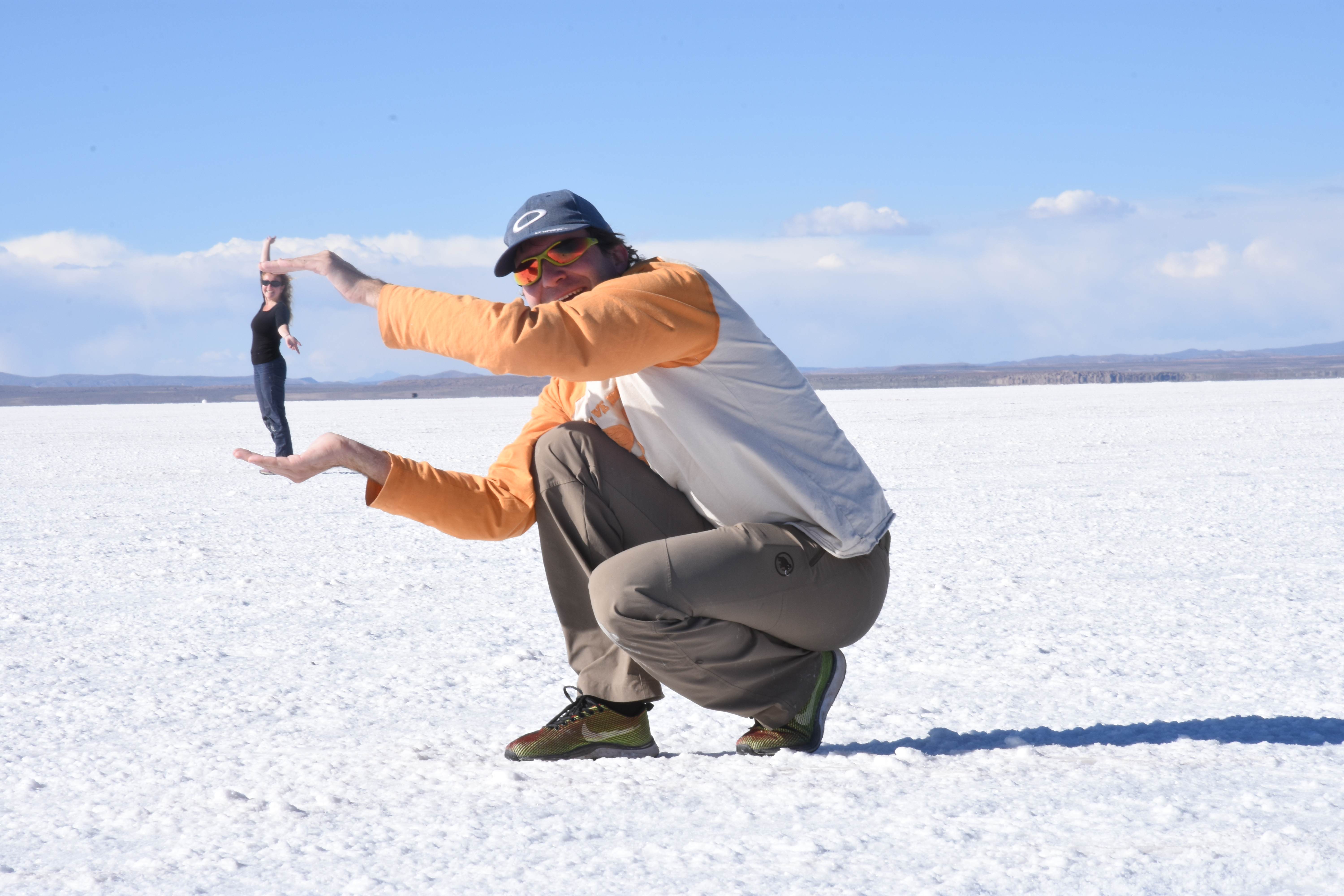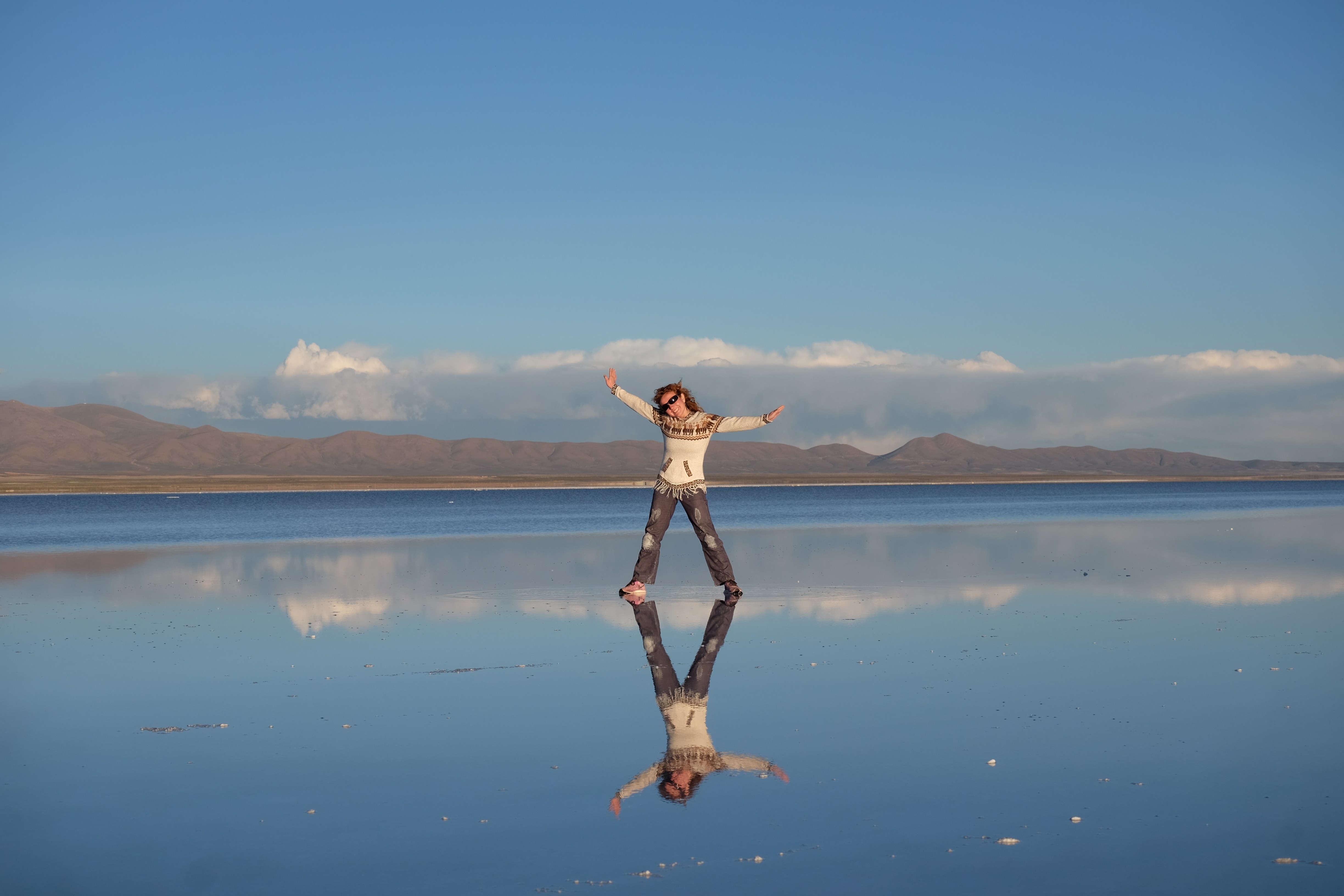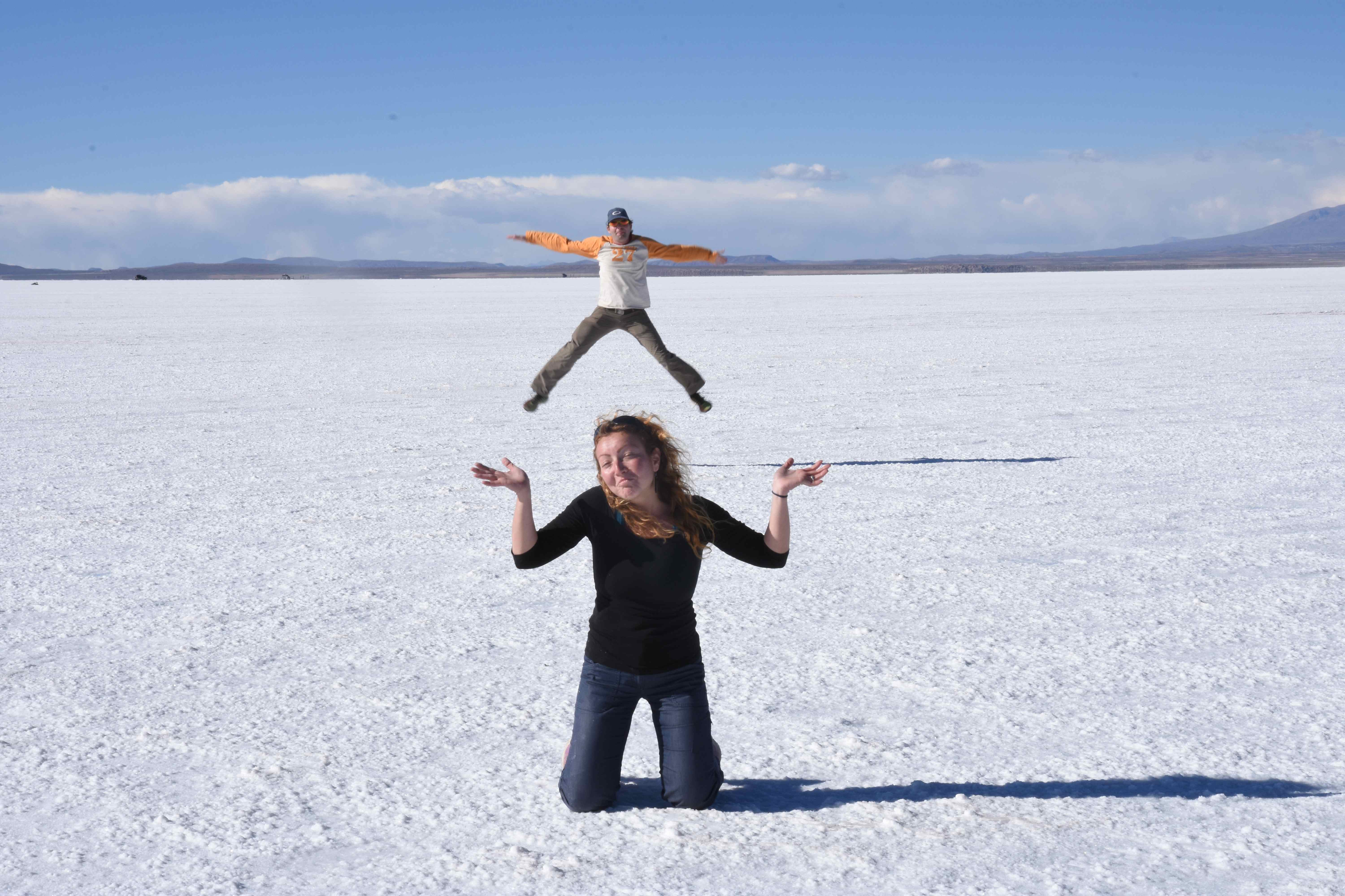 Nici nu va spun cat de mult ne-au fost depasite asteptarile: dupa pranz am parasit planeta pamant si am aterizat dintr-o data intr- lume necunoscuta, ireala si cu totul iesita din comun. Intinderi nesfarsite de alb, cristale de sare cat vedeai cu ochii, acumulari de apa care reflectau soarele si peisajul intr-o maniera vesela si jucausa, automobile colorate si incarcate cu turisti ramasi fara grai care circulau aici, iar noi ne aflam in mijlocul a toate acestea. Cum reusesti sa descrii asa ceva? De parca universul fusese vizitat de muza inspiratiei si ulterior avusese chef sa creeze ceva. A luat o imensitate de alb drept foaie goala si a inceput sa astearna cuvinte si idei cu peisaje, culori, tonuri, cu lumina si umbra. Se nascuse o opera de arta: un lac salin in toata frumusetea sa, apa il canta zilnic in oglindirea sa, soarele ii tinea companie, albul acum nu mai era asemeni unei foi goale, ci o multitudine de emotii, impresii si forme, care pareau extraterestre… atat de iesite din comun, incat soarele vroia sa vada aceasta scena la sfarsitul fiecarei zi si zabovea mai mult decat avea voie, parca nereusind sa isi ia ramas bun. Insa ce sunt cuvintele? Puterea acestora de expresie nu este nimic in comparatie cu peisajul magnific in sine. De aceea, va sfatuiesc sa va faceti propria imagine despre cele descrise, in timp ce noi incercam sa scapam de toata sarea pe care am acumulat-o (daca aveti nevoie cumva de sare pentru gratarul de seara, va rugam sa apelati la noi!) 🙂