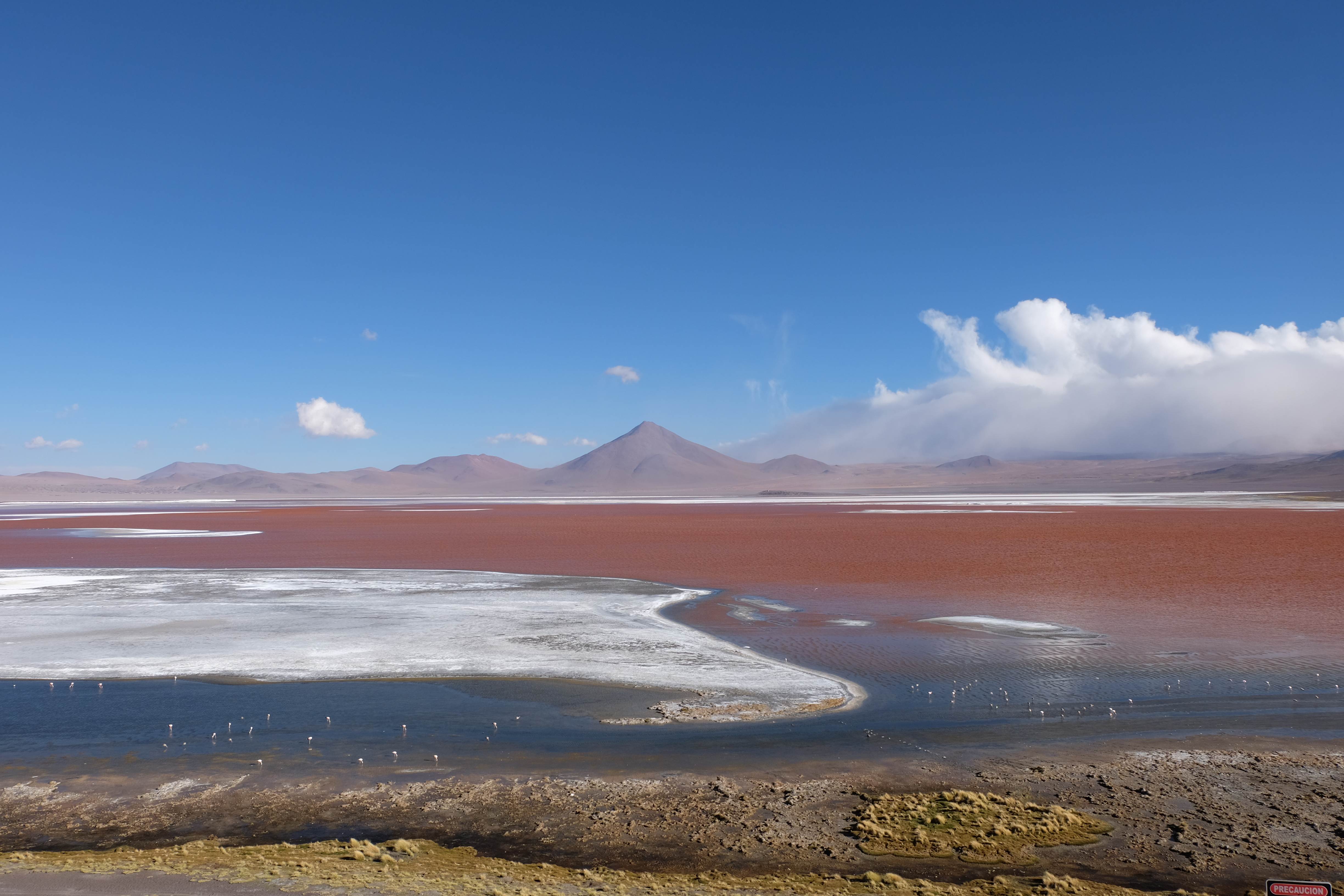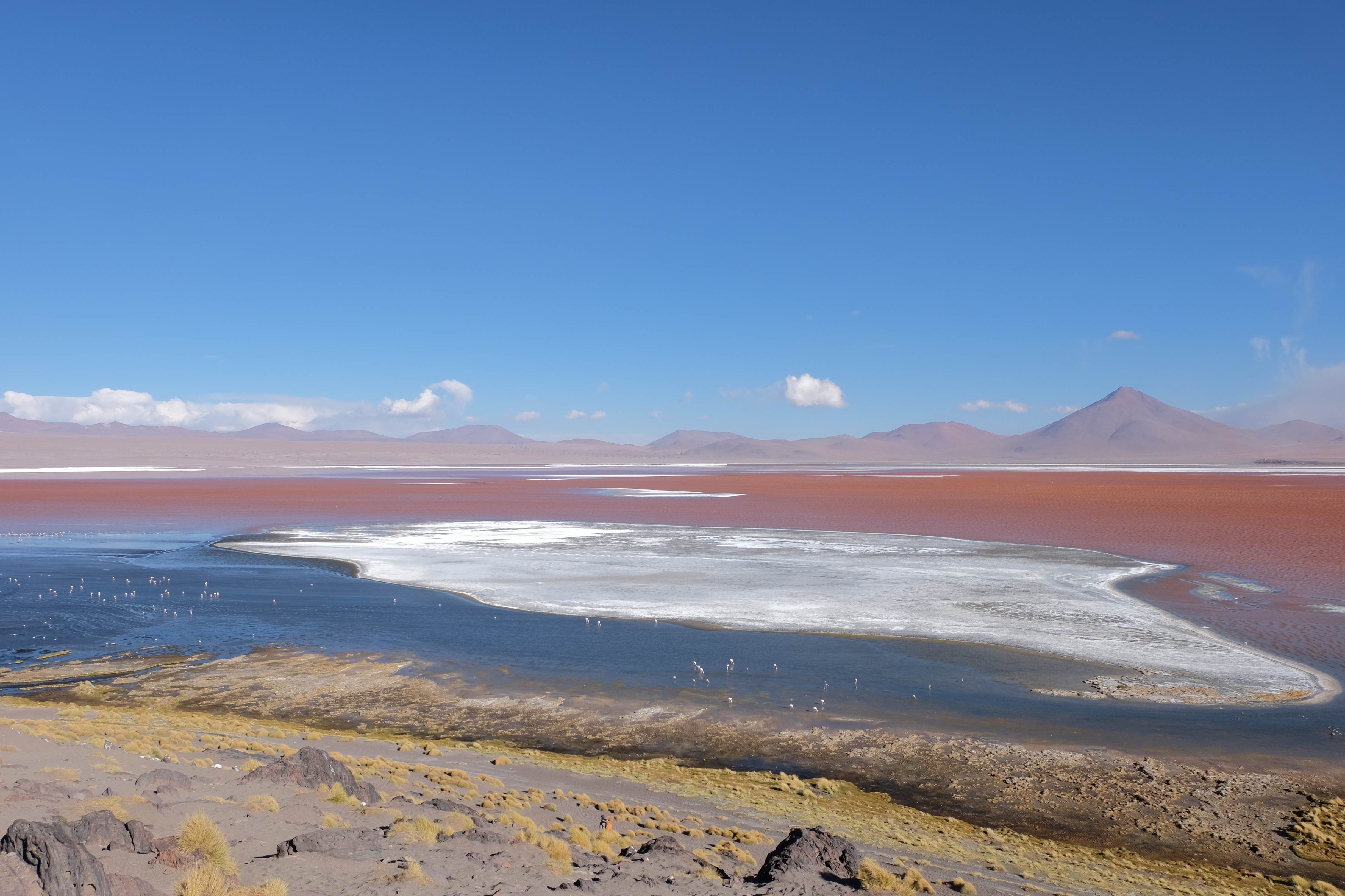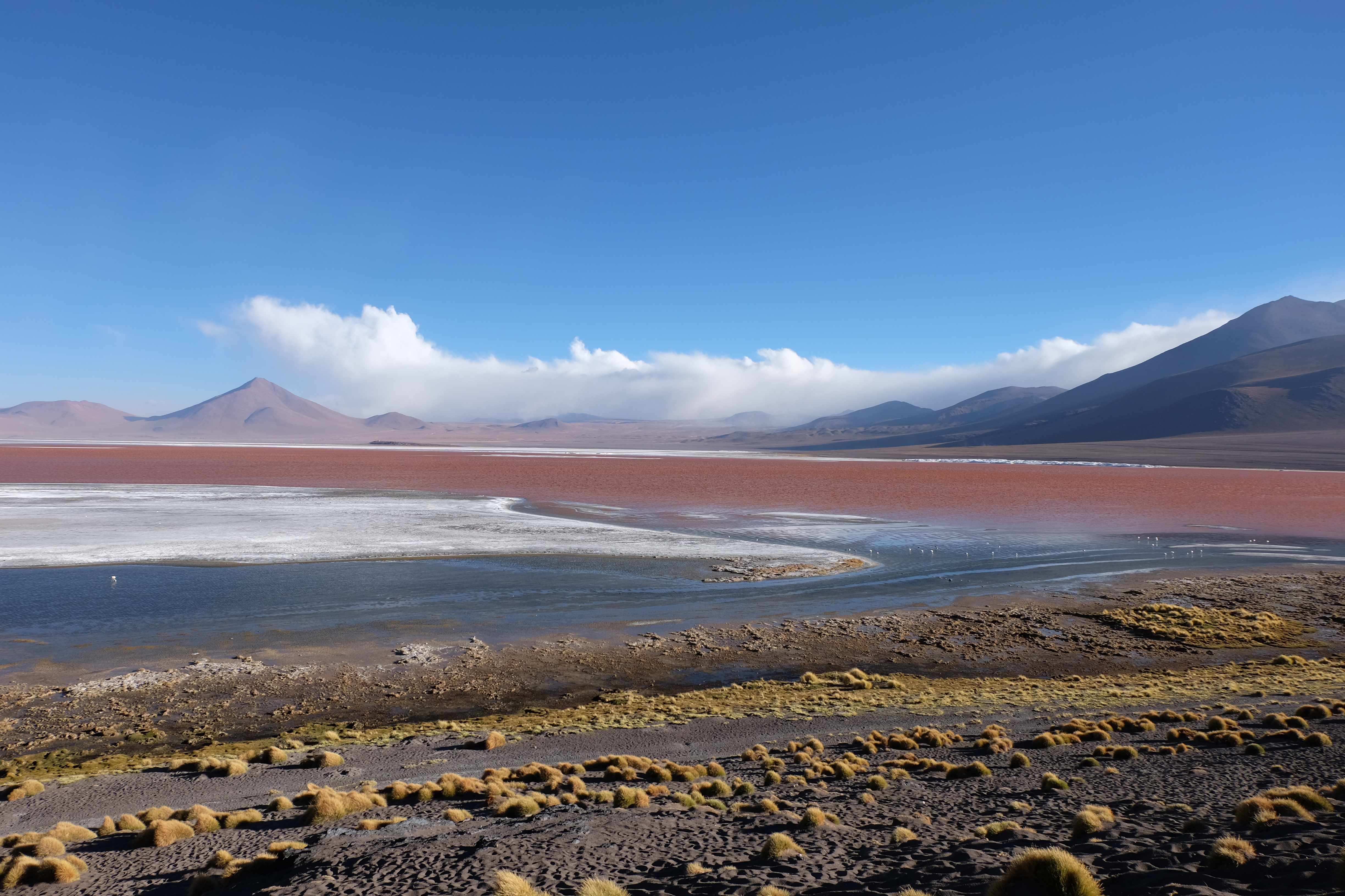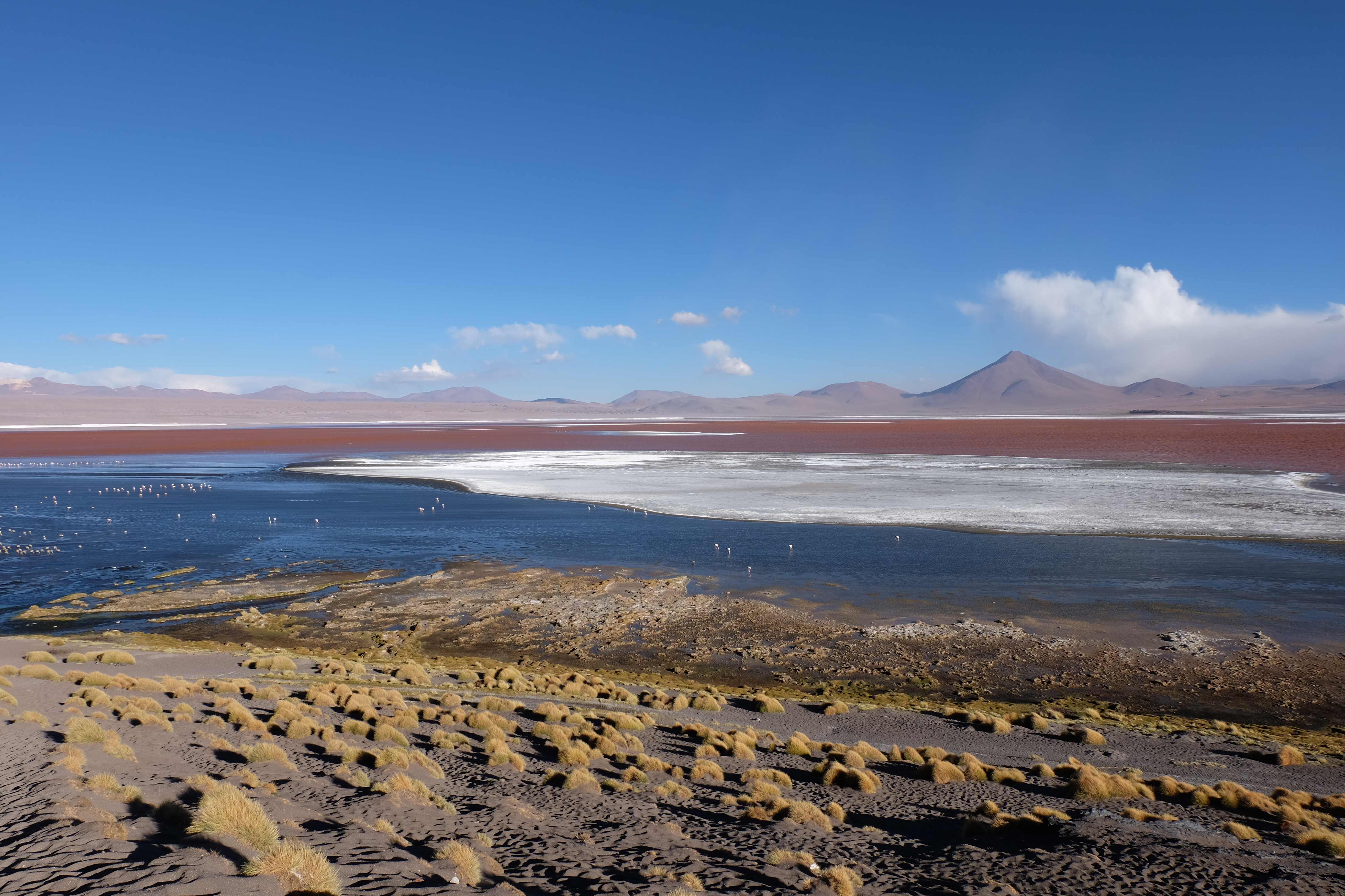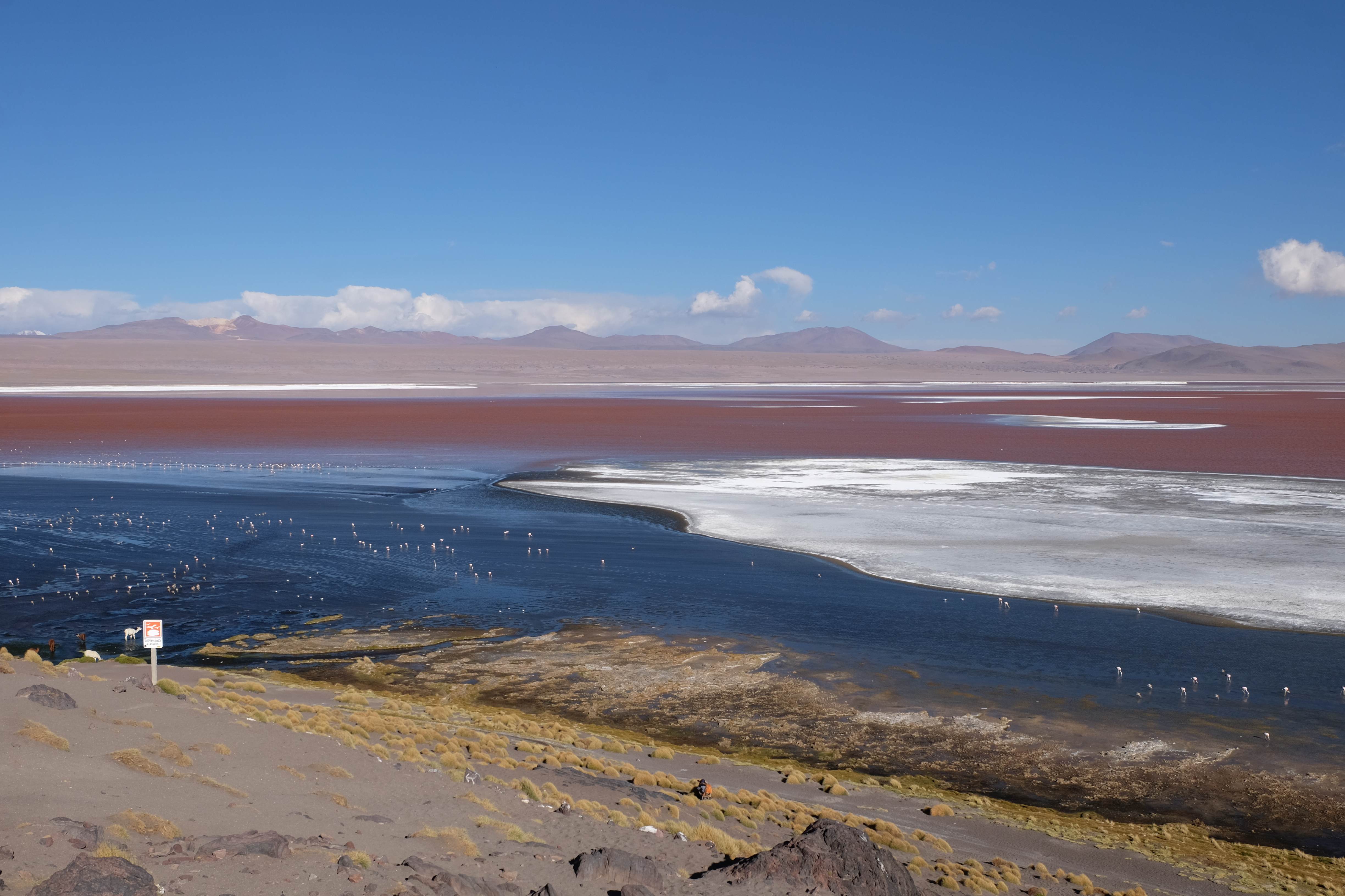 Kunst? Farbenpracht? Malerei? All diese Begriffe erhalten hierzulande eine neue Definition, spätestens wenn man an diesem Ort ankommt: Laguna Colorada. Monet mit seinen eindrücklichen impressionistischen Gemälden war ein Baby, nicht einmal ein Lehrling der Natur hätte er sein können. Auf einer Höhe von knapp 5000 m, in welcher der Wind sich unbedingt behaupten möchte und die Landschaft dermassen unfreundlich gestaltet, fing die Mutter Erde an die Symphonie der Farben zu komponieren. Sie mischte das Blau des eiskalten Wassers mit dem leidenschaftlichen Rot der Meeresalgen, welche fast sagen wollten, dass es trotz Kälte im Meer viele Geheimnisse zu entdecken gibt. Sie mischte das Hellblau des vor lauter Schönheit erstarrten Himmels mit dem seltenen Grün der mutigsten Pflanzen, die sich trotz Witterungen entschieden da zu blühen und zum Wunderklang beizutragen. Und als dieser Rahmen bereit war, warf sie einige Farbentöne hinein: die zart-rosafarbigen Flamingos, welche aus lauter Neugierde die Meeresgeheimnisse zu kennen immer mehr von den roten Algen assen und somit immer rötlicher wurden; die weissen, braunen und schwarzen Lamas, welche einen doch daran erinnern sollten, dass man sich im Herzen der Gebirge befand und die weissen Wolken, leere Gedankenblasen, welche die Sprachlosigkeit des menschlichen Wesen vor einer solchen Schönheit verkörperten. Da war das Meisterwerk der Mutter Natur vollbracht, die Symphonie der Farben eine Tatsache und ihr Klang einfach magisch. Aber hört doch selber zu: