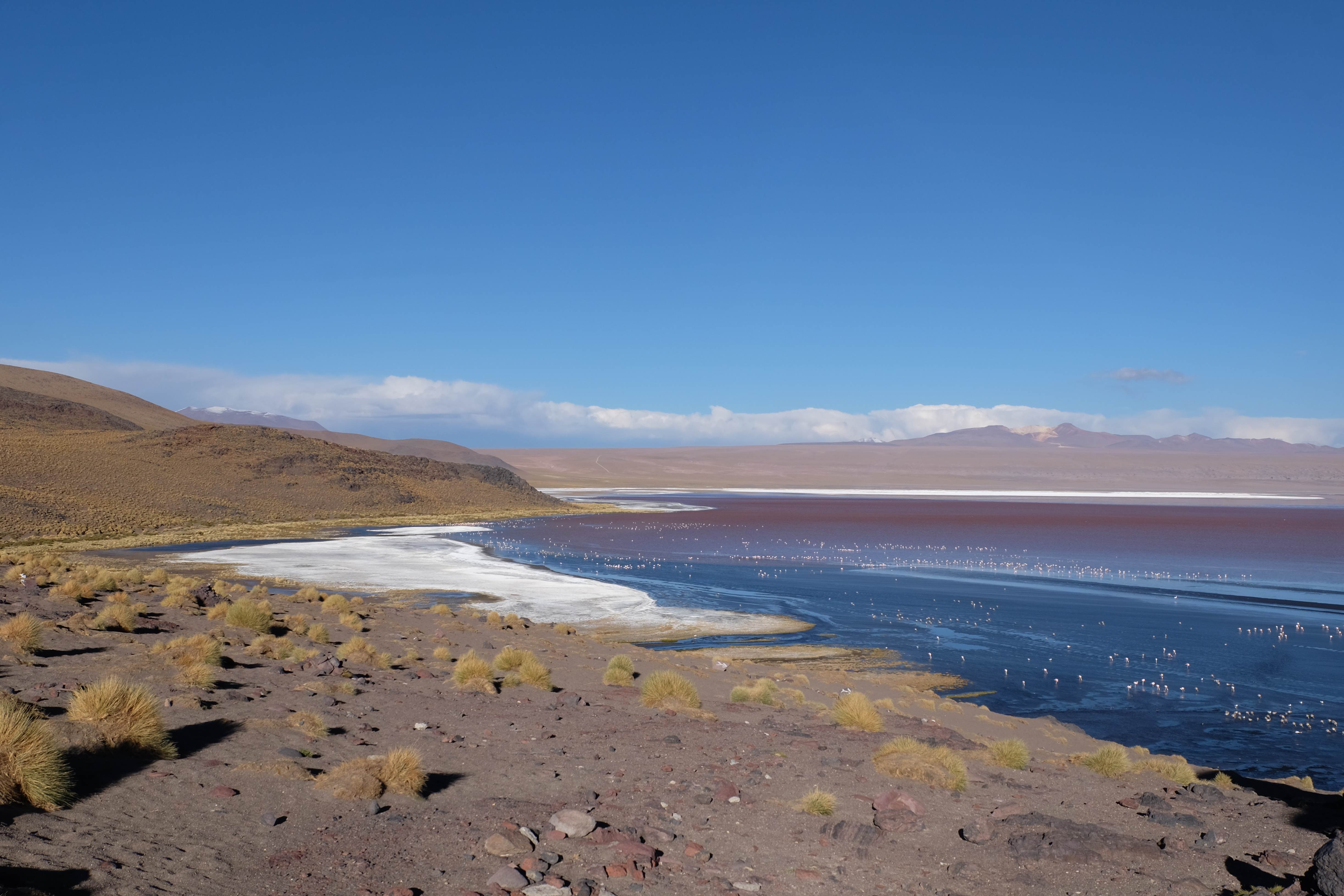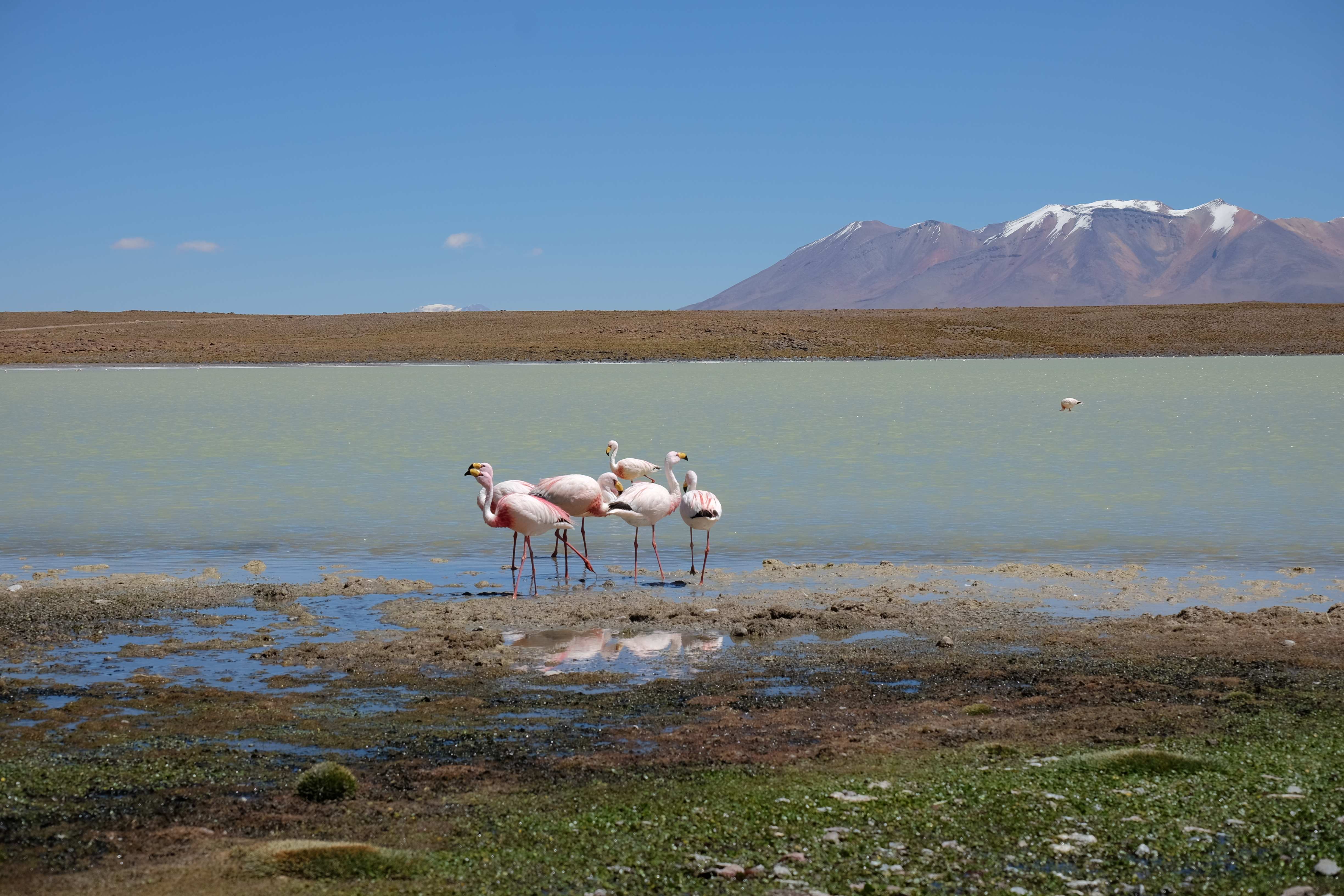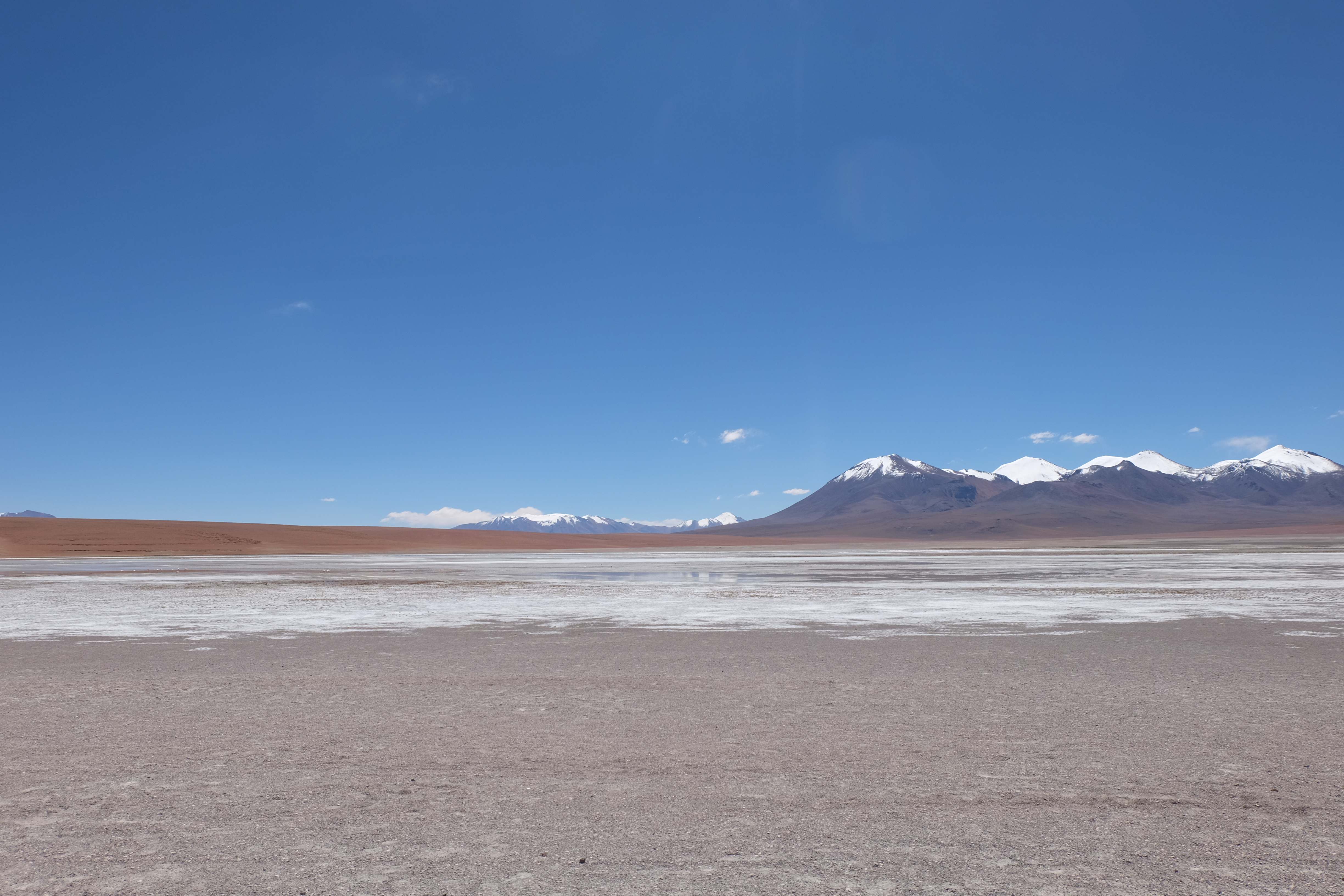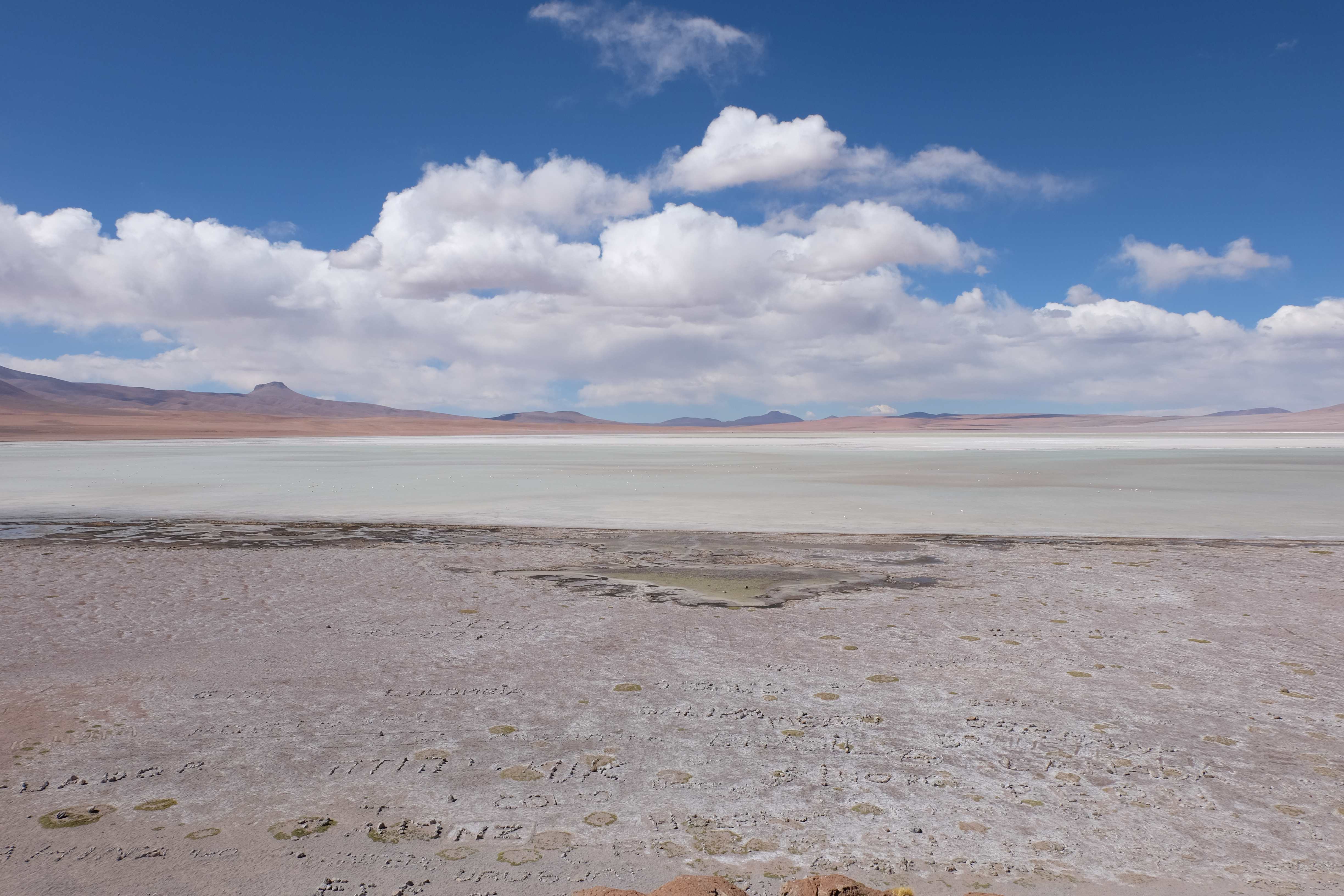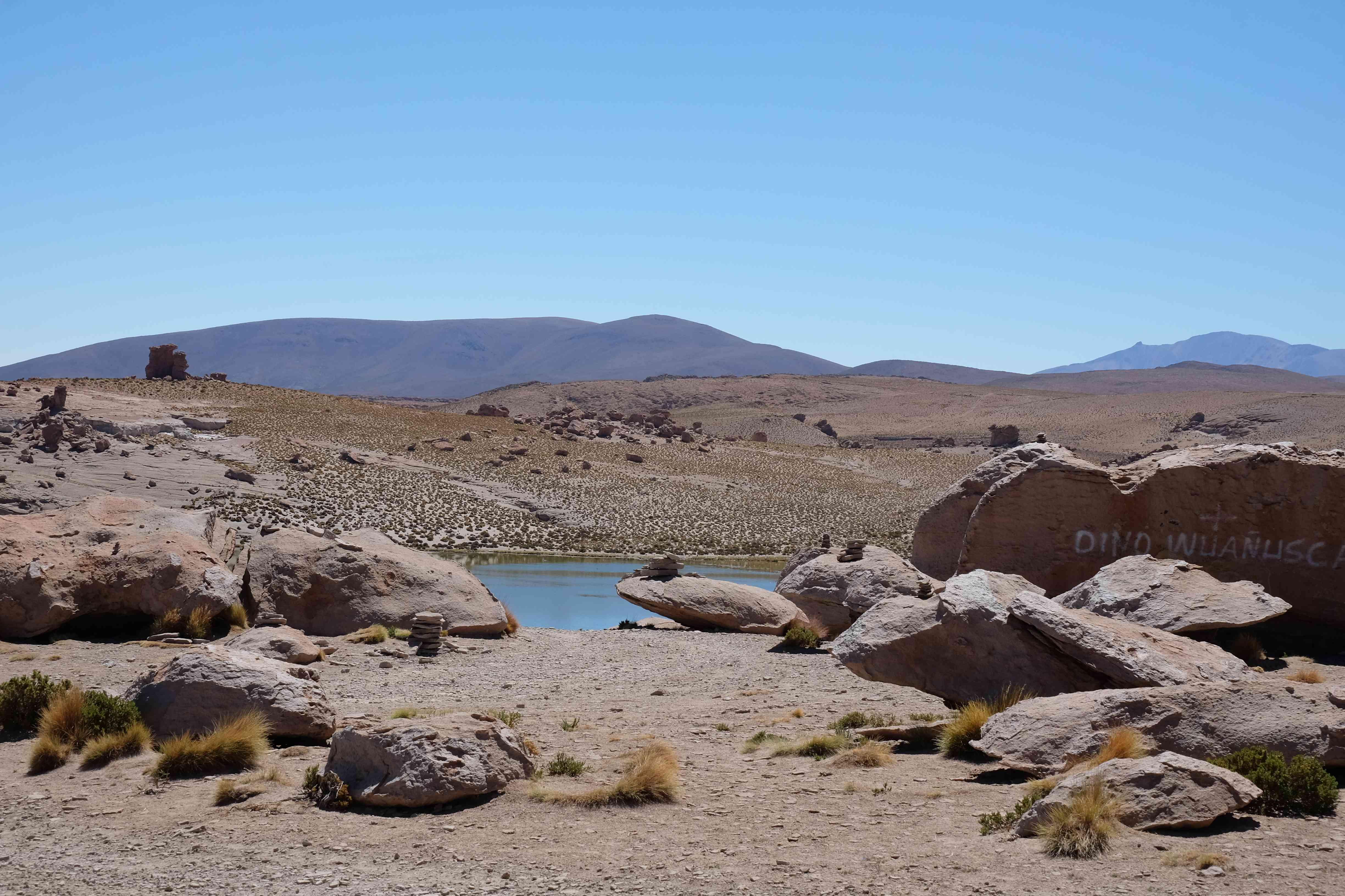 Kunst? Farbenpracht? Malerei? All diese Begriffe erhalten hierzulande eine neue Definition, spätestens wenn man an diesem Ort ankommt: Laguna Colorada. Monet mit seinen eindrücklichen impressionistischen Gemälden war ein Baby, nicht einmal ein Lehrling der Natur hätte er sein können. Auf einer Höhe von knapp 5000 m, in welcher der Wind sich unbedingt behaupten möchte und die Landschaft dermassen unfreundlich gestaltet, fing die Mutter Erde an die Symphonie der Farben zu komponieren. Sie mischte das Blau des eiskalten Wassers mit dem leidenschaftlichen Rot der Meeresalgen, welche fast sagen wollten, dass es trotz Kälte im Meer viele Geheimnisse zu entdecken gibt. Sie mischte das Hellblau des vor lauter Schönheit erstarrten Himmels mit dem seltenen Grün der mutigsten Pflanzen, die sich trotz Witterungen entschieden da zu blühen und zum Wunderklang beizutragen. Und als dieser Rahmen bereit war, warf sie einige Farbentöne hinein: die zart-rosafarbigen Flamingos, welche aus lauter Neugierde die Meeresgeheimnisse zu kennen immer mehr von den roten Algen assen und somit immer rötlicher wurden; die weissen, braunen und schwarzen Lamas, welche einen doch daran erinnern sollten, dass man sich im Herzen der Gebirge befand und die weissen Wolken, leere Gedankenblasen, welche die Sprachlosigkeit des menschlichen Wesen vor einer solchen Schönheit verkörperten. Da war das Meisterwerk der Mutter Natur vollbracht, die Symphonie der Farben eine Tatsache und ihr Klang einfach magisch. Aber hört doch selber zu: