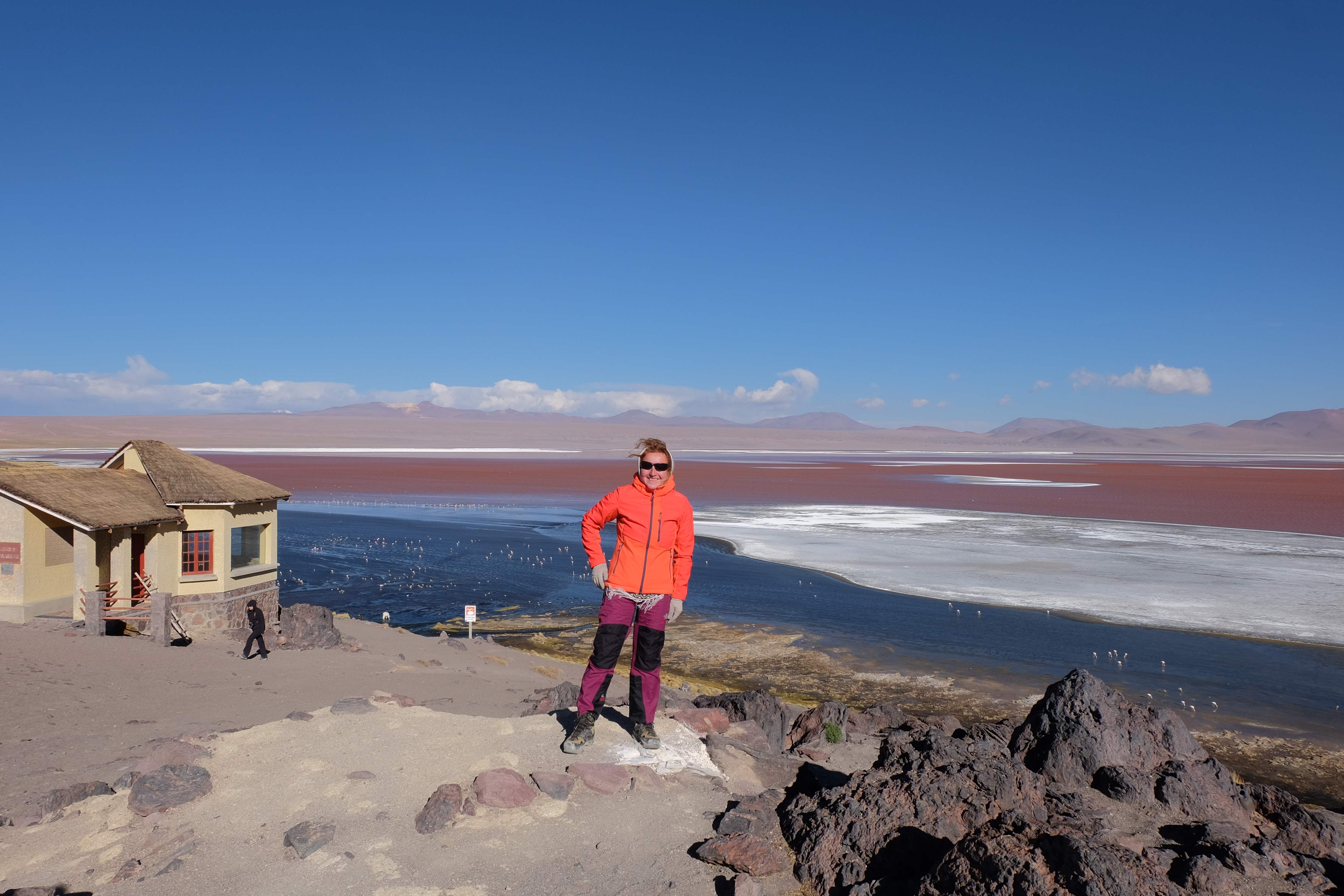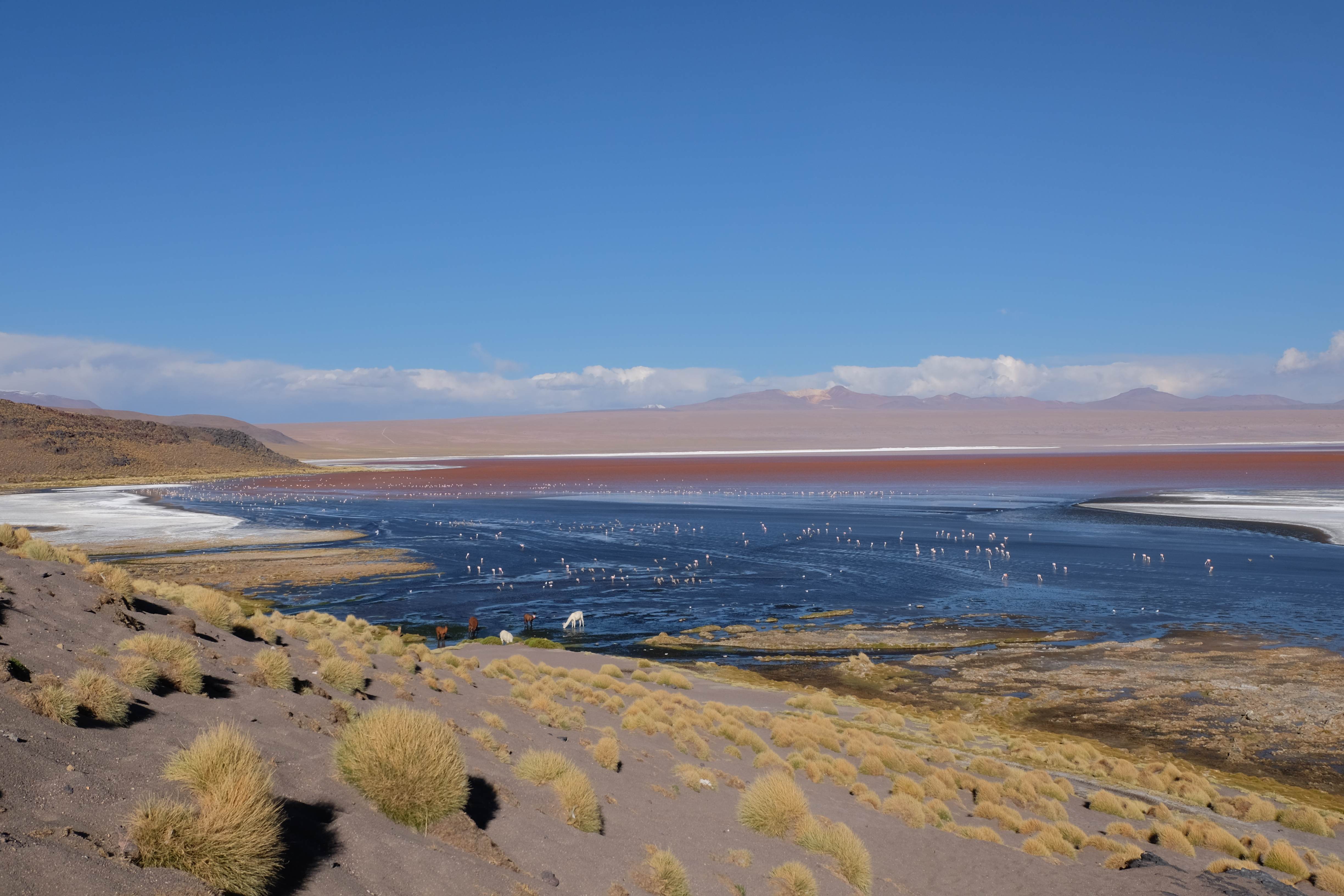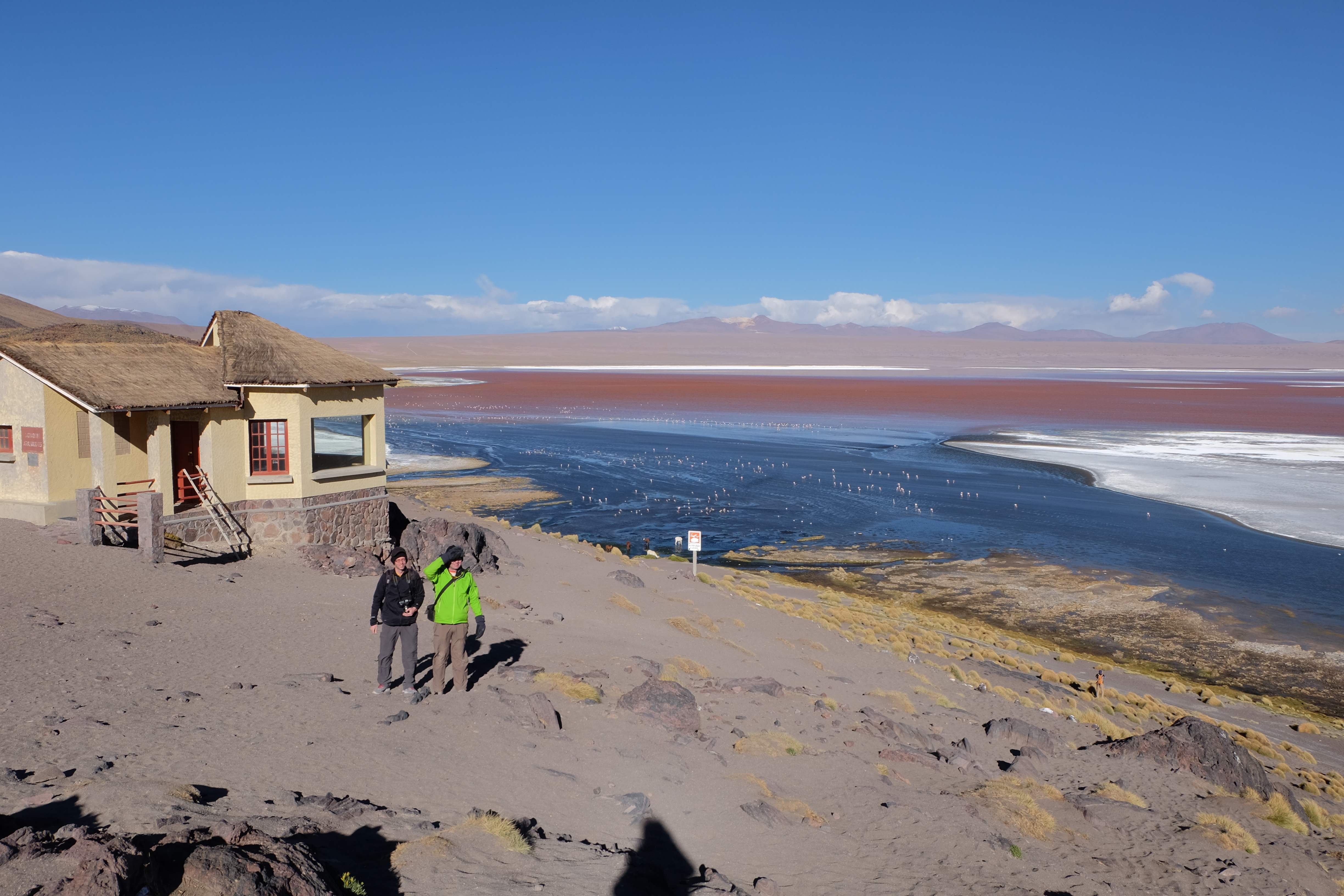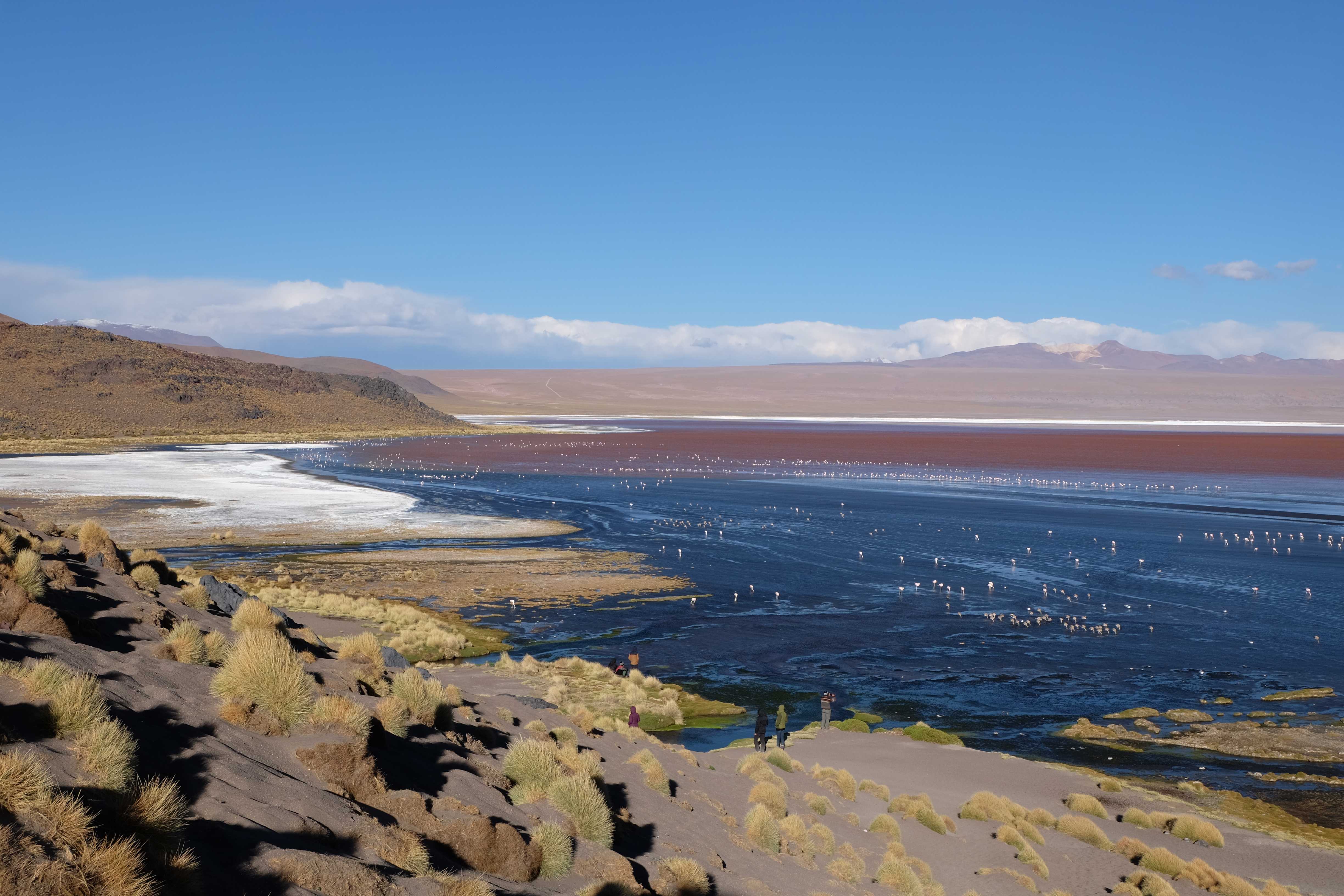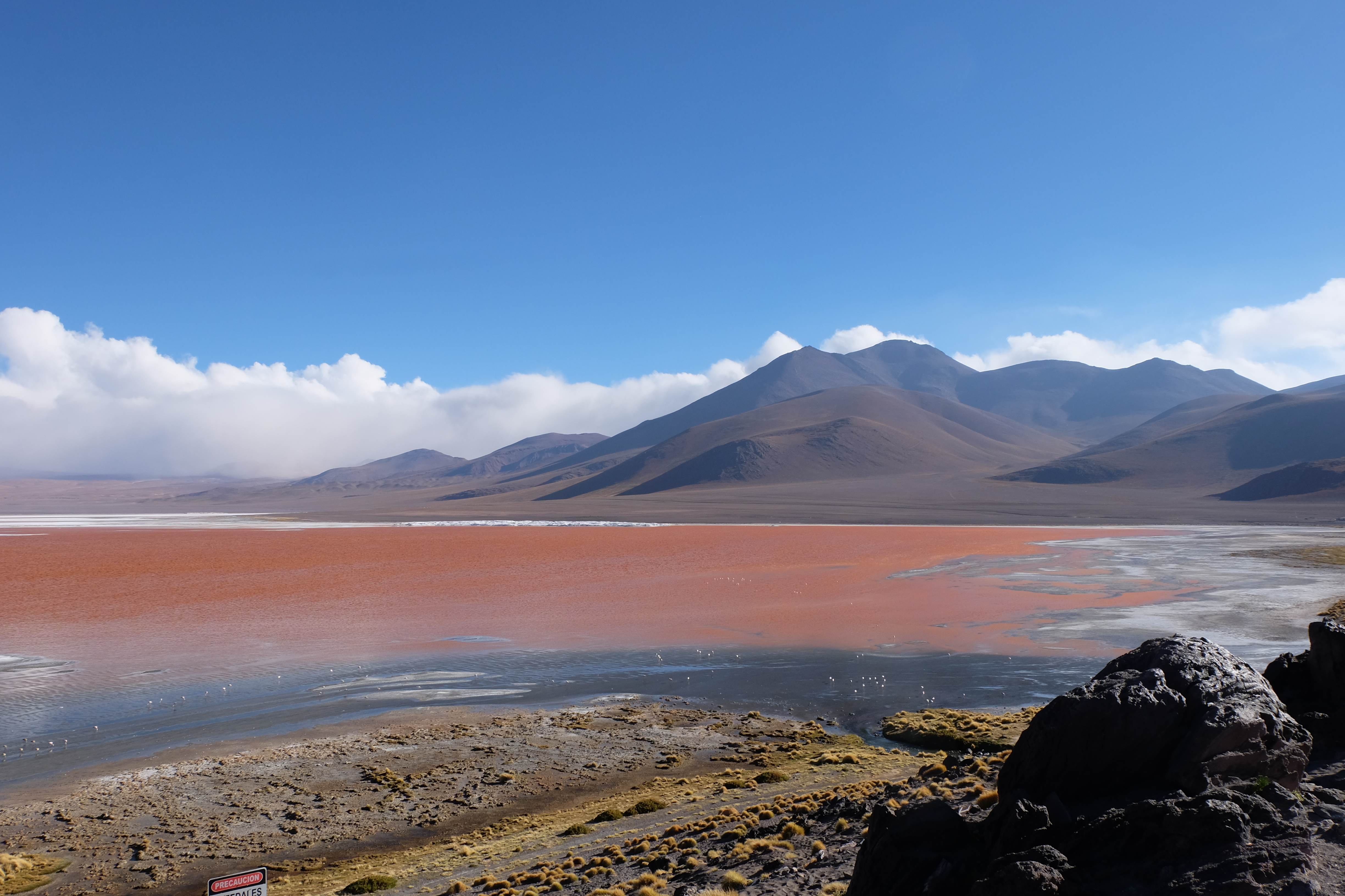 Kunst? Farbenpracht? Malerei? All diese Begriffe erhalten hierzulande eine neue Definition, spätestens wenn man an diesem Ort ankommt: Laguna Colorada. Monet mit seinen eindrücklichen impressionistischen Gemälden war ein Baby, nicht einmal ein Lehrling der Natur hätte er sein können. Auf einer Höhe von knapp 5000 m, in welcher der Wind sich unbedingt behaupten möchte und die Landschaft dermassen unfreundlich gestaltet, fing die Mutter Erde an die Symphonie der Farben zu komponieren. Sie mischte das Blau des eiskalten Wassers mit dem leidenschaftlichen Rot der Meeresalgen, welche fast sagen wollten, dass es trotz Kälte im Meer viele Geheimnisse zu entdecken gibt. Sie mischte das Hellblau des vor lauter Schönheit erstarrten Himmels mit dem seltenen Grün der mutigsten Pflanzen, die sich trotz Witterungen entschieden da zu blühen und zum Wunderklang beizutragen. Und als dieser Rahmen bereit war, warf sie einige Farbentöne hinein: die zart-rosafarbigen Flamingos, welche aus lauter Neugierde die Meeresgeheimnisse zu kennen immer mehr von den roten Algen assen und somit immer rötlicher wurden; die weissen, braunen und schwarzen Lamas, welche einen doch daran erinnern sollten, dass man sich im Herzen der Gebirge befand und die weissen Wolken, leere Gedankenblasen, welche die Sprachlosigkeit des menschlichen Wesen vor einer solchen Schönheit verkörperten. Da war das Meisterwerk der Mutter Natur vollbracht, die Symphonie der Farben eine Tatsache und ihr Klang einfach magisch. Aber hört doch selber zu: