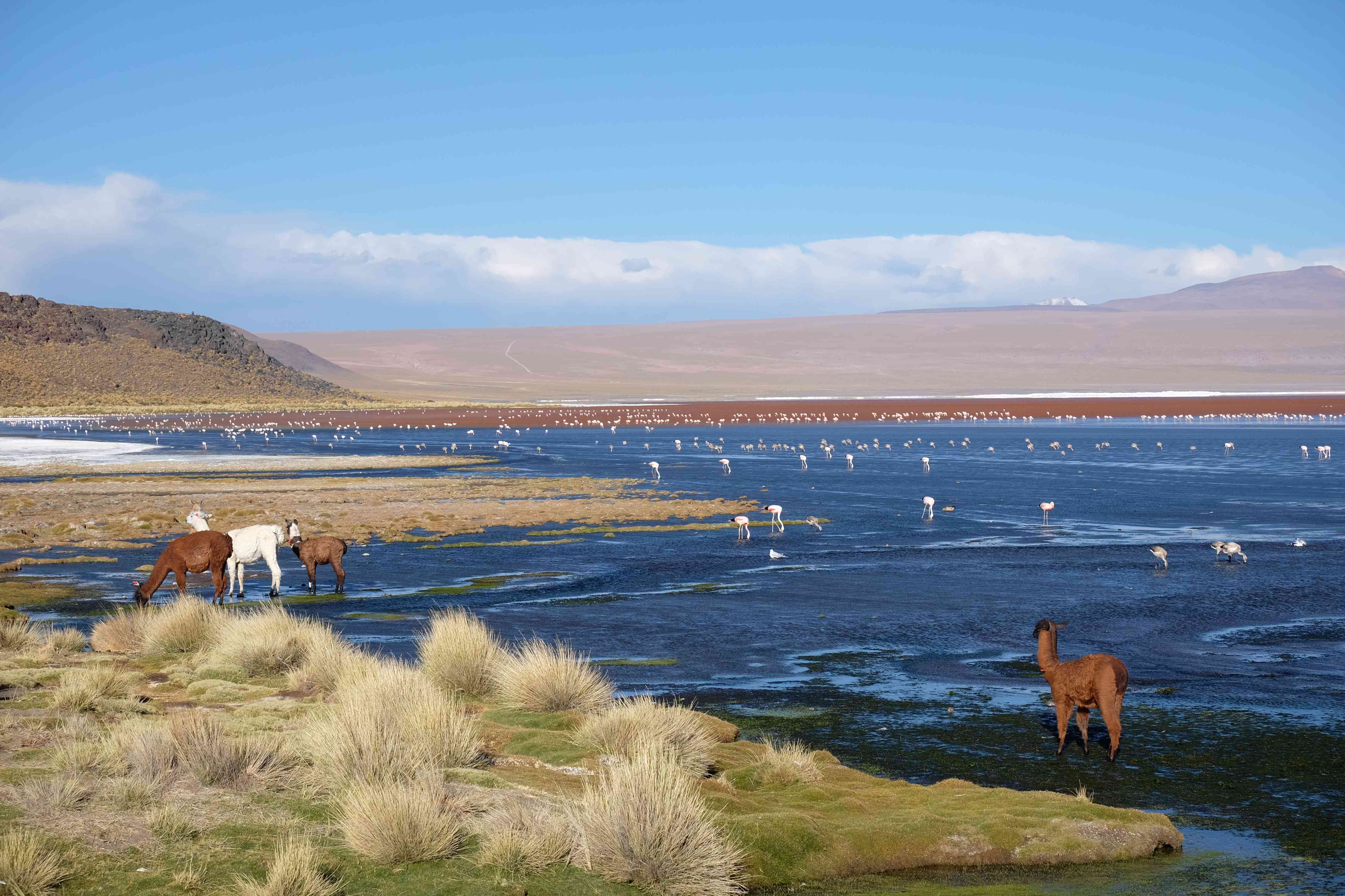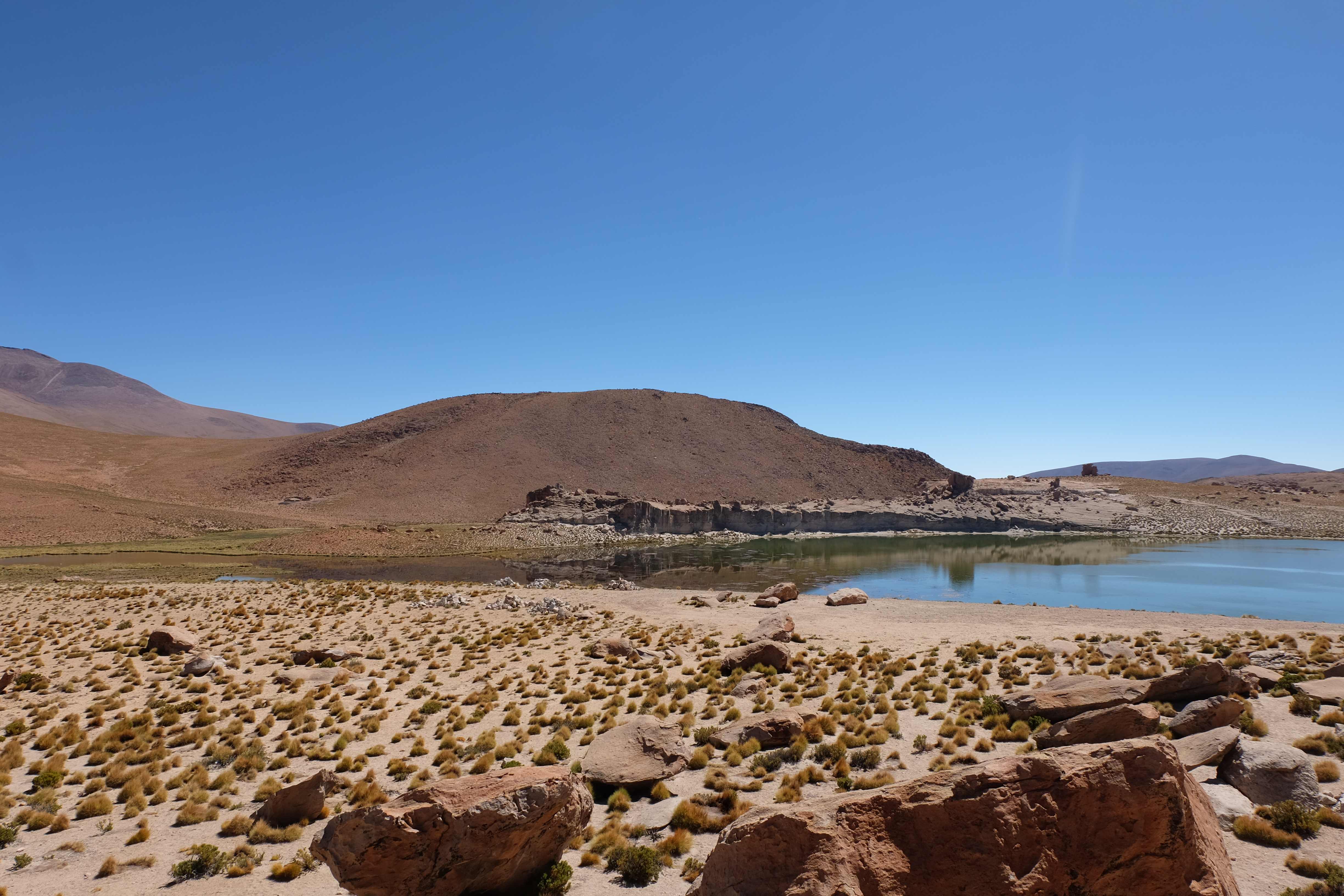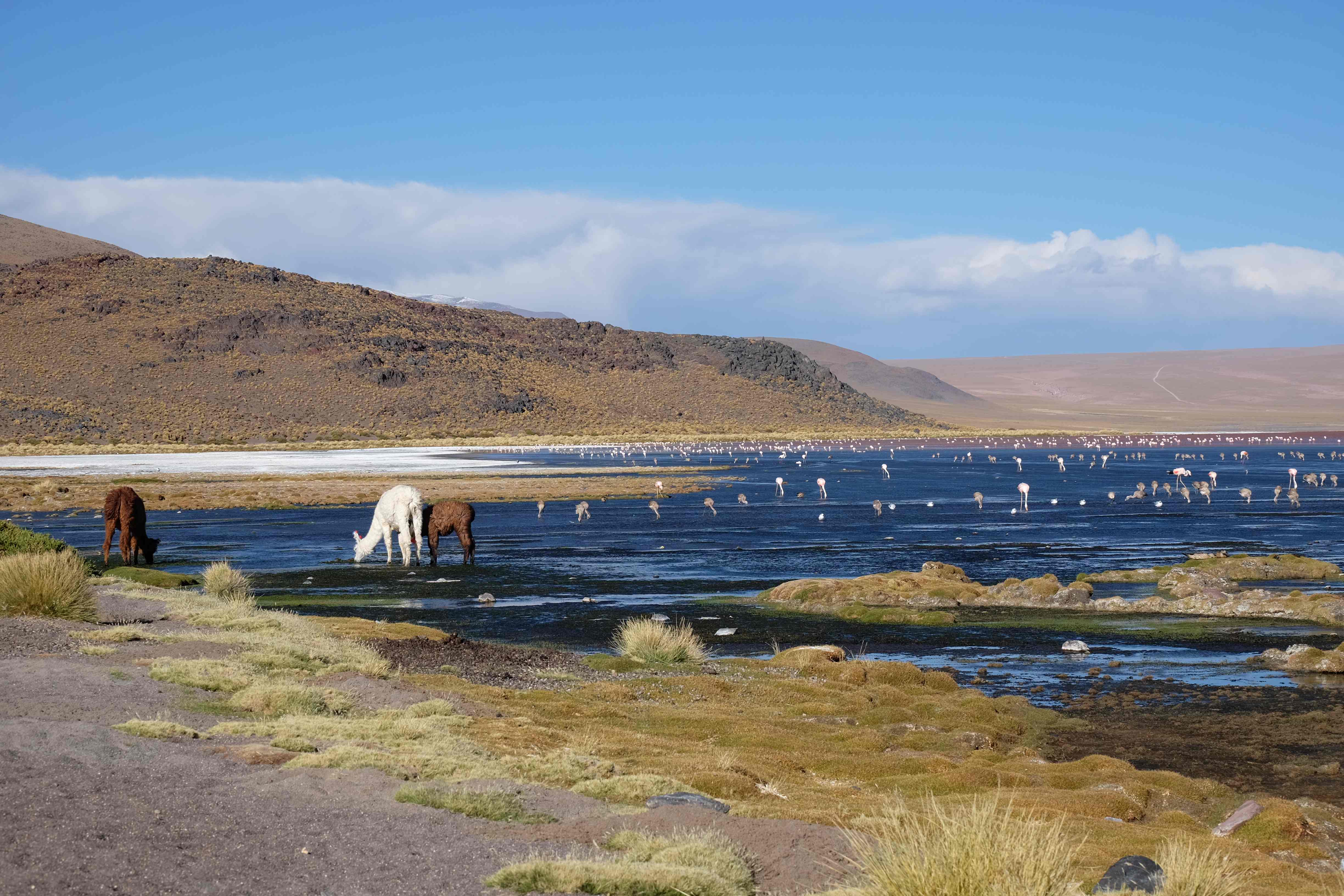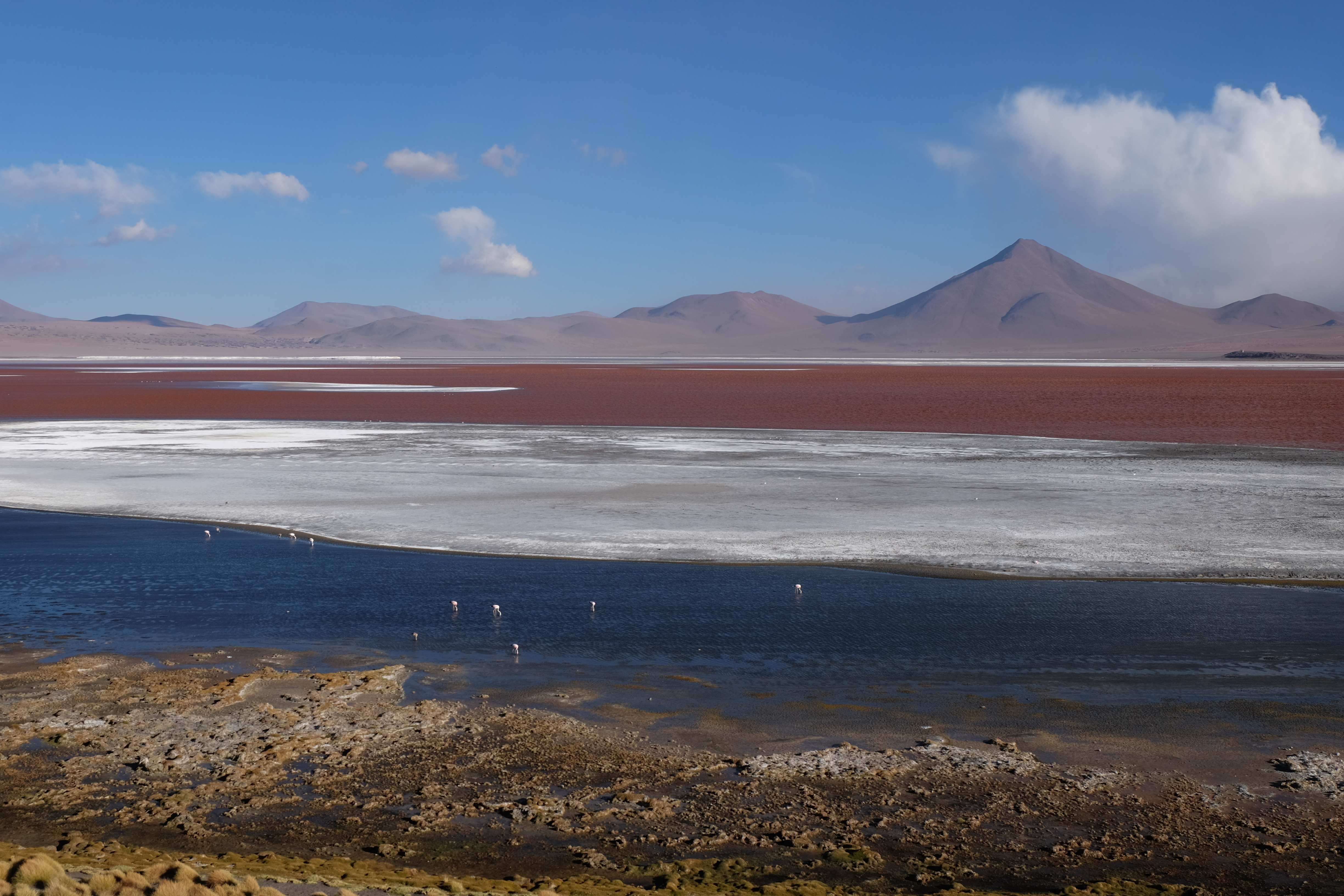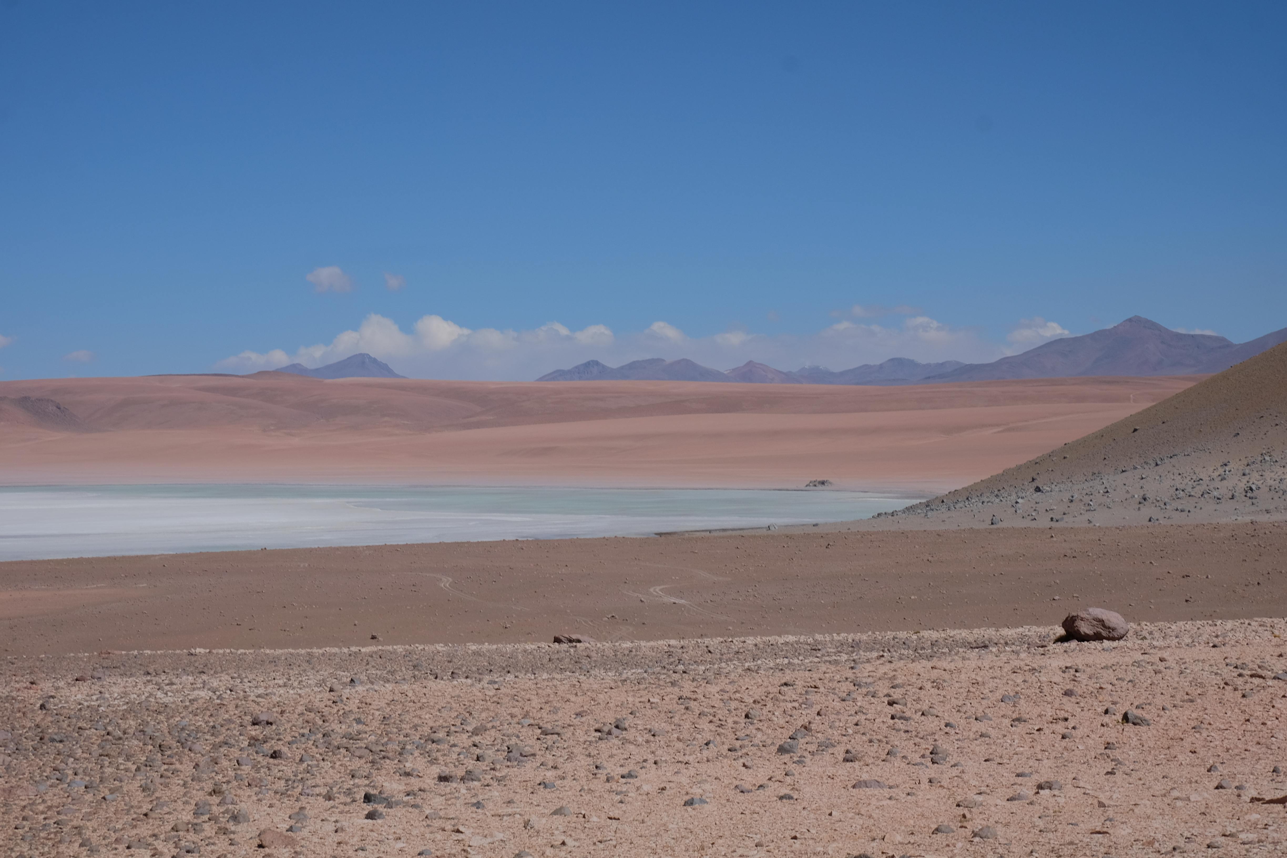 Kunst? Farbenpracht? Malerei? All diese Begriffe erhalten hierzulande eine neue Definition, spätestens wenn man an diesem Ort ankommt: Laguna Colorada. Monet mit seinen eindrücklichen impressionistischen Gemälden war ein Baby, nicht einmal ein Lehrling der Natur hätte er sein können. Auf einer Höhe von knapp 5000 m, in welcher der Wind sich unbedingt behaupten möchte und die Landschaft dermassen unfreundlich gestaltet, fing die Mutter Erde an die Symphonie der Farben zu komponieren. Sie mischte das Blau des eiskalten Wassers mit dem leidenschaftlichen Rot der Meeresalgen, welche fast sagen wollten, dass es trotz Kälte im Meer viele Geheimnisse zu entdecken gibt. Sie mischte das Hellblau des vor lauter Schönheit erstarrten Himmels mit dem seltenen Grün der mutigsten Pflanzen, die sich trotz Witterungen entschieden da zu blühen und zum Wunderklang beizutragen. Und als dieser Rahmen bereit war, warf sie einige Farbentöne hinein: die zart-rosafarbigen Flamingos, welche aus lauter Neugierde die Meeresgeheimnisse zu kennen immer mehr von den roten Algen assen und somit immer rötlicher wurden; die weissen, braunen und schwarzen Lamas, welche einen doch daran erinnern sollten, dass man sich im Herzen der Gebirge befand und die weissen Wolken, leere Gedankenblasen, welche die Sprachlosigkeit des menschlichen Wesen vor einer solchen Schönheit verkörperten. Da war das Meisterwerk der Mutter Natur vollbracht, die Symphonie der Farben eine Tatsache und ihr Klang einfach magisch. Aber hört doch selber zu: