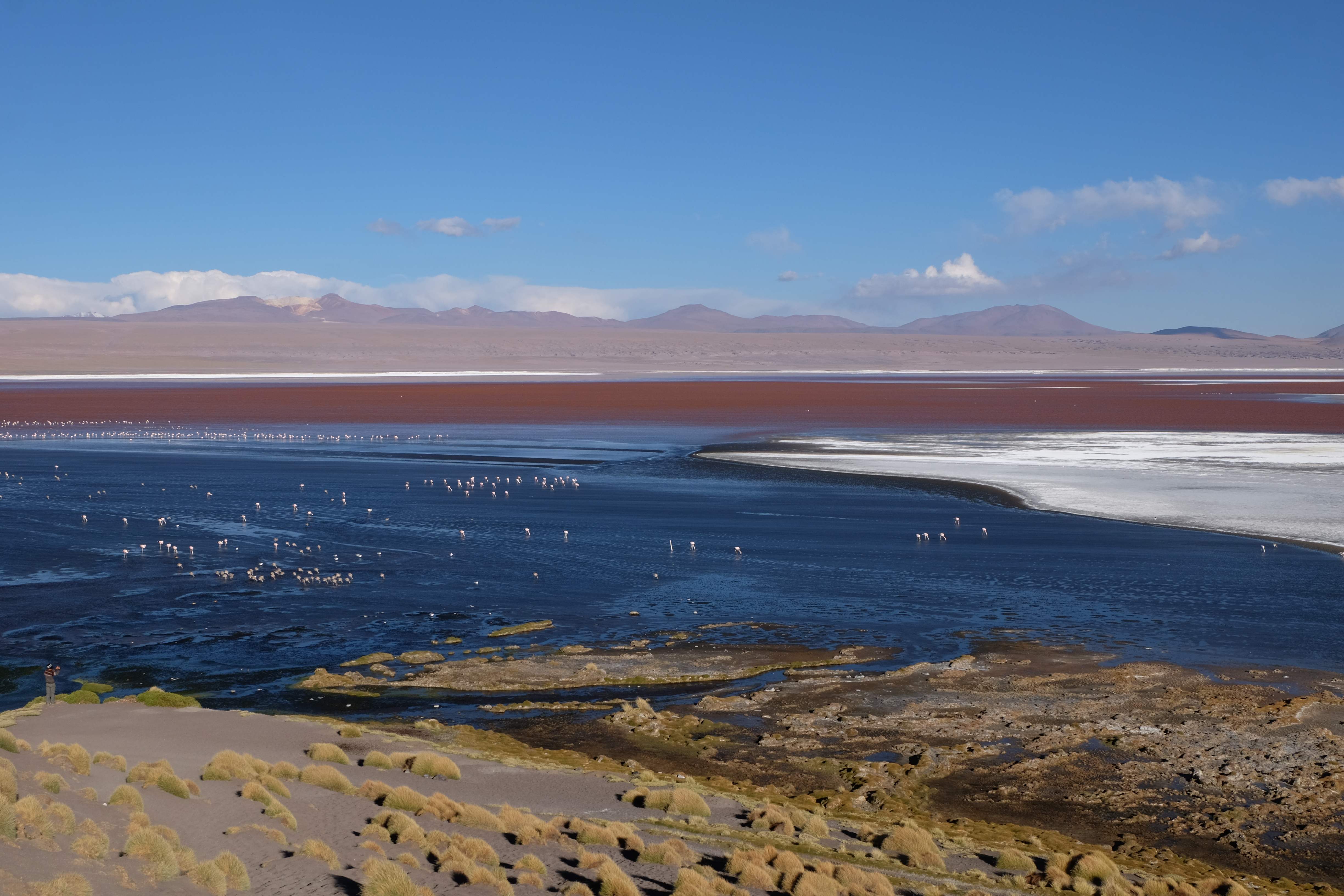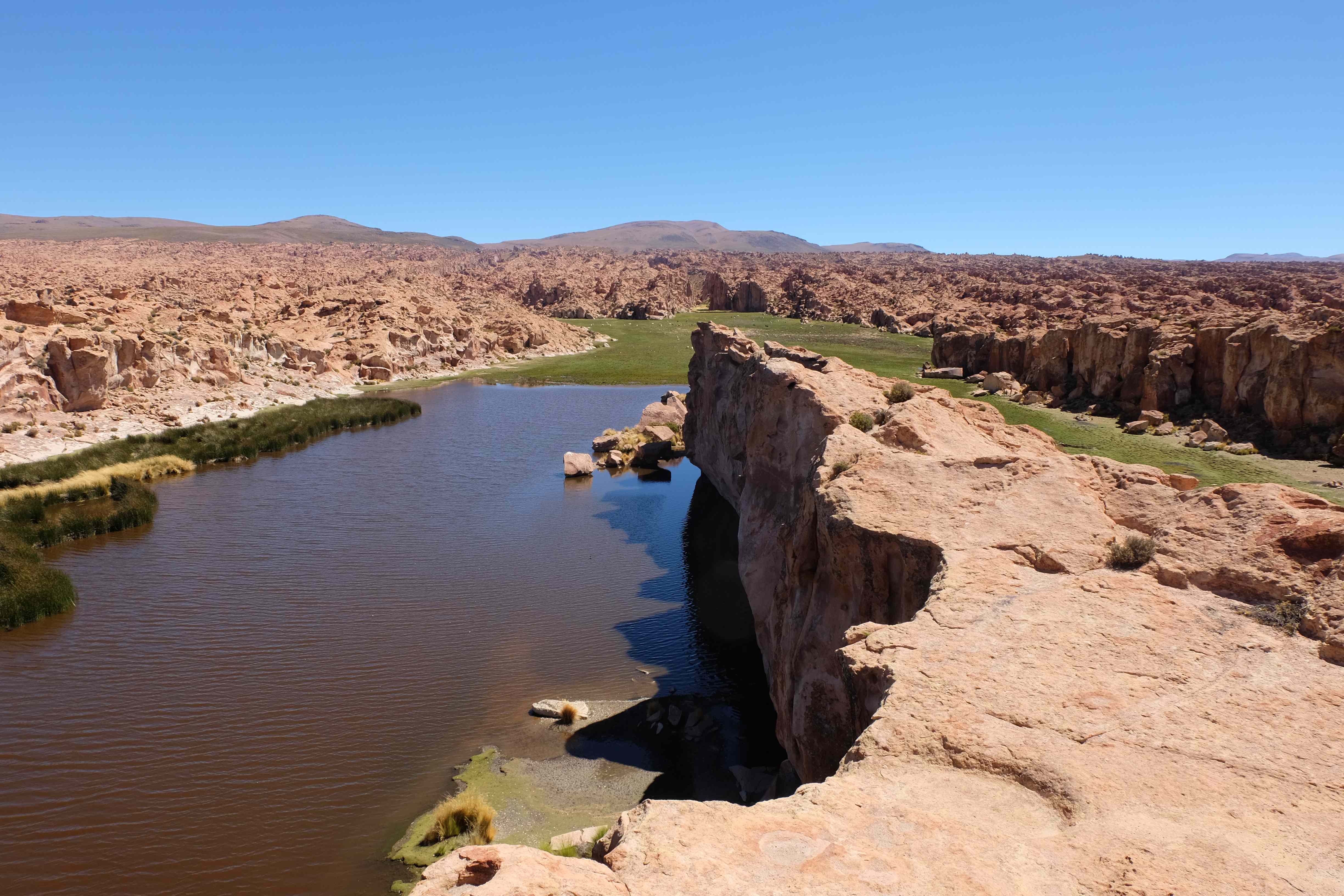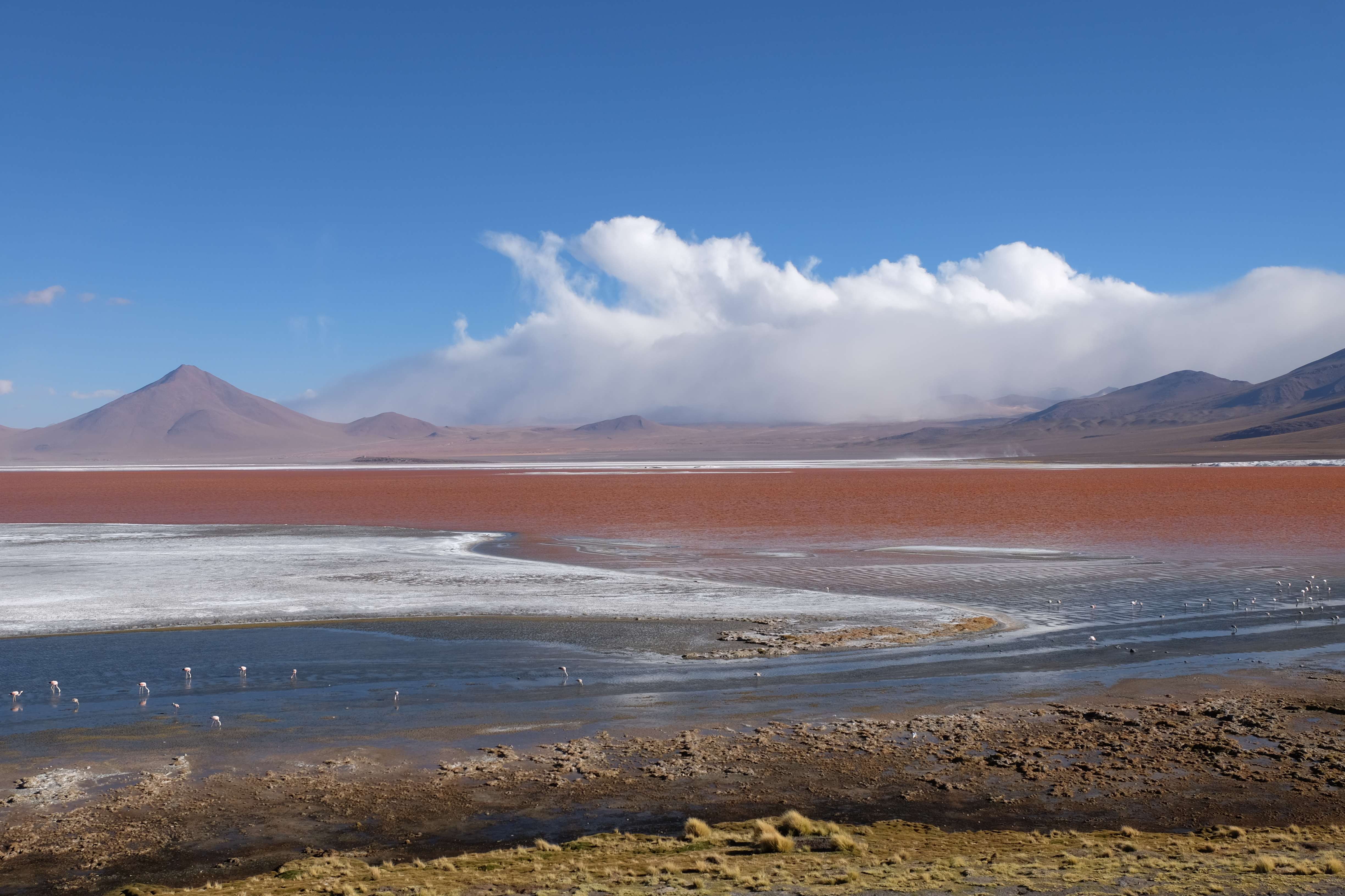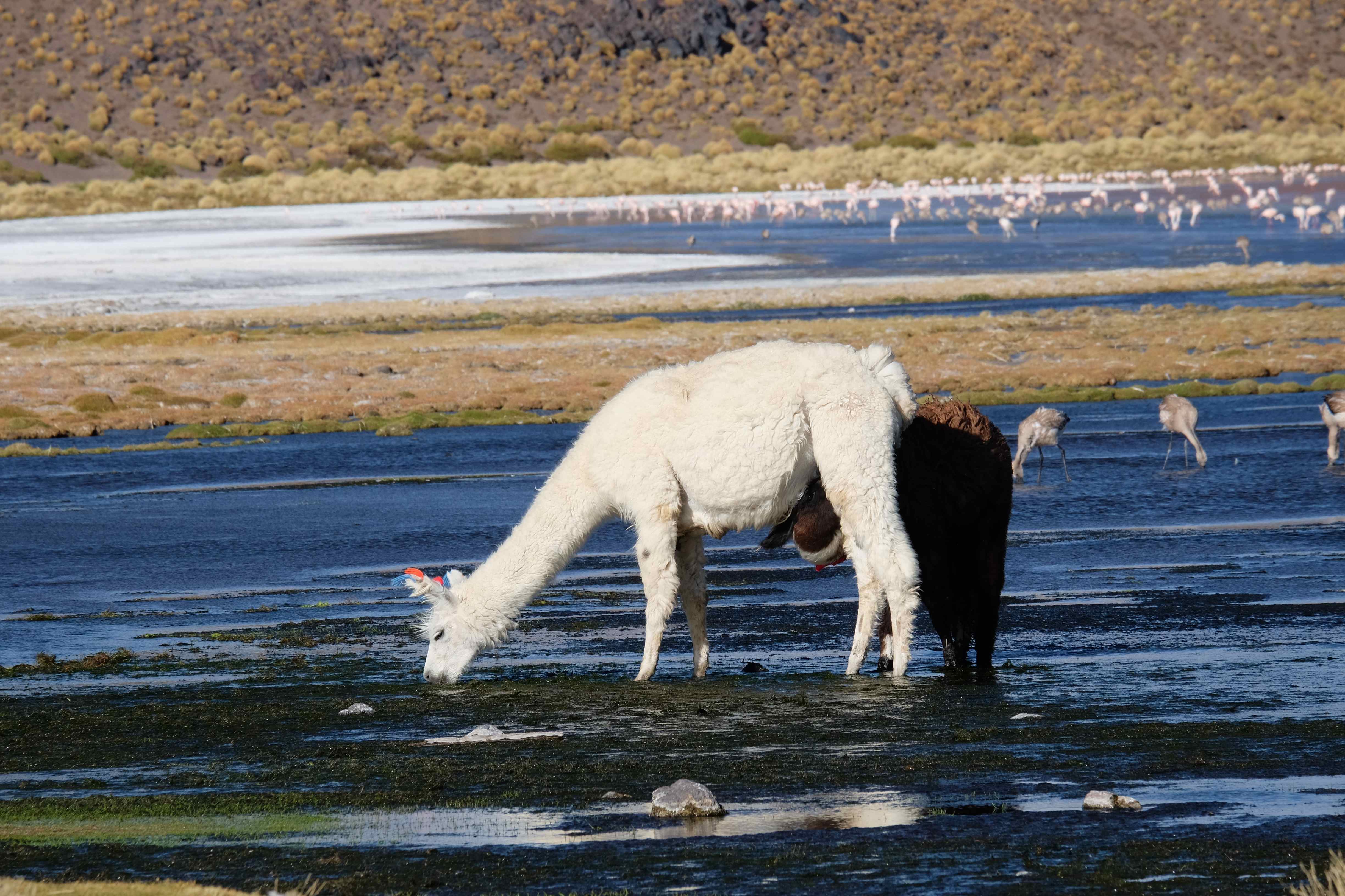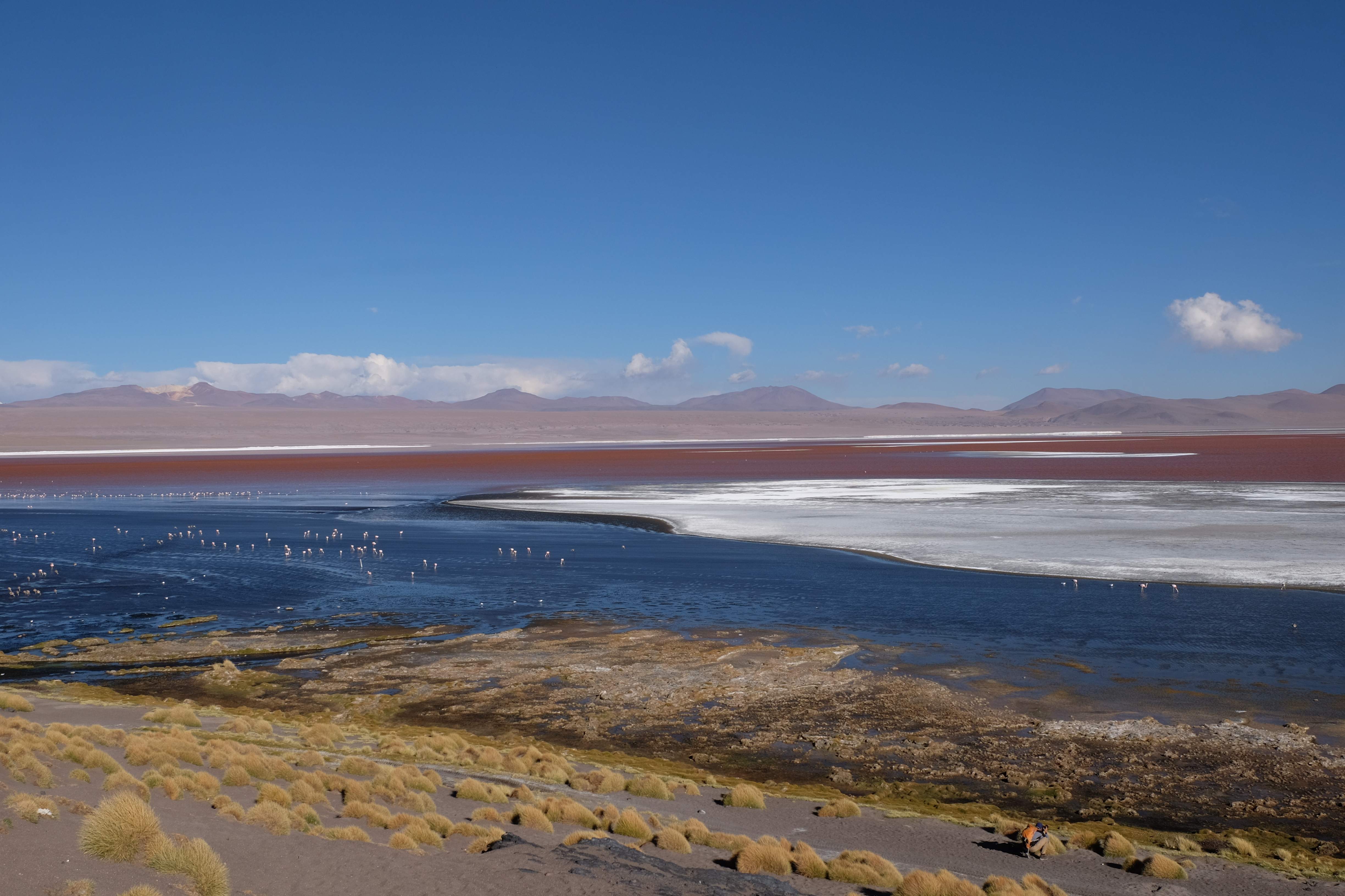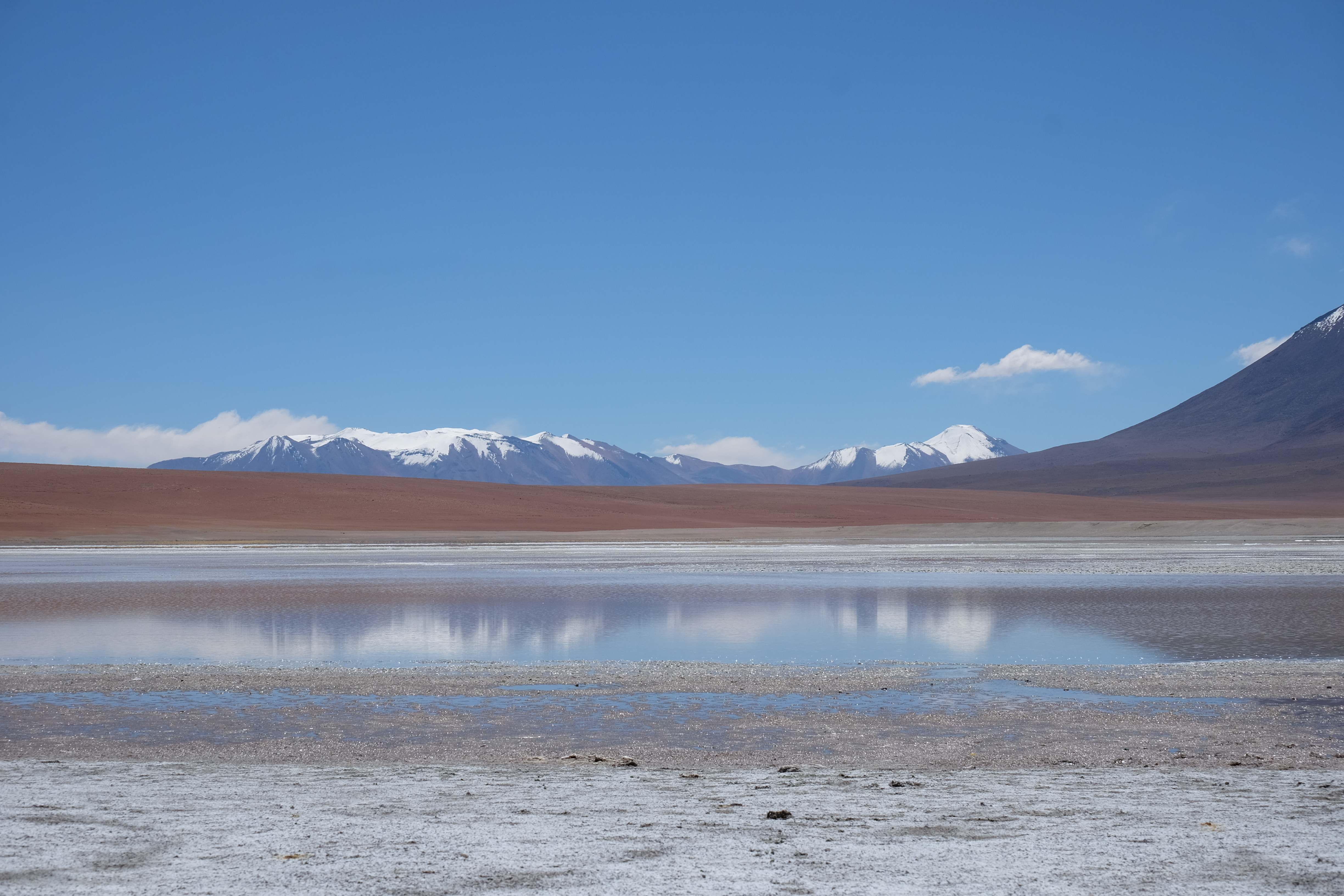 Kunst? Farbenpracht? Malerei? All diese Begriffe erhalten hierzulande eine neue Definition, spätestens wenn man an diesem Ort ankommt: Laguna Colorada. Monet mit seinen eindrücklichen impressionistischen Gemälden war ein Baby, nicht einmal ein Lehrling der Natur hätte er sein können. Auf einer Höhe von knapp 5000 m, in welcher der Wind sich unbedingt behaupten möchte und die Landschaft dermassen unfreundlich gestaltet, fing die Mutter Erde an die Symphonie der Farben zu komponieren. Sie mischte das Blau des eiskalten Wassers mit dem leidenschaftlichen Rot der Meeresalgen, welche fast sagen wollten, dass es trotz Kälte im Meer viele Geheimnisse zu entdecken gibt. Sie mischte das Hellblau des vor lauter Schönheit erstarrten Himmels mit dem seltenen Grün der mutigsten Pflanzen, die sich trotz Witterungen entschieden da zu blühen und zum Wunderklang beizutragen. Und als dieser Rahmen bereit war, warf sie einige Farbentöne hinein: die zart-rosafarbigen Flamingos, welche aus lauter Neugierde die Meeresgeheimnisse zu kennen immer mehr von den roten Algen assen und somit immer rötlicher wurden; die weissen, braunen und schwarzen Lamas, welche einen doch daran erinnern sollten, dass man sich im Herzen der Gebirge befand und die weissen Wolken, leere Gedankenblasen, welche die Sprachlosigkeit des menschlichen Wesen vor einer solchen Schönheit verkörperten. Da war das Meisterwerk der Mutter Natur vollbracht, die Symphonie der Farben eine Tatsache und ihr Klang einfach magisch. Aber hört doch selber zu: