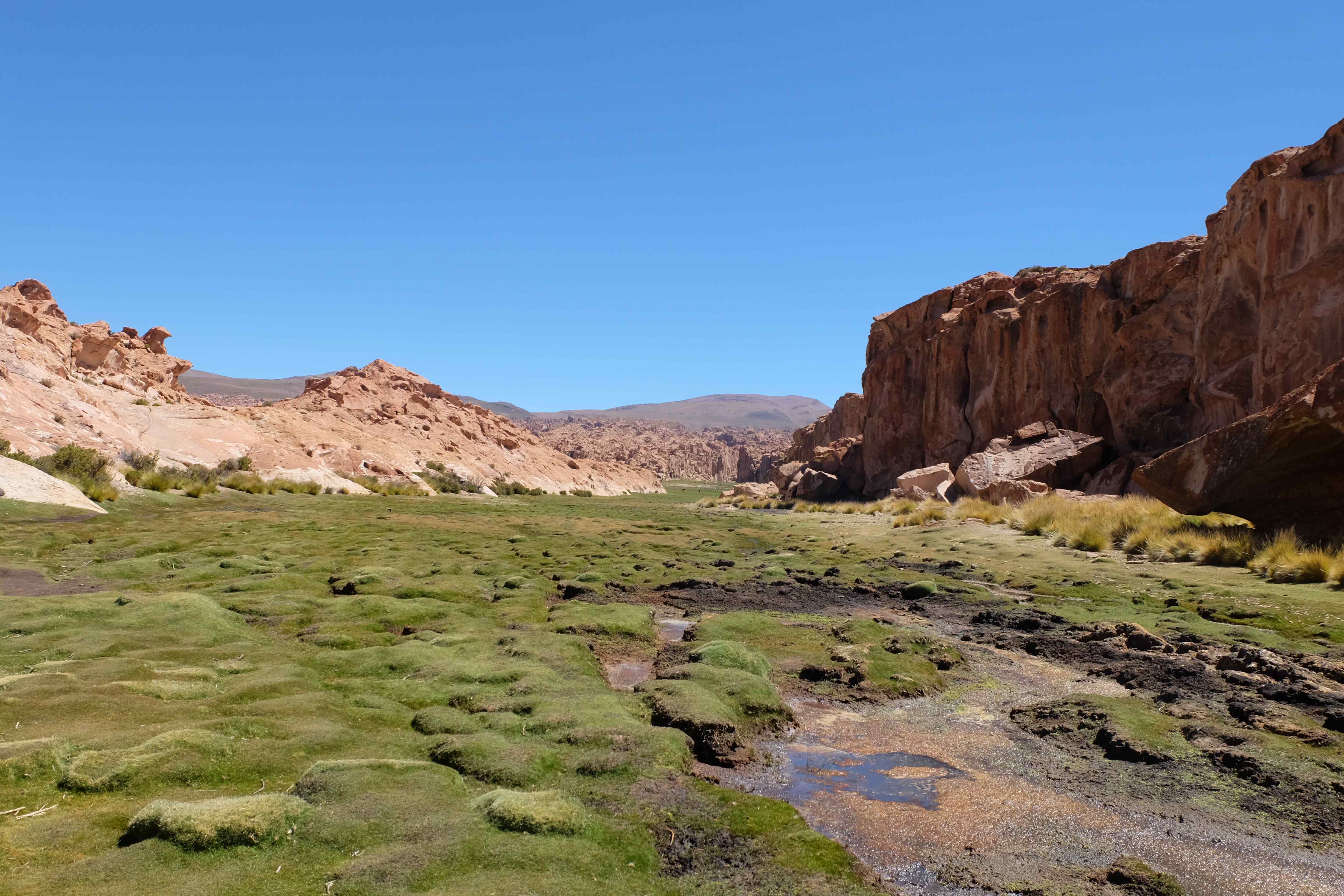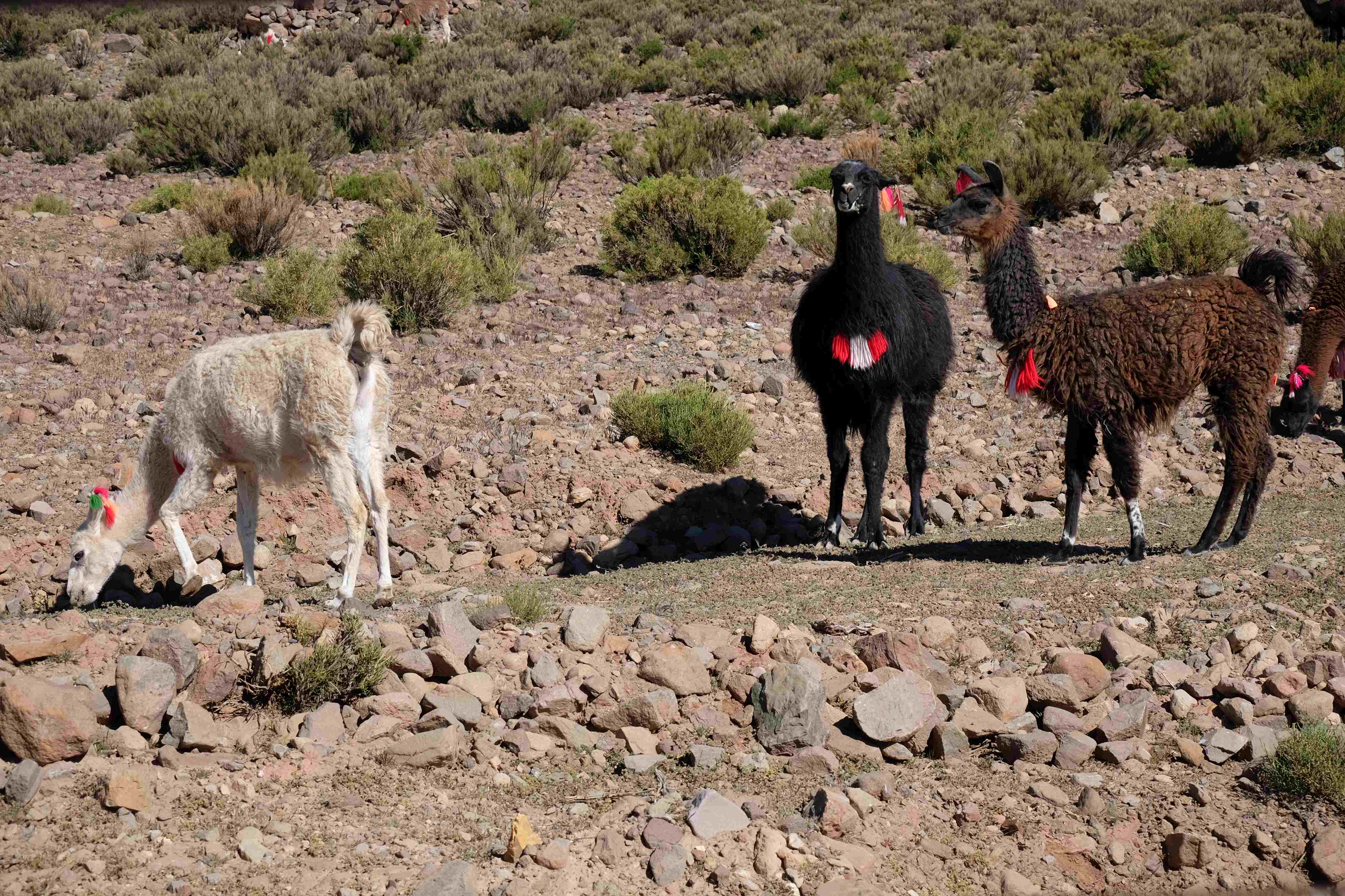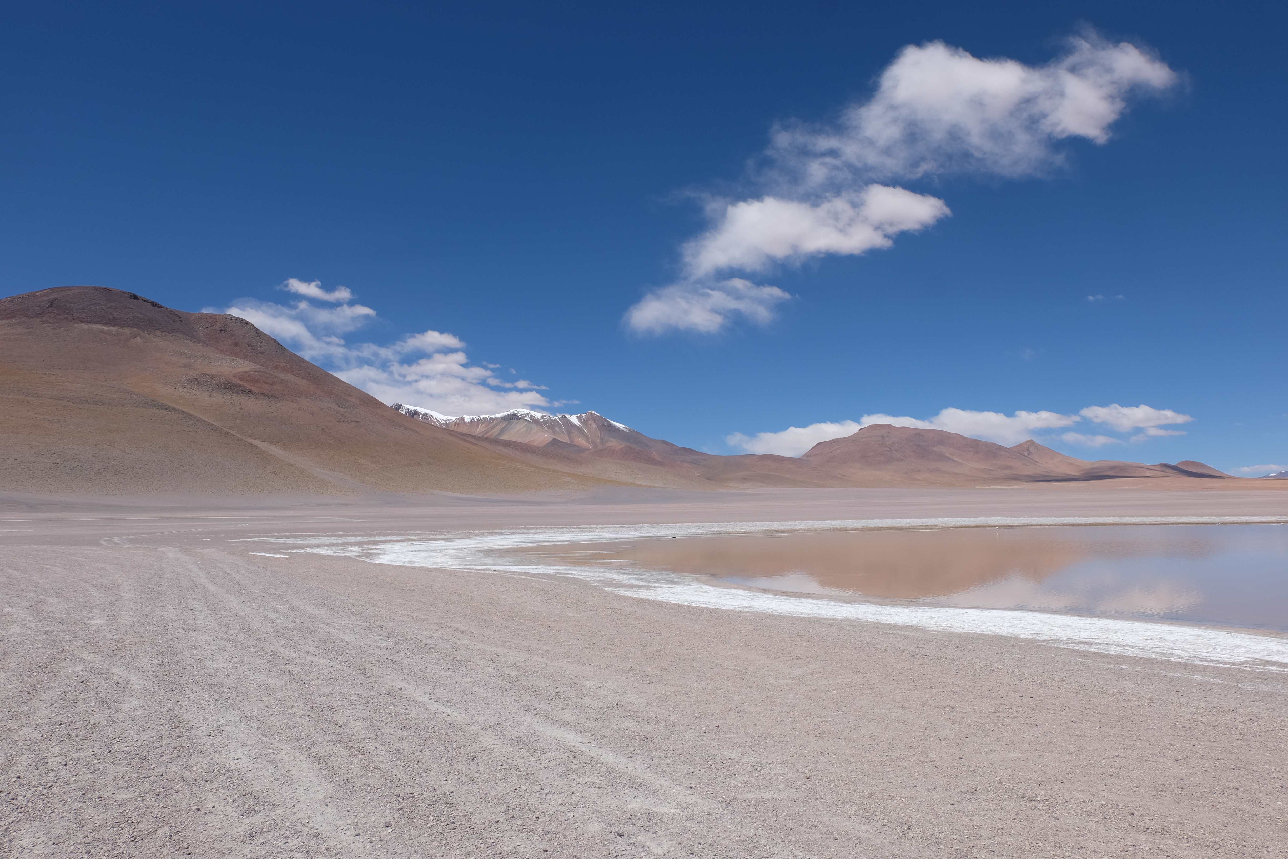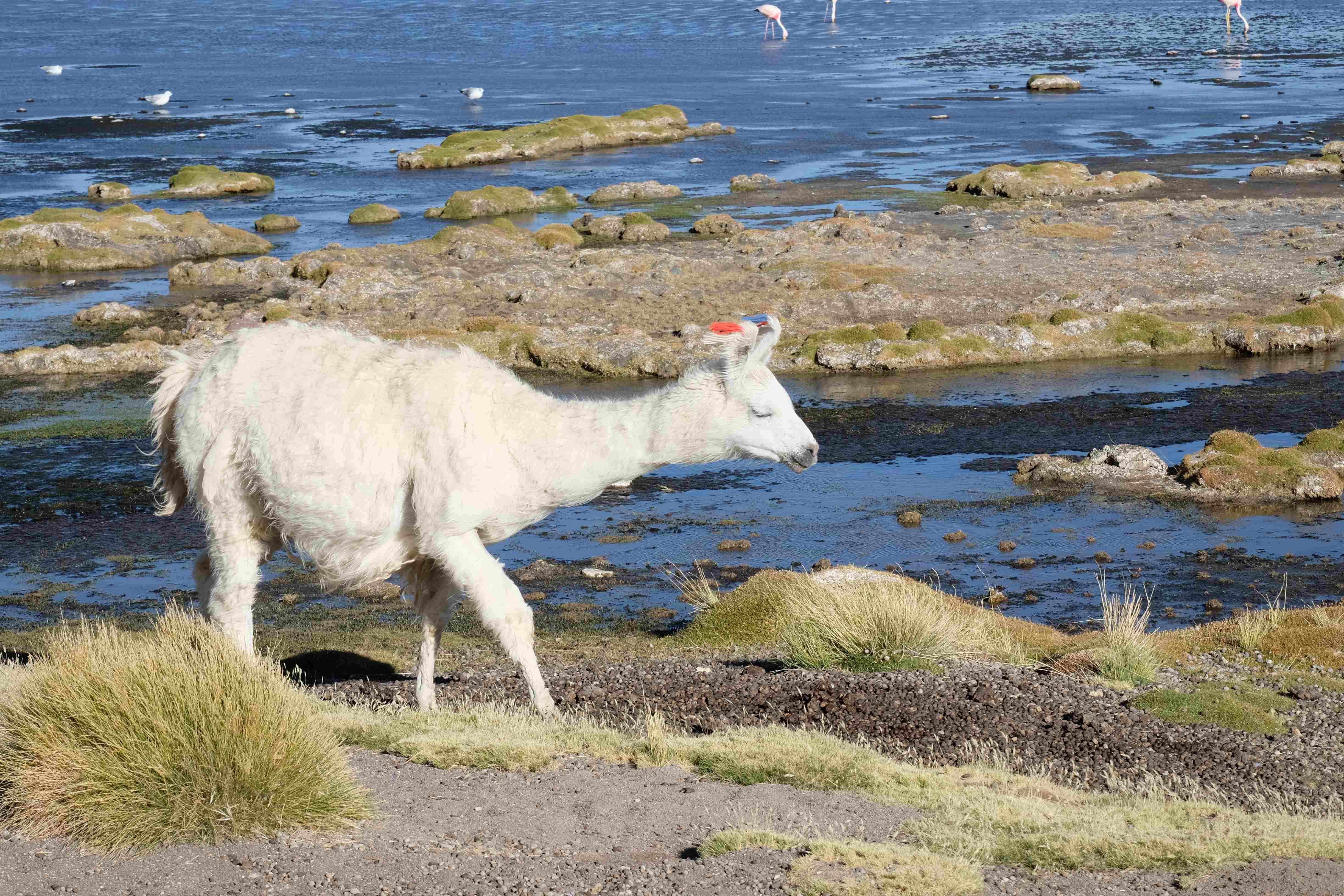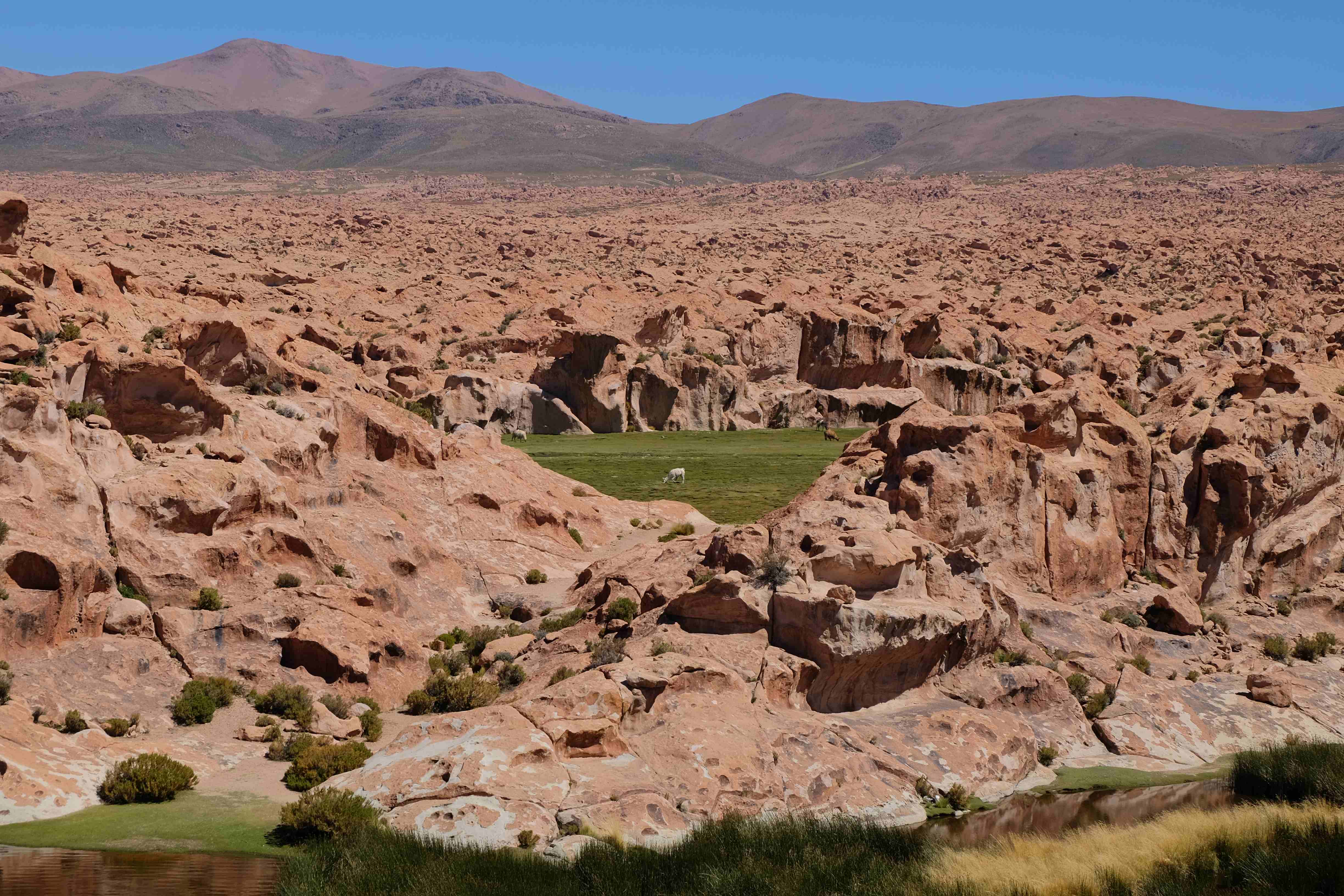 Kunst? Farbenpracht? Malerei? All diese Begriffe erhalten hierzulande eine neue Definition, spätestens wenn man an diesem Ort ankommt: Laguna Colorada. Monet mit seinen eindrücklichen impressionistischen Gemälden war ein Baby, nicht einmal ein Lehrling der Natur hätte er sein können. Auf einer Höhe von knapp 5000 m, in welcher der Wind sich unbedingt behaupten möchte und die Landschaft dermassen unfreundlich gestaltet, fing die Mutter Erde an die Symphonie der Farben zu komponieren. Sie mischte das Blau des eiskalten Wassers mit dem leidenschaftlichen Rot der Meeresalgen, welche fast sagen wollten, dass es trotz Kälte im Meer viele Geheimnisse zu entdecken gibt. Sie mischte das Hellblau des vor lauter Schönheit erstarrten Himmels mit dem seltenen Grün der mutigsten Pflanzen, die sich trotz Witterungen entschieden da zu blühen und zum Wunderklang beizutragen. Und als dieser Rahmen bereit war, warf sie einige Farbentöne hinein: die zart-rosafarbigen Flamingos, welche aus lauter Neugierde die Meeresgeheimnisse zu kennen immer mehr von den roten Algen assen und somit immer rötlicher wurden; die weissen, braunen und schwarzen Lamas, welche einen doch daran erinnern sollten, dass man sich im Herzen der Gebirge befand und die weissen Wolken, leere Gedankenblasen, welche die Sprachlosigkeit des menschlichen Wesen vor einer solchen Schönheit verkörperten. Da war das Meisterwerk der Mutter Natur vollbracht, die Symphonie der Farben eine Tatsache und ihr Klang einfach magisch. Aber hört doch selber zu: