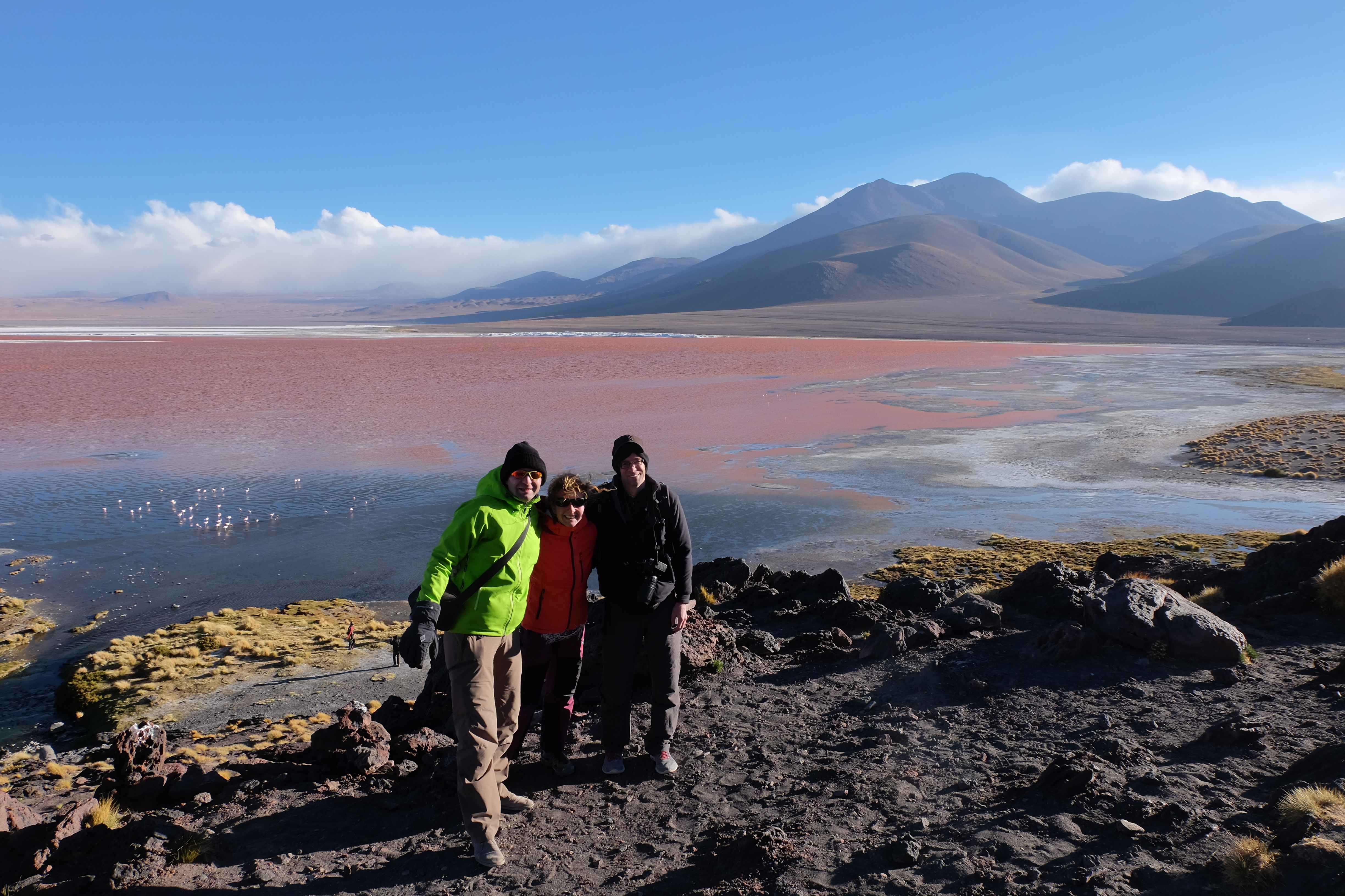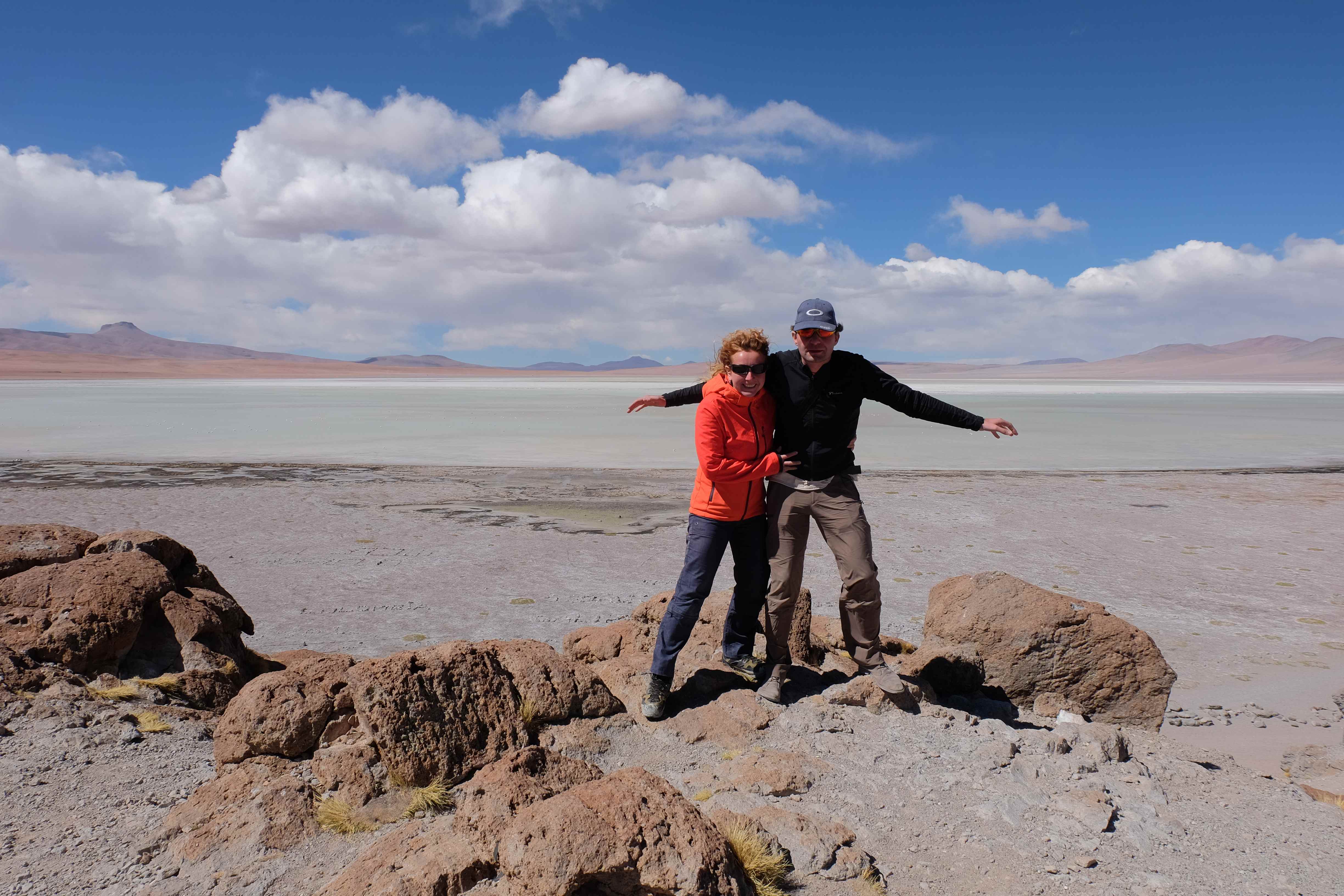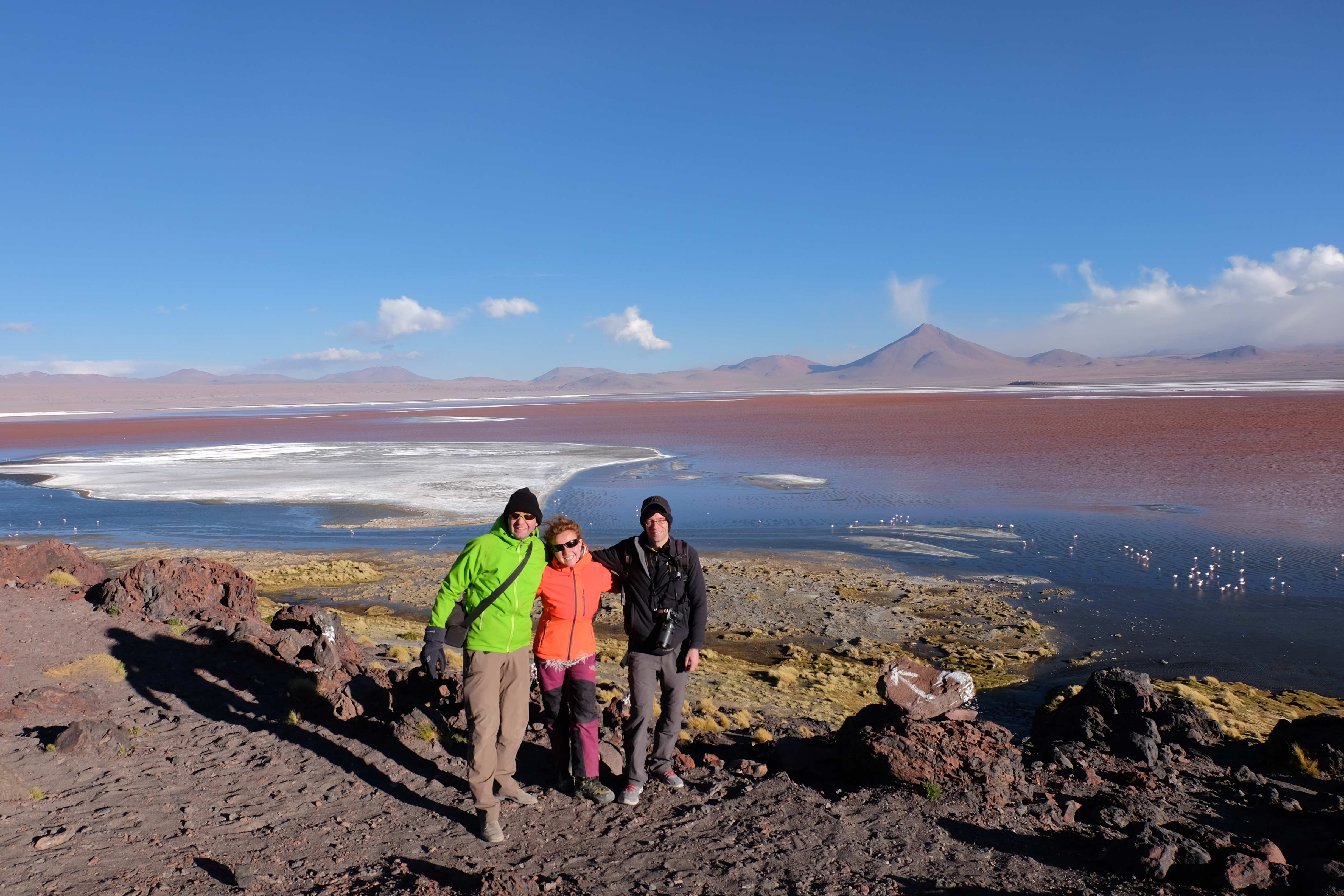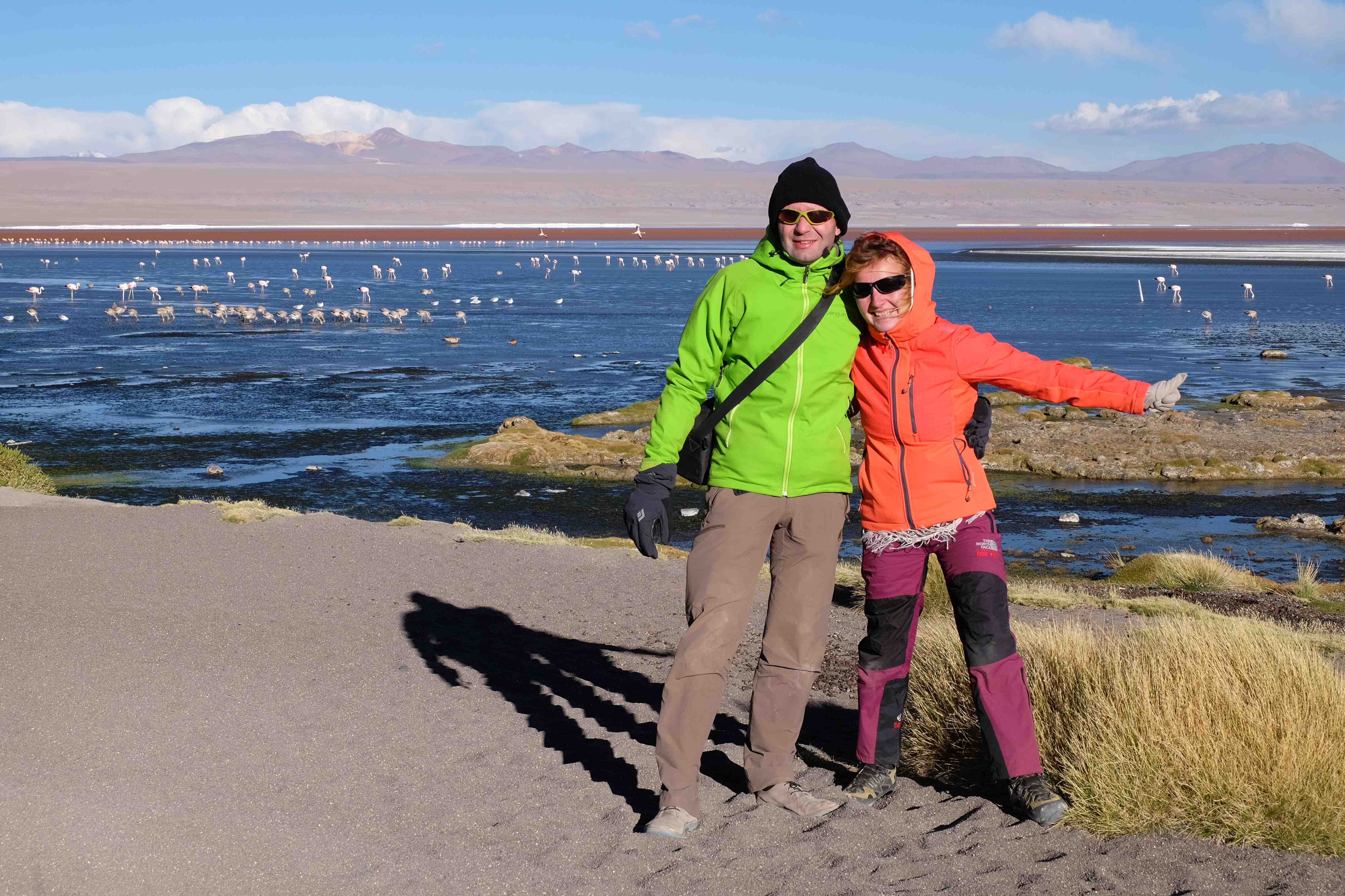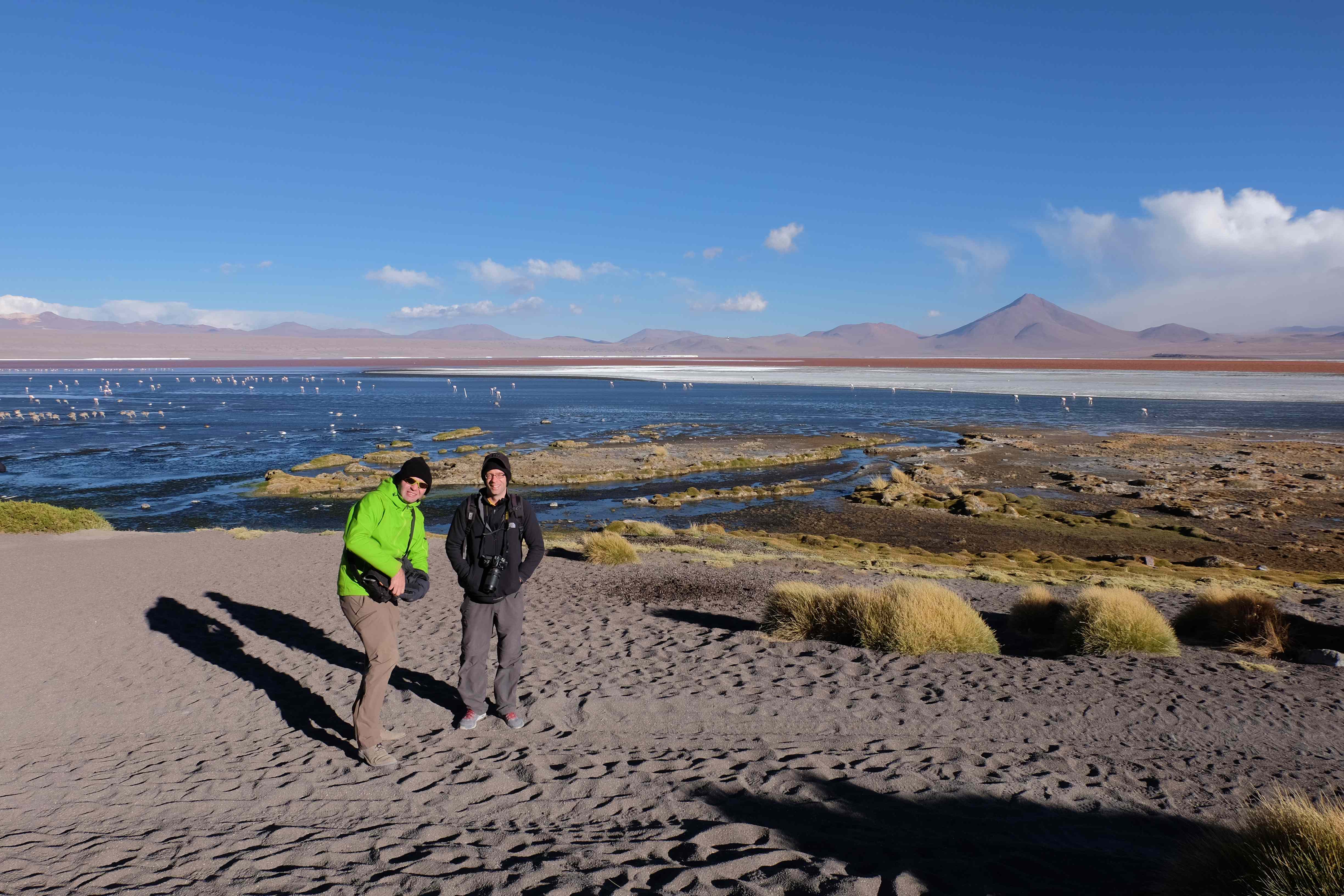 Konnte das Ganze noch getoppt werden? Gab es etwas Besseres? Der Tag fing zumal nicht schlecht an: nach Unmengen an Steinformationen, welche den Beweis darstellten, dass der Wind sich im Laufe der Jahrhunderte als Bildhauer versucht hatte, kamen sie: die in dieser Einsamkeit, dieser trockenen Wüstenlandschaft und unfreundlichen Umgebung so fehl am Platz und umso unglaublicher scheinenden Flamingos, welche nicht nur eine gewisse Eleganz, sondern auch genau den richtigen Farbenfleck verliehen um die Landschaft als herrlich zu bezeichnen. Da tobten wir uns mit dem Fotoapparat aus wie kleine Kinder, welche die Welt entdeckten – wir entdeckten sie nämlich auch und was für eine Welt! Eine in schwindelerregender Höhe (wir bewegten uns die ganze Zeit zwischen 4000 und 5000 m ohne das überhaupt zu merken, da einem alles flach vorkam, allein die schwerfälligen Atemzüge erinnerten einen daran, als man sich anstrengte), eine in der bolivianischen Ferne versteckte Wunderlandschaft, ein von niemandem erahntes und vermutlich von vielen unterschätztes Naturwunder welches sich nun vor unseren Augen in seiner vollen Pracht zeigte. Wir hatten uns verliebt… und der Tag war erst in der Hälfte.