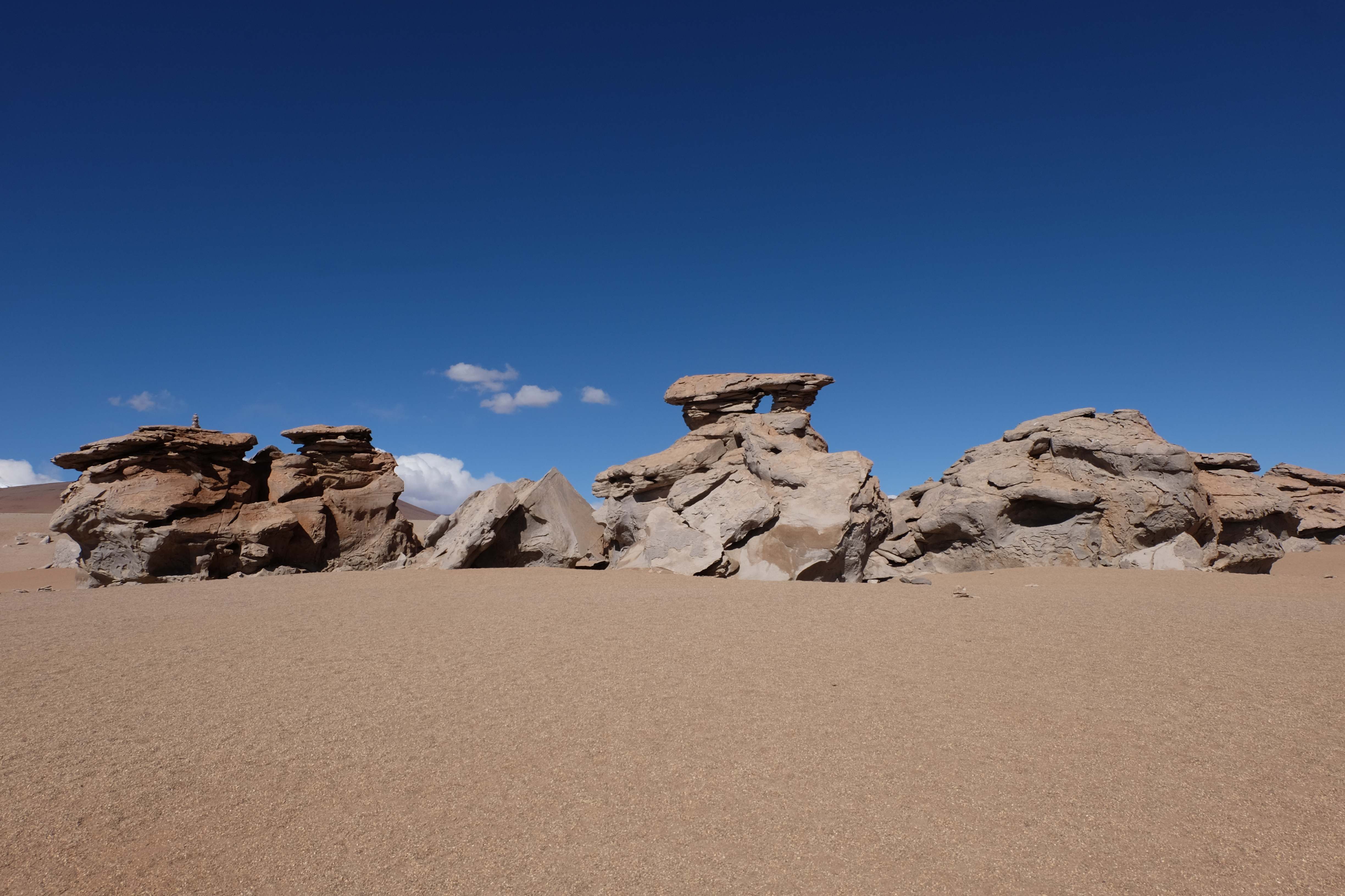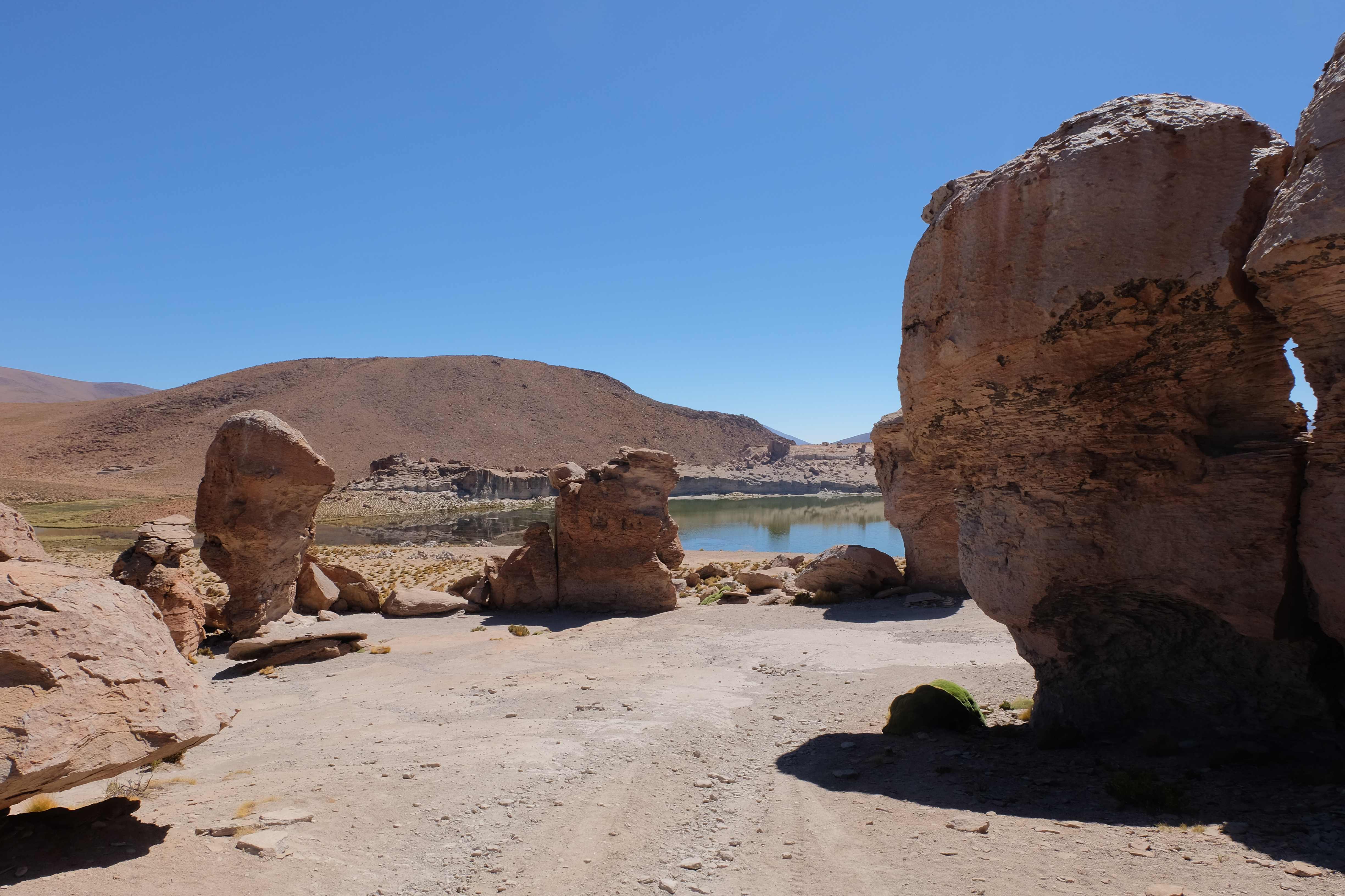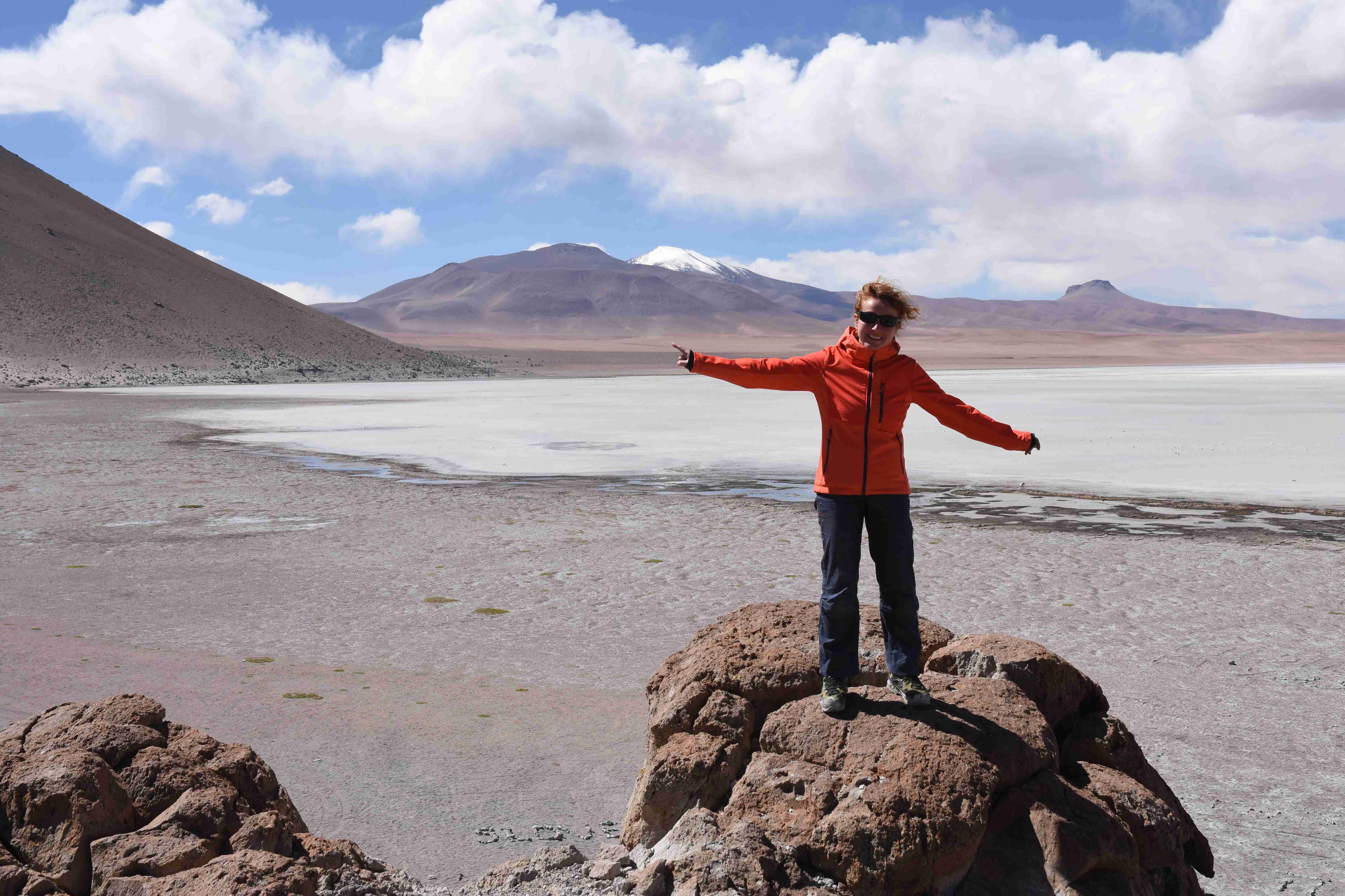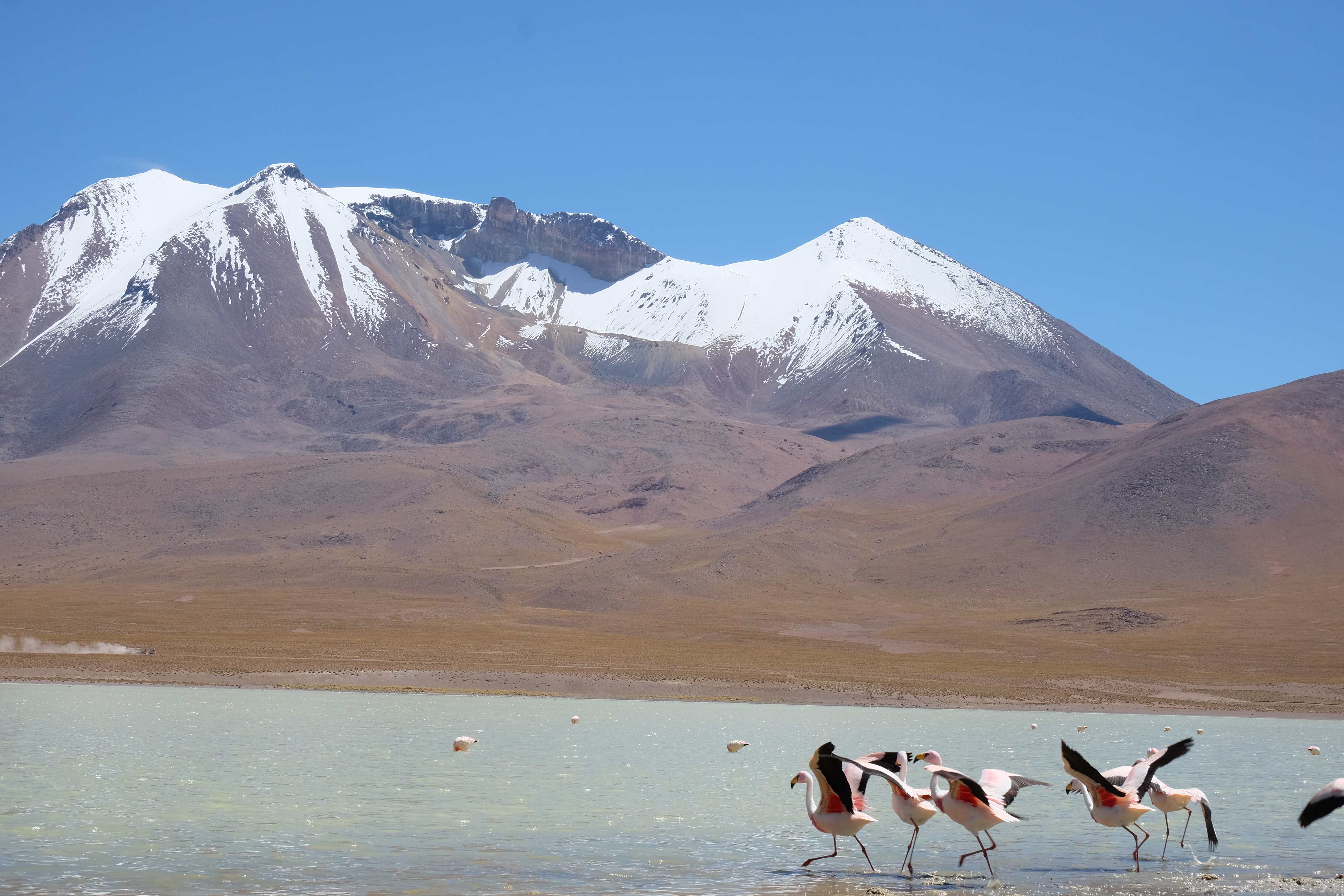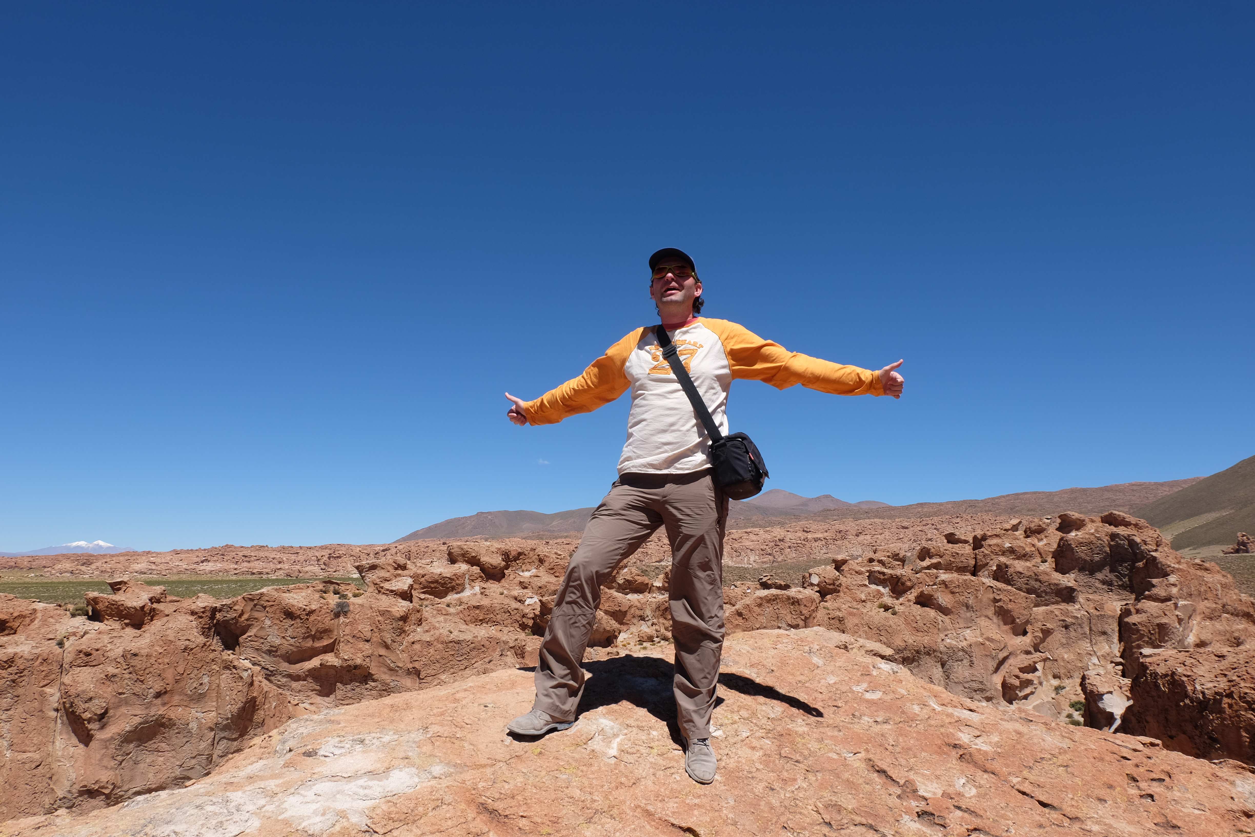 Konnte das Ganze noch getoppt werden? Gab es etwas Besseres? Der Tag fing zumal nicht schlecht an: nach Unmengen an Steinformationen, welche den Beweis darstellten, dass der Wind sich im Laufe der Jahrhunderte als Bildhauer versucht hatte, kamen sie: die in dieser Einsamkeit, dieser trockenen Wüstenlandschaft und unfreundlichen Umgebung so fehl am Platz und umso unglaublicher scheinenden Flamingos, welche nicht nur eine gewisse Eleganz, sondern auch genau den richtigen Farbenfleck verliehen um die Landschaft als herrlich zu bezeichnen. Da tobten wir uns mit dem Fotoapparat aus wie kleine Kinder, welche die Welt entdeckten – wir entdeckten sie nämlich auch und was für eine Welt! Eine in schwindelerregender Höhe (wir bewegten uns die ganze Zeit zwischen 4000 und 5000 m ohne das überhaupt zu merken, da einem alles flach vorkam, allein die schwerfälligen Atemzüge erinnerten einen daran, als man sich anstrengte), eine in der bolivianischen Ferne versteckte Wunderlandschaft, ein von niemandem erahntes und vermutlich von vielen unterschätztes Naturwunder welches sich nun vor unseren Augen in seiner vollen Pracht zeigte. Wir hatten uns verliebt… und der Tag war erst in der Hälfte.