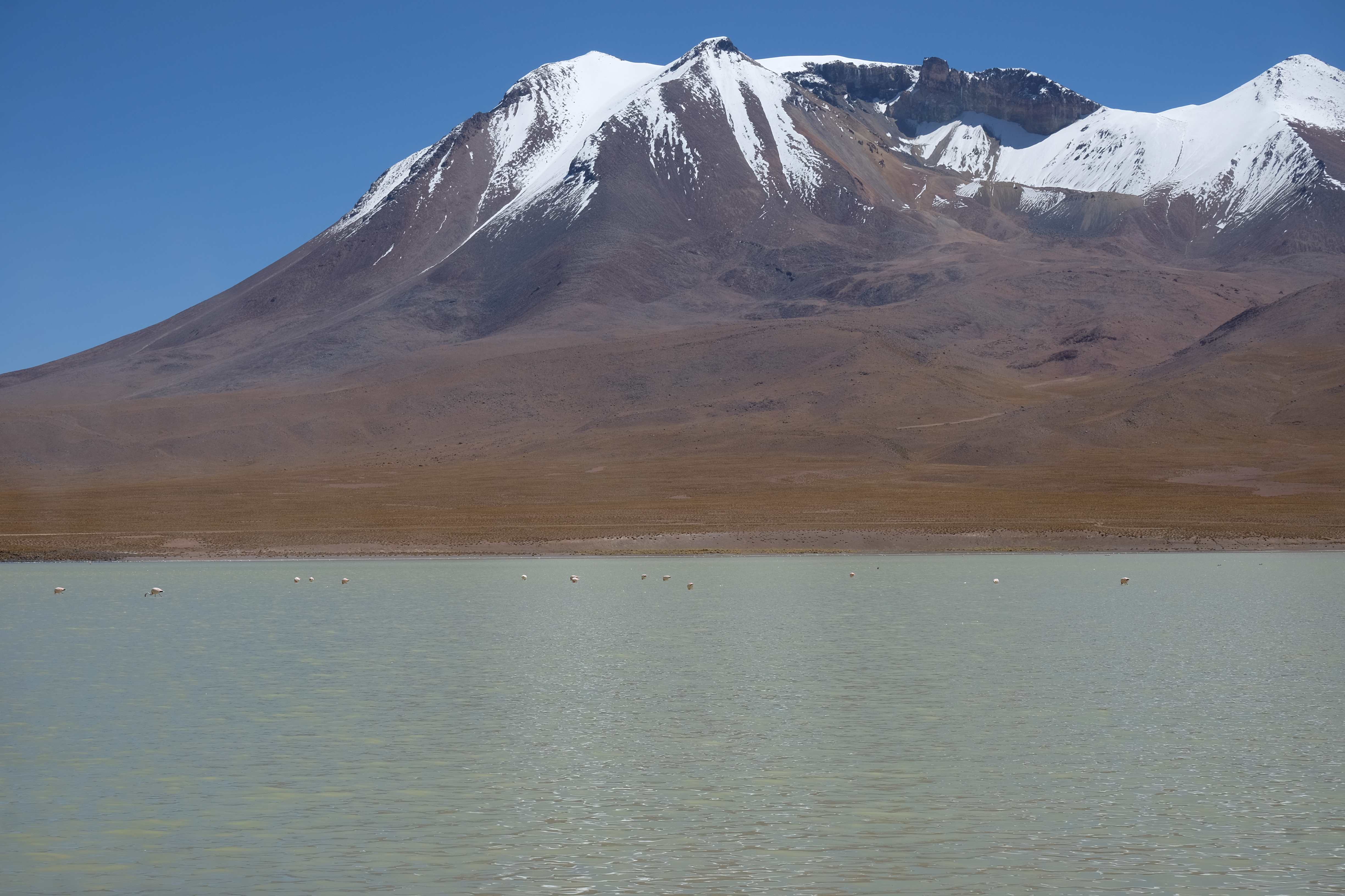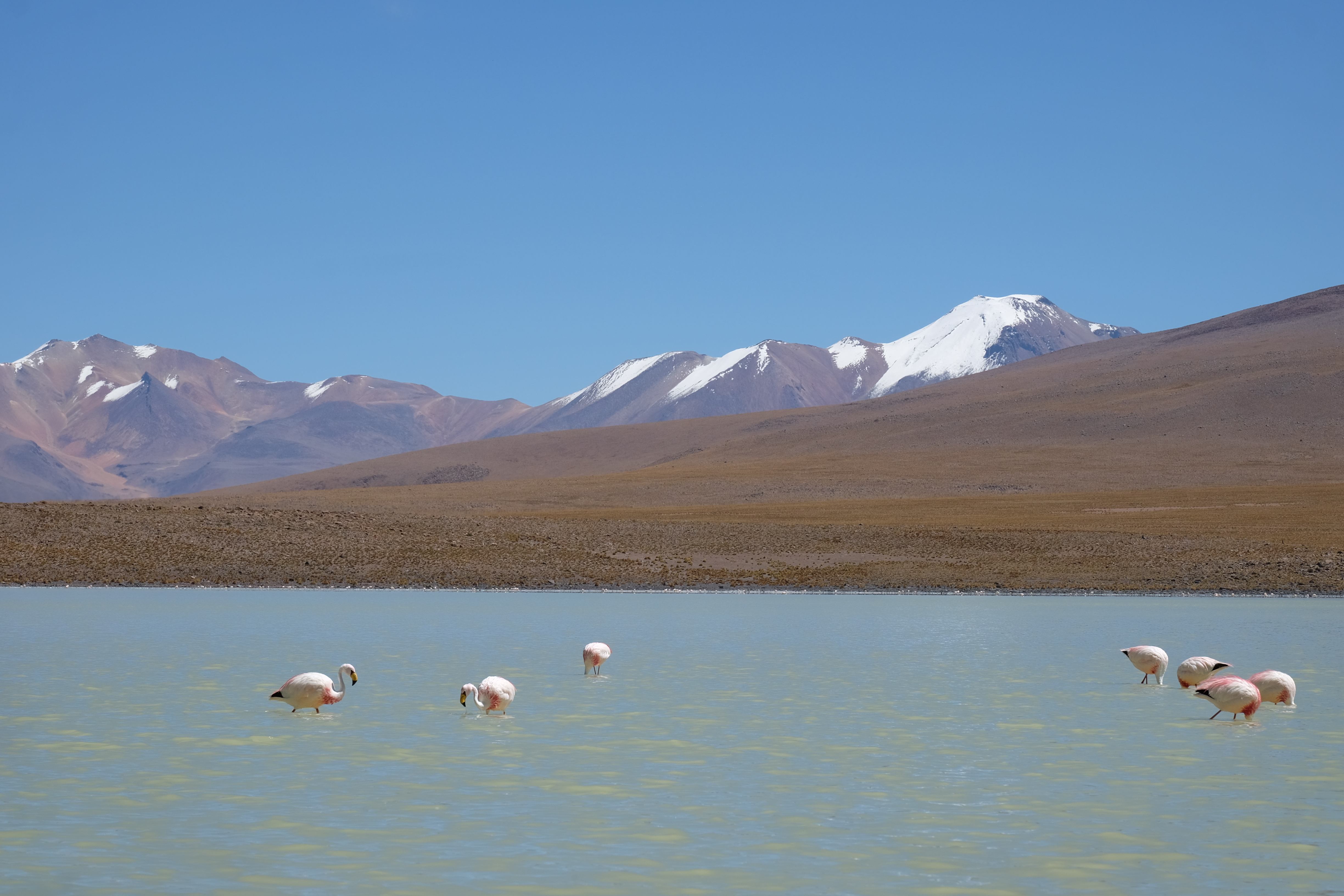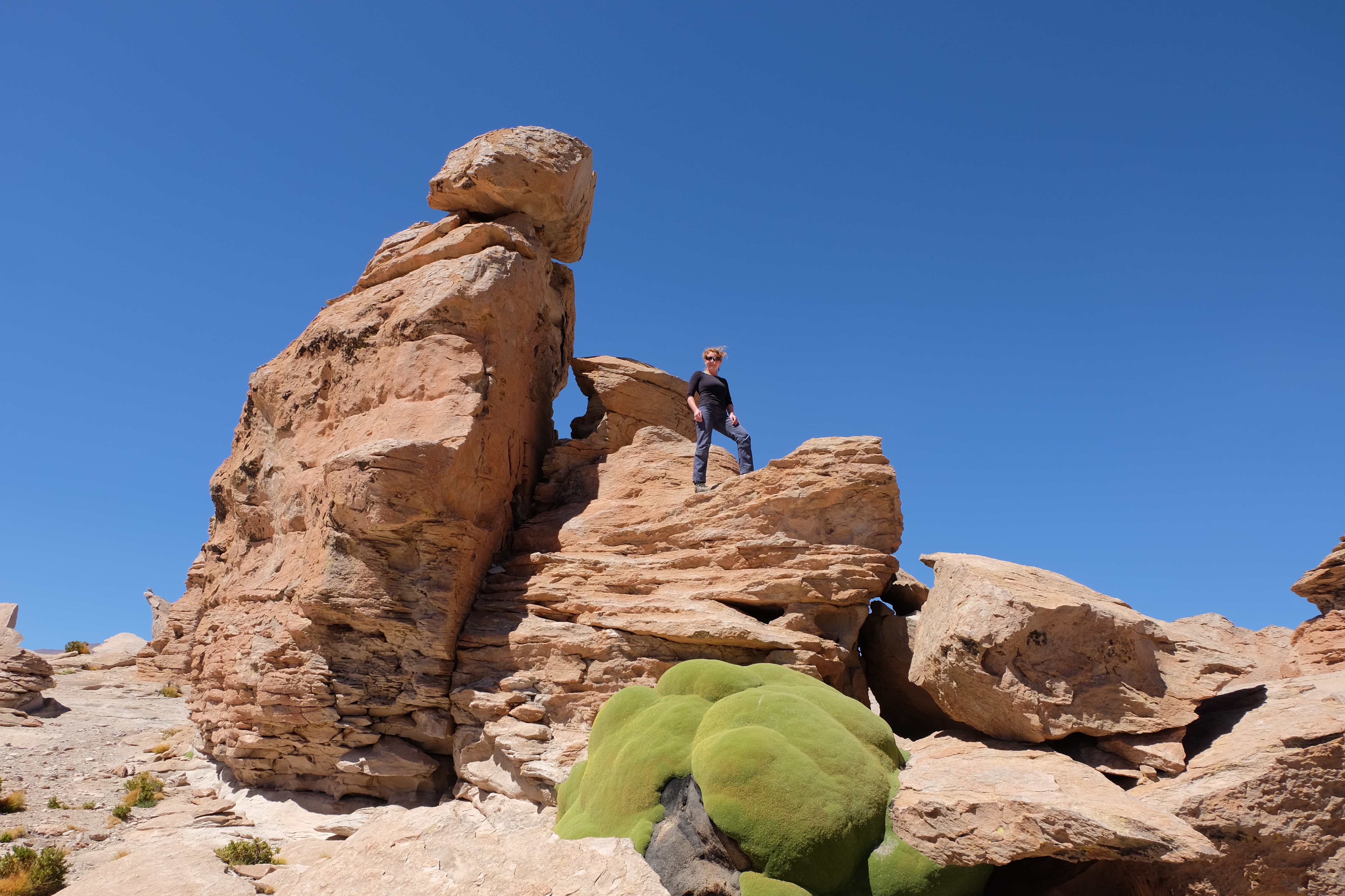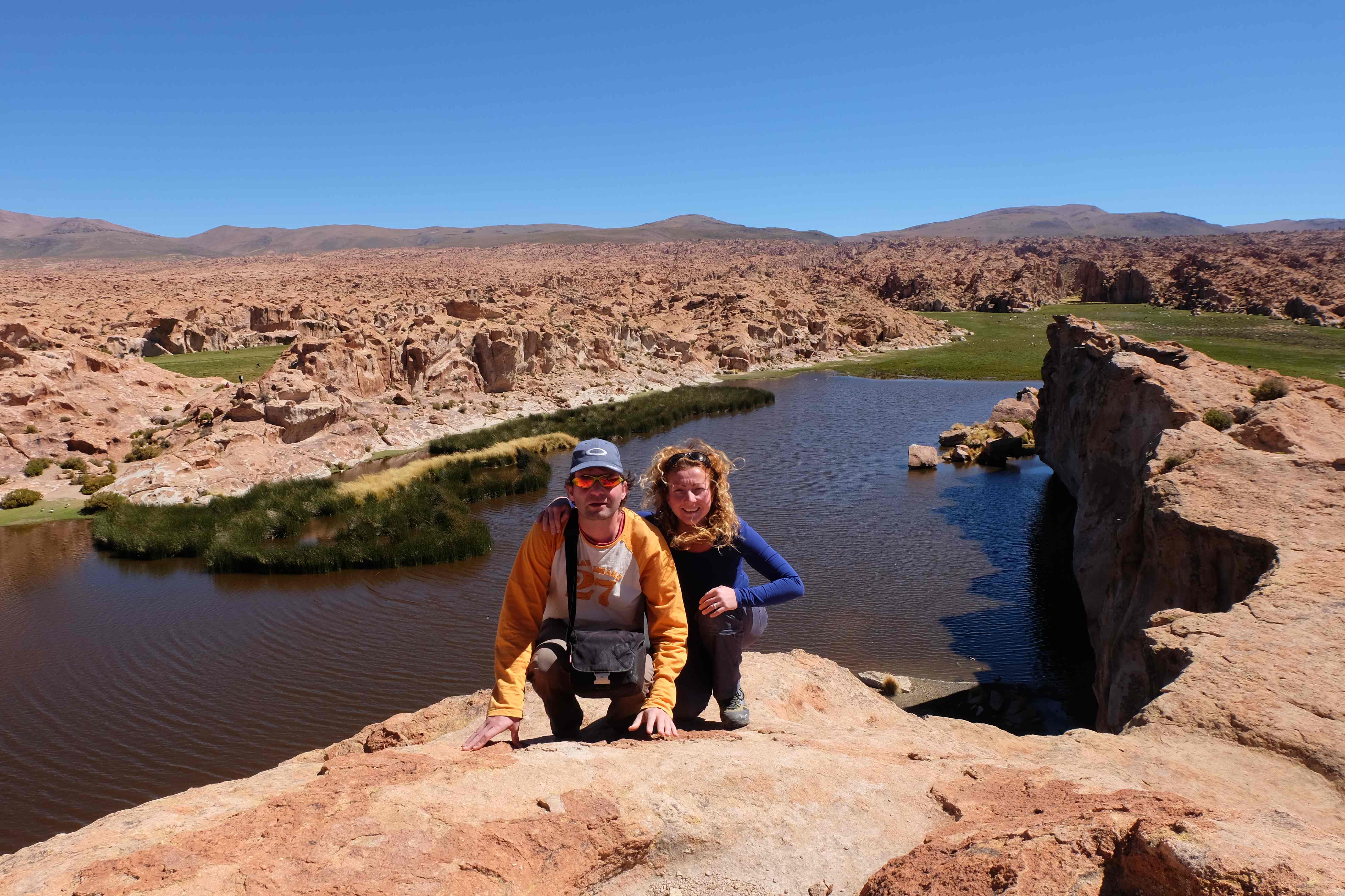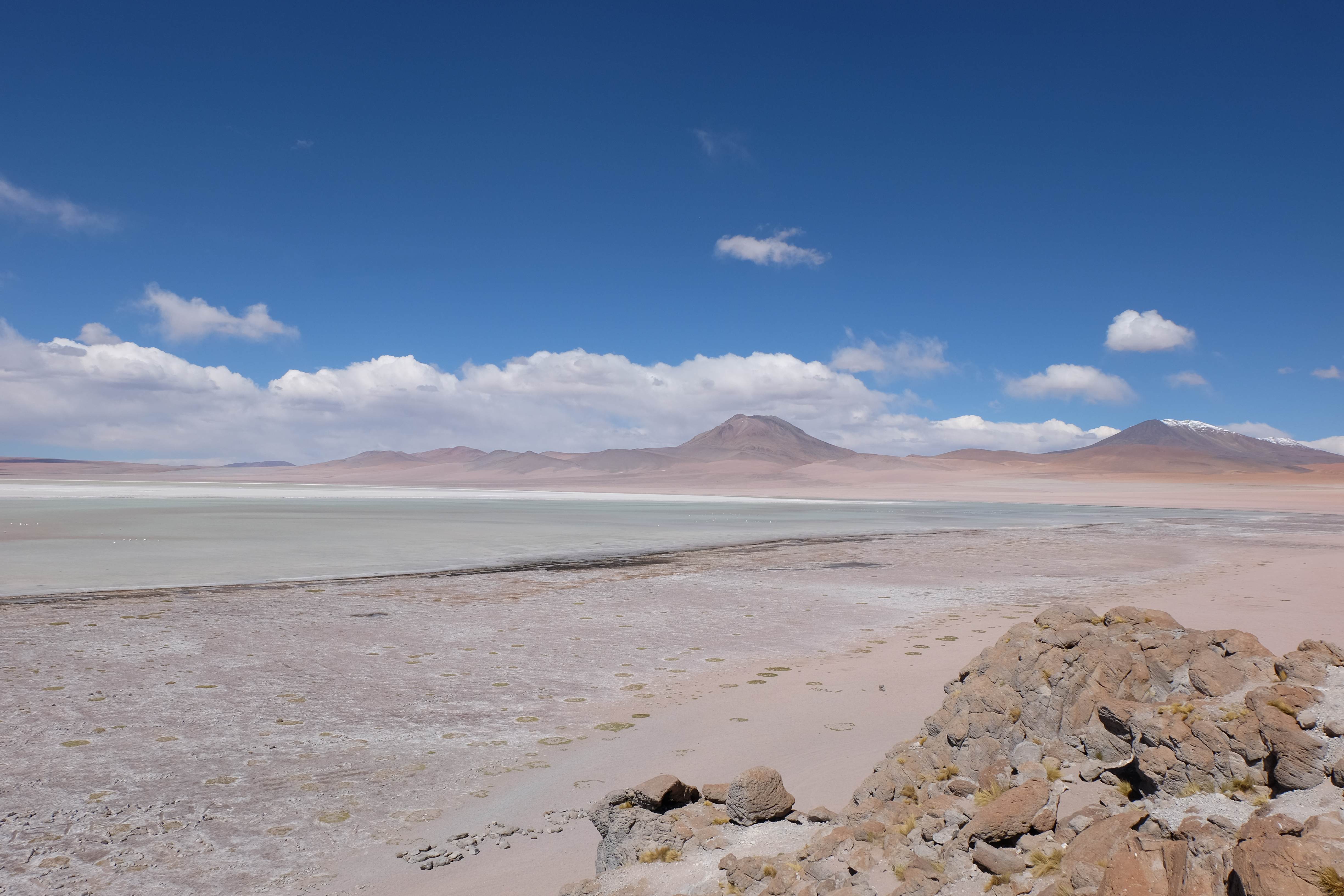 Konnte das Ganze noch getoppt werden? Gab es etwas Besseres? Der Tag fing zumal nicht schlecht an: nach Unmengen an Steinformationen, welche den Beweis darstellten, dass der Wind sich im Laufe der Jahrhunderte als Bildhauer versucht hatte, kamen sie: die in dieser Einsamkeit, dieser trockenen Wüstenlandschaft und unfreundlichen Umgebung so fehl am Platz und umso unglaublicher scheinenden Flamingos, welche nicht nur eine gewisse Eleganz, sondern auch genau den richtigen Farbenfleck verliehen um die Landschaft als herrlich zu bezeichnen. Da tobten wir uns mit dem Fotoapparat aus wie kleine Kinder, welche die Welt entdeckten – wir entdeckten sie nämlich auch und was für eine Welt! Eine in schwindelerregender Höhe (wir bewegten uns die ganze Zeit zwischen 4000 und 5000 m ohne das überhaupt zu merken, da einem alles flach vorkam, allein die schwerfälligen Atemzüge erinnerten einen daran, als man sich anstrengte), eine in der bolivianischen Ferne versteckte Wunderlandschaft, ein von niemandem erahntes und vermutlich von vielen unterschätztes Naturwunder welches sich nun vor unseren Augen in seiner vollen Pracht zeigte. Wir hatten uns verliebt… und der Tag war erst in der Hälfte.