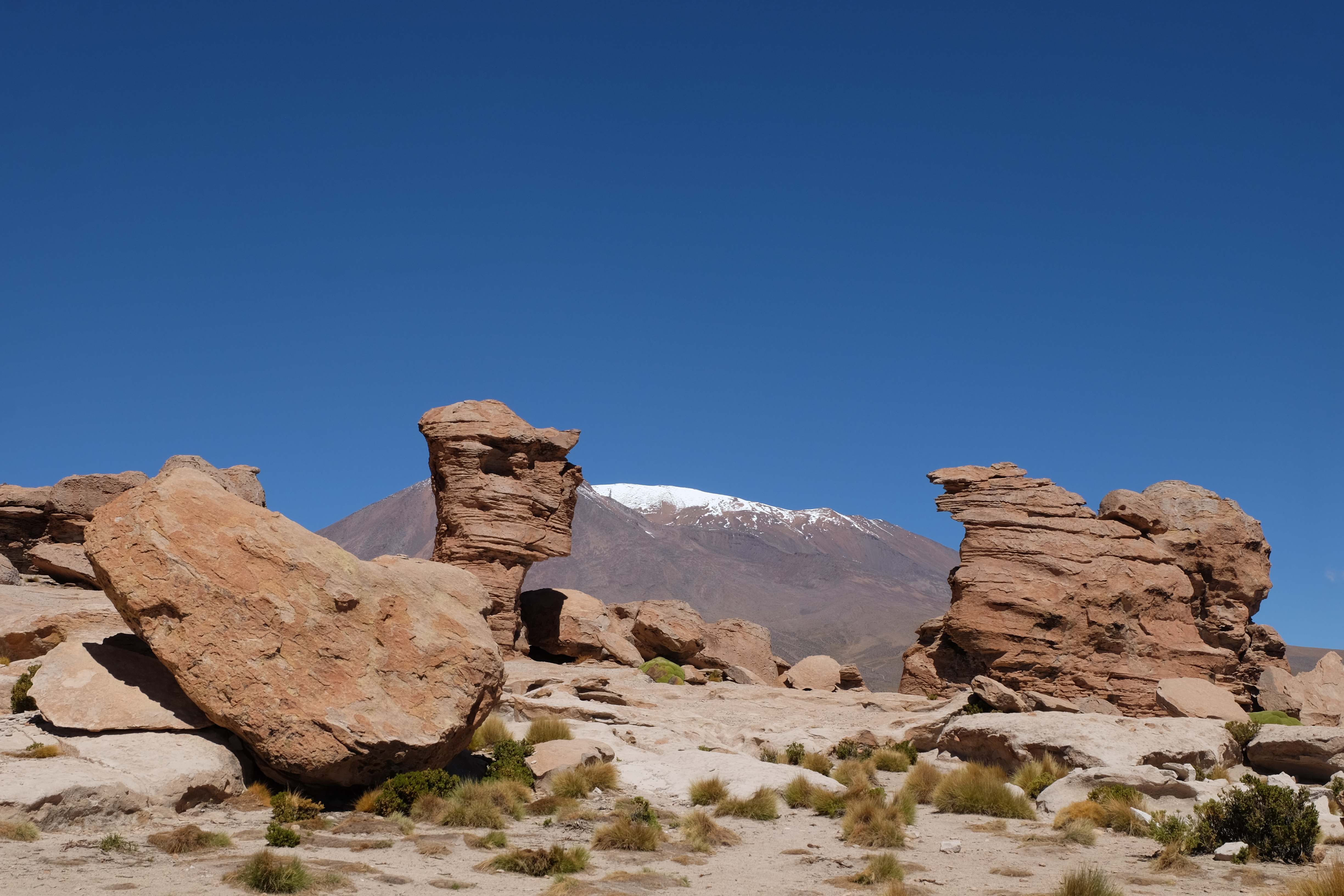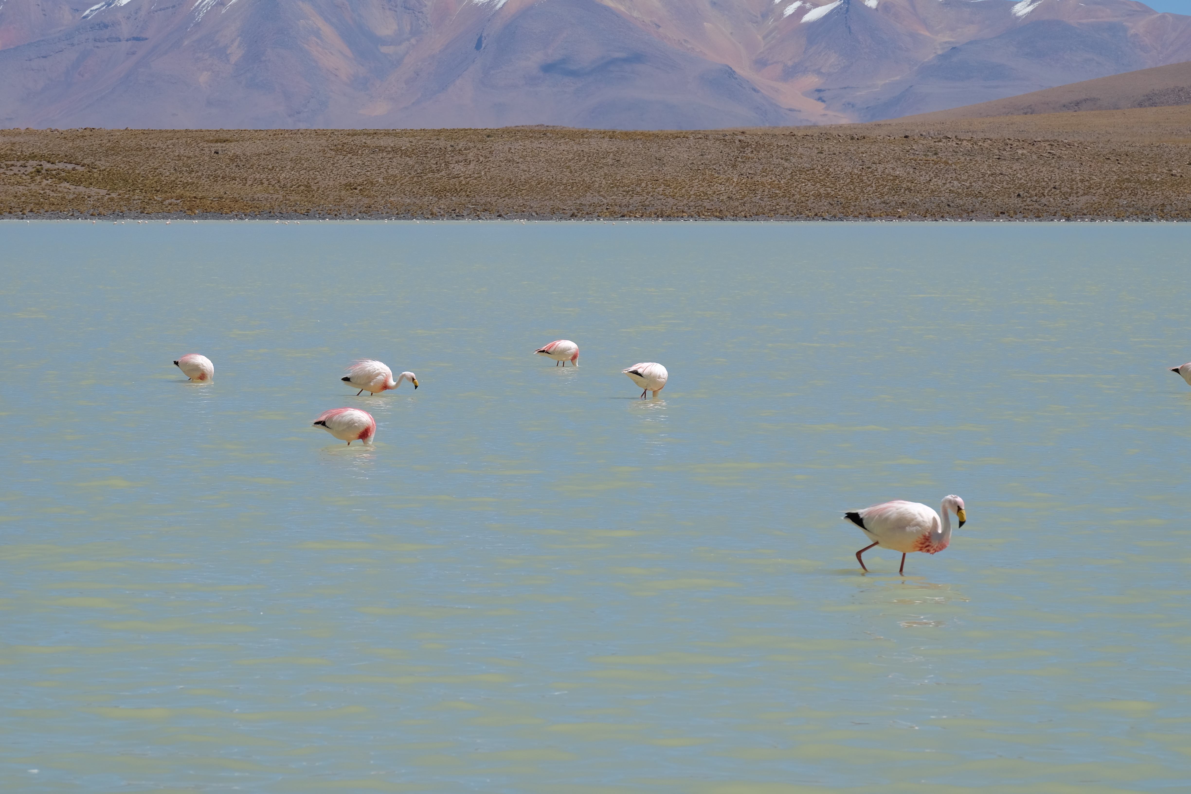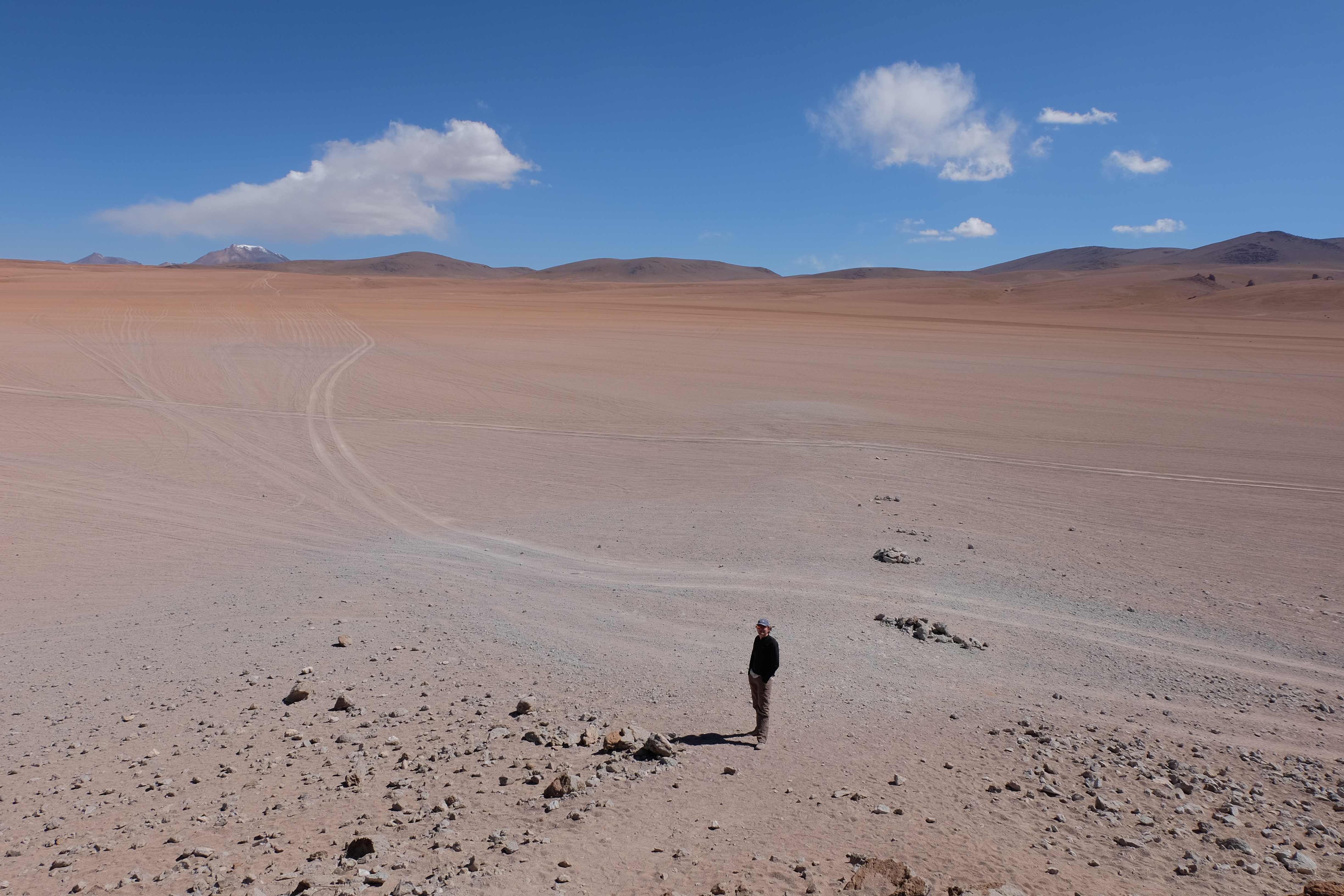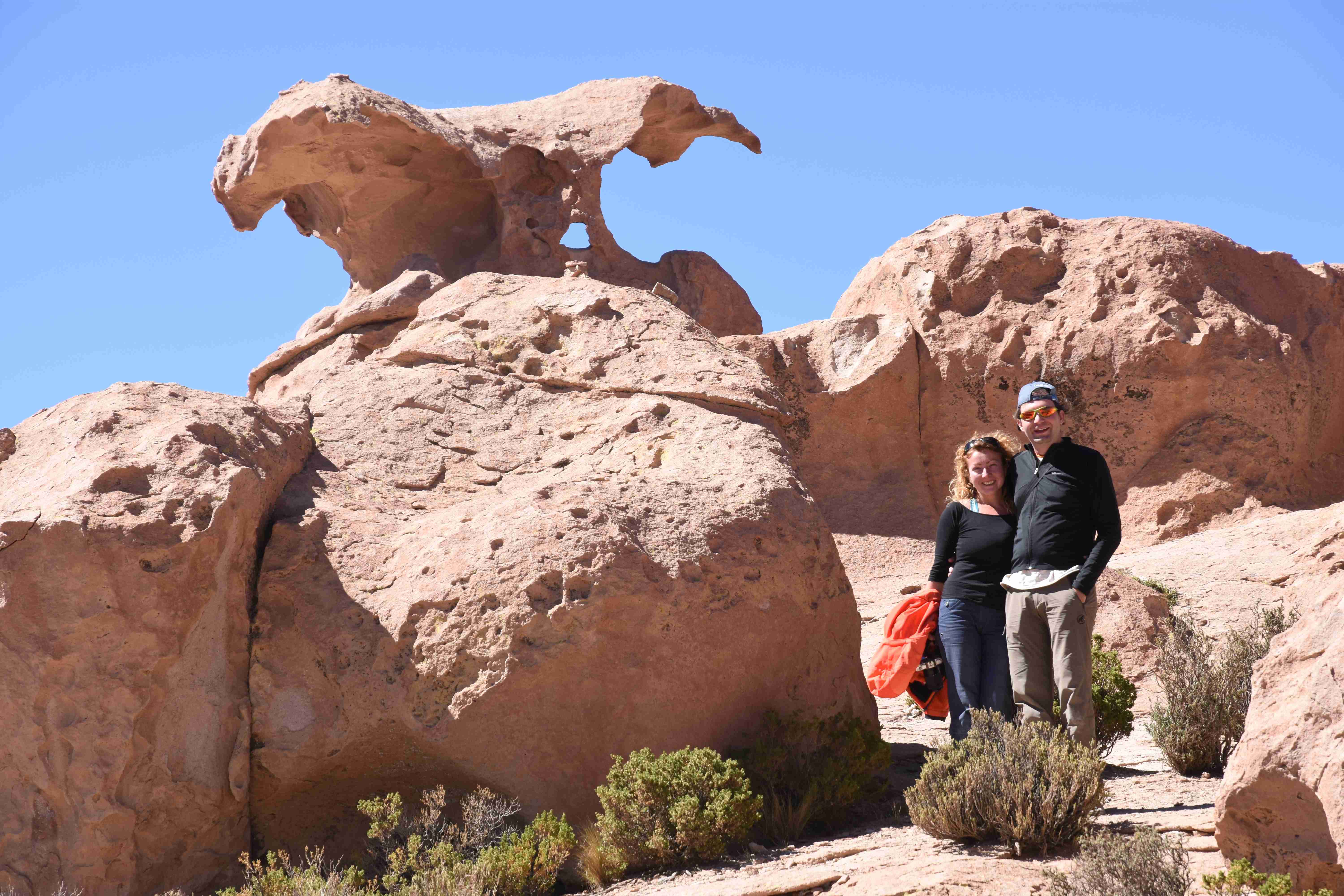 Konnte das Ganze noch getoppt werden? Gab es etwas Besseres? Der Tag fing zumal nicht schlecht an: nach Unmengen an Steinformationen, welche den Beweis darstellten, dass der Wind sich im Laufe der Jahrhunderte als Bildhauer versucht hatte, kamen sie: die in dieser Einsamkeit, dieser trockenen Wüstenlandschaft und unfreundlichen Umgebung so fehl am Platz und umso unglaublicher scheinenden Flamingos, welche nicht nur eine gewisse Eleganz, sondern auch genau den richtigen Farbenfleck verliehen um die Landschaft als herrlich zu bezeichnen. Da tobten wir uns mit dem Fotoapparat aus wie kleine Kinder, welche die Welt entdeckten – wir entdeckten sie nämlich auch und was für eine Welt! Eine in schwindelerregender Höhe (wir bewegten uns die ganze Zeit zwischen 4000 und 5000 m ohne das überhaupt zu merken, da einem alles flach vorkam, allein die schwerfälligen Atemzüge erinnerten einen daran, als man sich anstrengte), eine in der bolivianischen Ferne versteckte Wunderlandschaft, ein von niemandem erahntes und vermutlich von vielen unterschätztes Naturwunder welches sich nun vor unseren Augen in seiner vollen Pracht zeigte. Wir hatten uns verliebt… und der Tag war erst in der Hälfte.