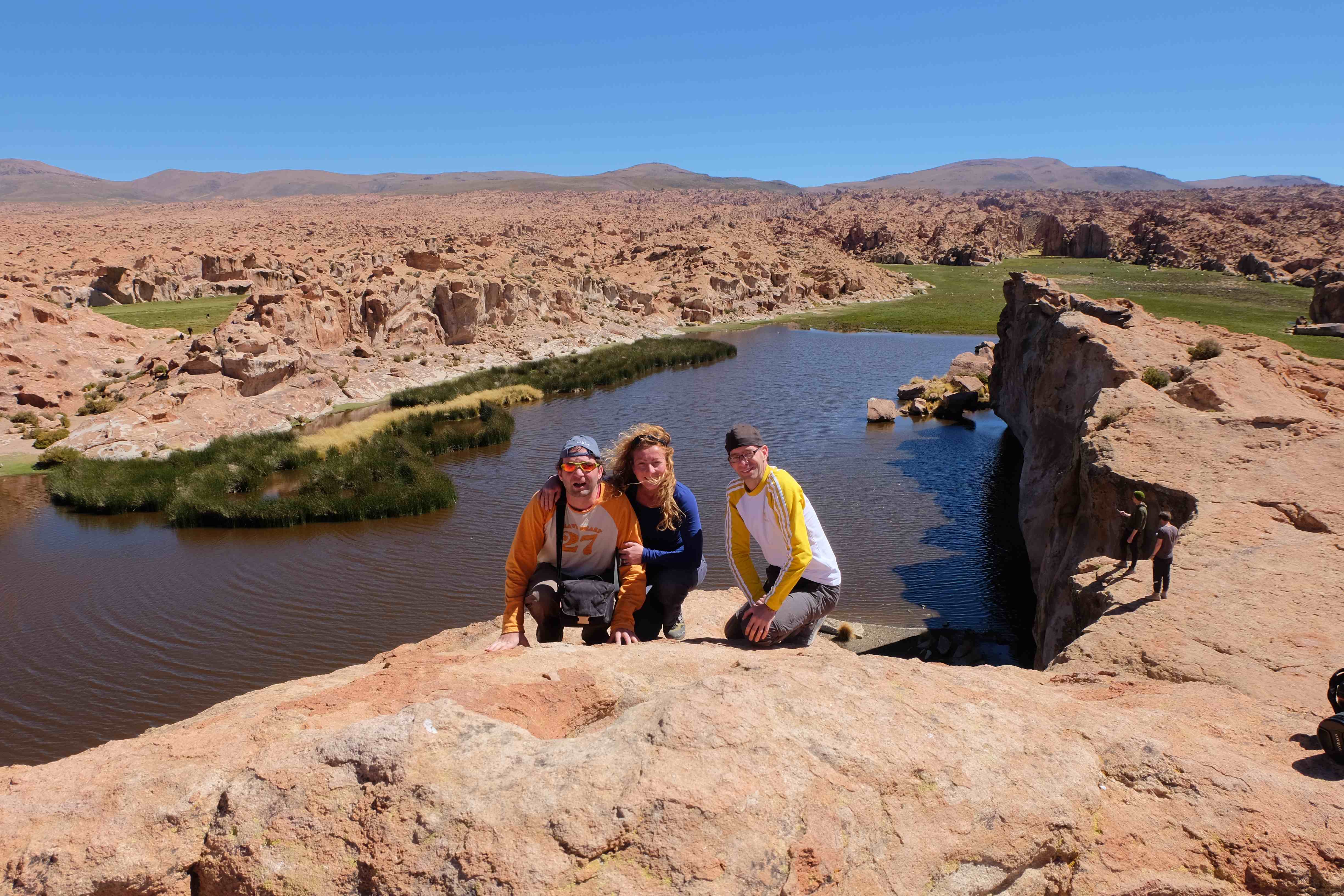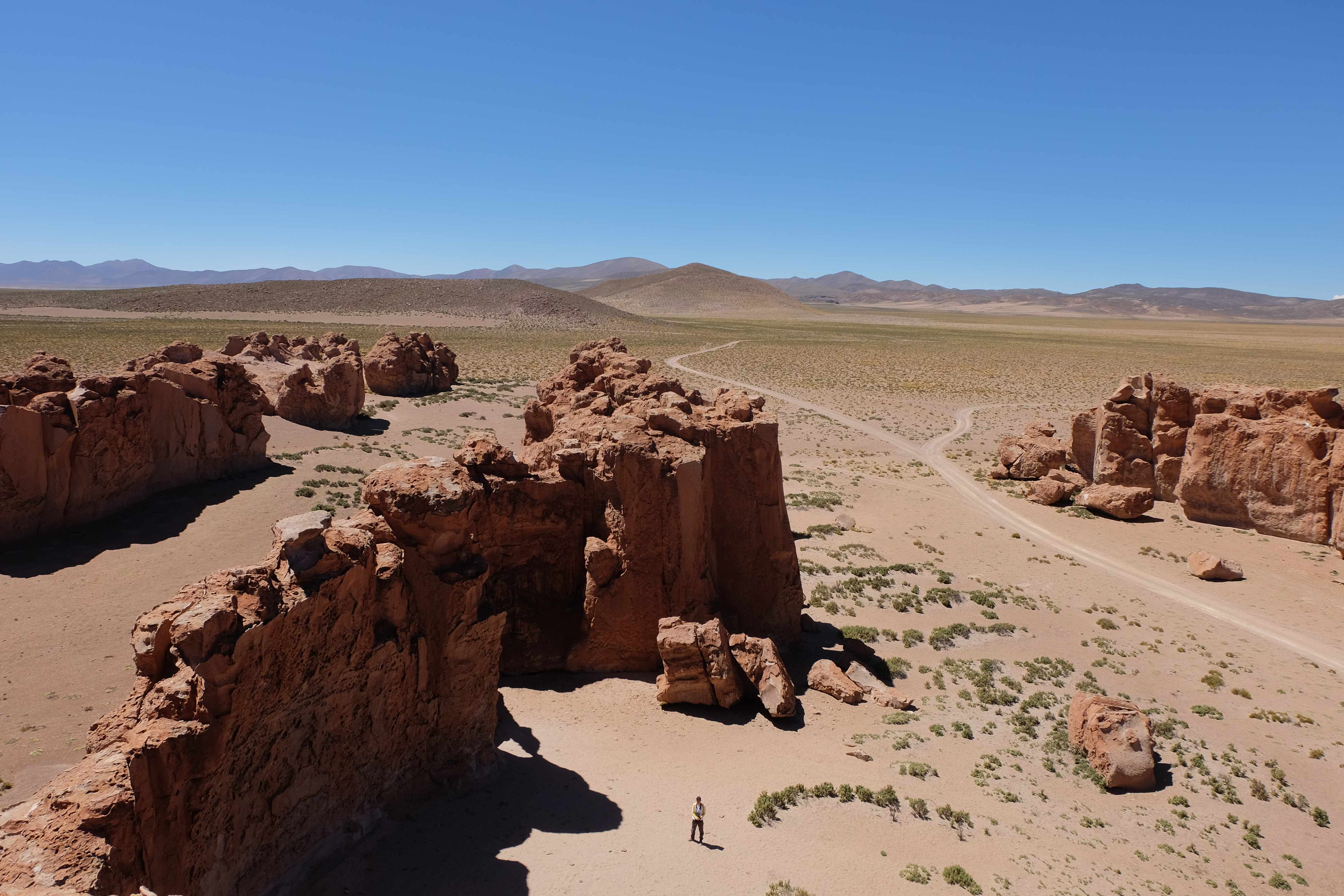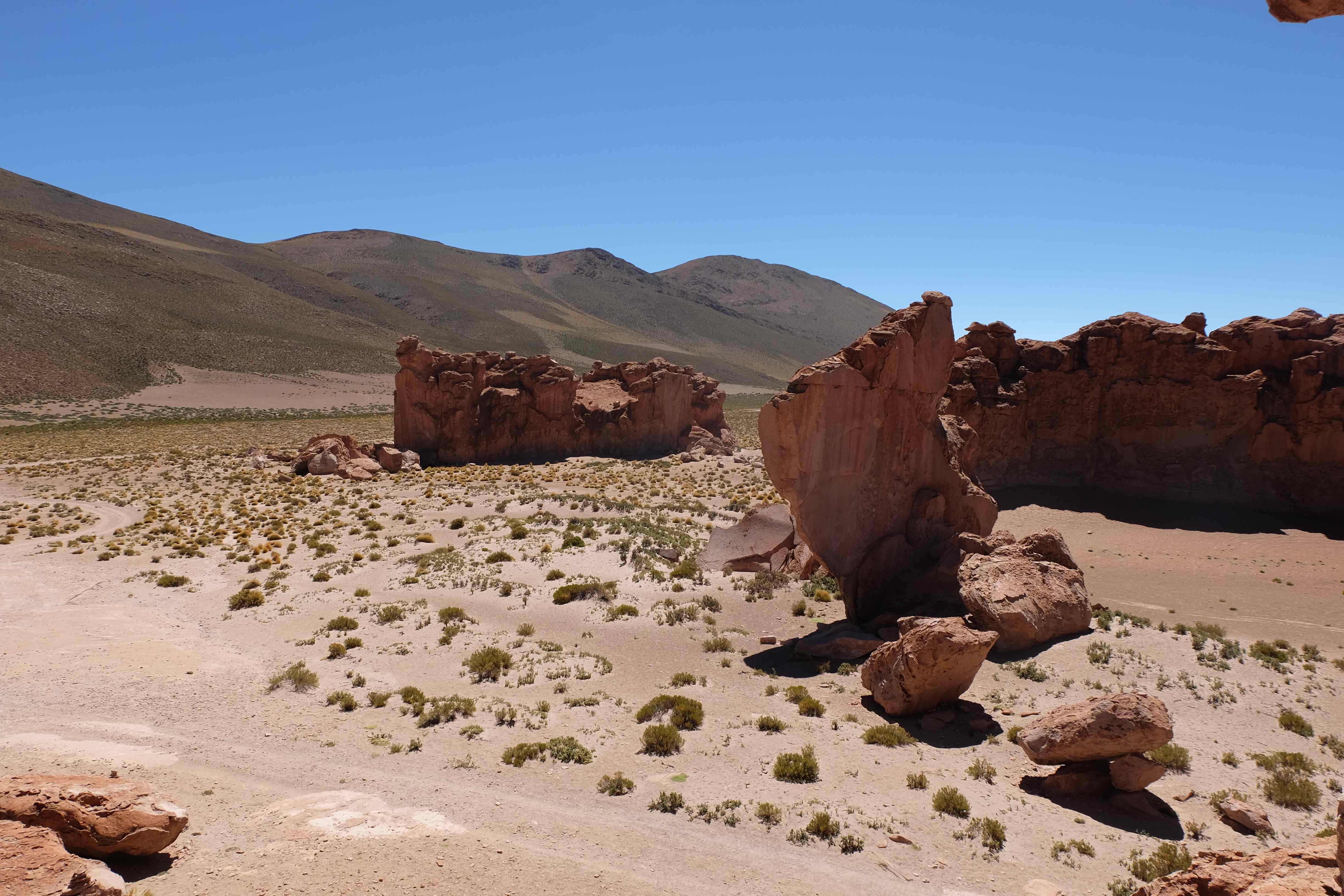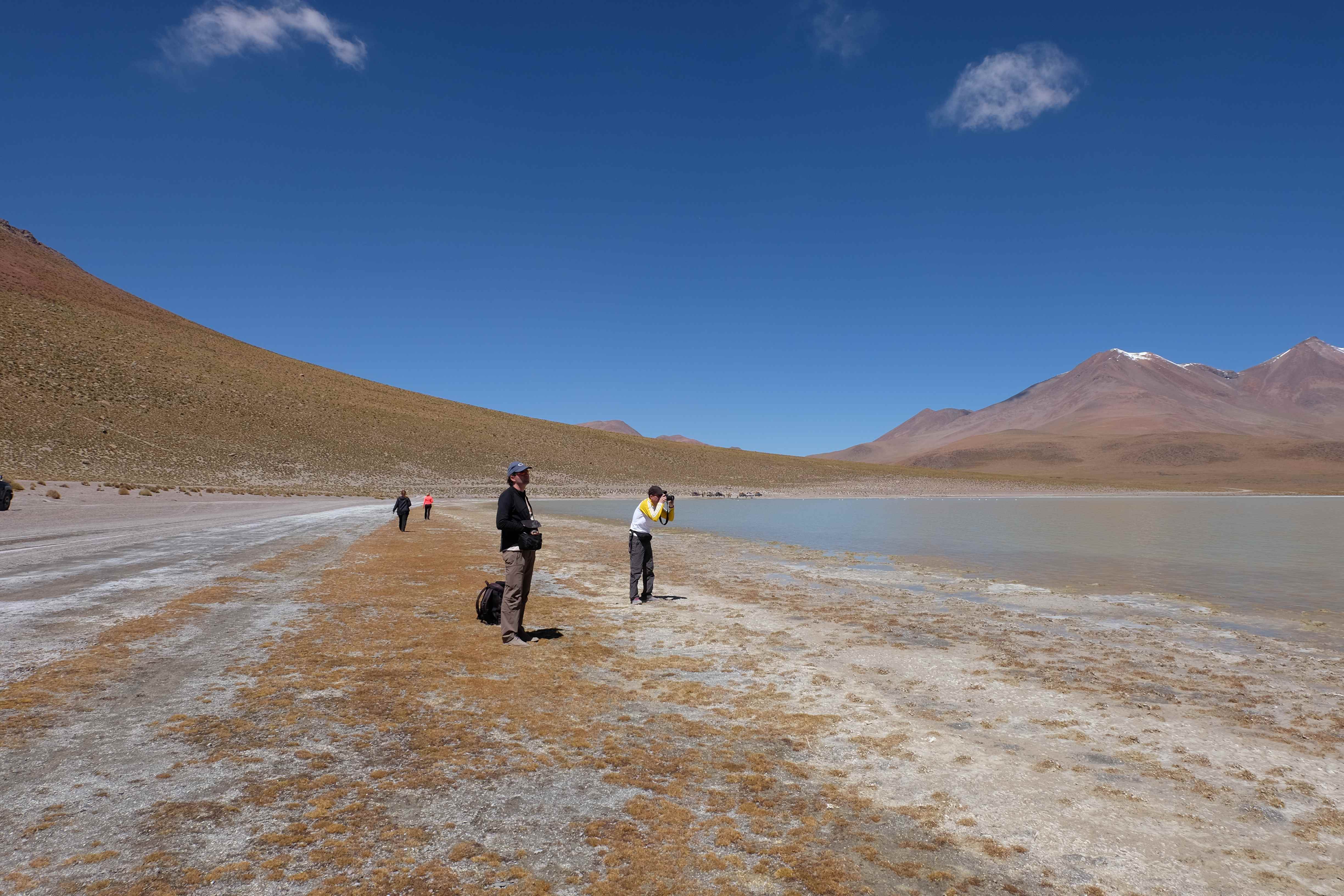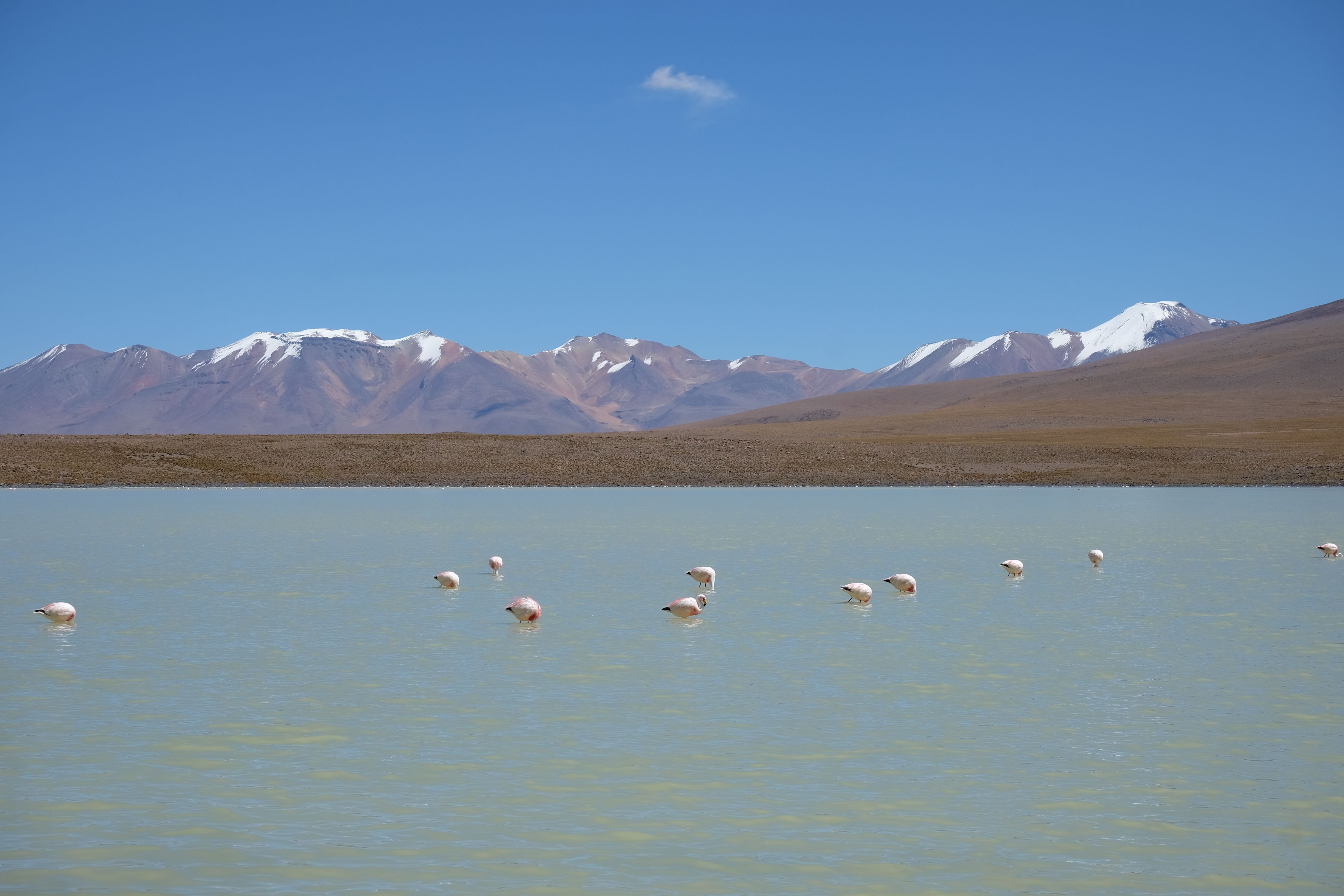 Konnte das Ganze noch getoppt werden? Gab es etwas Besseres? Der Tag fing zumal nicht schlecht an: nach Unmengen an Steinformationen, welche den Beweis darstellten, dass der Wind sich im Laufe der Jahrhunderte als Bildhauer versucht hatte, kamen sie: die in dieser Einsamkeit, dieser trockenen Wüstenlandschaft und unfreundlichen Umgebung so fehl am Platz und umso unglaublicher scheinenden Flamingos, welche nicht nur eine gewisse Eleganz, sondern auch genau den richtigen Farbenfleck verliehen um die Landschaft als herrlich zu bezeichnen. Da tobten wir uns mit dem Fotoapparat aus wie kleine Kinder, welche die Welt entdeckten – wir entdeckten sie nämlich auch und was für eine Welt! Eine in schwindelerregender Höhe (wir bewegten uns die ganze Zeit zwischen 4000 und 5000 m ohne das überhaupt zu merken, da einem alles flach vorkam, allein die schwerfälligen Atemzüge erinnerten einen daran, als man sich anstrengte), eine in der bolivianischen Ferne versteckte Wunderlandschaft, ein von niemandem erahntes und vermutlich von vielen unterschätztes Naturwunder welches sich nun vor unseren Augen in seiner vollen Pracht zeigte. Wir hatten uns verliebt… und der Tag war erst in der Hälfte.
