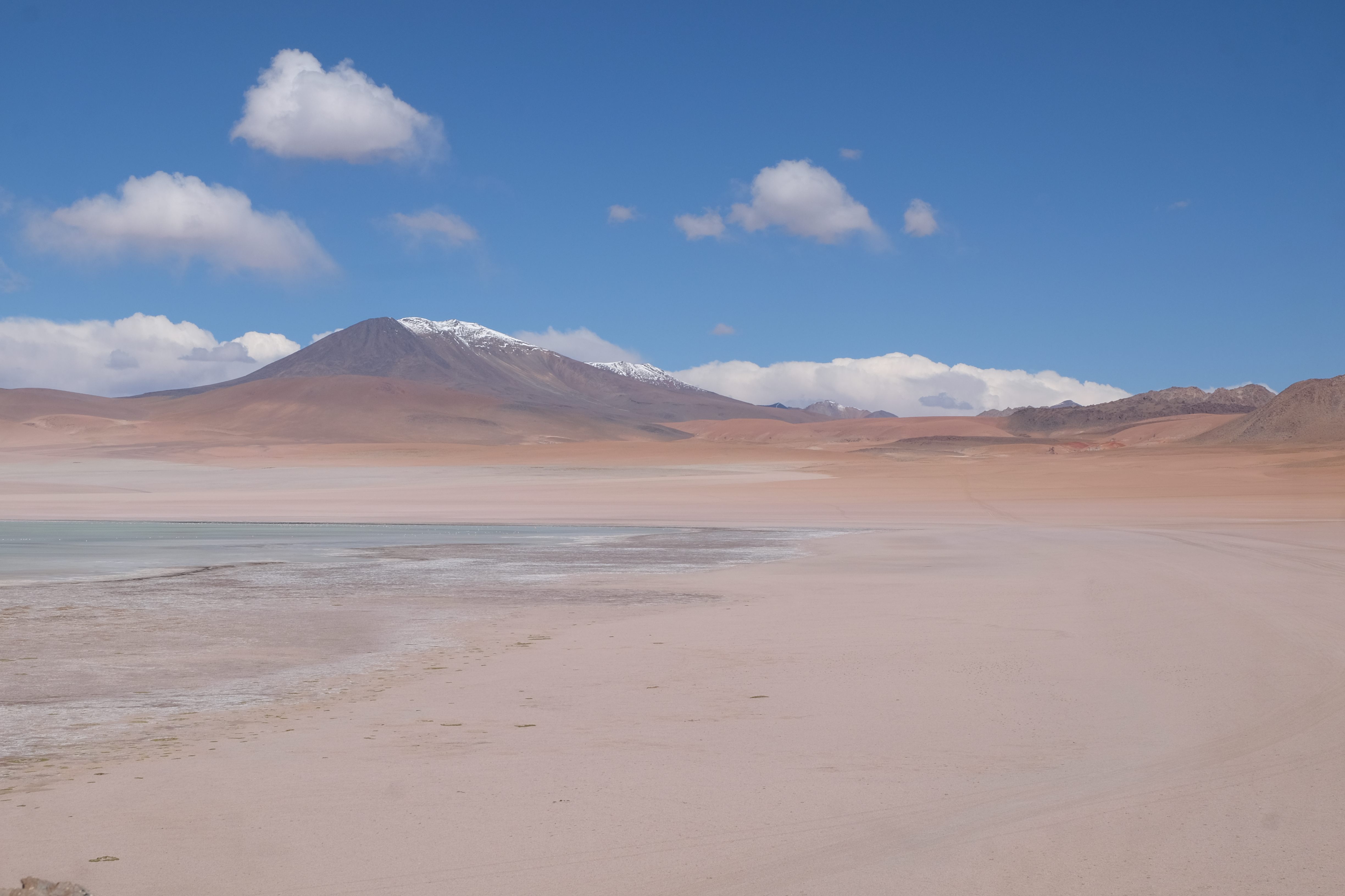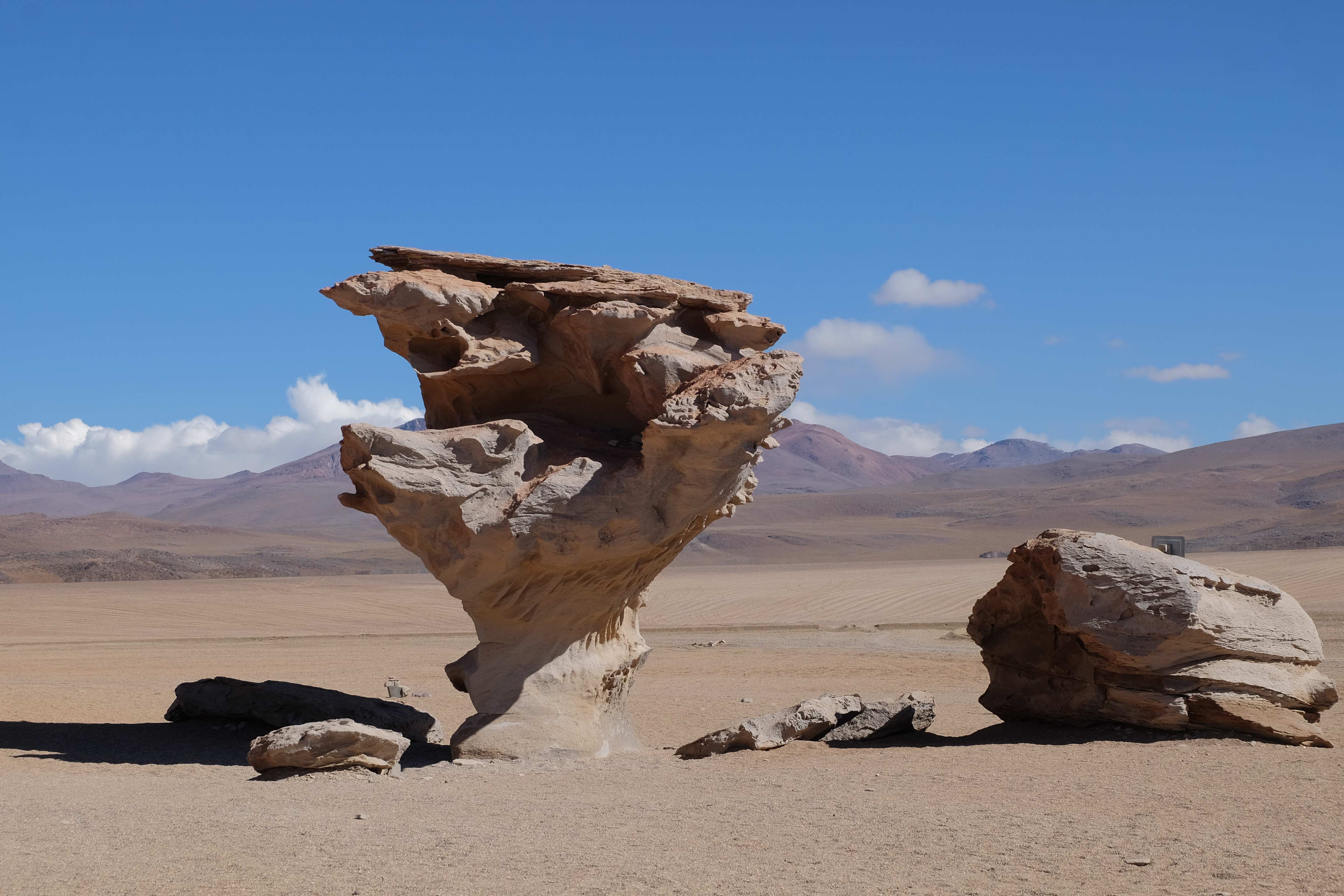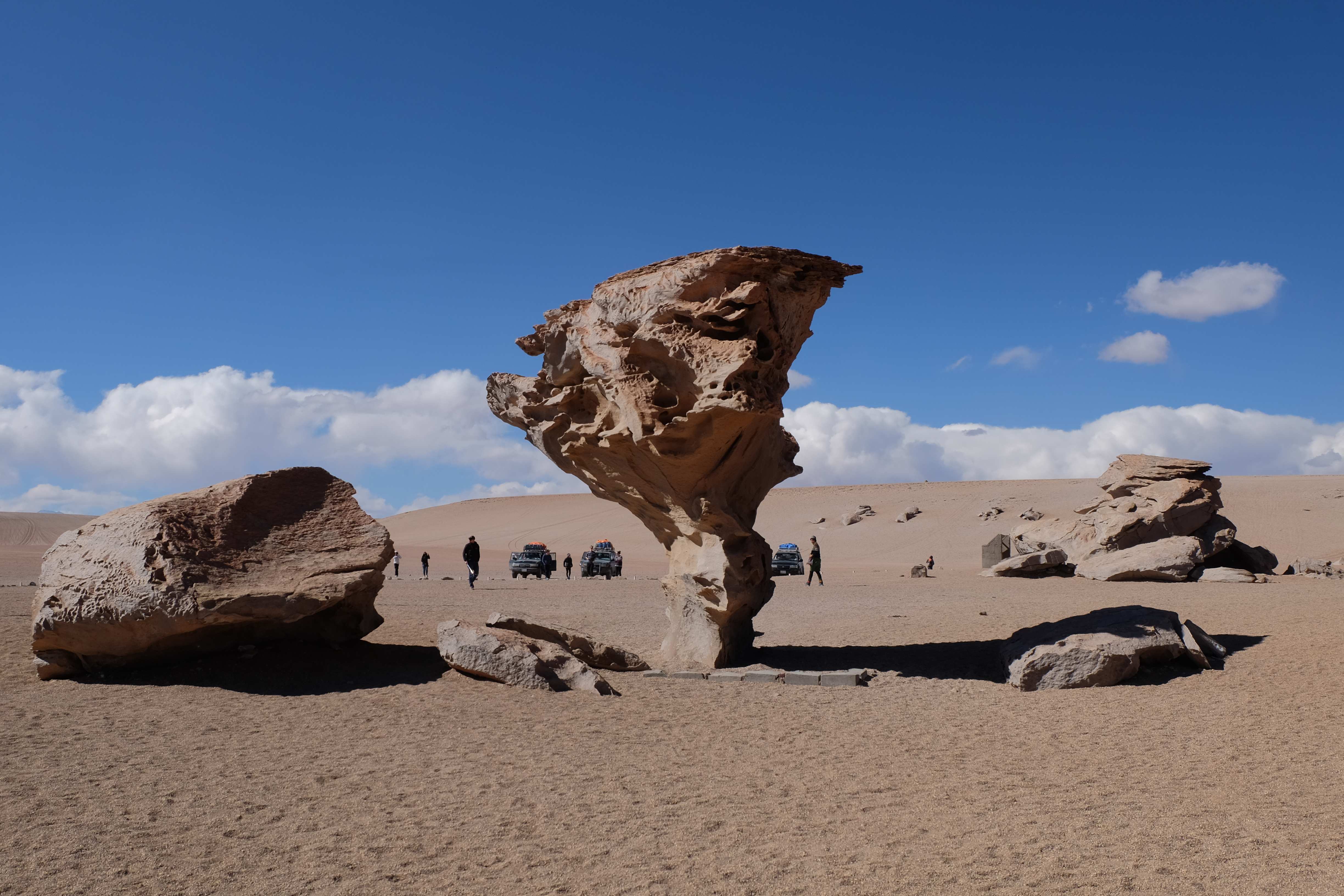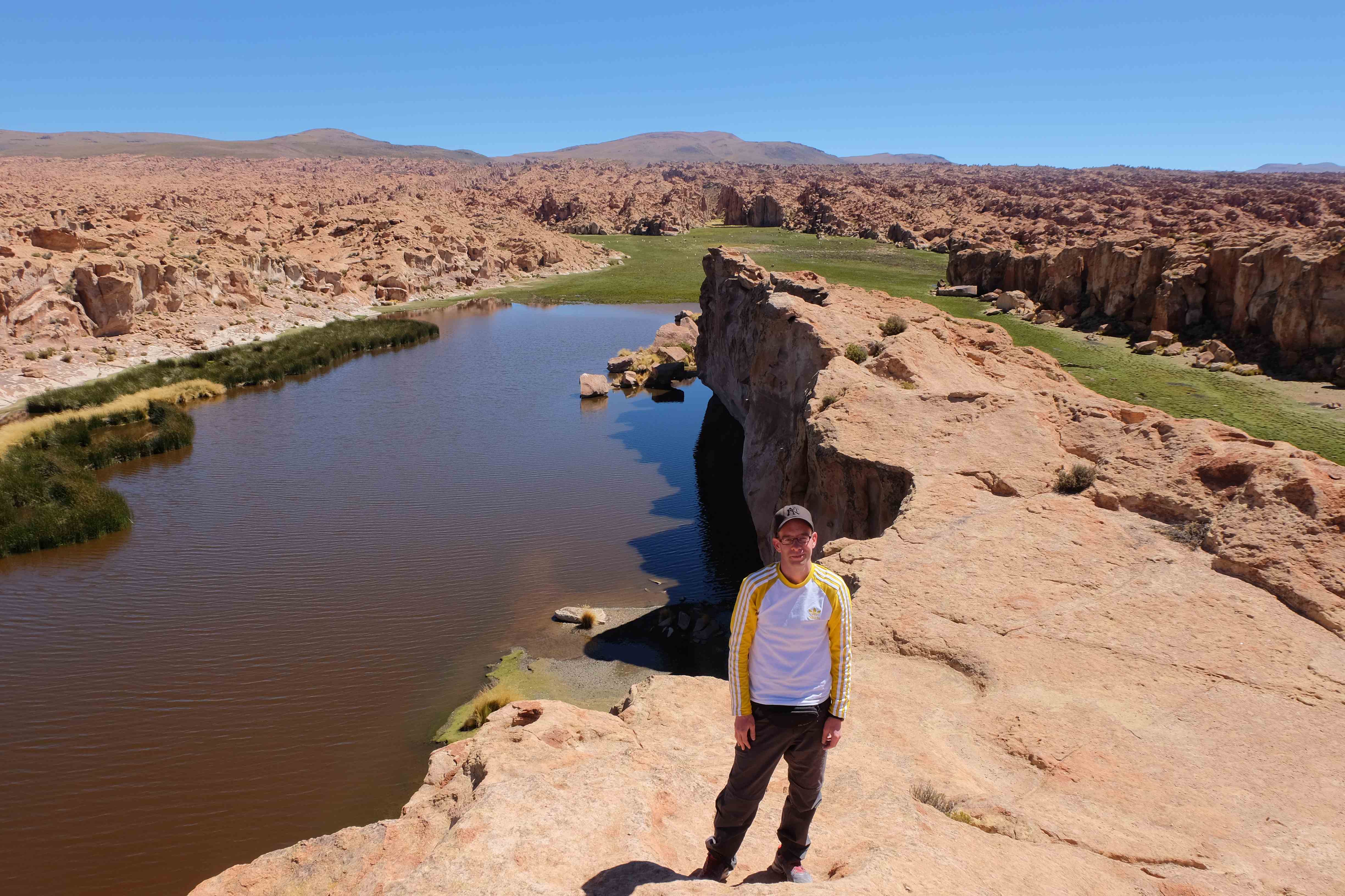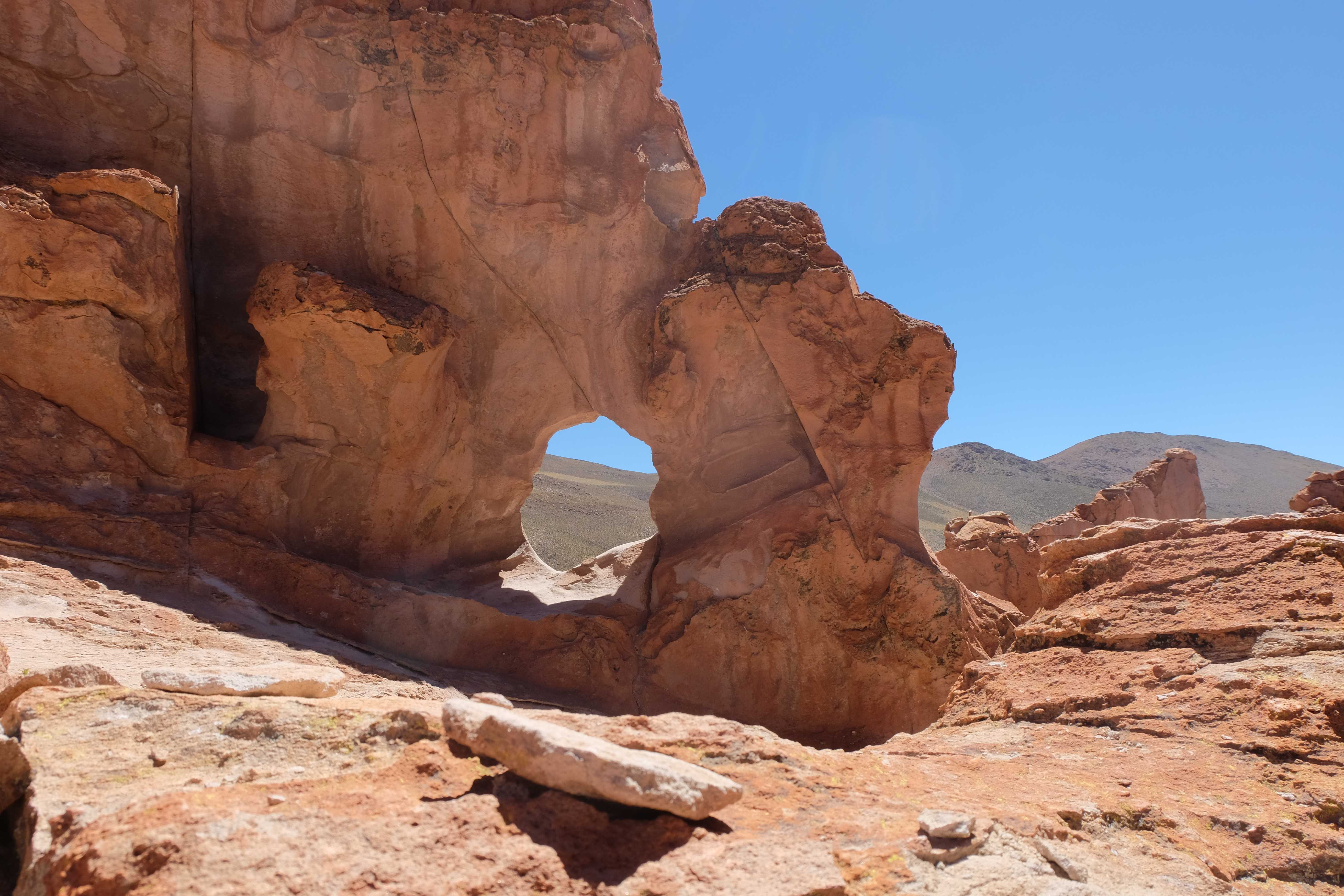 Konnte das Ganze noch getoppt werden? Gab es etwas Besseres? Der Tag fing zumal nicht schlecht an: nach Unmengen an Steinformationen, welche den Beweis darstellten, dass der Wind sich im Laufe der Jahrhunderte als Bildhauer versucht hatte, kamen sie: die in dieser Einsamkeit, dieser trockenen Wüstenlandschaft und unfreundlichen Umgebung so fehl am Platz und umso unglaublicher scheinenden Flamingos, welche nicht nur eine gewisse Eleganz, sondern auch genau den richtigen Farbenfleck verliehen um die Landschaft als herrlich zu bezeichnen. Da tobten wir uns mit dem Fotoapparat aus wie kleine Kinder, welche die Welt entdeckten – wir entdeckten sie nämlich auch und was für eine Welt! Eine in schwindelerregender Höhe (wir bewegten uns die ganze Zeit zwischen 4000 und 5000 m ohne das überhaupt zu merken, da einem alles flach vorkam, allein die schwerfälligen Atemzüge erinnerten einen daran, als man sich anstrengte), eine in der bolivianischen Ferne versteckte Wunderlandschaft, ein von niemandem erahntes und vermutlich von vielen unterschätztes Naturwunder welches sich nun vor unseren Augen in seiner vollen Pracht zeigte. Wir hatten uns verliebt… und der Tag war erst in der Hälfte.